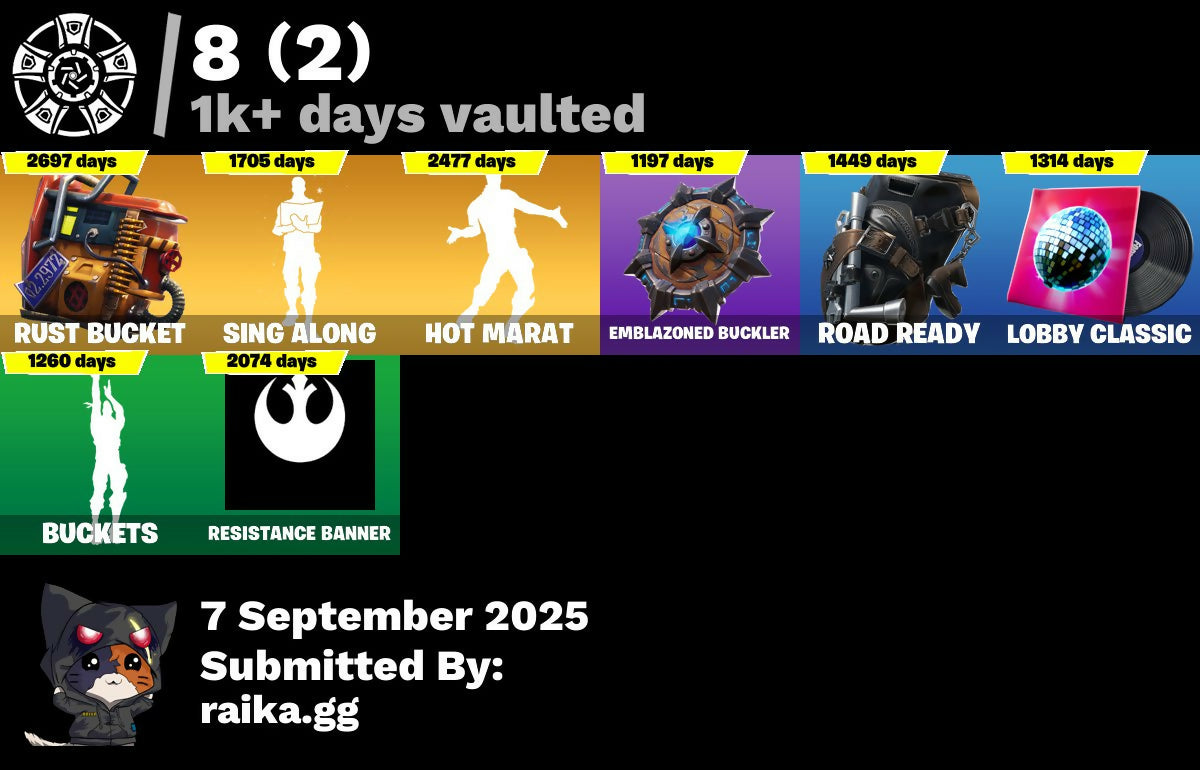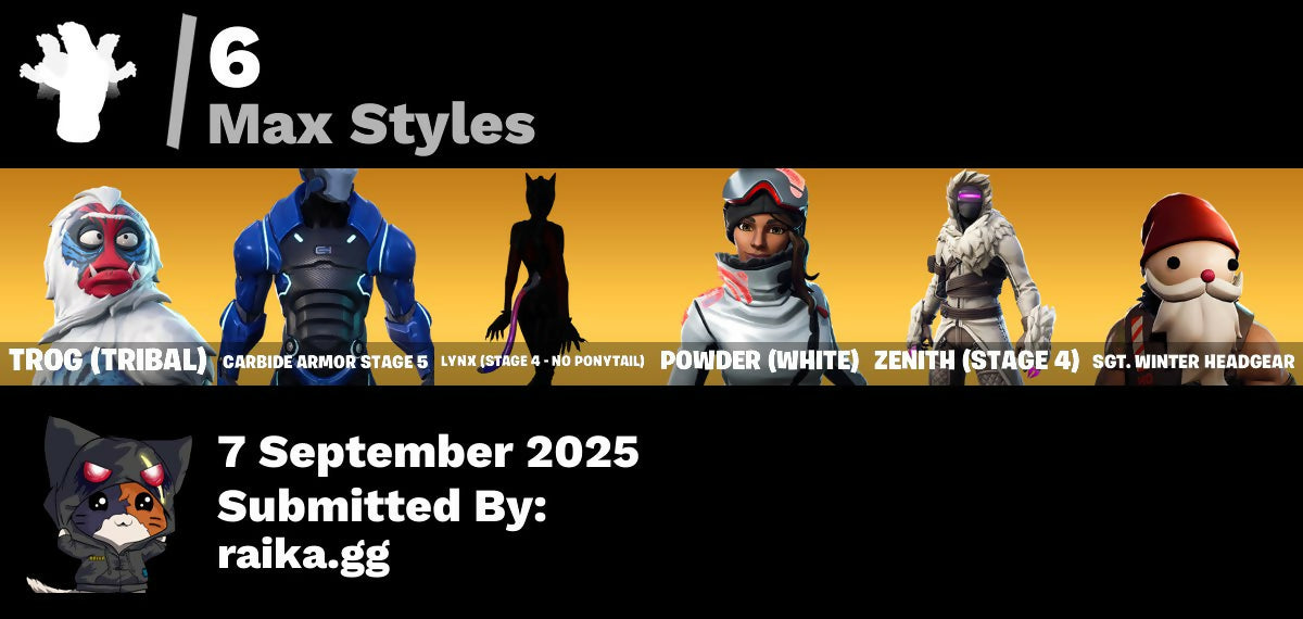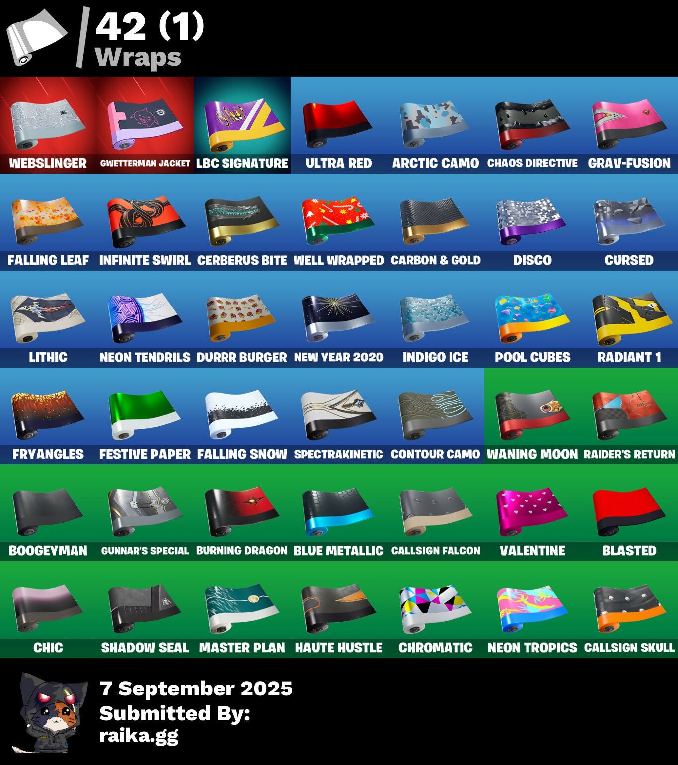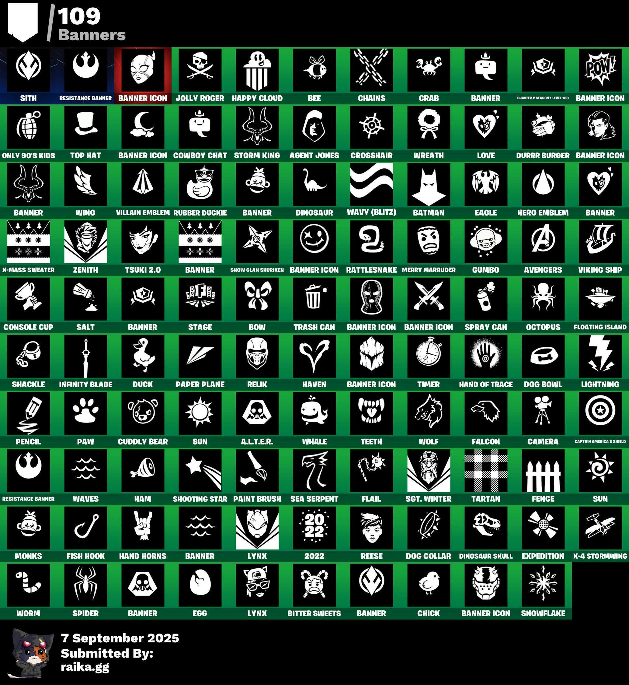 2020 Kickflip, 2022, 8-Ball, A.L.T.E.R., Abominable Axe, Abstract, Aerial Threat, Agent Jones, Altitude, Ancestral Bloom, Apocalypse Shroud, Arcana, Arctic Assassin, Arctic Camo, Arrow, Arroyo Pack, Astro, Avengers, Avengers Logo, Avengers Quinjet, Back Board, Backbone, Backup Blades, Bag Of Coal, Baited, Bananas, Bananaxe, Banner, Banner Icon, Base Jumper, Basecamp Bag, Batman, Battle Bloom, Battle Call, Battle Mode, Battlehawk, Beach Umbrella, Beachcomber, Bee, Beep Beep, Best Mates, Bitter Sweets, Blade of the Waning Moon, Blasted, Blue Metallic, Boogeyman, Both Eyes Open, Boulder Breakers, Bounty 'Brella, Bow, Breathless Blades, Bubbloon, Buckets, Bullet Rider, Bunker Basher, Burning Dragon, Calculated, Call Me, Callsign Falcon, Callsign Skull, Camera, Captain America's Shield, Carbide, Carbide Armor Stage 5, Carbon, Carbon & Gold, Cash Grab, Cat Flip, Cerberus Bite, Chains, Chalk Outline, Chaos Directive, Chic, Chick, Chillshot, Choice Knit, Chomp Cud!!, Chromatic, Cinder, Circle, Classified, Clawz Retro, Clean Sweep, Cliffside Soarer, Combat Wreath, Comet, Competitor's Time Brella, Console Cup, Contour Camo, Courageous Mikasa, Cowboy Chat, Crab, Crazy Castle, Crescent Shroom, Crossfire, Crosshair, Crowning Achievement, Cuddle Team Hula, Cuddly Bear, Cursed, Cyclo Curl, D.C. 63, Dance Mat, Dark Engine, Dark Matter, Dark Voyager, Deep End, Dinosaur, Dinosaur Skull, Disco, Do It!, Dog Bowl, Dog Collar, Dogg House, Double Up, Downpour, Downshift, Doze Dab, Dropout, Duck, Durrr Burger, Dynamic TNTina, E.G.O., EVA, Eagle, Eclipse Brella, Egg, Electric Shredder, Elite Agent, Elite Cleat, Emblazoned Buckler, Equalizer, Everything's Fine, Expedition, Eye Of Agamotto, Fabled Cape, Falcon, Falling Leaf, Falling Snow, Felina's Claw, Fence, Festive Paper, Field Flyer, Fiendish Wand, Finger Wag, Firewalker, Fish Hook, Flail, Flippin' Away, Floating Island, Flux Silvera, Fortilla Flier, Frostburn, Frozen Axe, Fryangles, G.O.A.T., GG Ornament, GG Potion, GG Smiley, GG Snakes, GG Snowman, Gale Force, Gameface, Gentleman's Dab, Get Funky, Glidurrr, Gold Token, Golden Scythe, Golf Clap, Goodie Bag, Grav-Fusion, Groove Jam, Ground Pound, Grumpy Tree, Guiding Glow, Gum Brawler, Gumbo, Gunn-Brella, Gunnar's Special, Gwenpool's Katanas, Gwetterman Jacket, Ham, Hand Horns, Hand of Trace, Happy Cloud, Harbinger Of Victory, Haute Hustle, Haven, Hearts, Hello Friend, Hero Emblem, High Octane, Holly Hatchets, Holographic, Hootenanny, Hope's Look, Horde's War Wheel, Hot Marat, Hype, Ice Breaker, Ice Cube, In Her Sights, Indigo Ice, Infinite Dab, Infinite Swirl, Infinity Blade, Infinity Gauntlet, Intrepid, It's Go Time!, It's... You?, Jaeger, Jolly Roger, Josie, Ka-Choom!, Kata-Pack, Keep It Mello, King's Wrath, Kiss, Knight's Honor, Knight's Treachery, Lbc Signature, Lightning, Lil' Kev, Lithic, Llamistletoe, Lobby Classic, Lock It Up, Lollipopper, Looted, Love, Love It!, Low 'N Slow, Lug Axe, Lynx, Lynx (Stage 4 - No Ponytail), Machinist In Control, Major Mancake, Make A Seat, Marshy Smasher, Mask, Masked Victory, Master Plan, Master Portal, Mello Made It Right, Melting Snowman, Menacing Trace, Mercurial, Merry Marauder, Metalhead, Mic Drop, Millennium Falcon, Mission Specialist, Molten Max Axe, Monks, Moonwalker, Moth, Nana Bath, Nana-Brella, Nanner Bashers, Neo Phrenzy, Neo Versa, Neon Cat, Neon Man O' War, Neon Tendrils, Neon Tropics, Neon Wings, Never Yield, New Year 2020, No Sweat, Nolan Takes Aim, Nyanja's Catpak, Octopus, Offworld Rig, Ol' Spiky, Omega, Onesie, Only 90's Kids, Onslaught, Orange Justice, Outlaw's Knife Rack, Outlaw's Whipknives, Padlock, Paint Brush, Palette Pack, Palm Leaf, Paper Parasol, Paper Plane, Party Hips, Paw, Peely Whip, Pencil, Peppermint Pick, Perfect Present, Pirate Parrot, Pixel Ramirez, Pixels Royale, Pizza Party, Polar Renegade, Pony Up, Pool Cubes, Pool Party, Popcorn, Porthole, Positron, Powder, Powder (White), Precision, Premiere Poms, Prized Llama, Psionic Surfer, Radiant 1, Raider's Return, Rainbow, Rainbow Rider, Ranker's Tags, Ranking Ronin, Rattlesnake, Raven, Raven Team Competitor, Rebel's Rucksack, Redmask Ranker, Reese, Regal Wave, Relik, Resistance Banner, Respect, Respect The Peace, Rickety Runner, Ride The Pony, Road Ready, Rock Love, Rocket, Royal Stroll, Royale Air, Rubber Duckie, Rust Bucket, Rust Lord, Salt, Salute, Sawtooth, Scorcher, Scratchmark, Sea Serpent, Secret Scimitars, Sentinel, Seven Signet, Sgt. Winter, Sgt. Winter Headgear, Shackle, Shadow Ops, Shadow Ranker, Shadow Seal, Shanta's Lifebloom, Shaolin Sip, Sharpshooter, Shimmer, Shooting Star, Shooting Starstaff, Shortbread Slicers, Sing Along, Sith, Skellefish, Skerran, Slam Dunk, Slow Clap, Snakebite, Snoop Dogg, Snow Clan Shuriken, Snow Crystal, Snowfall, Snowflake, Snowplower, Snowshaker, Society Emblem Ranker, Spectra Protector, Spectrakinetic, Spectral Axe, Spider, Spiderweb, Spray Can, Spreading Chaos, Squad Leader, Stacked!, Stage, Standard Issue, Starcrest Shift, Storm King, Storm Sail, Sugar Crash, Sun, Sunbird, Sunny, Surfstick, Sweet Clementine, Tactical Sleigh, Tagged 'Brella, Take The Elf, Take The L, Tartan, Teeth, Teknique, The Bestiary Chest, The Break Shot, The Destroyer's Destroyer, The Fangler, The Golden Mrow, The Mcg, The Prisoner, The Reaper, The Rezzbrella, The Robot, The Sith, The Umbrella, The Visitor, Three Llamas, Tie Whisper, Time Brella, Timer, Top Hat, Tra La La, Trail Tote, Trap Warning, Trash Can, Treefall, Tri-Ooze Tank, Trog, Trog (Tribal), Trog Drawings, Trusty No. 2, Tsuki 2.0, Tunnel, Twin Crossfire, Ultra Red, Unstoppable Renegade, Uplink, Utility Claymore, Valentine, Valor, Vanguard Star, Venom Riff, Viking Ship, Villain Emblem, Waffler, Waning Moon, War Force Wings, Wasteland Stoneshell, Wave, Waveform, Waves, Wavy (Blitz), Webrella, Webslinger, Well Wrapped, Wet Paint, Whale, Wilde, Window, Wing, Wings Of Valor, Wolf, Woodblock Print Nyanja, Wooly Warrior, Worm, Wreath, X, X Mark, X-4 Stormwing, X-Mass Sweater, Yay!, Zenith, Zenith (Stage 4), Zoey, Zo