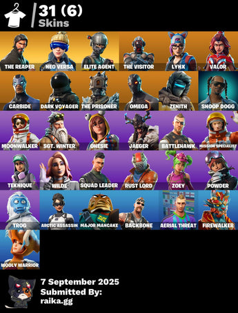 [PC/PSN/XBOX] 31 skins | The Reaper | Neo Versa | Elite Agent | The Visitor | Lynx | Valor | Carbide | Dark Voyager | The Prisoner | Omega | Zenith | 650 VB / Fortnite