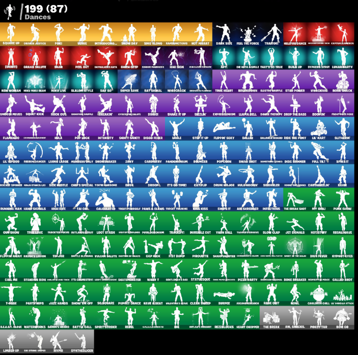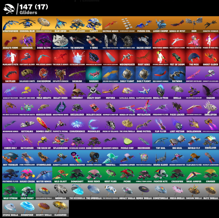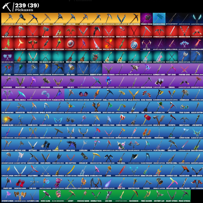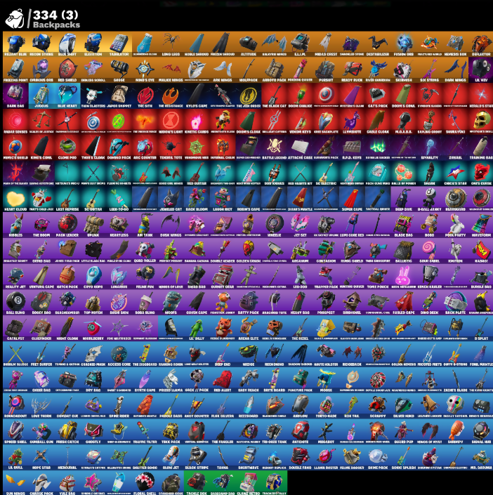 (Shnitz), 000 Knives, 24-Karat Katana, Ablow, Access Core, Aced Counter, Adamantium Claws, Adios Creed, Adpt., Agent Jones, Agent Meowscles, Agent Peely, Agony, Air Shredder, Air Tank, Alpha Staff, Altitude, Aluminates, Anarchy Axe, Andreas, Angler Axes, Antidote, Arc Counter, Arc Wings, Arca Muni, Arcane Research, Arena Elite, Argosy Pack, Armeded Tots, Aromic Energy Glider, Aw, Shucks., Axehammer, B Splat, Back Bloom, Bad Joke, Balance Board, Ball Bling, Baller, Ballistic, Balloon Axe, Banana Cabana, Bananaxe, Bank Shots, Bar Lock Claws, Baron’s Hoard, Barry Beason, Bartley Upper, Base Jumper, Basic Basher, Basilisk, Batman Pickaxe, Battle Blessing, Battle Call, Battle Legend Attacks Case, Battlerave, Batty Board, Batty Pack, Batwing, Bat’s Signal, Baymax Wings, Beachcomber, Beastfang, Beats on Track, Bee Jade, Berserk Guard, Bibble, Big Bite, Big Haul, Birdie, Biter, Black Cat, Black Panther, Black Plate, Black Stripe, Blade, Blade Bag, Blades of Light, Blastersbby Blay, Blitz 'Brella, Blitz Axe, Bloodsport Scythe, Blue Heart, Blue Shift, Blue Stryder, Blue Syle, Blue Viper, Blue and Pink Character (Name not visible), Board Breaker, Boas Keeper, Boba Bling, Body Bag, Bomb Bouquet, Bombs Away!, Bone Breaker, Bone Patrol, Bongo, Boopfin, Boosko, Boria Smash, Borrowed Ends, Bouncer, Bounty 'Brella, Bow Go, Brella, Brilliant Cutters, Broken Down, Brutus, Bubble Bag, Bubble Basher, Bubblin' Sludge, Bubbly Sludge, Buffy G-String, Buggy, Build Up, Bullet Rider, Bunker Jonesy, Burnout, Burpee, Cable Cloak, Cacodemon, Cactus Club, Calamity, Calculator, Call Me, Called Shot, Cammy, Cap Kick, Captain America, Captain Cluckles, Captain Marvel, Captain's Glider, Carbide, Cardistry, Cartwheeling, Carver, Catalyst, Catflip, Cauldron Chill, Cerberus, Cerulean, Chainsaur, Challah Frost, Chaotic Crambler, Cheer Bag, Cheer Bolt, Chef’s Special, Chill-Axe, Chillest Vibe Rider, Claire Redfield, Classified, Clean Sweep, Clone Pod, Cloud Striker, Clove, Coaxial Blue, Cold Cocoa Attack, Cold Front, Combat Cue, Combat Knife, Cometbrella, Commander's Boogie, Conqueror's Axe, Conqueror’s Club, Conquest, Contagion, Controller, Convergence, Cool Cool All Purple, Corona Gemblaster, Cosmic Lampacle, Cosmic Sword, Coven Cape, Covered Crusader, Cracked Pack, Crazy Eight, Crested Cloudglider, Crooked Claw, Crossfire, Crucible Blade, Cruiser, Cryo Crystal Claw, Cryo Kiss, Crystal Fang, Crystal Shard, Cuddle Crawlers, Cuddle Team Sierra, D-Jail Junky, D.E.A.F. Glove, Daily Flight, Dakahawk, Dance Therapy, Dango Pack, Danny's Knives, Daredevil, Dark Bag, Dark Bomber, Dark Charger, Dark Days, Dark Glyph, Dark Phoenix, Dark Side, Dark Vanguard, Dark Voyager, Dark Wings, Darkfire Claws, Day Bag, Dayflier, Daytrader, Daywalker’s Kata, Dead Bomber, Deadfire, Deadpool, Dealer's Deck, Death Valley, Deep Dive, Deep End, Defiant, Deployment Paraglider, Deserted Knife, Desperado, Destabilizer, Devourer's Claw, Diablo's Claws, Diamond Diva, Diamond Pack, Diana’s Mantle, Die with a Smile, Dime Knives, Dino Deck, Disc Spinner, Disco Fever, Dismantle Cut, Diva Fever, Doctor Doom, Dogo Treat, Doko, Doom, Doom Chalice, Doom Slayer, Doom’s Cloak, Doom’s Coil, Dotterror, Double Dealer, Double Fang, Double Tags, Doublecross, Downpour, Downshift, Downwell Land, Dragon-Lighted Stella, Dragora, Drift, Droop, Drop the Bagg, Drum Major, Dusk Wings, E.L.I.M., Eagle, Eagle's Form, Easy Reach, Electro Shuffle, Element Croker, Elevation, Endless Scroll, Eon Blades, Equalizer, Ethnical, Everseer Blades, Everyday Operator, Excalibur, Exile Spear, Expressoboom, Fable, Fabled Cape, Fame, Feathered Flyer, Feathered Foe, Feel the Force, Felina's Claw, Feline Dagger, Feline Fun, Field Wraith, Fiendish Wand, Fighter Kite, Fire Worms, First Order Tie Fighter, Fist Bump, Fist of Doom, Flamengo, Flaming Knots, Flane No Sabre, Flapjack Flyer, Flappy, Flatfoot, Fletcher's Cane, Flip Flyer, Flippin’ Away, Flippin’ Sexy, Flux Silvera, Flyer, Fome Mantle, Foosie, For Moonwhisker, Forged Edge, Founder's Glider, Founder's Umbrella, Freebird, Freezing Point, Frequency Flyer, Fresh Catch, Fret Surfer, Front Flare, Frosted Pets, Frosted Treats, Frozen Shroud, Full Tilt, Funky Junk, Fusion Coil, Fusion Orb, Fusion Scythe, G-Craft Cutter, Gabby Gator, Gale Force, Gambit, Garage Pack, Gaslamp of Frost, Gathering Storm, Gats Pack, Gauge, Gemini, Gentleman’s Bart, Geralt of Rivia, Getterburrito Flag, Getting Closer, Ghost Angel, Ghost Glider, Ghost Rider, Ghostly, Ghost’s Grenade, Giga, Given-Stepp, Glance Photo, Glimmering Edge, Glipside Soarer, Glitters Mokate, Global Shell, Gluefinger, Goddess, Golden Eagle Wings, Golden Grinch, Golden Needles, Golden Nemesis, Golden Oak, Golden Scythe, Good Crew, Good's Daggers, Grand Bag, Grand Salute, Graven's Wings, Graystina, Green Arrow, Greystone, Grimson Polestar, Grizzlin, Groot, Guard Pup, Guffy B-string, Gumball Gun, Gun Show, Gurney Gear, Hack & Smash, Hack // Pack, Hand Signals, Hand of Lightning, Handled Missile, Hank of the Suiter, Harry Potter, Harvester, Hatch Pack, Hatchling, Haute Holster, Havado Slicer, Have a Seat, Hazard Agent, Haze, HeadGlitch, Heart Cloud, Heartless, Hearty Chopper, Heavy Bag, Heavy Mace, Heist Flier, Hellfire Dance, Herald’s Staff, Hex Cutters, High Five, Homegrown Full, Hoops, Hope Star, Horizon Rider, Hot Marat, Hot Pokers, Hotstuff, Howl, Hula, Hula Hoopin’, Hunter's Knives, Hunter's Skyblade, Hype!, Hypnoteyes, Ice King, Ice Queen's Staff, Iceman, Ichi Sign, Ignition, Impact 'Brella, Infectious, Infield Fly, Infinity Chaos Guitar, Inflate-A-Roach, Instant Cutters, Intensity, Interceptor, Internal Claws, Introducing..., Invisible Cut, Iron Beak, Iron Man, Iron Sludge, Isabelle, It’s Christmas, It’s Go Time!, Ivory Axe, James Black's Guitar, Jar Buster, Jarro Snippet, Jazz Hands, Jet Set, Jet Signals, Jewelred Cat, Jibea Out, Jill Valentine, Jinx's Tomoe, John L Kennedy, John Wick, Joker's Revenge, Jonesy OG, Josie, Judgment Keeper, Judogis, Justice Trooper, Kaij