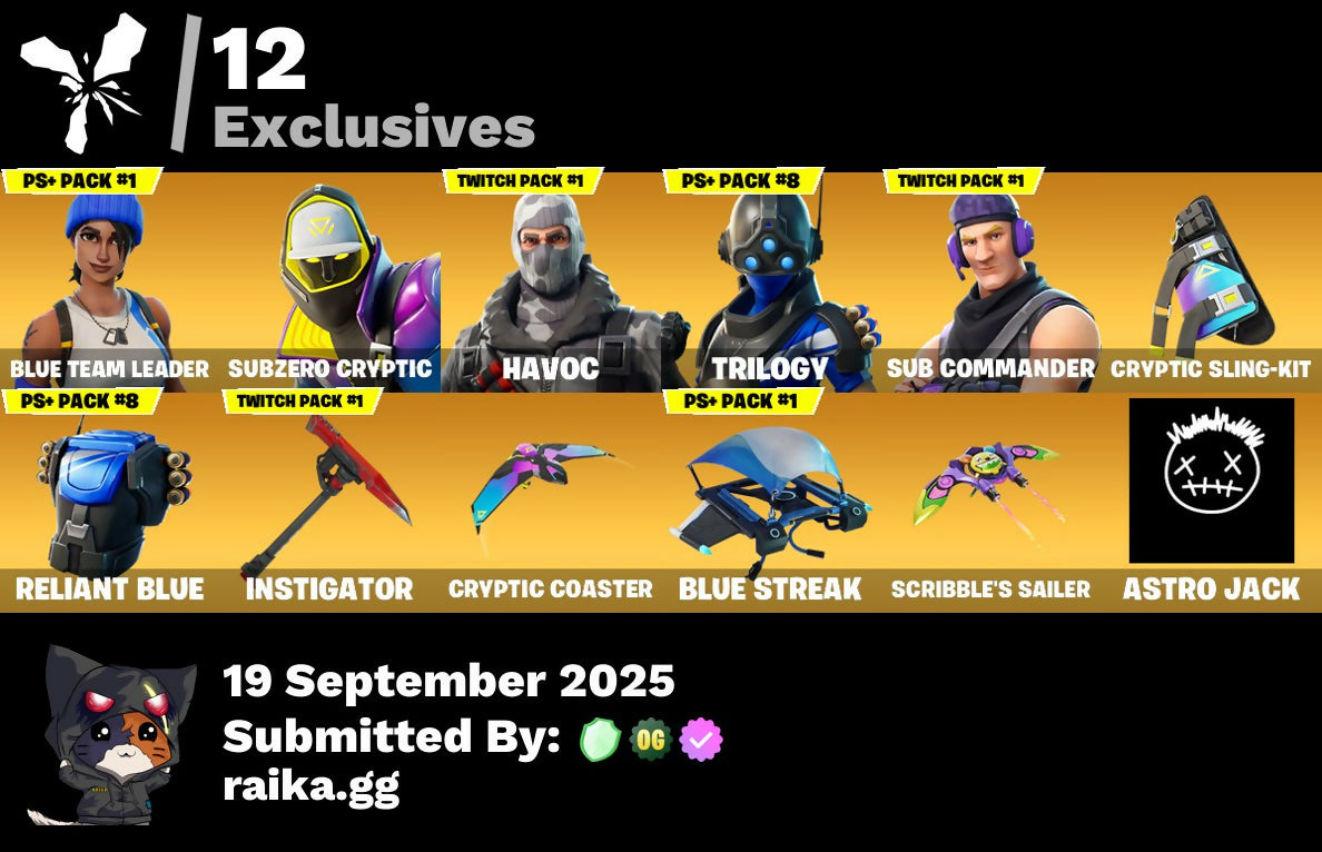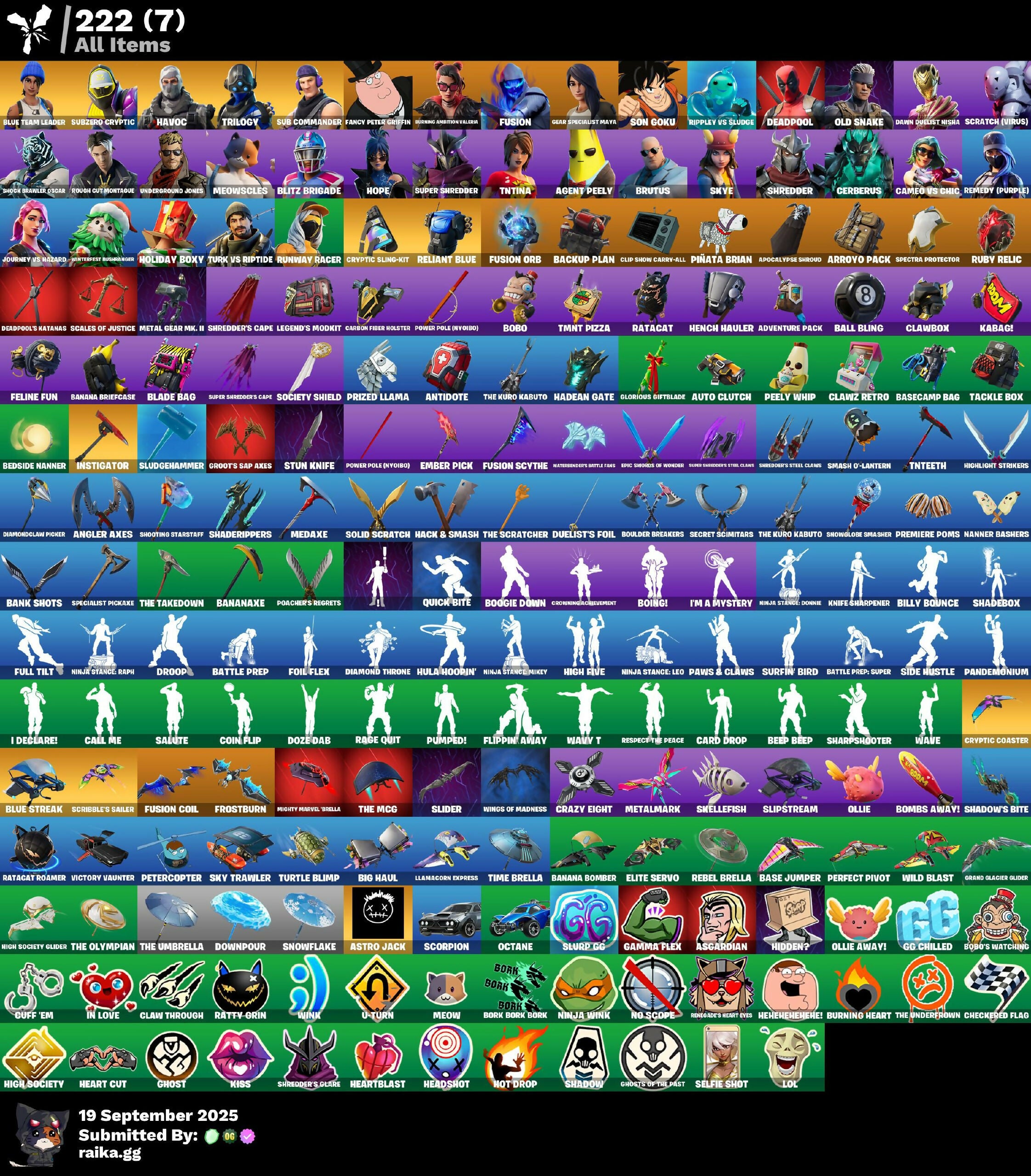 Adventure Pack, Agent Peely, Angler Axes, Antidote, Apocalypse Shroud, Arroyo Pack, Asgardian, Astro Jack, Auto Clutch, Backup Plan, Ball Bling, Banana Bomber, Banana Briefcase, Bananaxe, Bank Shots, Base Jumper, Basecamp Bag, Battle Prep, Battle Prep: Super, Bedside Nanner, Beep Beep, Big Haul, Billy Bounce, Blade Bag, Blitz Brigade, Blue Streak, Blue Team Leader, Bobo, Bobo's Watching, Boing!, Bombs Away!, Boogie Down, Bork Bork Bork Bork, Boulder Breakers, Brutus, Burning Ambition Valeria, Burning Heart, Call Me, Cameo Vs Chic, Carbon Fiber Holster, Card Drop, Cerberus, Checkered Flag, Claw Through, Clawbox, Clawz Retro, Clip Show Carry-All, Coin Flip, Crazy Eight, Crowning Achievement, Cryptic Coaster, Cryptic Sling-Kit, Cuff 'Em, Dawn Duelist Nisha, Deadpool, Deadpool's Katanas, Diamond Throne, Diamondclaw Picker, Downpour, Doze Dab, Droop, Duelist's Foil, Elite Servo, Ember Pick, Epic Swords Of Wonder, Fancy Peter Griffin, Feline Fun, Flippin' Away, Foil Flex, Frostburn, Full Tilt, Fusion, Fusion Coil, Fusion Orb, Fusion Scythe, GG Chilled, Gamma Flex, Gear Specialist Maya, Ghost, Ghosts Of The Past, Glorious Giftblade, Grand Glacier Glider, Groot's Sap Axes, Hack & Smash, Hadean Gate, Havoc, Headshot, Heart Cut, Heartblast, Hehehehehehe!, Hench Hauler, Hidden?, High Five, High Society, High Society Glider, Highlight Strikers, Holiday Boxy, Hope, Hot Drop, Hula Hoopin', I Declare!, I'm A Mystery, In Love, Instigator, Journey Vs Hazard, Kabag!, Kiss, Knife Sharpener, Legend's Modkit, Lllamacorn Express, Lol, Medaxe, Meow, Meowscles, Metal Gear Mk. II, Metalmark, Mighty Marvel 'Brella, Nanner Bashers, Ninja Stance: Donnie, Ninja Stance: Leo, Ninja Stance: Mikey, Ninja Stance: Raph, Ninja Wink, No Scope, Octane, Old Snake, Ollie, Ollie Away!, Pandemonium, Paws & Claws, Peely Whip, Perfect Pivot, Petercopter, Piñata Brian, Poacher's Secrets, Power Pole (Nyoibo), Premiere Poms, Prized Llama, Pumped!, Quick Bite, Rage Quit, Ratcat, Ratcat Roamer, Ratty Grin, Rebel Brella, Reliant Blue, Remedy (Purple), Renegade's Heart Eyes, Respect The Peace, Rippley Vs Sludge, Rough Cut Montague, Ruby Relic, Runway Racer, Salute, Scales Of Justice, Scorpion, Scratch (Virus), Scribble's Sailer, Secret Scimitars, Selfie Shot, Shadebox, Shaderippers, Shadow, Shadow's Bite, Sharpshooter, Shock Brawler Oscar, Shooting Starstaff, Shredder, Shredder's Cape, Shredder's Glare, Shredder's Steel Claws, Side Hustle, Skellefish, Sky Trawler, Skye, Slider, Slipstream, Sludgehammer, Smash O'-Lantern, Snowflake, Snowglobe Smasher, Society Shield, Solid Scratch, Son Goku, Specialist Pickaxe, Spectra Protector, Stun Knife, Sub Commander, Subzero Cryptic, Super Shredder, Super Shredder's Cape, Super Shredder's Steel Claws, Surfin' Bird, Sword GG, TMNT Pizza, Tackle Box, The Kuro Kabuto, The McG, The Olympian, The Scratcher, The Takedown, The Umbrella, The Underfrown, Time Brella, Tnteeth, Tntina, Trilogy, Turk Vs Riptide, Turtle Blimp, U-Turn, Underground Jones, Victory Vaunter, Waterbender's Battle Fans, Wave, Wavy T, Wild Blast, Wings Of Madness, Winterfest Bushranger, Winx
