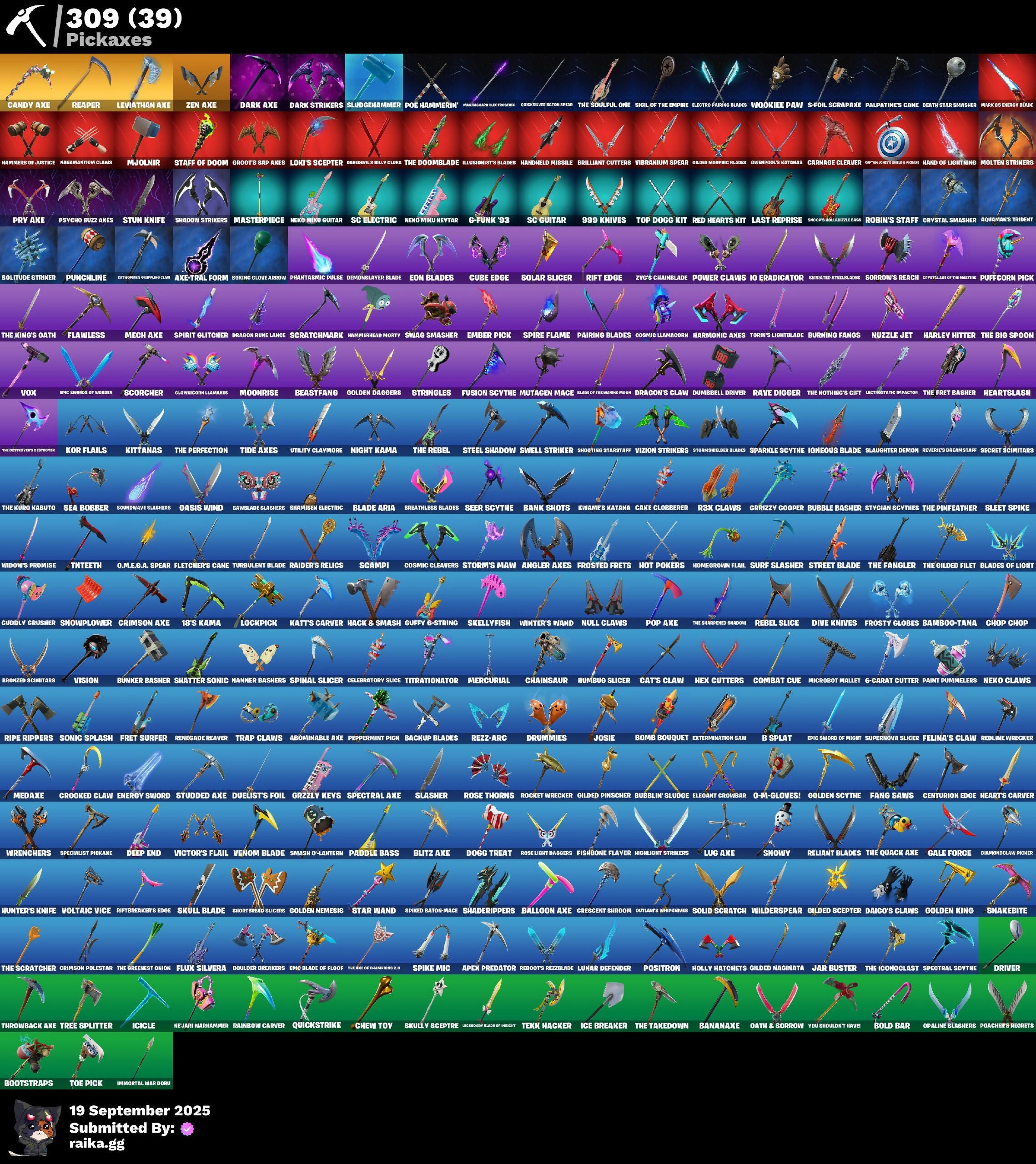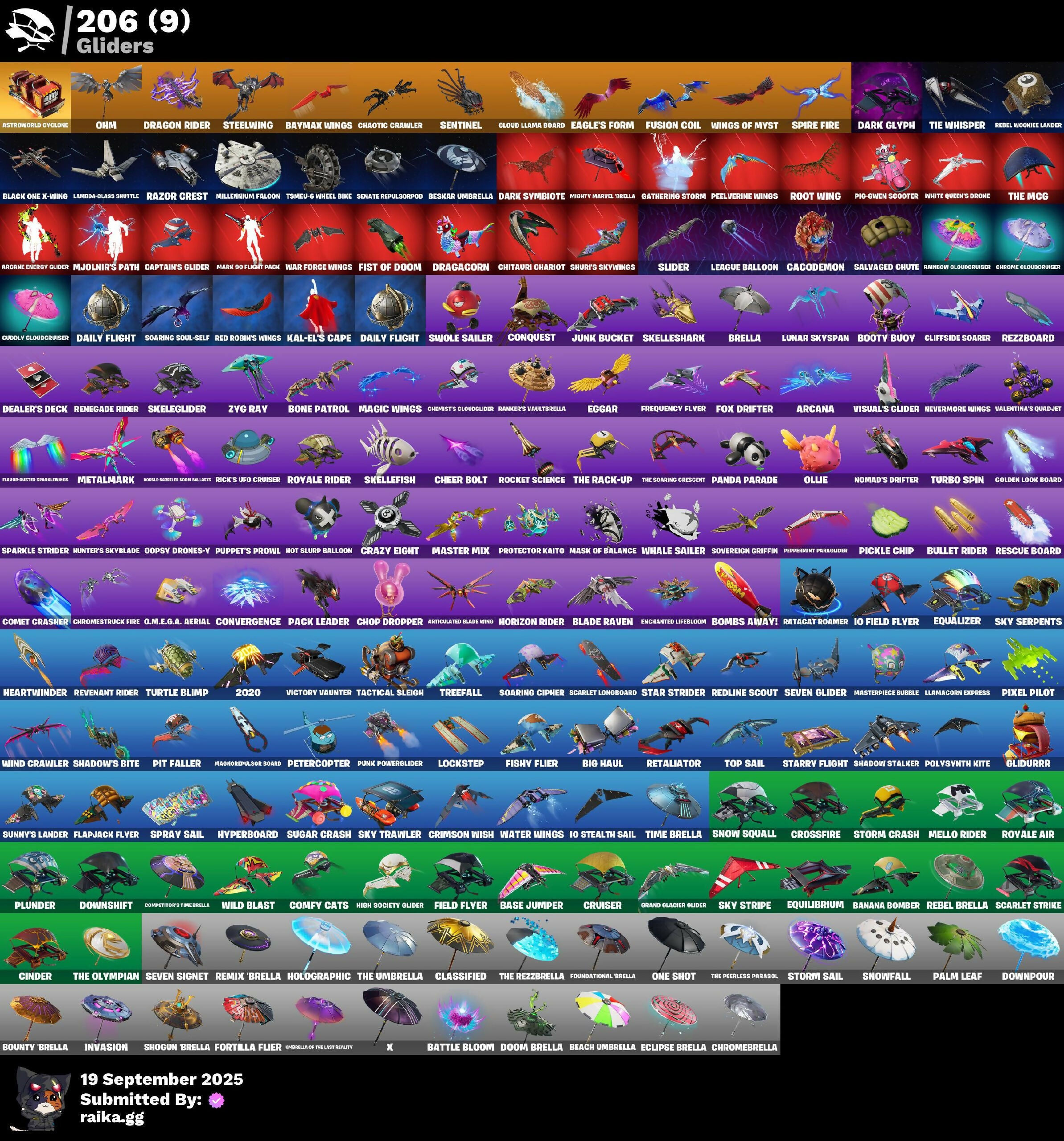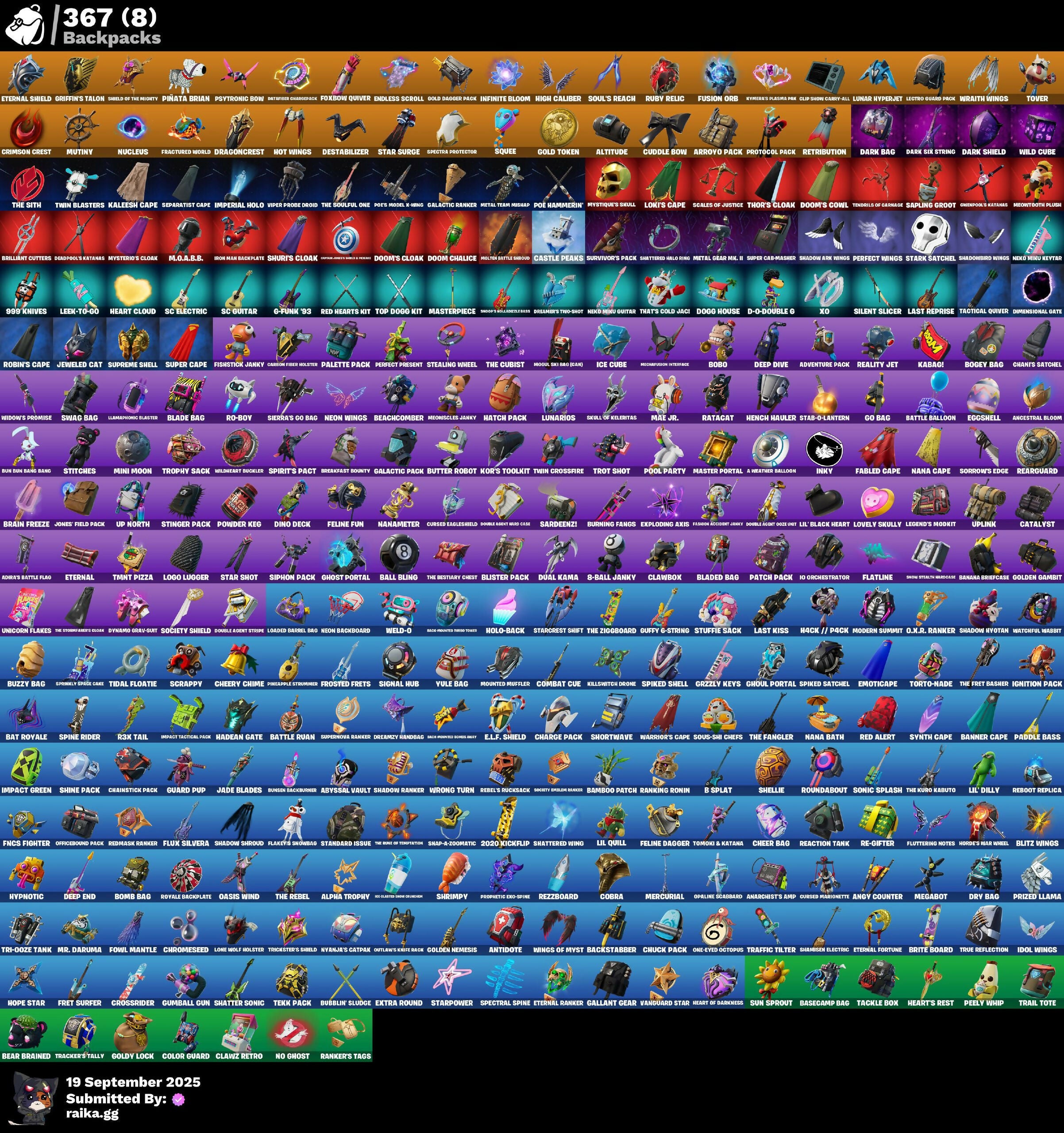 (Snikt!), 1-Ball, 10 Eradicator, 10 Field Flyer, 10 Orchestrator, 10 Stealth Sail, 18's Kama, 2020, 2020 Kickflip, 2022, 6-Carat Cutter, 8-Ball, 8-Ball Janky, 8-Ball vs Scratch, 999 Knives, 999° Knives, A Warrior Prepares, A Weather Balloon, A.L.T.E.R., Abduction, Abominable Axe, Abyssal Vault, Ace Pilot Poe, Acolyte’s Curse, Adira, Adira (Battle Mask), Adira's Battle Flag, Adira’s Armor, Advanced Math, Adventure Pack, Aerial, Aerial Assault Bomber, Aerial Assault Captain, Aerial Classic, Aerial Swagger, Aftermath, Afterparty, Agent Jones, Agent Jones (Jump 31), Agent Nana, Agent Patch, Agent Peely, Air Horn, Air Shredder, Alli, Alpha Altimeter, Alpha Trophy, Altitude, Ambitious, Amplitude, Anarchist's Amp, Ancestral Bloom, Andy Fangerson, Angler Axes, Angy Counter, Antidote, Apex Predator, Aphrodite, Appeeling Drive, Apprentice Evie, Aquaman, Aquamans Trident, Arcana, Arcane Energy Glider, Arcane Research, Arcane Steel, Arctic Achiever, Arctic Camo, Arctica, Ares, Ares (Cosmic Legacy), Ark, Array, Arroyo Pack, Arthur Curry, Articulated Blade Wing, Assassin’s Mark, Astro Antidote, Astro Jack, Astroworld Cyclone, Augury, Auntie Dot, Aura, Aw, Shucks., Axe-Tral Form, Axo, Axo's Big Moment, Ayla Winn, Azarath Metrion Zinthos!, B Splat, Babygirl!!, Backstabber, Backstroke, Backup Blades, Bacon, Bag Of Coal, Ball Bling, Balloon Axe, Bam-Boom!, Bamboo Patch, Bamboo-Tana, Banana Bomber, Banana Briefcase, Bananaxe, Bank Shots, Banner Cape, Banner Trooper, Baron Kane, Baron's Hoard, Base Jumper, Basecamp Bag, Bat Royale, Batman, Battle Ball, Battle Balloon, Battle Bloom, Battle Bus Ballers Logo, Battle Call, Battle Mode, Battle Ready Poe, Battle Ryan, Battlehawk, Bawk Off, Baymax Wings, Be The Mastermind, Beach Ball, Beach Bomber, Beach Chair, Beach Umbrella, Beachcomber, Beacon Trance, Beamers, Bean Bag, Bear Brained, Beastfang, Beat Breaker, Beatbox, Beef Blade, Beep Beep, Bees!, Belt It!, Bernie, Berserker Barrage, Beskar Umbrella, Big Dawgs, Big Dill, Big Haul, Big Smooch, Big-Glass Wind Charm, Bike To Go, Billy Bounce, Birdarang Flourish, Birthday Bud, Bitter Sweets, Black, Black Knight, Black Leader, Black One X-Wing, Black Panther (Shuri), Black Queen, Blackheart, Blackheart (Stage 8), Blade Aria, Blade Bag, Blade Raven, Blade of the Weeping Moon, Bladed Bag, Blades of Light, Blasted, Blinding Lights, Blister Pack, Blitz Axe, Blitz Wings, Blowin' Up, Blowing Bubbles, Blue Cyclo, Bobo, Bogey Bag, Boing!, Bold Bar, Bomb Bag, Bomb Bouquet, Bombastic Tonancio, Bombs Away!, Bone, Bone Breaker, Bone Patrol, Bones, Bones (Cosmic Legacy), Boogeyman, Boogie, Boogie Down, Boomin!, Bootsin' Cats, Bootstraps, Booty Buoy, Bot, Both Eyes Open, Boulder Breakers, Bounty 'Brella, Bow Go, Boxing Glove Arrow, Brain Freeze, Break Point Ultra, Breakfast Bounty, Breakneck, Breathless Blades, Brella, Brilliant Cutters, Bring It, Bring It Around, Brite Board, Brite Bomber, Brite Hatsune Miku, Bronzed Scimitars, Bruno's Blue Heart, Brutus, Bubble Basher, Bubblin' Sludge, Bullet Rider, Bullseye, Bun Bun Bang Bang, Bun Bun Blast, Bunker Basher, Bunker Jonesy, Bunny Brawler, Bunny Hop, Bunsen Backburner, Burning Ambition Valeria, Burning Fangs, Burning Sparks, Burning UFO, Bush Peek, Bushranger, Butter Robot, Butterfly, Buttoned Up, Buzz Beat, Buzzy Bag, By The Horns, Bytes, Bytes (Lone Traveler), Bytes' Sigil, C393 Contender II, Cacodemon, Cake Clobberer, Calculated, Calico, Call Me, Cameo, Cameo vs Chic, Candy Axe, Cap Kick, Caper, Caper (Bunny), Captain America's Shield, Captain Jones, Captain L.A. America, Captain Phasma, Captain's Glider, Carbide, Carbon Fiber Holster, Carbon Scarle, Card Drop, Cardistry, Carey the Snowbird, Carmine Rosso, Carnage, Carnage (Maximum), Carnage Cleaver, Cash Grab, Cassidy Quinn, Castle Peaks, Cat Flip, Cat's Claw, Catalyst, Catalyst (Overcharged), Cattitude, Cat’s Paw, Celebratory Slice, Centurion, Centurion Edge, Cerberus, Cerberus Bite, Chainsaur, Chainstick Pack, Chalked Up 1-Ball, Challenger Cerberus, Champion Starsol, Chan's Satchel, Chani, Chani's Satchel, Chaos Directive, Chaos Director, Chaos Double Agent, Chaos Origins, Chaos Origins (Shadow), Chaotic Crawler, Chapman Needs You, Charge Pack, Charlotte, Charlotte's Logo, Cheer Bag, Cheer Bolt, Cheery Chime, Chemist's Cloudglider, Chew Toy, Chibi, Chic, Chickenwing It, Chigusa, Chillshot, Chimichanga!, Chitauri Chariot, Choice Knit, Chomp Cudi, Choose Naughty, Choose Your Alignment, Chop Chop, Chop Dropper, Choppy, Chrome Cloudcruiser, Chrome Marked, Chromebrella, Chromeseed, Chromestruck Fire, Chuck Pack, Chun-Li, Cinder, Claptrap, Classic Peelverine, Classified, Clawbox, Clawz Retro, Clean Sweep, Click!, Cliffside Soarer, Clip Show Carry-All, Cloud Llama Board, Cloudburst, Cluck, Cluck 'n Strut, Cluck (Slurpy), Clucking Mad, Cobra, Coconuts, Codename ELF., Coffin, Coin Flip, Color Guard, Combat Cue, Combat Giller, Comet, Comet Crasher, Comfy Cats, Compass, Competitive Medusa, Competitor's Time Brella, Confident Iridia, Conga, Conjuring Mysterio, Conquest, Controlled Chaos, Convergence, Cosmic Cleavers, Cosmic Lumacorn, Countertie Marks Logo, Court Commander, Cowboy Chat, Crabby, Crabby King, Crackdown, Crashed Chiller, Crashed Shield, Crazy Castle, Crazy Eight, Crescent Shroom, Crimson Axe, Crimson Crest, Crimson Polestar, Crimson Wish, Crooked Claw, Cross Your Heart, Crossfire, Crossrider, Crowning Achievement, Cruiser, Cryptic, Crystal, Crystal Llama, Crystal Smasher, Crystalax of the Masters, Cube, Cube Assassin, Cube Edge, Cube Marking, Cubed, Cuddle Bears Logo, Cuddle Bow, Cuddle Mech, Cuddle Scream Leader, Cuddle Team Hula, Cuddle Team Leader, Cuddly Cloudcruiser, Cuddly Crusher, Cupcake, Curling Iron, Cursed, Cursed Eagleshield, Cursed Marionette, D-O-Double G, D.C. 63, Da Bomb, Dabstand, Daigo, Daigo's Claws, Daigo's Stance, Daily Flight, Daisies, Dali, Dali (Cosmic Legacy), Dance Mat, Danica, Daredevil's Billy Clubs, Darig Taisho (Cosmic Legacy), Dark Angular Shift, Dark Axe, Dark Bag, Dark Bomber, Dark G