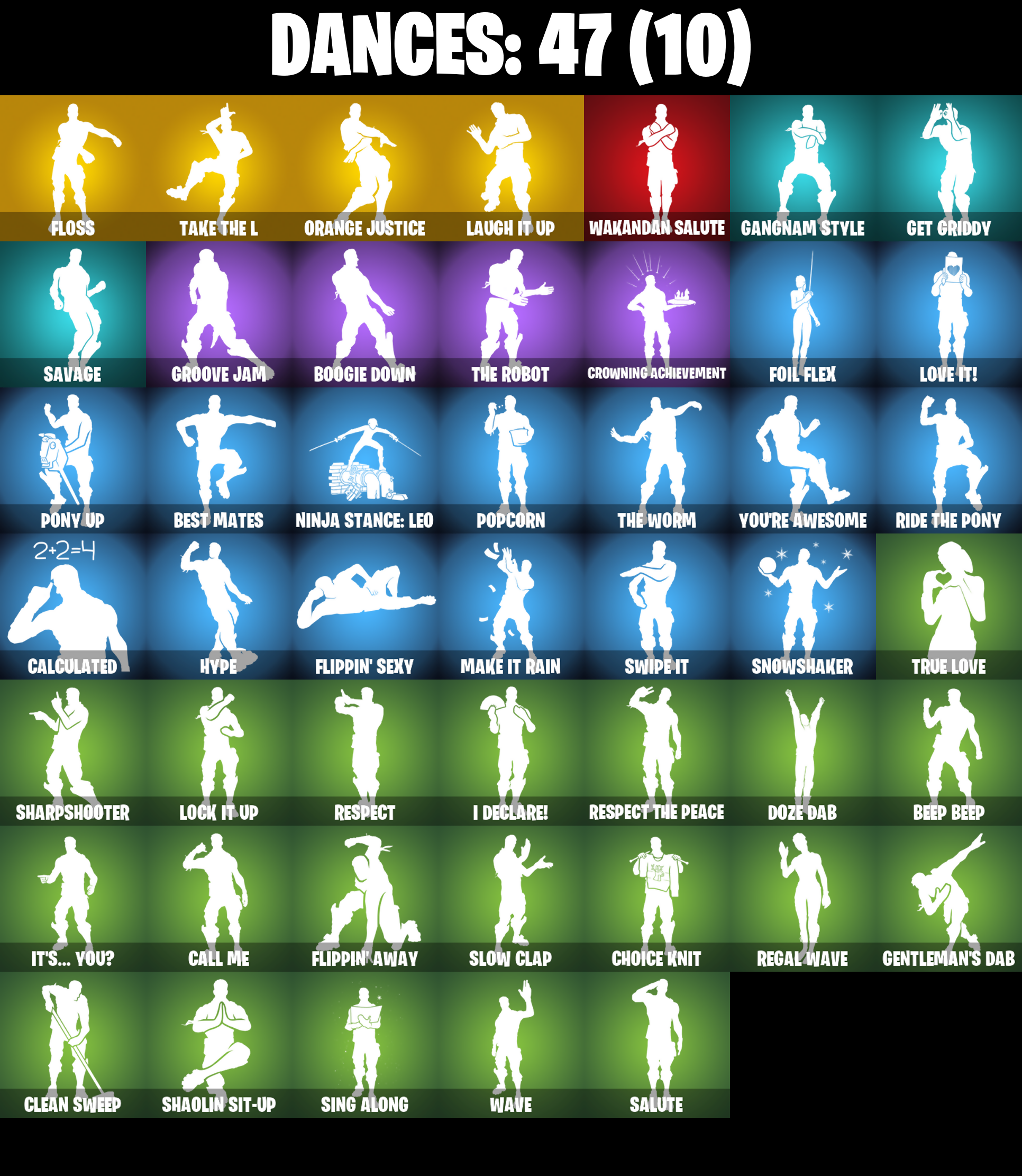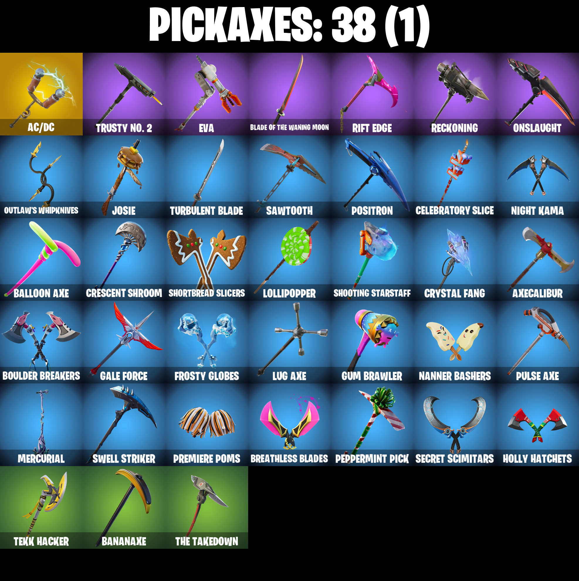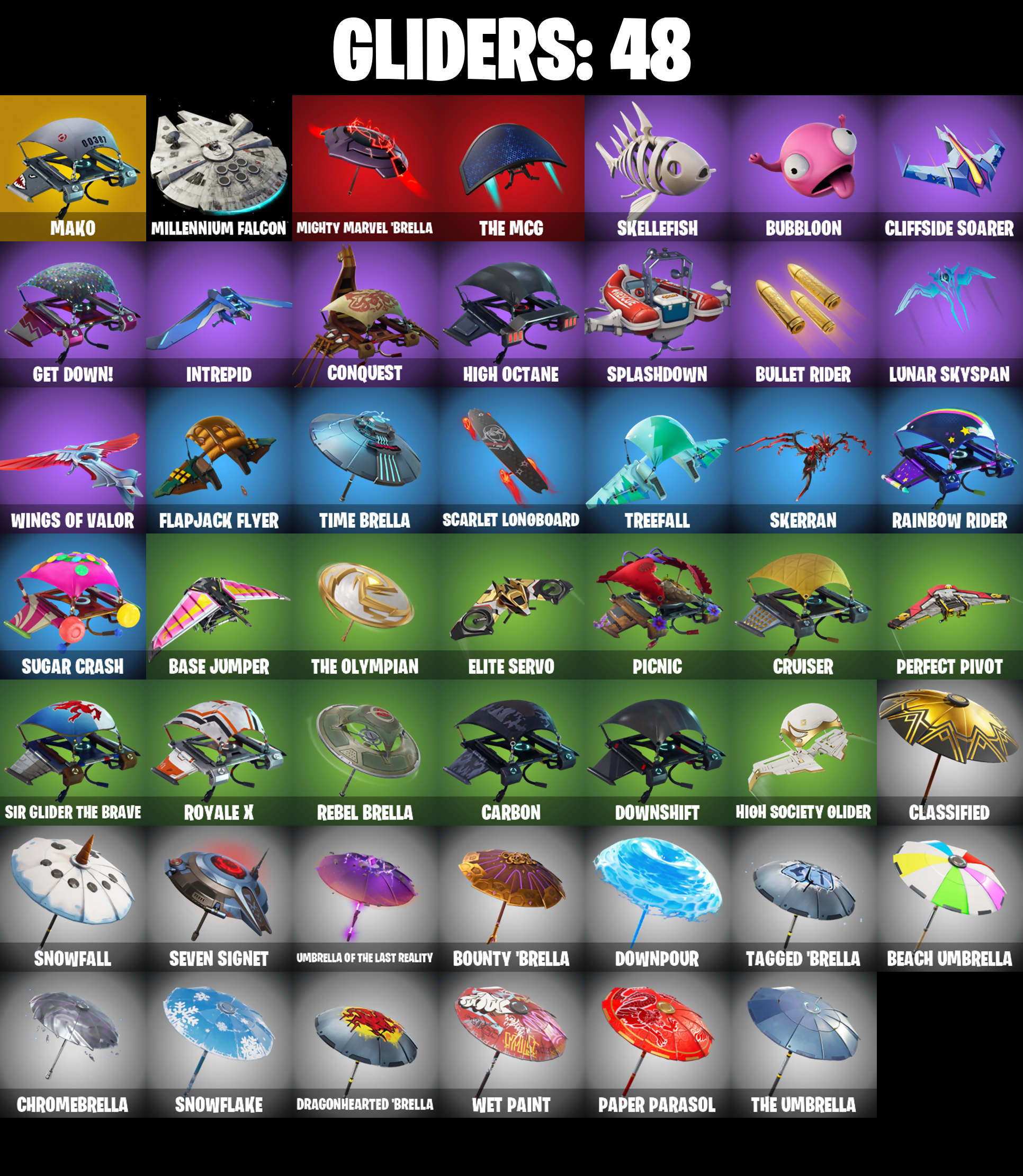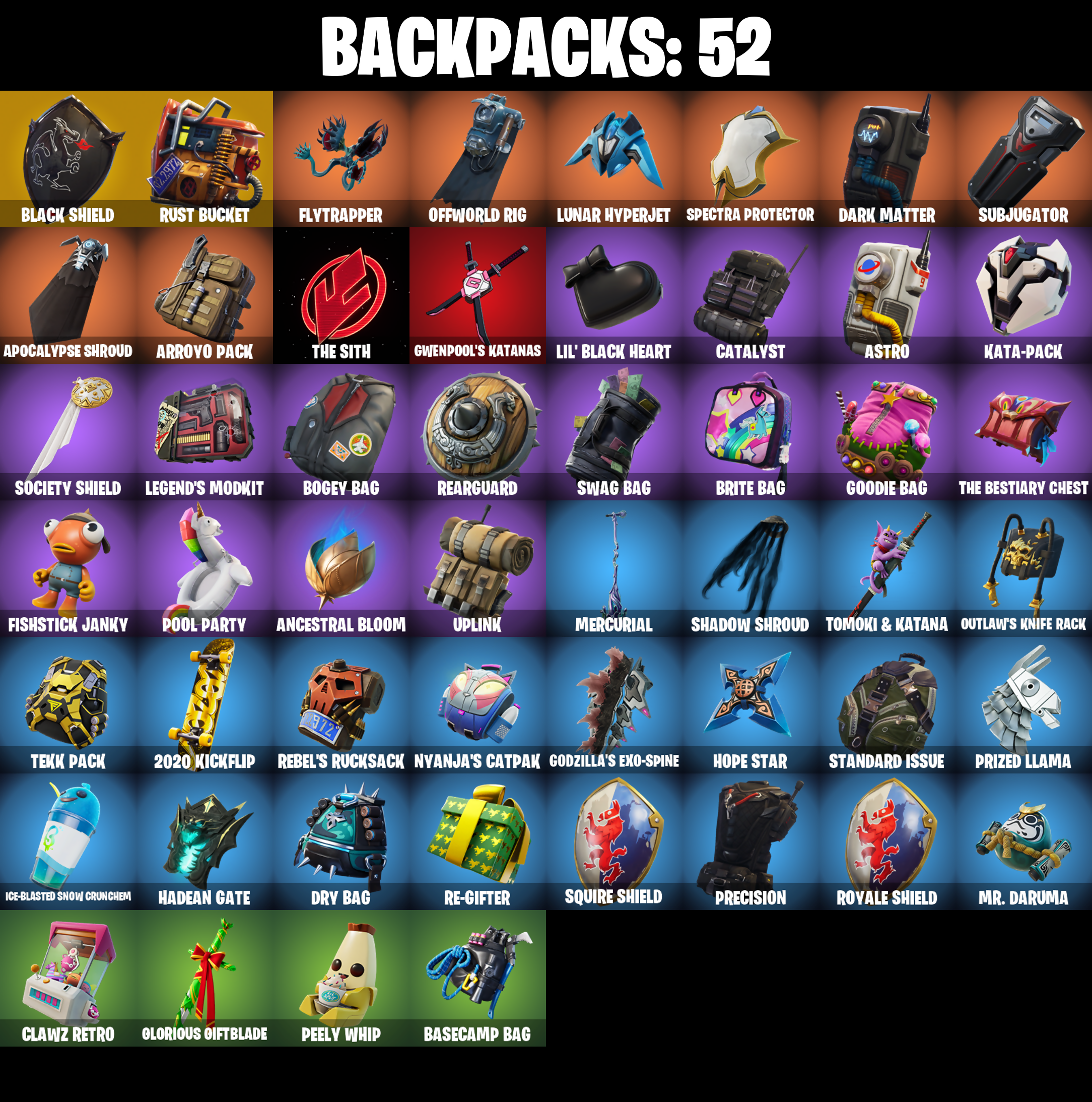 2020 Kickflip, Ac/Dc, Ancestral Bloom, Apocalypse Shroud, Arroyo Pack, Astro, Axecalibur, Balloon Axe, Bananaxe, Base Jumper, Basecamp Bag, Battlehawk, Beach Umbrella, Beep Beep, Best Mates, Black Knight, Black Shield, Blade Of The Waning Moon, Blue Squire, Bogey Bag, Boogie Down, Boulder Breakers, Bounty 'Brella, Breathless Blades, Brite Bag, Brite Gunner, Bubbloon, Bullet Rider, Calamity, Calamity Stage 5, Calculated, Call Me, Carbide, Carbide Armor Stage 5, Carbon, Catalyst, Celebratory Slice, Choice Knit, Chrombrella, Classified, Clawz Retro, Clean Sweep, Cliffside Soarer, Conquest, Crescent Shroom, Crowning Achievement, Cruiser, Crystal Fang, DJ Yonder, Dark Matter, Dark Voyager, Downpour, Downshift, Doze Dab, Dragonhearted 'Brella, Drift, Drift Stage 5, Dry Bag, Elite Agent, Elite Servo, Enforcer, Eva, Fishstick Janky, Flapjack Flyer, Flippin' Away, Flippin' Sexy, Floss, Flytrap, Flytrapper, Foil Flex, Frosty Globes, Gale Force, Gangnam Style, Gentleman's Dab, Get Down!, Get Griddy, Glorious Giftblade, Godzilla's Exo-Spine, Goodie Bag, Groove Jam, Gum Brawler, Gwenpool's Katanas, Hadean Gate, High Octane, High Society Glider, Holiday Boxy, Holly Hatchets, Hope Star, Huntress, Hype, I Declare!, Ice-Blasted Snow Crunchem, Intrepid, It's... You?, Josie, Kata-Pack, Laugh It Up, Legend's Modkit, Lil' Black Heart, Lock It Up, Log Axe, Lollipopper, Love It!, Lt. Evergreen, Lunar Hyperjet, Lunar Skyspan, Make It Rain, Mako, Mercurial, Mighty Marvel 'Brella, Millennium Falcon, Mission Specialist, Moonwalker, Mr. Daruma, Nanner Bashers, Night Kama, Ninja Stance: Leo, Nyanja's Catpak, Offworld Rig, Omega, Onslaught, Orange Justice, Outlaw's Knife Rack, Outlaw's Whipknives, Paper Parasol, Peely Whip, Peppermint Pick, Perfect Pivot, Picnic, Pony Up, Pool Party, Popcorn, Positron, Precision, Premiere Poms, Prized Llama, Pulse Axe, Rainbow Rider, Re-Gifter, Rearguard, Rebel Brella, Rebel's Rucksack, Reckoning, Redline, Regal Wave, Respect, Respect The Peace, Ride The Pony, Rift Edge, Rogue Agent, Rook, Royale Knight, Royale Shield, Royale X, Rust Bucket, Rust Lord, Salute, Savage, Sawtooth, Scarlet Longboard, Secret Scimitars, Seven Signet, Shadow Shroud, Shaolin Sit-Up, Sharpshooter, Shooting Starstaff, Shortbread Slicers, Sing Along, Sir Glider The Brave, Skellefish, Skerran, Sledgehammer, Slow Clap, Snowfall, Snowflake, Snowshaker, Society Shield, Sparkle Specialist, Spectra Protector, Splashdown, Squad Leader, Squire Shield, Standard Issue, Subjugator, Sugar Crash, Sun Strider, Swag Bag, Swell Striker, Swipe It, Tagged 'Brella, Take The L, Tekk Hacker, Tekk Pack, Teknique, The Ace, The Bestiary Chest, The MCC, The Olympian, The Reaper, The Robot, The Sith, The Takedown, The Umbrella, The Visitor, The Worm, Time Brella, Tomoki & Katana, Treefall, True Love, Trusty No. 2, Turbulent Blade, Umbrella of the Last Reality, Uplink, Valor, Wakandan Salute, Wave, Wavebreaker, Wet Paint, Wingman, Wings of Valor, Winterfest Bushranger, Wooly Warrior, You're Awesome, Zoey