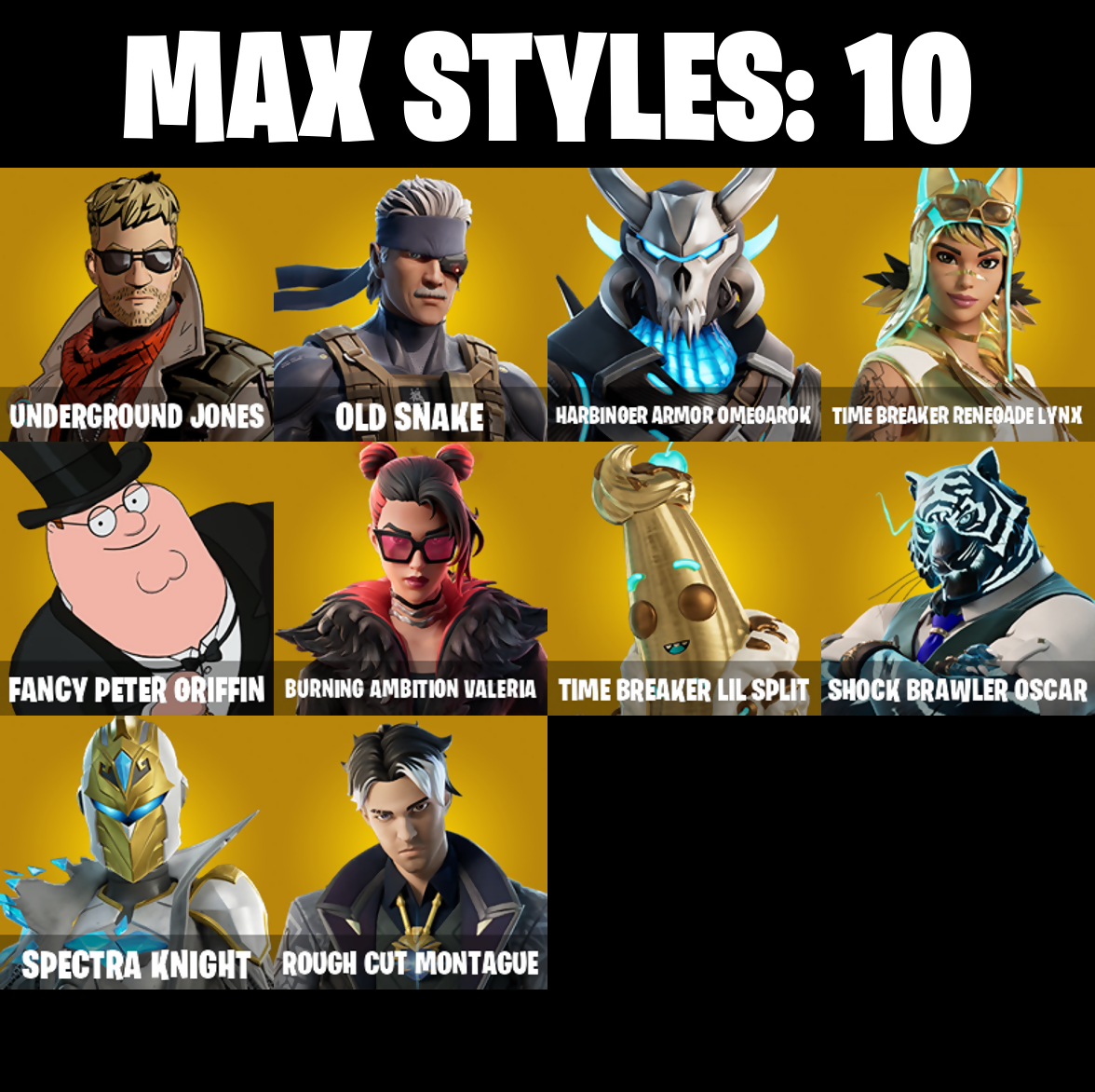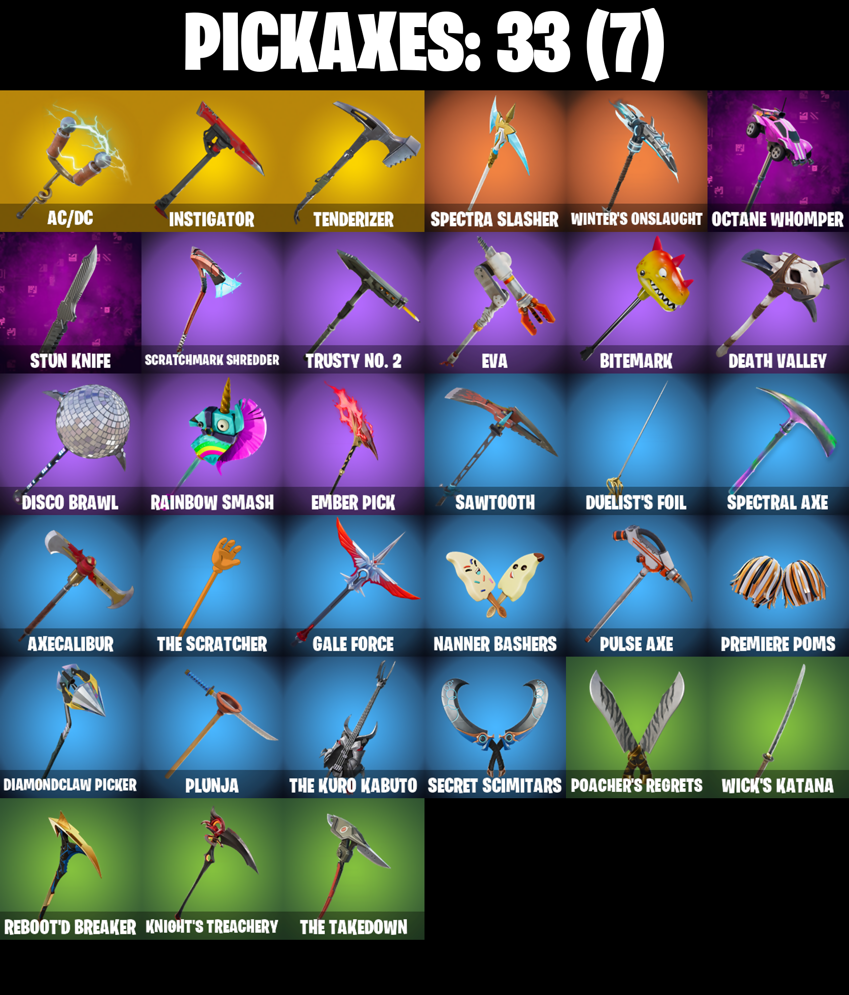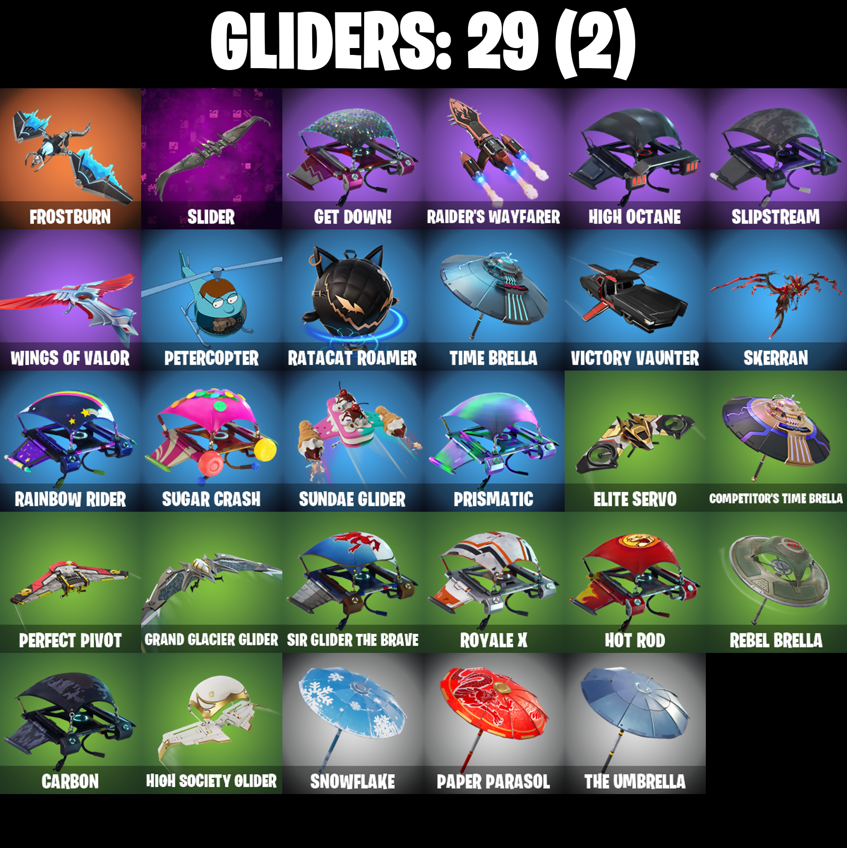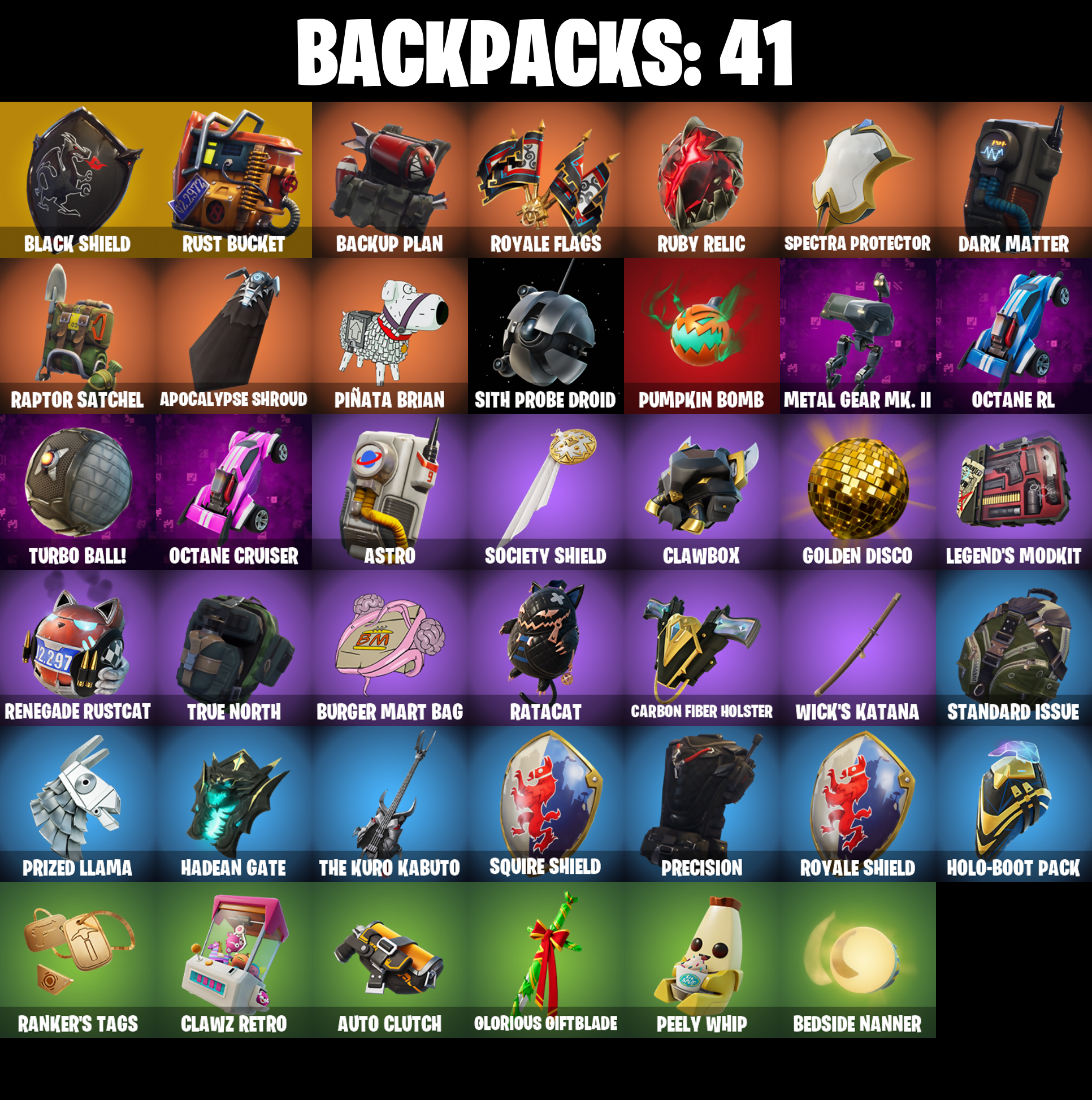 Ac/Dc, Apocalypse Shroud, Astro, Auto Clutch, Axecalibur, Backup Plan, Battlehawk, Bedside Nanner, Best Mates, Bitemark, Black Knight, Black Shield, Blue Squire, Burger Mart Bag, Burning Ambition Valeria, Carbide, Carbon, Carbon Fiber Holster, Card Drop, Clawbox, Clawz Retro, Competitor's Time Brella, Crowning Achievement, Dark Matter, Dark Voyager, Darth Maul, Death Valley, Devastator, Diamond Throne, Diamondclaw Picker, Disco Brawl, Do The Split, Doze Dab, Duelist's Foil, Elite Agent, Elite Servo, Ember Pick, Eva, Fancy Peter Griffin, Flashback Breakdown, Floss, Foil Flex, Freestylin', Fresh, Frostburn, Funk Ops, Gale Force, Get Down!, Glorious Giftblade, Golden Disco, Grand Glacier Glider, Green Goblin, Hadean Gate, Harbinger Armor Omegarok, Havoc, High Octane, High Society Glider, Holiday Boxy, Holo-Boot Pack, Hope, Hot Rod, I'm A Mystery, Instigator, Invincible, Jubilation, Knife Sharpener, Knight's Treachery, Legend's Modkit, Lil Split, Lil' Longboat, Make It Rain, Metal Gear Mk. II, Mission Specialist, Montague, Moonwalker, Nanner Bashers, Ninja Stance: Leo, Nisha, Octane Cruiser, Octane RL, Octane Whomper, Old Snake, Omegarok, Orange Justice, Oscar, Paper Parasol, Peely Whip, Perfect Pivot, Peter Griffin, Petercopter, Piñata Brian, Plunja, Poacher's Regrets, Pony Up, Popcorn, Precision, Premiere Poms, Prismatic, Prized Llama, Pulse Axe, Pumpkin Bomb, Raider's Wayfarer, Rainbow Rider, Rainbow Smash, Ranker's Tags, Raptor, Raptor Satchel, Ratacat, Ratacat Roamer, Rebel Brella, Reboot'd Breaker, Renegade Lynx, Renegade Rustcat, Ride The Pony, Rough Cut Montague, Royale Flags, Royale Knight, Royale Shield, Royale X, Ruby Relic, Runway Racer, Rust Bucket, Rust Lord, Salute, Sawtooth, Scratchmark Shredder, Secret Scimitars, Shock Brawler Oscar, Sir Glider the Brave, Sith Probe Droid, Skerran, Slider, Slipstream, Snowflake, Society Shield, Solid Snake, Sparkle Specialist, Spectra Knight, Spectra Protector, Spectra Slasher, Spectral Axe, Squire Shield, Standard Issue, Stun Knife, Sub Commander, Sugar Crash, Sundae Glider, Take The L, Teknique, Tenderizer, The Kuro Kabuto, The Reaper, The Renegade, The Robot, The Scratcher, The Takedown, The Umbrella, The Worm, Time Breaker Lil Split, Time Breaker Renegade Lynx, Time Brella, Trailblazer, True North, Trusty No. 2, Turbo Ball!, Underground Jones, Valeria, Vengeance Jones, Victory Vaunter, Wave, Wick's Katana, Wings of Valor, Winter's Onslaught, Winterfest Bushranger, Wukong