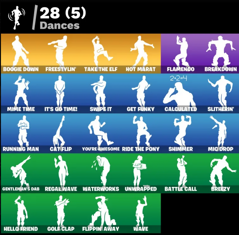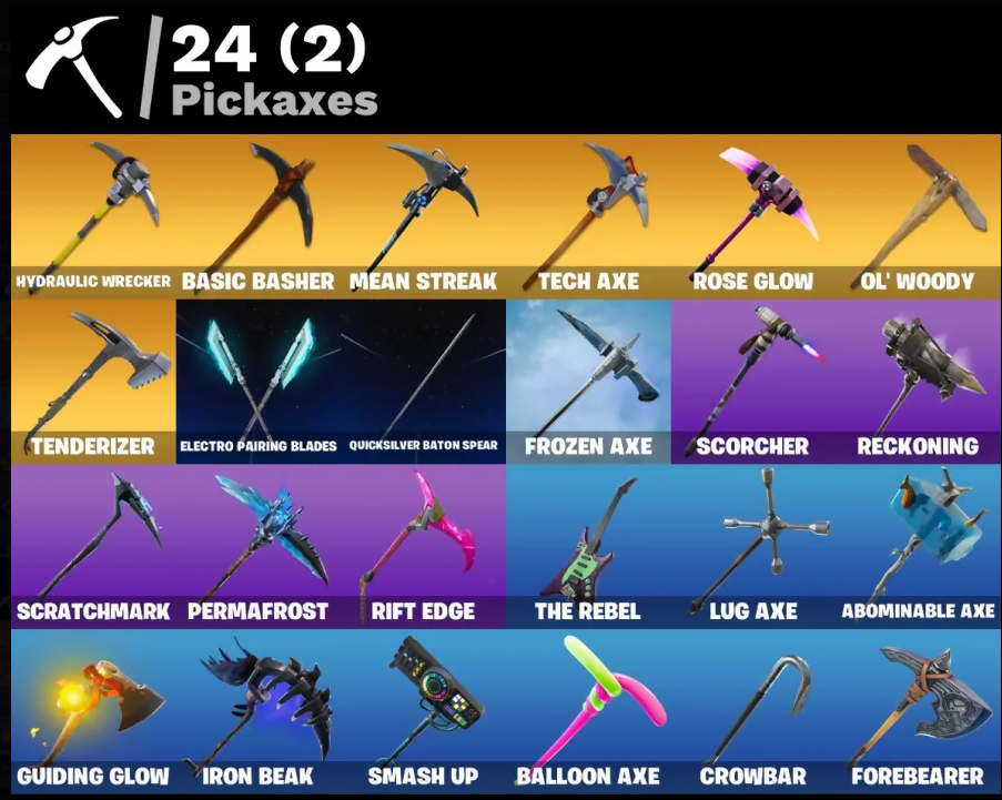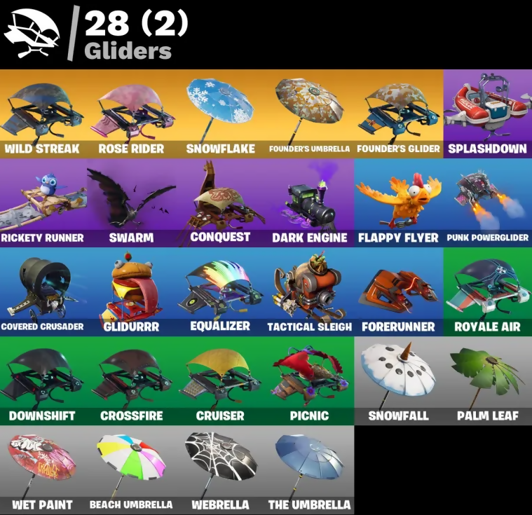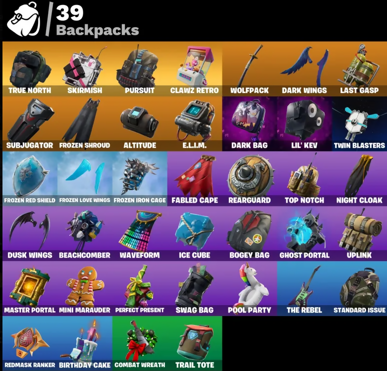 A.I.M., Abominable Axe, Altitude, Balloon Axe, Basic Basher, Battle Call, Beach Umbrella, Beachcomber, Birthday Cake, Black Werewolf, Bogey Bag, Boogie Down, Brainiac, Breakdown, Breezy, Calamity Stage 5, Calculated, Cat Flip, Clawz Retro, Combat Wreath, Conquest, Covered Crusader, Crossfire, Crowbar, Cruiser, DJ Yonder, Dark Bag, Dark Bomber, Dark Engine, Dark Wings, Downshift, Drift Stage 5, Dusk, Dusk Wings, E.L.I.M., Electro Pairing Blades, Enforcer, Equalizer, Fable, Fabled Cape, Flamenco, Flappy Flyer, Flippin' Away, Forebearer, Forerunner, Founder's Glider, Founder's Umbrella, Freestylin', Frozen Axe, Frozen Iron Cage, Frozen Love Ranger, Frozen Love Wings, Frozen Raven, Frozen Red Knight, Frozen Red Shield, Frozen Shroud, Garrison, Gentleman's Dab, Get Funky, Ghost Portal, Giddy-Up, Glidurrr, Golf Clap, Guiding Glow, Hello Friend, Hot Marat, Huntress, Hydraulic Wrecker, Ice Cube, Iron Beak, It's Go Time!, Last Gasp, Lil' Kev, Lug Axe, Lynx (Stage 4 - No Ponytail), Master Portal, Mean Streak, Merry Marauder, Mic Drop, Mime Time, Mini Marauder, Night Cloak, Nightshade, Ol' Woody, Palm Leaf, Perfect Present, Permafrost, Picnic, Pool Party, Powder, Punk Powerglider, Pursuit, Quicksilver Baton Spear, Ragnarok (No Shoulder Pad), Ravage, Rearguard, Reckoning, Red-Nosed Raider, Redline, Redmask Ranker, Regal Wave, Rickety Runner, Ride The Pony, Rift Edge, Rook, Rose Glow, Rose Rider, Rose Team Leader, Royale Air, Running Man, Scorcher, Scratchmark, Sgt. Winter Headgear, Shimmer, Skirmish, Skull Trooper, Sky Stalker, Sledgehammer, Slitherin', Smash Up, Snowfall, Snowflake, Splashdown, Standard Issue, Subjugator, Summit Striker, Sun Strider, Swag Bag, Swarm, Swipe It, Tactical Sleigh, Take The Elf, Tech Axe, Tenderizer, The Ace, The Rebel, The Umbrella, Top Notch, Trail Tote, Trailblazer, Trog, True North, Twin Blasters, Unwrapped, Uplink, Warpaint, Waterworks, Wave, Waveform, Webrella, Wet Paint, Wild Streak, Wingman, Wolfpack, You're Awesome, Zenith (Stage 4)