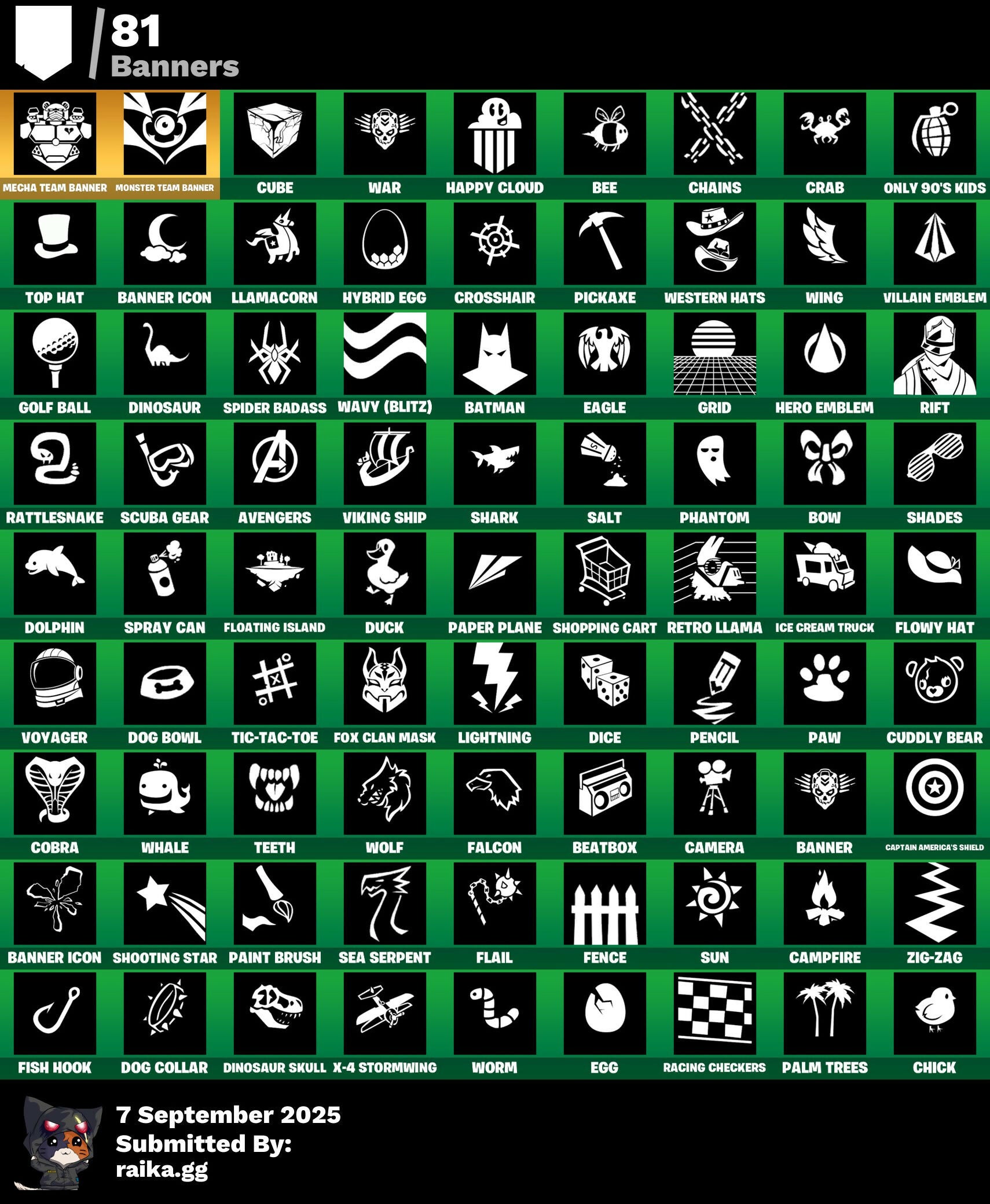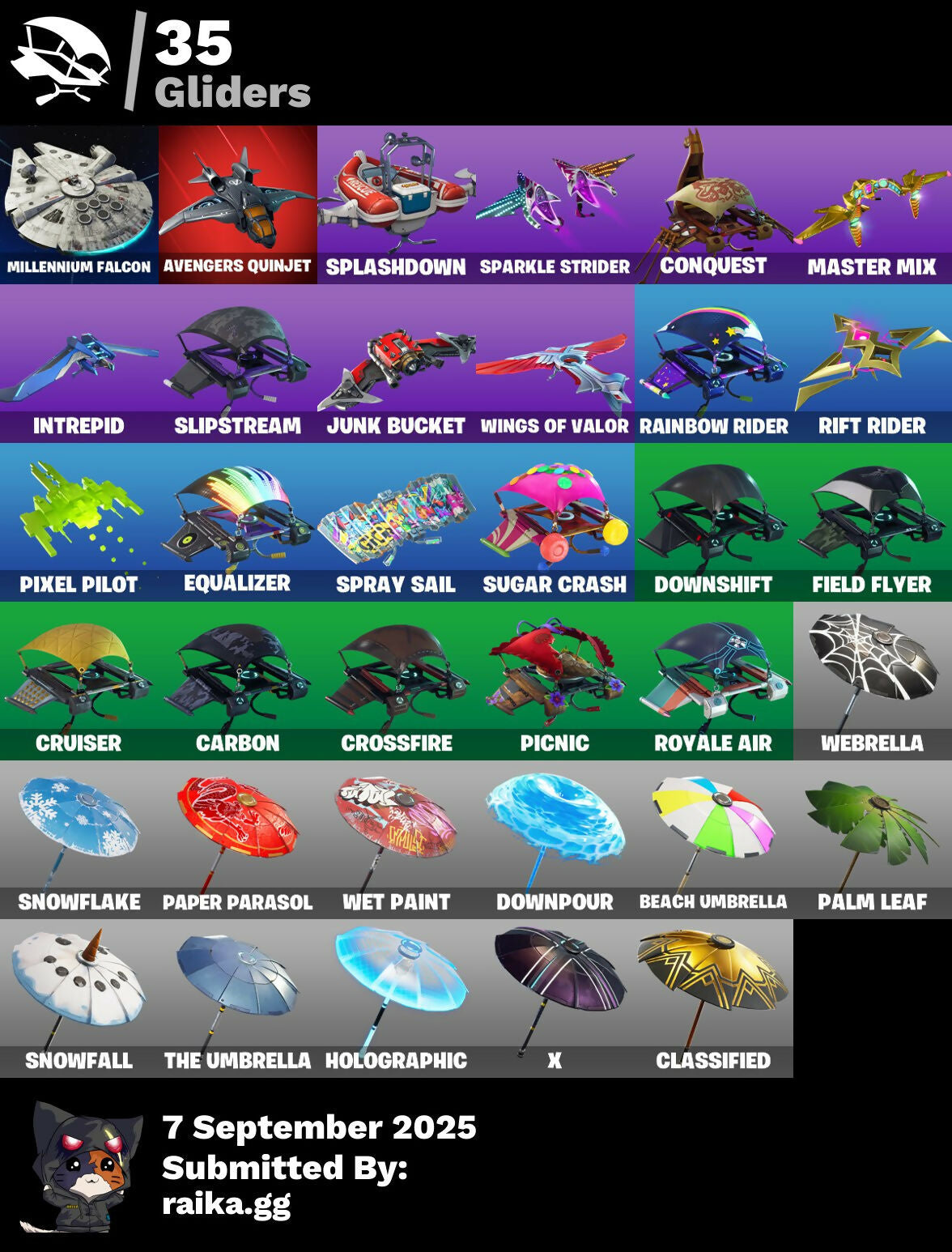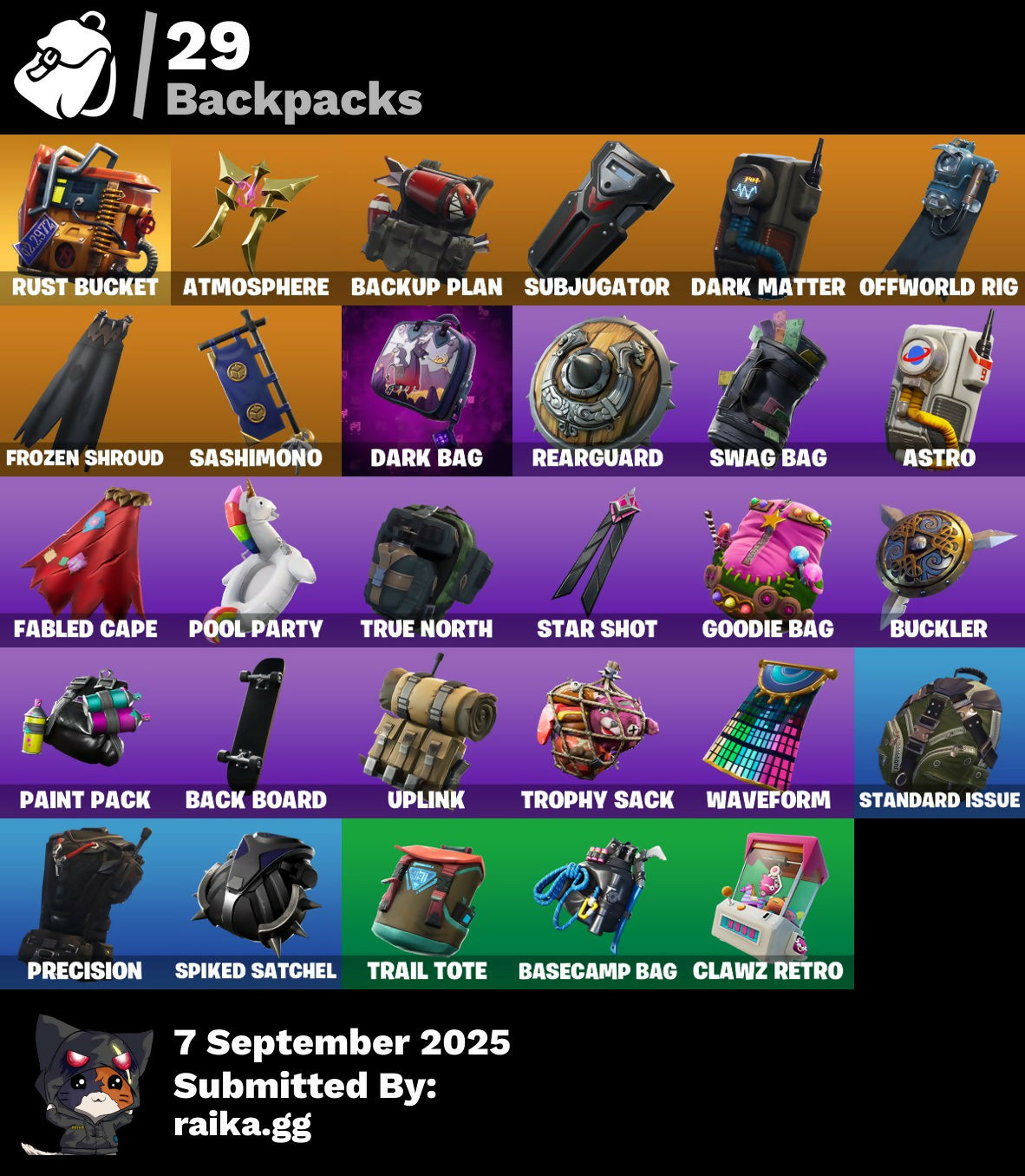 Abstract, Arrow, Astro, Atmosphere, Avengers, Avengers Logo, Avengers Quinjet, Back Board, Backup Plan, Balloon Axe, Banner, Banner Icon, Basecamp Bag, Batman, Battlehawk, Beach Umbrella, Beatbox, Bee, Best Mates, Blowing Bubbles, Boogie, Boulder Breakers, Bow, Breakdown, Breakneck, Brush Your Shoulders, Buckler, Bunker Basher, Butterfly, Calamity, Calamity Stage 5, Calculated, Call Me, Camera, Campfire, Captain America's Shield, Carbide, Carbon, Cash Grab, Catalyst, Catalyst (Overcharged), Chains, Chalk Outline, Chick, Circle, Classified, Clawz Retro, Cobra, Comet, Conquest, Cosmic Cleavers, Crab, Crazy Castle, Crossfire, Crosshair, Cruiser, Cube, Cuddly Bear, Cursed, DJ Yonder, Dabstand, Dark Bag, Dark Bomber, Dark Matter, Dark Voyager, Dice, Dinosaur, Dinosaur Skull, Do It!, Dog Bowl, Dog Collar, Dolphin, Downpour, Downshift, Drift, Drift Stage 5, Duck, Durrr, Dusty Devastation, E.G.O., Eagle, Egg, Electro Shuffle, Elite Agent, Emote Camo, Enforcer, Eq, Equalizer, Eva, Fabled Cape, Fake Door, Falcon, Fang Saws, Featherweight, Fence, Field Flyer, Fire V Ice, Fish Hook, Flail, Flex On 'Em, Flippin' Incredible, Floating Island, Flowy Hat, Focused, Fox Clan Mask, Freestylin', Frosted, Frostwing, Frozen Shroud, Fryangles, G.O.A.T., GG Ornament, GG Potion, GG Smiley, GG Snakes, GG Snowman, Gale Force, Gentleman's Dab, Giddy-up, Golden Pigskin, Golf Ball, Golf Clap, Good Vibes, Goodie Bag, Grid, Groove Jam, Guiding Glow, Happy Cloud, Havoc, Hearts, Hello Friend, Hero Emblem, Highland Warrior, Holographic, Huntress, Hybrid Egg, Hype, I Declare!, Ice Cream Truck, Infinity Gauntlet, Instigator, Intrepid, Jaywalking, Jubilation, Junk Bucket, Keep It Mello, Kevin, Kevin Runes, Kiss, Knighted, Laser Chomp, Lightning, Llama De Muertos, Llamacorn, Lobby Classic, Lollipopper, Looted, Lucha GG, Lug Axe, Manhole Cover, Mask, Master Mix, Mecha Team Banner, Mello Made It Right, Meow Moon, Millennium Falcon, Mission Specialist, Moisty Mire, Monster Team Banner, Moonwalker, Musha, Norse Llama, Offworld Rig, Omega, Only 90's Kids, Onslaught, Orange Justice, Paint Brush, Paint Pack, Palm Leaf, Palm Trees, Paper Parasol, Paper Plane, Paw, Pencil, Permafrost, Phantom, Pickaxe, Picnic, Pixel Pilot, Pixels Royale, Pony Up, Pool Party, Popcorn, Positron, Potato Aim, Precision, Psycho, Punched Up, Racing Checkers, Rage Quit, Ragnarok, Ragnarok (No Shoulder Pad), Rainbow, Rainbow Rider, Rattlesnake, Raven, Rearguard, Reckoning, Redline, Regal Wave, Renegade Rollers, Respect, Respect The Peace, Retro Llama, Ride The Pony, Rift, Rift Edge, Rift Rider, Risky Reels, Rock Love, Rocket, Rook, Royal Stroll, Royale Air, Running Man, Rust Bucket, Rust Lord, Sad Trombone, Salt, Salute, Sashimono, Sawtooth, Scarlet Defender, Scorpion, Scuba Gear, Sea Serpent, Sgt. Winter, Shades, Shadow Ops, Shark, Shooting Star, Shooting Starstaff, Shopping Cart, Skull & Beard, Slam Dunk, Sledgehammer, Slipstream, Smash Up, Snowfall, Snowflake, Sparkle Scythe, Sparkle Specialist, Sparkle Strider, Sparkle Supreme, Sparkle Supreme (Bob Cut), Sparkler, Spider Badass, Spiderweb, Spiked Satchel, Splashdown, Spray Can, Spray Sail, Squad Leader, Standard Issue, Star Shot, Stay Smooth, Strawberry Paws, Stride, Sub Commander, Subjugator, Sugar Crash, Sun, Sun Strider, Sunbird, Sushi, Swag Bag, Swipe It, Take The L, Team Mech, Teeth, Teknique, Tenderizer, The Ace, The Reaper, The Robot, The Umbrella, The Visitor, This Many, Thorny Love, Three Llamas, Tic-Tac-Toe, Tidy, Tilted Map, Tilted Teknique, Tilted Teknique (Hoodie), Top Hat, Tra La La, Trail Tote, Trailblazer, Trap Warning, Trophy Sack, True North, Trusty No. 2, Tunnel, Uplink, Valor, Viking Ship, Villain Emblem, Voyager, War, Wave, Waveform, Wavy (Blitz), Webrella, Western Hats, Wet Paint, Whale, Window, Wing, Wings Of Valor, Wolf, Worm, X, X Mark, X-4 Stormwing, X-Lord (Scavenger), X-lord, Yay!, Yond3r, You're Awesome, Yummy, Zig-Zag, Zoey