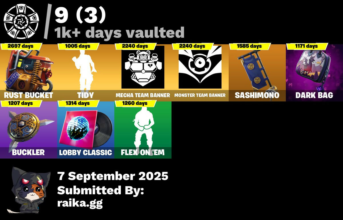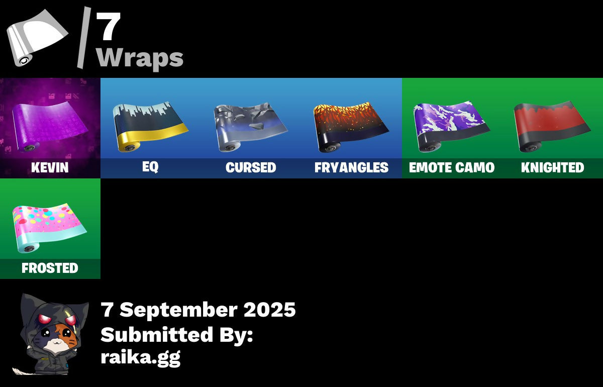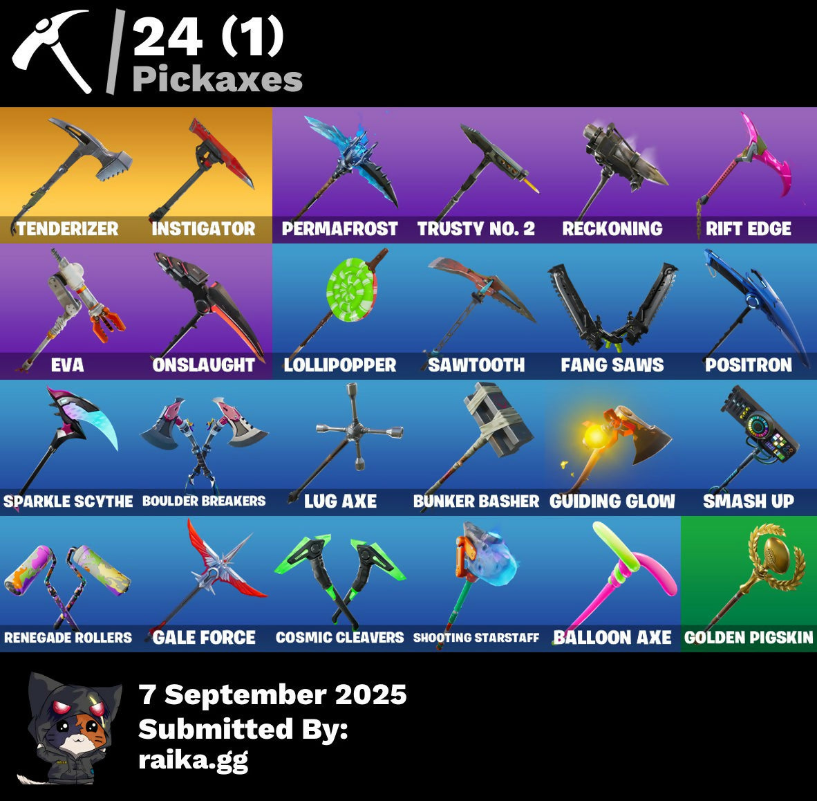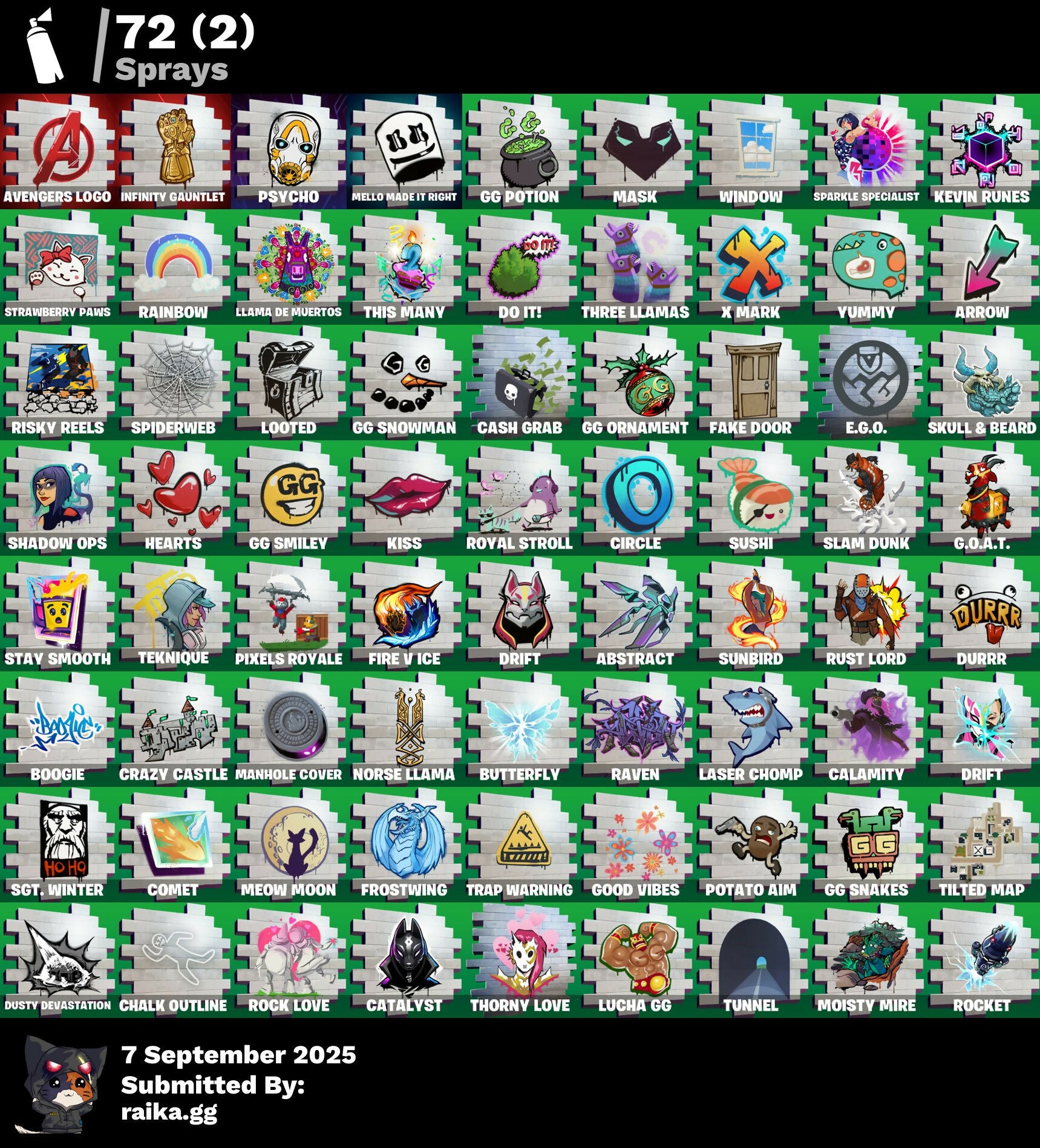Abstract, Arrow, Astro, Atmosphere, Avengers, Avengers Logo, Avengers Quinjet, Back Board, Backup Plan, Balloon Axe, Banner, Banner Icon, Basecamp Bag, Batman, Battlehawk, Beach Umbrella, Beatbox, Bee, Best Mates, Blowing Bubbles, Boogie, Boulder Breakers, Bow, Breakdown, Breakneck, Brush Your Shoulders, Buckler, Bunker Basher, Butterfly, Calamity, Calamity Stage 5, Calculated, Call Me, Camera, Campfire, Captain America's Shield, Carbide, Carbon, Cash Grab, Catalyst, Catalyst (Overcharged), Chains, Chalk Outline, Chick, Circle, Classified, Clawz Retro, Cobra, Comet, Conquest, Cosmic Cleavers, Crab, Crazy Castle, Crossfire, Crosshair, Cruiser, Cube, Cuddly Bear, Cursed, DJ Yonder, Dabstand, Dark Bag, Dark Bomber, Dark Matter, Dark Voyager, Dice, Dinosaur, Dinosaur Skull, Do It!, Dog Bowl, Dog Collar, Dolphin, Downpour, Downshift, Drift, Drift Stage 5, Duck, Durrr, Dusty Devastation, E.G.O., Eagle, Egg, Electro Shuffle, Elite Agent, Emote Camo, Enforcer, Eq, Equalizer, Eva, Fabled Cape, Fake Door, Falcon, Fang Saws, Featherweight, Fence, Field Flyer, Fire V Ice, Fish Hook, Flail, Flex On 'Em, Flippin' Incredible, Floating Island, Flowy Hat, Focused, Fox Clan Mask, Freestylin', Frosted, Frostwing, Frozen Shroud, Fryangles, G.O.A.T., GG Ornament, GG Potion, GG Smiley, GG Snakes, GG Snowman, Gale Force, Gentleman's Dab, Giddy-up, Golden Pigskin, Golf Ball, Golf Clap, Good Vibes, Goodie Bag, Grid, Groove Jam, Guiding Glow, Happy Cloud, Havoc, Hearts, Hello Friend, Hero Emblem, Highland Warrior, Holographic, Huntress, Hybrid Egg, Hype, I Declare!, Ice Cream Truck, Infinity Gauntlet, Instigator, Intrepid, Jaywalking, Jubilation, Junk Bucket, Keep It Mello, Kevin, Kevin Runes, Kiss, Knighted, Laser Chomp, Lightning, Llama De Muertos, Llamacorn, Lobby Classic, Lollipopper, Looted, Lucha GG, Lug Axe, Manhole Cover, Mask, Master Mix, Mecha Team Banner, Mello Made It Right, Meow Moon, Millennium Falcon, Mission Specialist, Moisty Mire, Monster Team Banner, Moonwalker, Musha, Norse Llama, Offworld Rig, Omega, Only 90's Kids, Onslaught, Orange Justice, Paint Brush, Paint Pack, Palm Leaf, Palm Trees, Paper Parasol, Paper Plane, Paw, Pencil, Permafrost, Phantom, Pickaxe, Picnic, Pixel Pilot, Pixels Royale, Pony Up, Pool Party, Popcorn, Positron, Potato Aim, Precision, Psycho, Punched Up, Racing Checkers, Rage Quit, Ragnarok, Ragnarok (No Shoulder Pad), Rainbow, Rainbow Rider, Rattlesnake, Raven, Rearguard, Reckoning, Redline, Regal Wave, Renegade Rollers, Respect, Respect The Peace, Retro Llama, Ride The Pony, Rift, Rift Edge, Rift Rider, Risky Reels, Rock Love, Rocket, Rook, Royal Stroll, Royale Air, Running Man, Rust Bucket, Rust Lord, Sad Trombone, Salt, Salute, Sashimono, Sawtooth, Scarlet Defender, Scorpion, Scuba Gear, Sea Serpent, Sgt. Winter, Shades, Shadow Ops, Shark, Shooting Star, Shooting Starstaff, Shopping Cart, Skull & Beard, Slam Dunk, Sledgehammer, Slipstream, Smash Up, Snowfall, Snowflake, Sparkle Scythe, Sparkle Specialist, Sparkle Strider, Sparkle Supreme, Sparkle Supreme (Bob Cut), Sparkler, Spider Badass, Spiderweb, Spiked Satchel, Splashdown, Spray Can, Spray Sail, Squad Leader, Standard Issue, Star Shot, Stay Smooth, Strawberry Paws, Stride, Sub Commander, Subjugator, Sugar Crash, Sun, Sun Strider, Sunbird, Sushi, Swag Bag, Swipe It, Take The L, Team Mech, Teeth, Teknique, Tenderizer, The Ace, The Reaper, The Robot, The Umbrella, The Visitor, This Many, Thorny Love, Three Llamas, Tic-Tac-Toe, Tidy, Tilted Map, Tilted Teknique, Tilted Teknique (Hoodie), Top Hat, Tra La La, Trail Tote, Trailblazer, Trap Warning, Trophy Sack, True North, Trusty No. 2, Tunnel, Uplink, Valor, Viking Ship, Villain Emblem, Voyager, War, Wave, Waveform, Wavy (Blitz), Webrella, Western Hats, Wet Paint, Whale, Window, Wing, Wings Of Valor, Wolf, Worm, X, X Mark, X-4 Stormwing, X-Lord (Scavenger), X-lord, Yay!, Yond3r, You're Awesome, Yummy, Zig-Zag, Zoey
