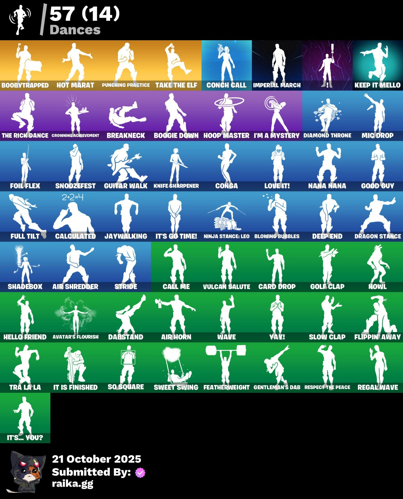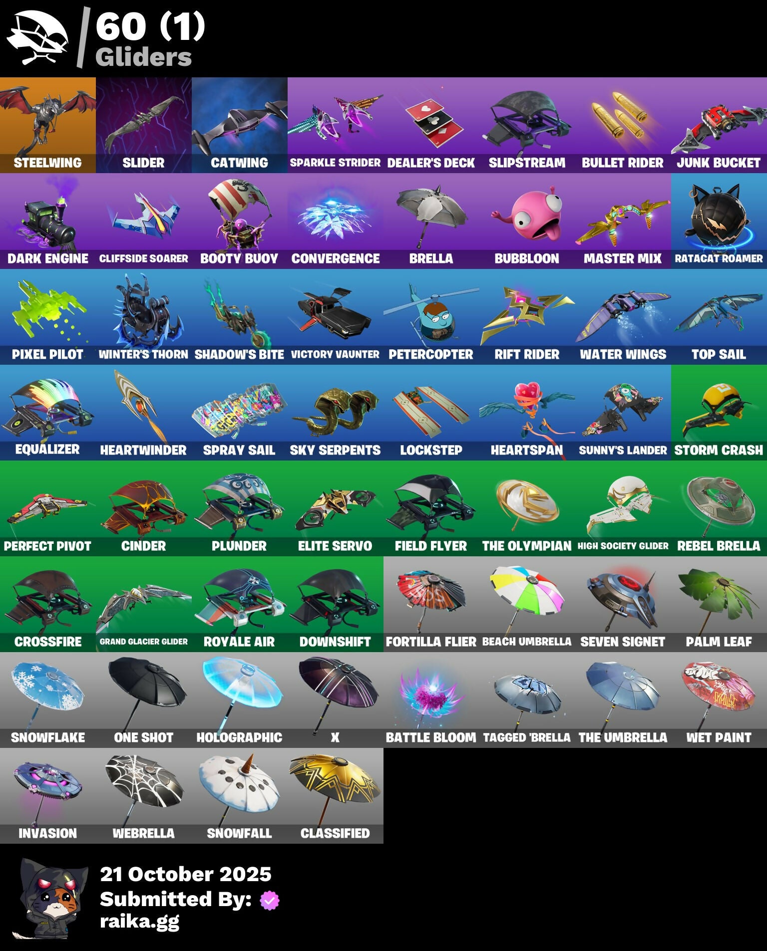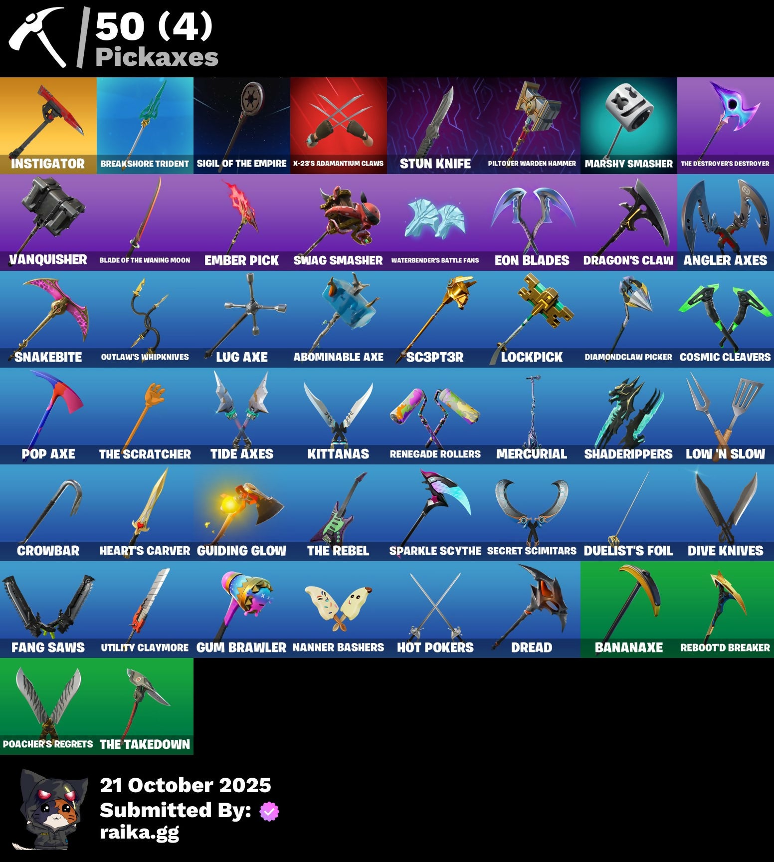 8-Ball Janky, Abominable Axe, Adira's Battle Flag, Air Horn, Air Shredder, Ancestral Bloom, Angler Axes, Aphrodite, Arcane Vi, Arroyo Pack, Atmosphere, Avatar's Flourish, Back Board, Backup Plan, Bananaxe, Battle Bloom, Beach Umbrella, Beachcomber, Bedside Nanner, Birthday Cake, Blackheart, Blade Of The Waning Moon, Blowing Bubbles, Boobytrapped, Boogie Down, Booty Buoy, Breakneck, Breakshore Trident, Brella, Bubloon, Bullet Rider, Calculated, Call Me, Carbon Fiber Holster, Card Drop, Catalyst, Catwing, Cerberus, Cinder, Classified, Clawbox, Clawz Retro, Cliffside Soarer, Cobra, Combat Wreath, Conch Call, Conga, Convergence, Cosmic Cleavers, Cozy Conch, Crossfire, Crowbar, Crowning Achievement, Crystal Llama, Dabstand, Dark Engine, Dealer's Deck, Deep Dive, Deep End, Diamond Throne, Diamondclaw Picker, Dive Knives, Downshift, Dragon Radar, Dragon Stance, Dragon's Claw, Dragoncrest, Dread, Duelist's Foil, Dying Light, Elite Servo, Ember, Ember Pick, Eon Blades, Equalizer, Eternal Voyager, Fabled Cape, Fade, Fang Saws, Featherweight, Field Flyer, Fishstick Janky, Flippin' Away, Foil Flex, Fortilla Flier, Full Tilt, Gameplan, Gentleman's Dab, Glorious Giftblade, Gold Token, Golf Clap, Good Guy, Grand Glacier Glider, Guiding Glow, Guitar Walk, Gum Brawler, Hadean Gate, Havoc, Heart's Carver, Heart's Rest, Heartspan, Heartwinder, Hello Friend, High Society Glider, Holiday Boxy, Holo-Boot Pack, Holographic, Hoop Master, Hope, Hot Marat, Hot Pokers, Howl, Hybrid, I'm A Mystery, Ice-Blasted Snow Crunchem, Imperial March, Instigator, Invasion, Iris, It Is Finished, It's Go Time!, It's... You?, Jaywalking, Journey vs Hazard, Jules, Junk Bucket, Keep It Mello, Kittanas, Knife Sharpener, Korra, Legend's Modkit, Lil' Kev, Lockpick, Lockstep, Love It!, Low 'N Slow, Lug Axe, Marshy Smasher, Master Key, Master Mix, Master Portal, Memories Of Zaun, Mercurial, Metal Gear Mk. II, Mic Drop, Montague, Mr. Daruma, Mutiny, Nana Nana, Nanner Bashers, Nemesis Box, Ninja Stance: Leo, Nisha, Nyanja's Catpak, Ocean, One Shot, Oscar, Outlaw's Knife Rack, Outlaw's Whipknives, Paint Pack, Palm Leaf, Peely, Peely Whip, Perfect Pivot, Peter Griffin, Petercopter, Piltover Warden Hammer, Pixel Pilot, Piñata Brian, Plunder, Poacher's Regrets, Pool Party, Pop Axe, Poseidon, Prized Llama, Punching Practice, Quack Pack, Ratacat, Ratacat Roamer, Rebel Brella, Rebel's Rucksack, Reboot'd Breaker, Regal Wave, Renegade Rollers, Respect The Peace, Rift Rider, Rose Of Avarice, Roundabout, Royale Air, Ruby Relic, Ruin, Sc3pt3r, Scuba Jonesy, Secret Scimitars, Seven Signet, Shadebox, Shaderippers, Shadow's Bite, Sidewinder, Sigil Of The Empire, Sky Serpents, Slider, Slipstream, Slow Clap, Smoothie, Snakebite, Snoozefest, Snowfall, Snowflake, So Square, Society Shield, Solid Snake, Sparkle Scythe, Sparkle Strider, Sparkle Supreme, Spectra Protector, Spiked Satchel, Spray Sail, Standard Issue, Star Shot, Star Surge, Steelwing, Storm Crash, Stride, Stun Knife, Sub Commander, Sunny's Lander, Supreme Shell, Swag Smasher, Sweet Swing, Tackle Box, Tagged 'Brella, Take The Elf, The Bestiary Chest, The Destroyer's Destroyer, The Olympian, The Rebel, The Rick Dance, The Scientist, The Scratcher, The Takedown, The Umbrella, Tide Axes, Tilted Teknique, Tomoki & Katana, Top Sail, Tra La La, Trail Tote, Trophy Sack, Turk vs Riptide, Twin Crossfire, Ultima Knight, Uplink, Utility Claymore, Valeria, Vanquisher, Vengeance Jones, Verge, Victory Vaunter, Vulcan Salute, Water Wings, Waterbender's Battle Fans, Wave, Waveform, Webrella, Wet Paint, Winter's Thorn, Winterfest Bushranger, X, X-23's Adamantium Claws, X-Lord, Yay!, Yond3r