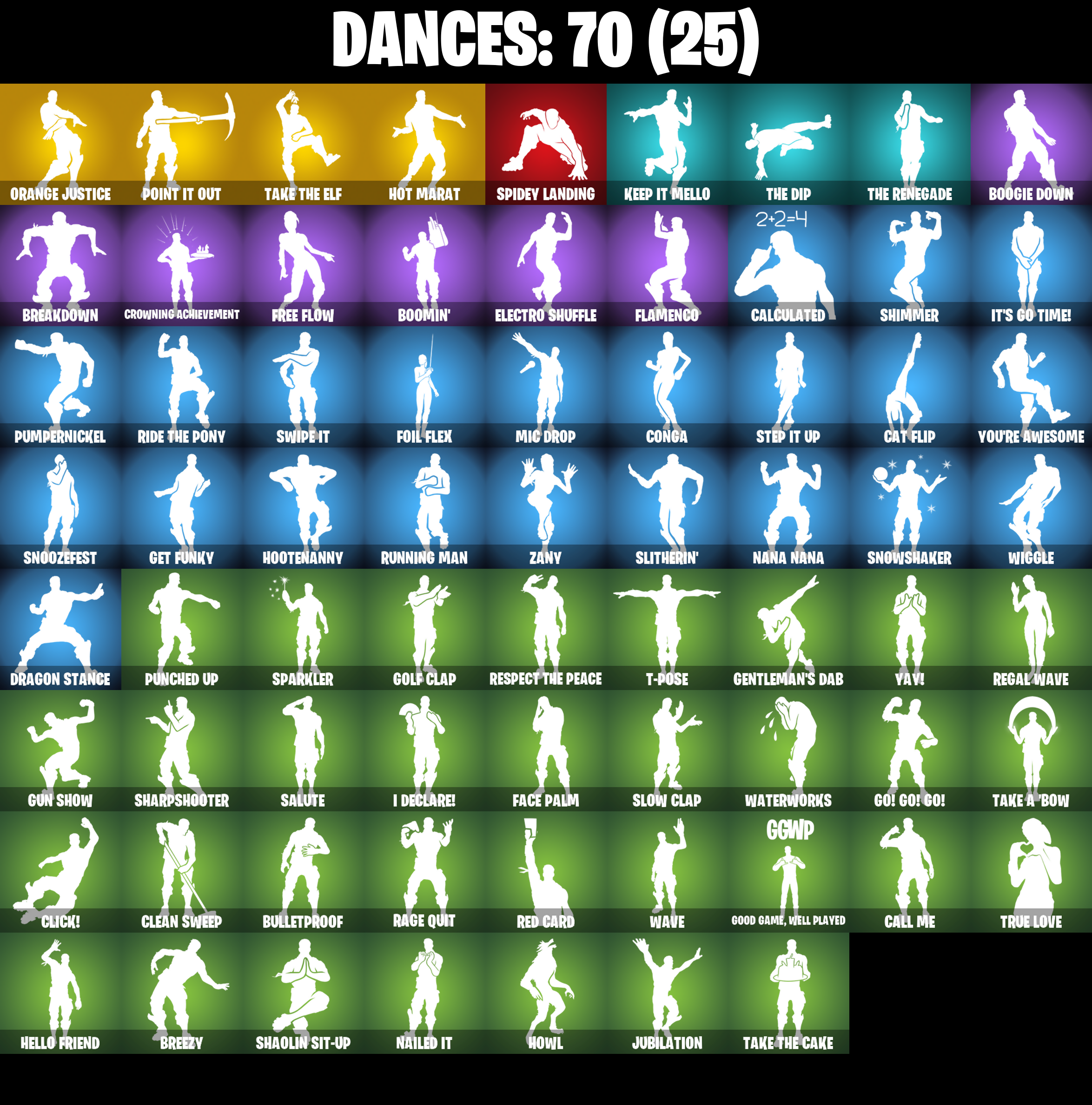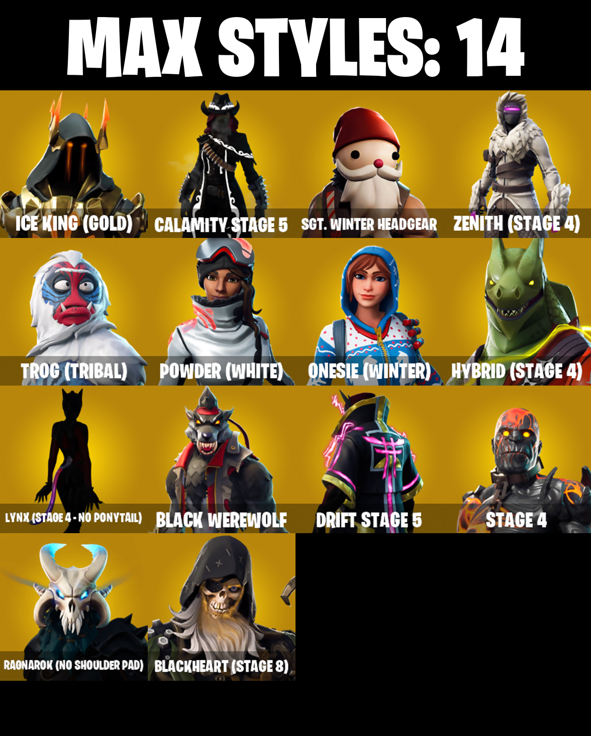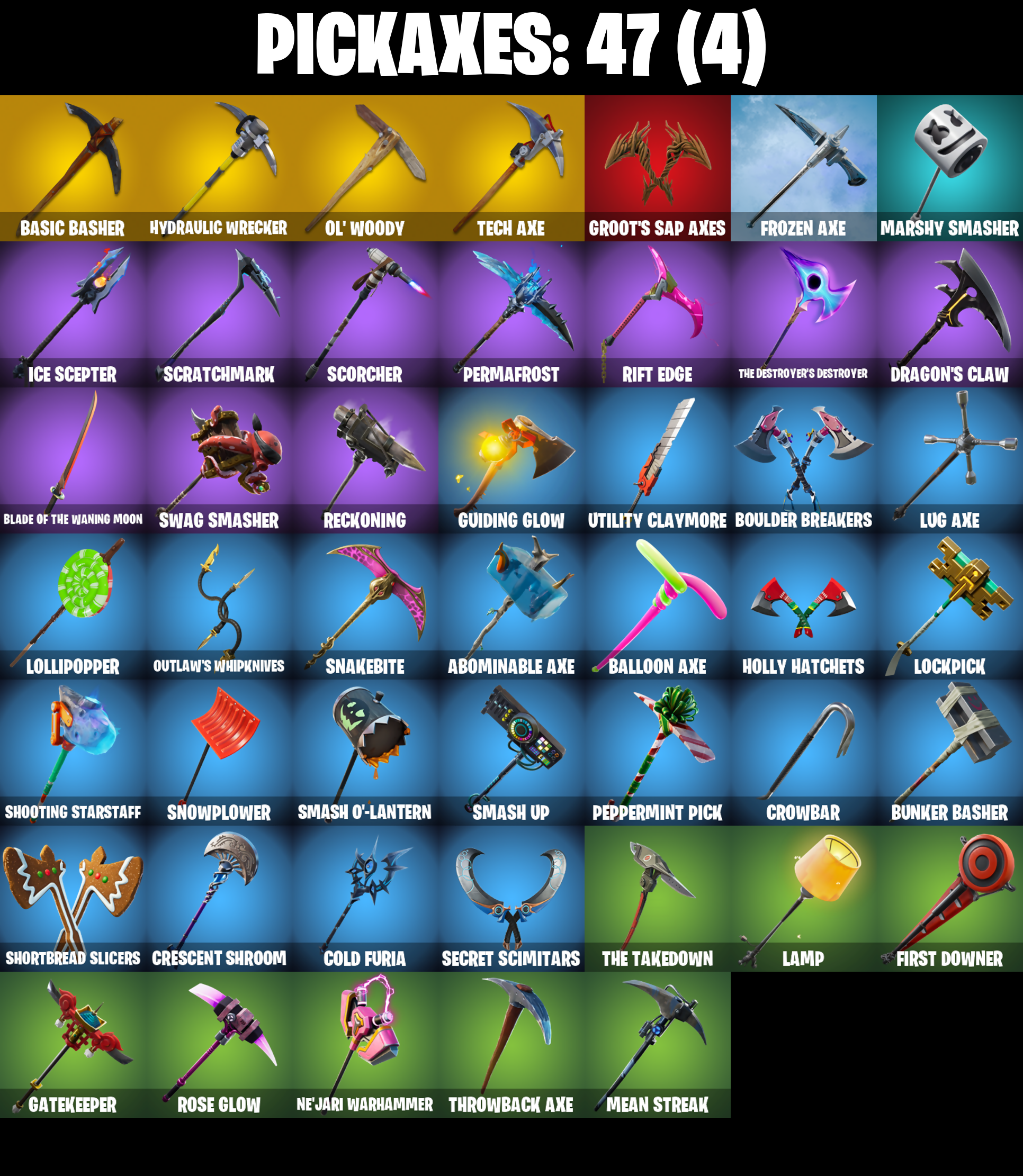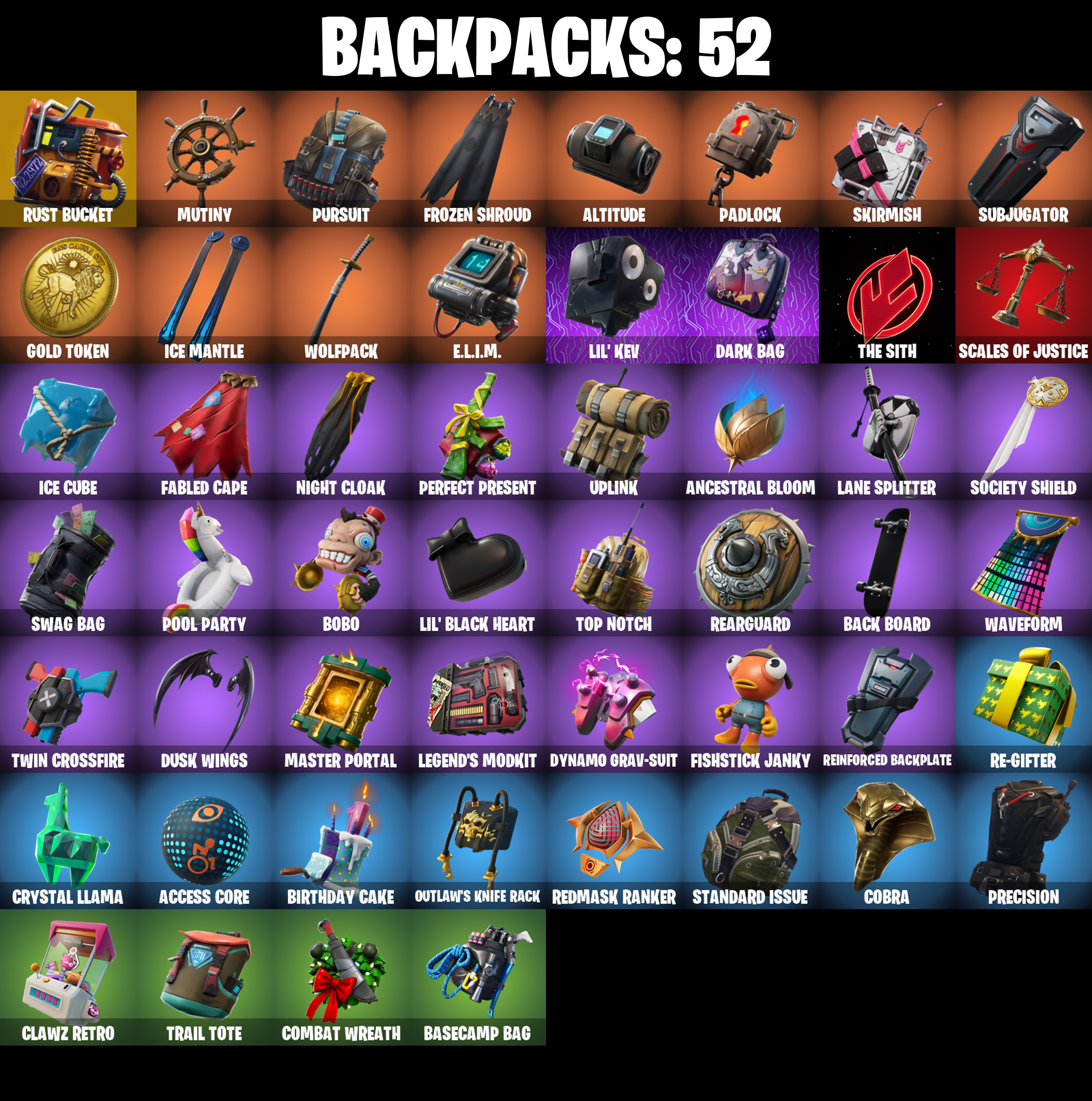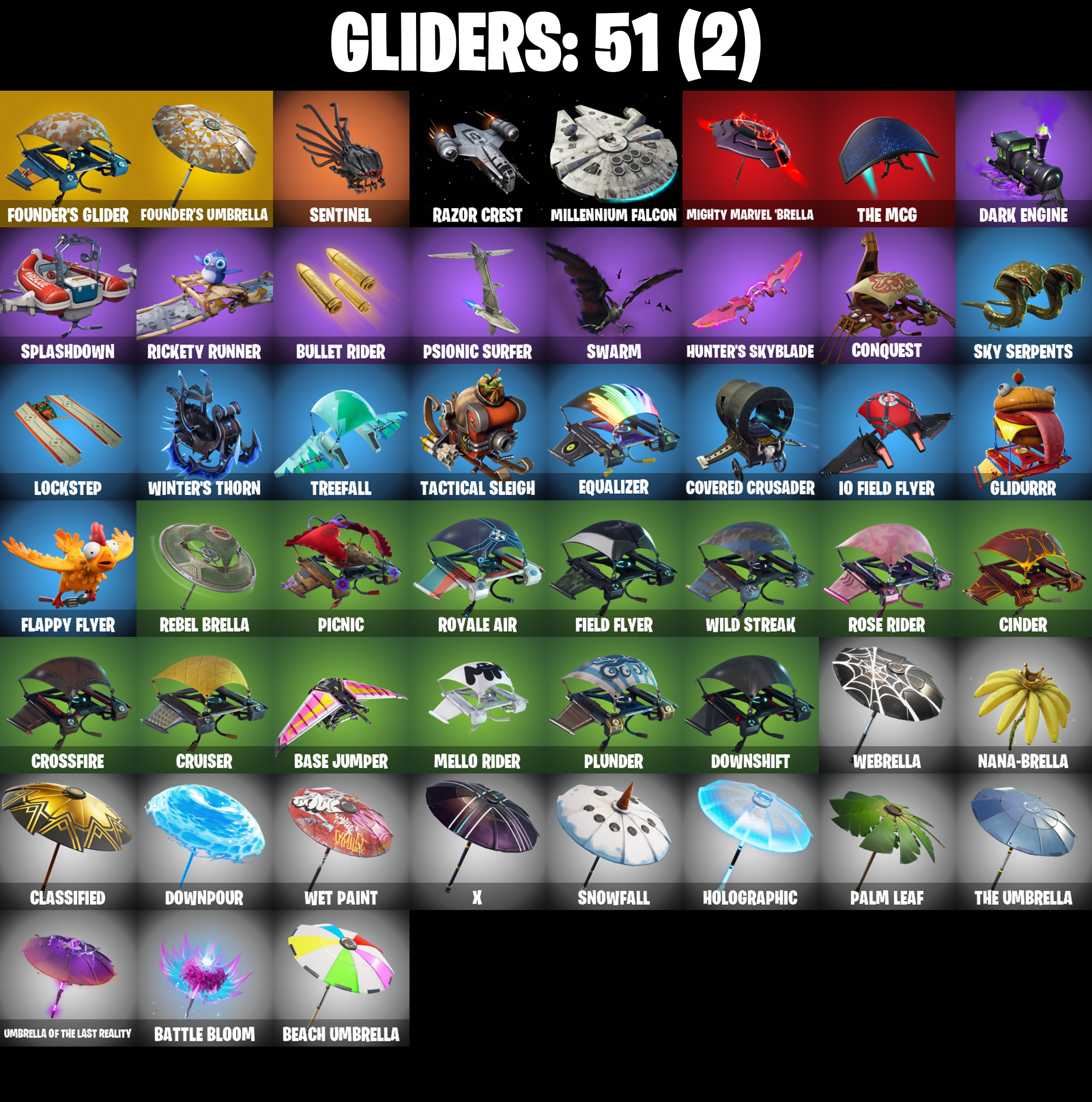 A.I.M., Abominable Axe, Access Core, Altitude, Ancestral Bloom, Back Board, Balloon Axe, Base Jumper, Basecamp Bag, Basic Basher, Battle Bloom, Beach Umbrella, Birthday Cake, Black Werewolf, Blackheart, Blackheart (Stage 8), Blade of the Waning Moon, Bobo, Boogie Down, Boomin', Boulder Breakers, Breakdown, Breezy, Bullet Rider, Bulletproof, Bunker Basher, Calamity, Calamity Stage 5, Calculated, Call Me, Cat Flip, Cinder, Classified, Clawz Retro, Clean Sweep, Click!, Cobalt, Cobra, Cold Furia, Combat Wreath, Conga, Conquest, Covered Crusader, Crescent Shroom, Crossfire, Crowbar, Crowning Achievement, Cruiser, Crystal Llama, DJ Yonder, Dark Bag, Dark Bomber, Dark Engine, Dire, Downpour, Downshift, Dragon Stance, Dragon's Claw, Drift, Drift Stage 5, Dusk, Dusk Wings, Dynamo Grav-Suit, E.L.I.M., Electro Shuffle, Enforcer, Equalizer, Fable, Fabled Cape, Face Palm, Field Flyer, First Downer, Fishstick Janky, Flamenco, Flappy Flyer, Foil Flex, Founder's Glider, Founder's Umbrella, Free Flow, Frozen Axe, Frozen Shroud, Gatekeeper, Gentleman's Dab, Get Funky, Giddy-Up, Glidurrr, Go! Go! Go!, Gold Token, Golf Clap, Good Game, Well Played, Groot's Sap Axes, Guiding Glow, Gun Show, Hello Friend, Holly Hatchets, Holographic, Hootenanny, Hot Marat, Howl, Hunter's Skyblade, Huntress, Hybrid, Hybrid (Stage 4), Hydraulic Wrecker, I Declare!, IO Field Flyer, Ice Cube, Ice King (Gold), Ice Mantle, Ice Scepter, It's Go Time!, Jubilation, Keep It Mello, Lamp, Lane Splitter, Legend's Modkit, Lil' Black Heart, Lil' Kev, Lockpick, Lockstep, Lollipopper, Lt. Evergreen, Lug Axe, Lynx, Lynx (Stage 4 - No Ponytail), Mandalorian, Marshy Smasher, Master Portal, Mean Streak, Mello Rider, Mic Drop, Mighty Marvel 'Brella, Millennium Falcon, Mutiny, Nailed It, Nana Nana, Nana-Brella, Ne'Jari Warhammer, Night Cloak, Nightshade, Nog Ops, Ol' Woody, Onesie, Onesie (Winter), Orange Justice, Outlaw's Knife Rack, Outlaw's Whipknives, Overtaker, Padlock, Palm Leaf, Peely, Peppermint Pick, Perfect Present, Permafrost, Picnic, Plunder, Point It Out, Pool Party, Powder, Powder (White), Precision, Psionic Surfer, Pumpernickel, Punched Up, Pursuit, Rage Quit, Ragnarok, Ragnarok (No Shoulder Pad), Razor Crest, Re-Gifter, Rearguard, Rebel Brella, Reckoning, Red Card, Redline, Redmask Ranker, Reese, Regal Wave, Reinforced Backplate, Respect The Peace, Rickety Runner, Ride The Pony, Rift Edge, Rook, Rose Glow, Rose Rider, Rose Team Leader, Royale Air, Running Man, Rust Bucket, Salute, Scales of Justice, Scorcher, Scratchmark, Secret Scimitars, Sentinel, Sgt. Winter, Sgt. Winter Headgear, Shaolin Sit-Up, Sharpshooter, Shimmer, Shooting Starstaff, Shortbread Slicers, Sidewinder, Skirmish, Sky Serpents, Sledgehammer, Slitherin', Slow Clap, Smash O'-Lantern, Smash Up, Snakebite, Snoozefest, Snowfall, Snowplower, Snowshaker, Society Shield, Sparkler, Spidey Landing, Splashdown, Stage 4, Standard Issue, Step It Up, Subjugator, Summit Striker, Sun Strider, Swag Bag, Swag Smasher, Swarm, Swipe It, T-Pose, Tactical Sleigh, Take A'Bow, Take The Cake, Take The Elf, Tech Axe, The Ace, The Destroyer's Destroyer, The Dip, The Ice King, The Mcg, The Prisoner, The Renegade, The Sith, The Takedown, The Umbrella, Throwback Axe, Top Notch, Trail Tote, Treefall, Trog, Trog (Tribal), True Love, Twin Crossfire, Umbrella Of The Last Reality, Uplink, Utility Claymore, Warpaint, Waterworks, Wave, Waveform, Webrella, Wet Paint, Wiggle, Wild Streak, Winter's Thorn, Wolfpack, Wooly Warrior, X, Yay!, You're Awesome, Zany, Zenith, Zenith (Stage 4)
