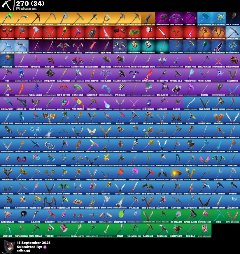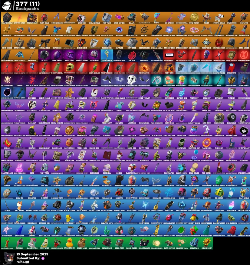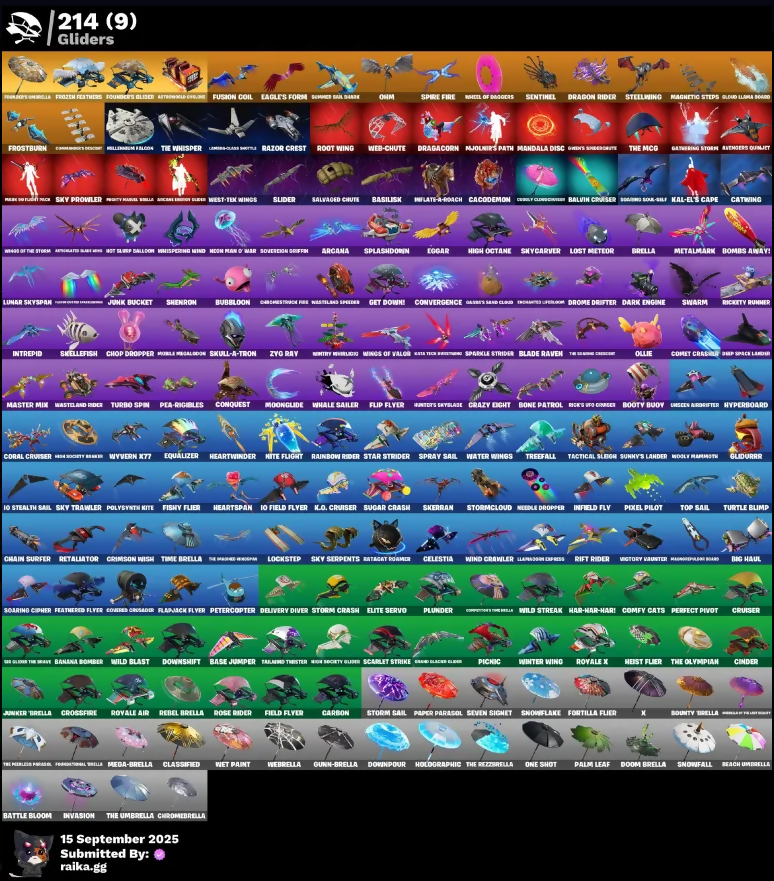 1000x, 2020 Xclusive, 4 Prep?, 978, A Cheetah Applause, AC/DC, Abominable Axe, Abyss, Abyssal Blade, Access Core, Accusation, Ace Mask, Acquanaut’s Trident, Acrobatics, Adira, Adventure Page, African Energy Glider, Agent Jones, Agent Peely, Air Shredder, Albion, Altitude, Amber, Ancestral Elbow, Angler Axes, Ani-Pack, Anti-Tech Boomboom, Antidote, Aquaman, Aquamarine Alice, Arabia Stormaway, Arcade Card, Arcana, Arcanoid Tote, Arcanum, Archetype, Arctic Rollin', Arespike, Arroyo Pack, Assault Iron Blade, Astro, Atmospheres, Aure Pack, Auto Clutch, Automated Battle Hawk, Autowalk Glider, Avenger's Quinjets, Axe-Trail Form, Axecalibur, B-Ball Jakky, Back Board, Backstarter, Backtracker, Bacon 74, Bad Ass Monkey, Bagani, Balance Board, Ball Bling, Balloon Axe, Balls Of Power, Balvin Cruiser, Banana Axe, Banana Bomber, Banana Brigade, Bank Shots, Banner Cape, Banner Shield, Base Jumper, Basecamp Bag, Basement Key, Basic Basher, Basilisk, Battle Balloon, Battle Bloom, Battle Legend, Battle Raider, Battle Shroud, Battlehawk, Batty Pack, Beach Bomber, Beach Umbrella, Beachcomber, Bean Bag, Bear Brained, Bearded Ranger Tipsj, Beastfang, Beep 'n Boop, Beep Beep, Benjamin, Best Mates, Big Bite, Big Haul, Big Split, Bigfoot Commander, Billy Bounce, Birdie, Birdshot, Birthday Cake, Birthday Slice, Bitey, Bitter Sweets, Black Fang, Black Knight, Black Ops Mask, Black Shield, Black Stripe, Blackheart, Blade Bag, Blade Raven, Blade of the Broodlings, Bladed Bag, Bladed Tomahawk, Blank Square, Blasting Cap, Blazule Gunner, Blizzabelle, Bloom Blossom, Blowin' Up, Blue Level Standard, Blueberry Demon, Blustery Bag, Board Breaker, Bob Smack, Boba Rollo, Bobo, Boi, Bold Bar, Bolt, Bolt Ogre Clothes, Bombs Away!, Bone Patrol, Boobytrapped, Boogie, Boogie Down, Boomin', Boosting Ni, Boots N' Cats, Bootstraps, Bootsy Bootlicker, Booty Buoy, Boulder Breakers, Bounty Brella, Boxing Glove Arrow, Brain Freeze, Brainiac, Brave Bag, Breakdown, Breakfast Bunny, Breakin', Breaking Waves, Breakneck, Breakpoint, Breathless Blades, Breezy, Brella, Bribe Moves, Bricked Scimitars, Bring It Around, Brite Board, Brite Bomber, Bubloon, Build Up, Bunker Basher, Bunny Throon, Busy Relic, Butter Robot, Button Gunner, Buzz Pack, Byte, Cacodemon, Cactus Jack, Calculated, Call Me, Called Shot, Calling Card, Camel, Camo Glacier Glider, Camofrognaut, Candy Axe, Cap Kick, Captain Levi, Carbon, Card Drop, Cardistry, Carebde, Castle Peaks, Catalyst, Cattlelip, Catwing, Celebratory Slice, Celestia, Chain Surfer, Chainsaur, Challenger’s Staff, Champion Kyra, Chaos Agent, Chaotic Handler, Charging Up, Charlotte, Chef's Special, Cherry Chime, Chickening It, Chimichanga!, Chocolate James, Choice Shit, Chomp Jr., Chop Chop, Chop Dropper, Chowder's Extant, Christmas Tree Rice, Chrome Punk, Chromebrella, Chromefest, Chromium Claws, Chuck Pack, Chun-Li, Cinder, Cirri, Clang & Basher, Clans Retro, Clara, Clashpion Pick, Classified, Clawbox, Clean Swept, Cloud Llama Gondola, Cluck Strut, Cobalt, Cobra, Cold Hearted, Color Crush, Color Guard, Combat Knife, Combat Wreath, Come Up, Comet Crasher, Comfy Cats, Commander's Descopt, Commando, Competitor's Time Medal, Conga, Conjure Weapon, Conquest, Contract Giller, Controller Crew, Convergence, Coral Cruiser, Cordac, Corse Crusador, Cosmic Cleavers, Cosmic Llamacorn, Cosmopolitron, Coupe Sash, Cozy Chooks, Cozy Conch, Crackshot, Cracksnot, Crazy Eight, Crescent Shroom, Crewmata, Crimson Crest, Crimson Wish, Crossfire, Crossrunner, Crowbar, Crucible Blade, Cruiser, Cryptcrawler’s Claw Slicer, Crystal, Crystal Llama, Cube Aether, Cubic Scepter, Cuddle Bow, Cuddly Cloudcruiser, Cuff Case, Cup Sword (Mil. Gray), Cyclo Girl, DJ Yonder, Dab Stand, Dagger Dance, Dance Groove Movement, Dance In Da Party, Dance Off, Dante, Dap Space Landau, Dark Axe, Dark Bag, Dark Days, Dark Engine, Dark Kings, Dark Matter, Dark Shield, Dark Sir Strong, Dark Strikers, Dark Voyager, Dead Caps, Deadmobar, Deadpool, Deep Dab, Deep Dive, Deep End, Deep Guardian, Deimos, Delivery Diver, Demi, Demon Slayer Blade, Designated Hitters, Destabilizer, Dezire, Diabolic Dick, Diamond Duke, Diamond Throne, Diamond Wings, Diamondclaw Pickaxe, Dicey Duchy, Dimensional Gate, Dino Deck, Disassemble, Dive Knives, Doctor Doom, Doctor Slone, Doctor Strange, Doe, Doggo, Dominion, Dom’s Dominator, Don't Start Now, Doodle Bag, Doom Brella, Doom Chalice, Doom Ov Callisto, Doom's Comet, Doomsday's Bastard, Door Slayer, Dope Dee, Double Header, Downpour, Downshift, Doze Dab, Dr. Jaeger, Draft, Dragacorn, Dragon Radar, Dragon Rider, Dragon Rune Lance, Dragon Stance, Dragoncrest, Dragon’s Claw, Dread, Dreamly Sindges, Dreamwalk, Drift, Driver, Drome Drifter, Dropo, Drummies, Dry Bag, Dual Kama, Duelist’s Foil, Duke, Dummy, Dusk, Dusk Wings, Duster Challenge, Dusty, Dying Light, Dyna Mojo, Dynamo Grip Suit, E.L.I.M., E.L.I.M. Shield, Eagle's Form, Echo, Efina Park, Eggar, Eggshell, Eichi, Electro Swing, Elite Servo, Elliot, Ember, Ember Pick, Emma Ashido, Emotiface, Enchanted Lusogull, End Game, Endless Scroll, Energy Claw, Enforcer, Envoy, Eon Blades, Equalizer, Erisa, Etching, Eternal Knight, Eternal Shield, Eva, Expressionism, Extra Round, FGL-44 Llama, Fab Buddies, Fable, Fabled Cape, Fade, Fang Saws, Fangs of Hesk, Farmed Foresight, Farsive Handovers, Feathered Flyer, Featherweight, Feline Fun, Field Flyer, Fierce, Fiery Jam, Fins, Fire Show, Firestarter, Fish Tank, Fishbone Flayer, Fishstick Jakky, Fishy Flier, Fixer, Fizzie, Flame Sigil, Flamenco, Flamespacer Claws, Flawless, Flip Flyer, Flippin' Away, Floss, Focus, Focused, Fool-Kers Umbrella, Fortilla Flier, Foul Flex, Foundational Brella, Founder's Glider, Four Barrets, Fox Wayfarer, Foxfire Edge, Fractured World, Free Flow, Freedom Ranger, Frents Twotenn, Fright Funk, Frolic, Frost Squad, Frostburn, Frosties Foreman, Frosty Globes, Frozen Axe, Frozen Beak, Frozen Bird Shell, Frozen Felt Treds, Frozen Icon Cape, Frozen Lion Wrath, Frozen Raven, Frozen Red Knight, Frozen Red Ops, Frozen