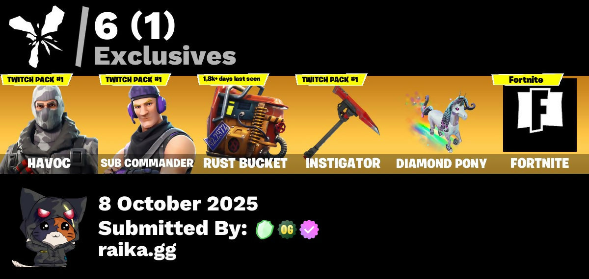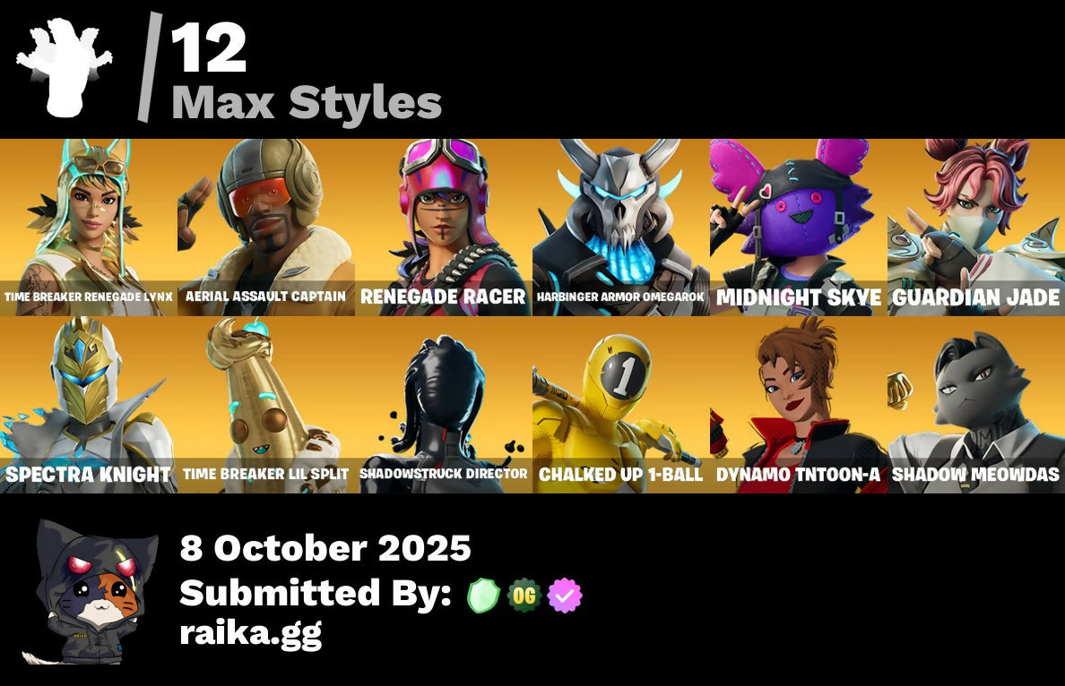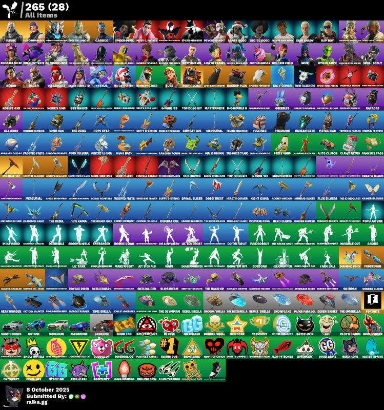'11 Trophy, 18'S Kama, 999 Knives, A&mb Studios, Aerial Assault Captain, Ancestral Bloom, Andy Fangerson, Apres Ski Jonesy, Aura, Auto Clutch, Avalance Catina, Avalanche, Baby Rangersog, Backfire, Backup Plan, Badkno Robin, Bamboo Slicer, Band Bag, Battlehawk, Biohazard, Blackheart's Skull, Bladed Seagulls, Blades of Light, Bomb Banquet, Boogie Down, Bullish Grim, Bura, Burn Blaster, Canyon Stream, Carbide, Centum Leveler, Chalked Up 1-Ball, Chaotic Casual, Clam Through, Clasbide, Clawborn, Clawz Retro, Collinson, Combat Cue, Common, Cozy Conch, Crimson Platinum, D-O-Double G, Dabbi Skull, Daddy O' Doyle, Desert Thrasher, Desperable, Diamond Pony, Do the Split, Dogg Tag, Dogg Treat, Doldr Memories, Dozo Dab, Draco Saber, Drakon Steel Hybrid, Dynamo Drongo, Dynamo Tntoon-A, Dynamo Tnttoon-A, E-Bat & Overdose, Entranced, Esports Bomber, Explorer Emilie, Face Rodeo Random, Fall O' CIvel, Feline Rodgers, Floe Pathfinder, Floppy Bones, Flux Silveira, Forge Blossom, Fortnite, Frostbovin, Frosted Fretz, Frosted Tesla, G-Strunk '93, GG, Ghetti Leader, Glitch Glow, Go Chilled, Golden Memories, Good Game GG, Good Gate, Grebles, Griddle Up, Guardian Jade, Guffy G-Strino, Guy1Star, Halloween End, Harbinger Armor Omegarok, Harden Gatt, Harold Hunt, Havoc, Heart of Dead, Heart's Carver, Heartbinder, Helicopter, Hero Claws, Hobaran Inufect, Hobie's Amp, Hobie's Axe, Hope, Hope Star, I'm a Mystery, In Her Mood, Infernal GG, Instigator, Invisible Cut, Jet Signals, Jetty Castigo, Kendo, Kevin Alien, Kit the Chillbill, Kyran Aryk, LBC '93 Dogg, LGC ’93 Doggs, Lady of Cranes, Lil' Longboat, Lil' Mate, Lil' Tank, Ling, Llama Utility, Mana Bata, Mane & Goat, Masaruhe, Masterpiece, Memoirs Legacy, Memorial, Memory Coalition, Mercurial, Metalhead, Midnight Savot, Midnight Skye, Missiles Away, Mr. Dappermint, Mr. Daruna, Ms. Coppermint, Mullet Cattail, N.Y.P.D., Nero Hope, Night Katma, Nomad's Dexter, Nugrex Sharks, Nyanja, Octane, Oh Target, Oporpus-R-Xsin-Pie, Ornery-Y-Kawbaw-Bleak, Oscar, Overwatch Kitty, Peezy Mush, Peter B. Parker, Pickle Pal, Pilot's Charm, Piperfish Poms, Popular Vibe, Positivity, Pouncer's Memory, Precision, Prized Llama, Protection Crates, Psycho Bandit, Pug, Radar Paradox, Ralph Tamashiro, Ramirez's Tacos, Rap Boy, Ratcat, Rattle Rama, Ratty-Grin, Ravana of Dook, Raven Team Syd, Ravoc, Rebel Bella, Recloader Alex, Red Knight, Rejoy, Renegade Racer, Renegade Ranger, Rip Boy, Rocket Worker, Ronagle Ginger, Royale Rider, Runway Racer, Rust Bucket, SK Commander, Salute, Salvador Jake, Santa Dogg, Secret Getaway, Seven Sighet, Shadow Bella, Shadow Blade Hope, Shadow Flame, Shadow Meowdas, Shadow Ops Jag, Shadowstruck Director, Shogunji, Shove 'Em Off, Sing Dub, Skeleksshard, Skobsbloulder, Skredan, Skull Royale, Skull Scout, Slayer Juice Wrld, Slice Shredder, Slim Shady, Slipmocheese, Slur Shady, Smoke Scout, Snowfolk, Snowpaw Walk, Snowy Docshock, Spectra Knight, Spectra Soldier, Spiced Bottom Peas, Spider-Man (Miles Morales), Spider-Man Noir, Spider-Punk, Spinal Slicer, Spirit Protector, State Monitor, Stony GG, Sub Commander, Substream, Sundae Glider, Swin-T Series, That's Cold Jag, The Boudreaux, The Devourer, The Dream Shirt, The Echolonalist, The Glitterville, The Gold Piel, The Olympian, The Rack-Up, The Rebel, The Reign, The Umbrella, Time Bella, Time Breaker Lil Split, Time Breaker Renegade Lynx, Tomago & Kokana Techman Follow, Top Dogg Kit, Tri-Ooze Tank, Trident Ries, Twin Blasters, Uncle Danger, Undercity Courage, Ungraspable Oug, Vanin Dall, Vespa Jacket, Vile Dog, Vulejacket, Water Sprite, Wave, Wavy Ducky, Whiskey Racer, Wyvern Arya, Xtreme Hunter