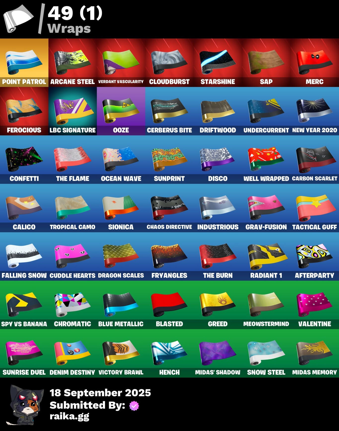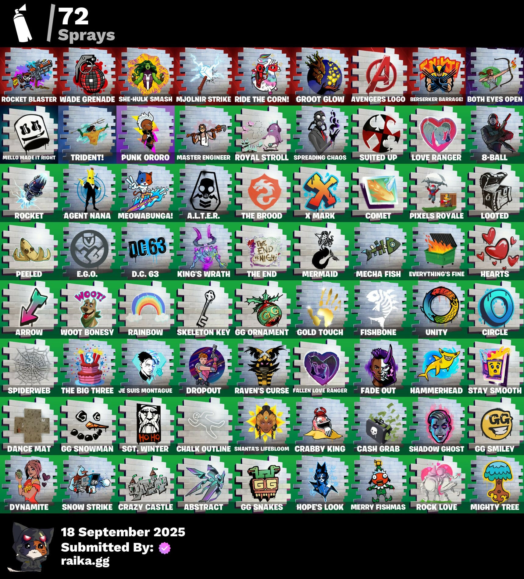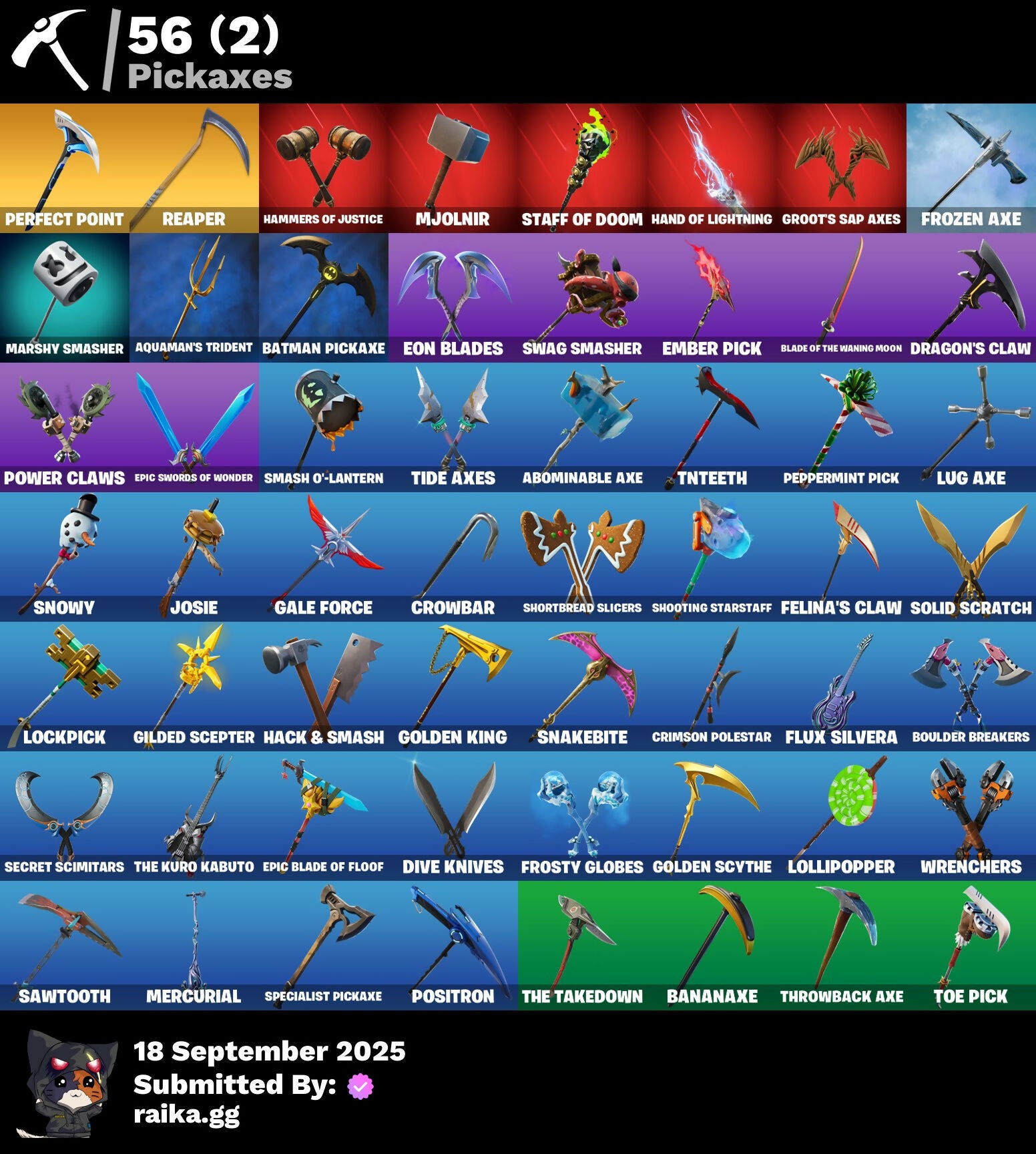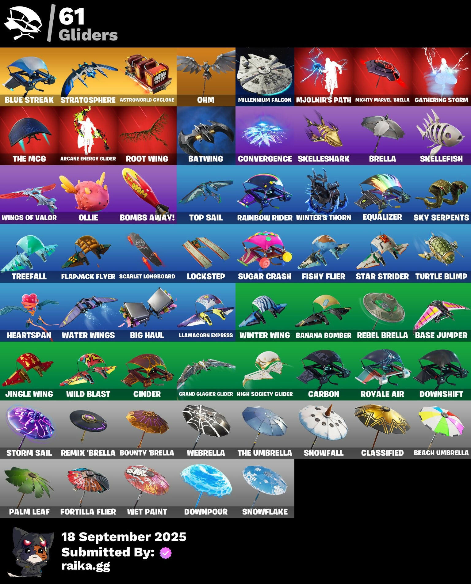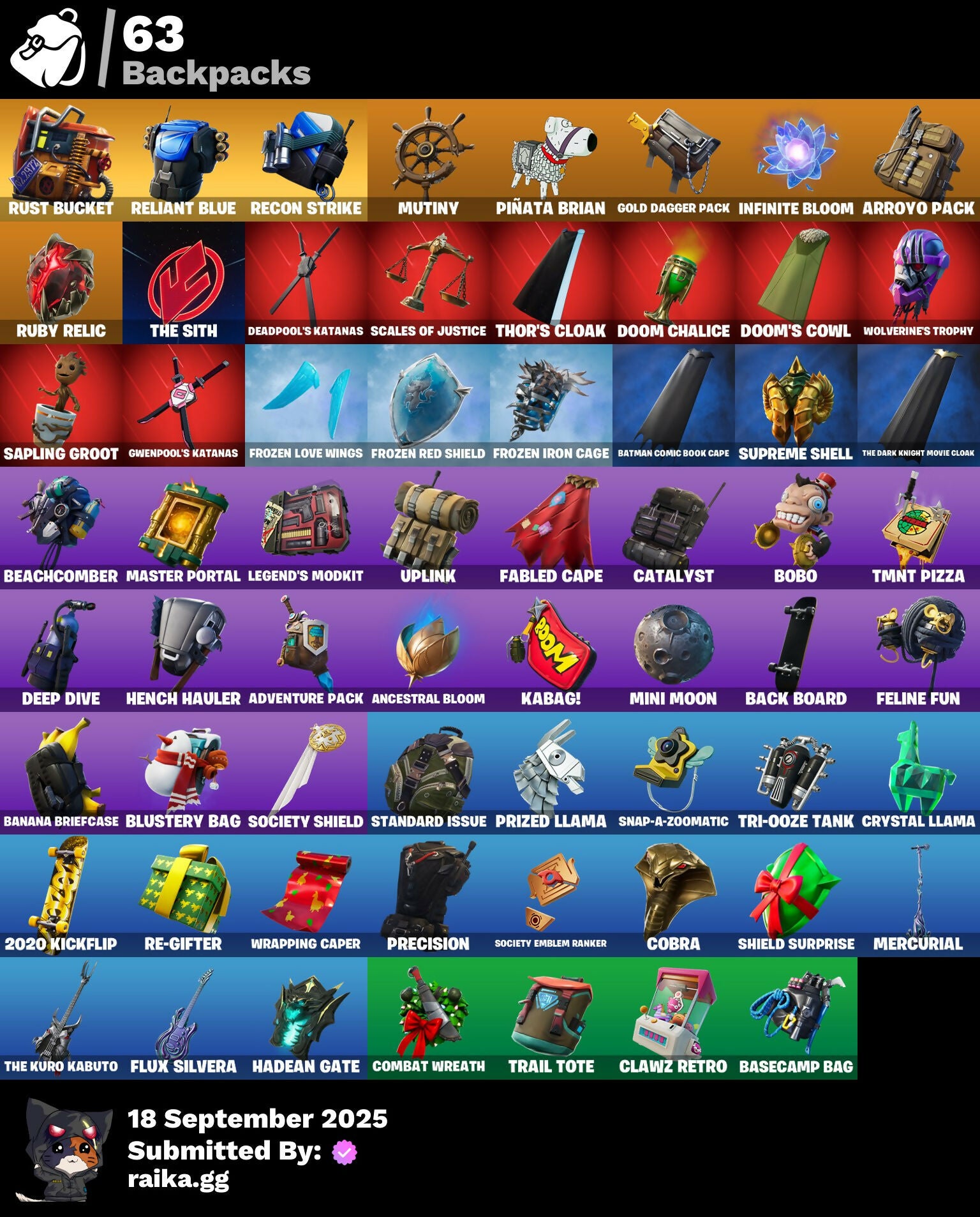 2020 Kickflip, 8-Ball, A.L.T.E.R., Abominable Axe, Abstract, Adventure Pack, Afterparty, Agent Jones, Agent Nana, Agent Peely, Air Shredder, Ancestral Bloom, Aquaman, Aquaman's Trident, Arcane Energy Glider, Arcane Steel, Arrow, Arroyo Pack, Astroworld Cyclone, Avengers Logo, Back Board, Banana Bomber, Banana Briefcase, Bananaxe, Banner, Banner Icon, Base Jumper, Basecamp Bag, Batman, Batman Comic Book Cape, Batman Comic Book Outfit, Batman Pickaxe, Battlehawk, Batwing, Beach Umbrella, Beachcomber, Bee, Beep Beep, Berserker Barrage!, Big Haul, Blackheart, Blackheart (Stage 8), Blade Of The Waning Moon, Blasted, Blue Metallic, Blue Streak, Blue Team Leader, Blustery Bag, Bobo, Bombs Away!, Both Eyes Open, Boulder Breakers, Bounty 'Brella, Breaking Point, Brella, Brood, Brutus, Calico, Call Me, Captain America's Shield, Carbide, Carbon, Carbon Scarlet, Cash Grab, Catalyst, Cerberus Bite, Chains, Chalk Outline, Chaos Directive, Chick, Chromatic, Cinder, Circle, Classified, Clawz Retro, Clean Sweep, Cloudburst, Cobra, Coconuts, Coin Flip, Combat Wreath, Comet, Confetti, Conga, Convergence, Cowboy Chat, Crab, Crabby King, Crazy Castle, Crimson Polestar, Crowbar, Crowning Achievement, Crystal Llama, Cuddle Hearts, D.C. 63, Dance Mat, Deadpool, Deadpool Unmasked, Deadpool's Katanas, Deep Dive, Denim Destiny, Disco, Dive Knives, Doctor Doom, Dog Bowl, Dog Collar, Dolphin, Doom Chalice, Doom's Cowl, Downpour, Downshift, Dragon Scales, Dragon Stance, Dragon's Claw, Driftwood, Dropout, Duck, Dynamite, E.G.O., Eagle, Egg, Ember Pick, Eon Blades, Epic Blade Of Floof, Epic Swords Of Wonder, Equalizer, Everything's Fine, Fabled Cape, Fade, Fade Out, Falcon, Fallen Love Ranger, Falling Snow, Felina's Claw, Feline Fun, Fence, Ferocious, Fish Hook, Fishbone, Fishy Flier, Fist, Flapjack Flyer, Flippin' Away, Floating Island, Flux Silvera, Foil Flex, Fortilla Flier, Fox, Frost Squad, Frosty Globes, Frozen Axe, Frozen Iron Cage, Frozen Love Ranger, Frozen Love Wings, Frozen Raven, Frozen Red Knight, Frozen Red Shield, Fryangles, GG Ornament, GG Smiley, GG Snakes, GG Snowman, Gale Force, Gathering Storm, Gear Specialist Maya, Gentleman's Dab, Gilded Scepter, Gold Dagger Pack, Gold Midas, Gold Touch, Golden King, Golden Scythe, Golden Shine, Golf Clap, Grand Glacier Glider, Grav-Fusion, Greed, Groot, Groot Glow, Groot's Sap Axes, Gwenpool's Katanas, Hack & Smash, Hadean Gate, Hammerhead, Hammers Of Justice, Hand Of Lightning, Happy, Hearts, Heartspan, Hello Friend, Hench, Hench Hauler, Hero Emblem, High Society Glider, Hope's Look, Hot Marat, Howl, Hybrid, Hybrid (Stage 4), I Declare!, Industrious, Infinite Bloom, Infinity Blade, Introducing..., Je Suis Montague, Jellyfish, Jennifer Walters, Jingle Wing, Jolly Roger, Josie, Jules, Jules' Mask, Kabag!, Kaboom!, Keep It Mello, Kenshi Yonezu, Keyed Up, King's Wrath, Kit, L, LBC Signature, Legend's Modkit, Lil' Floaticorn, Llamacorn Express, Lobby Classic, Lockpick, Lockstep, Lollipopper, Looted, Love Ranger, Lt. Evergreen, Lug Axe, Marshy Smasher, Masked, Master Engineer, Master Portal, Mecha Fish, Mello Made It Right, Meowabunga!, Meowscles, Meowstermind, Merc, Mercurial, Mermaid, Merry Fishmas, Mic Drop, Midas Memory, Midas' Shadow, Mighty Marvel 'Brella, Mighty Tree, Millennium Falcon, Mini Moon, Mission Specialist, Mjolnir, Mjolnir Strike, Mjolnir's Path, Monks, Mutiny, Mystique, Nana Nana, New Year 2020, Ninja Stance: Donnie, Ninja Stance: Leo, Ninja Stance: Mikey, Ninja Stance: Raph, Ocean, Ocean Wave, Ohm, Ollie, Oni Mask, Only 90's Kids, Ooze, Orange Justice, Palm Leaf, Pandemonium, Paw, Paws & Claws, Peeled, Peely, Peppermint Pick, Perfect Point, Pigskin, Pineapple, Pixels Royale, Piñata Brian, Point Patrol, Point Patroller, Popcorn, Positron, Power Claws, Precision, Prized Llama, Punk Ororo, Radiant 1, Rainbow, Rainbow Rider, Raven's Curse, Re-Gifter, Reaper, Rebel Brella, Recon Strike, Reese, Regal Wave, Reliant Blue, Remix 'Brella, Respect, Respect The Peace, Ride The Corn!, Riptide, Roach, Rock Love, Rocket, Rocket Blaster, Rogue Agent, Rollie, Root Wing, Roses, Royal Stroll, Royale Air, Ruby Relic, Rust Bucket, Rust Lord, Salt, Salute, Sap, Sapling Groot, Sawtooth, Scales of Justice, Scarlet Longboard, Scootin', Scuba Jonesy, Secret Scimitars, Sgt. Winter, Shadow Ghost, Shanta's Lifebloom, She-Hulk Smash, Shield Surprise, Shooting Starstaff, Shortbread Slicers, Side Hustle, Sidewinder, Sing Along, Siona, Siona's Helmet, Sionica, Sith, Skeleton Key, Skellefish, Skelleshark, Sky Serpents, Skye, Smash O'-Lantern, Snakebite, Snap-a-Zoomatic, Snoozefest, Snow Globe, Snow Steel, Snow Strike, Snowfall, Snowflake, Snowmando, Snowshaker, Snowy, So Square, Society Emblem Ranker, Society Shield, Solid Scratch, Specialist Pickaxe, Spiderweb, Spray Can, Spreading Chaos, Spring-Loaded, Springy, Spv Vs Banana, Staff Of Doom, Stage, Standard Issue, Star Strider, Starshine, Stay Smooth, Storm, Storm King, Storm Sail, Stratosphere, Sugar Crash, Suited Up, Sun, Sunprint, Sunrise Duel, Supreme Shell, Swag Smasher, T-Pose, TMNT Pizza, Tactical Guff, Take The Cake, Take The Elf, Take The L, Teeth, Teknique, The Big Three, The Break Shot, The Brood, The Burn, The Dark Knight Movie Cloak, The Dark Knight Movie Outfit, The End, The Flame, The Kuro Kabuto, The Mcg, The Sith, The Takedown, The Umbrella, Thor, Thor's Cloak, Throwback Axe, Thunderstorm, Tide Axes, Timer, Tippy Tap, Tnteeth, Tntina, Toe Pick, Top Hat, Top Sail, Trail Tote, Treasure Chest, Treefall, Tri-Ooze Tank, Trident!, Trilogy, Tropical Camo, True Love, Turtle Blimp, Undercurrent, Unity, Uplink, Valentine, Verdant Vascularity, Verve, Victory Brawl, Viking Ship, Wade Grenade, Wakandan Salute, War, Water Wings, Wave, Webrella, Well Wrapped, Wet Paint, Whale Tail, Widow's Pirouette, Wild Blast, Wings Of Valor, Winter Wing, Winter's Thorn, Wolverine, Wolverine's Claw, Wolverine's Trophy, Wooly Warrior, Woot Bonesy, Worm, Wrapping Caper, Wrenchers, X Mark, X-4 Stormwing, Ziggurat, Zoey