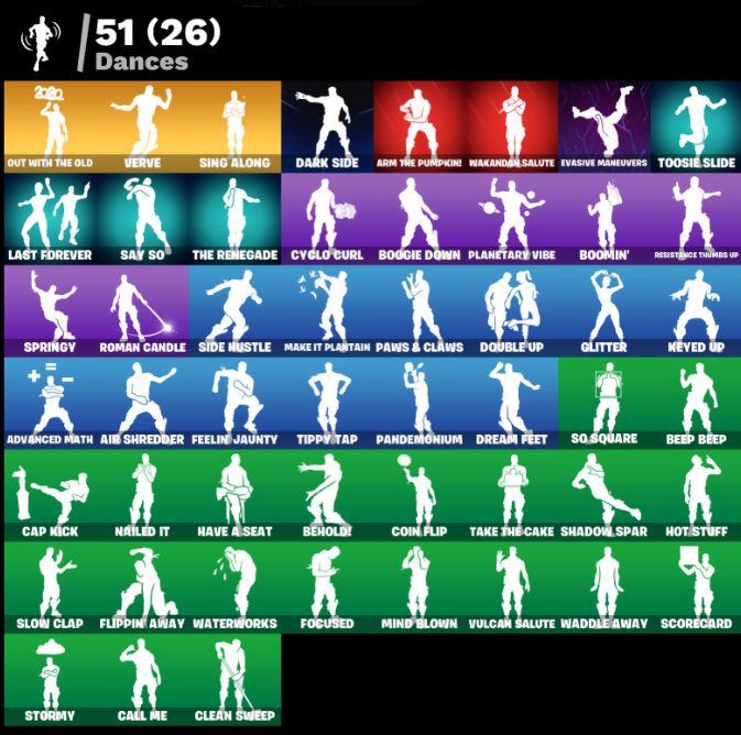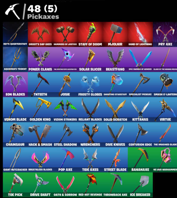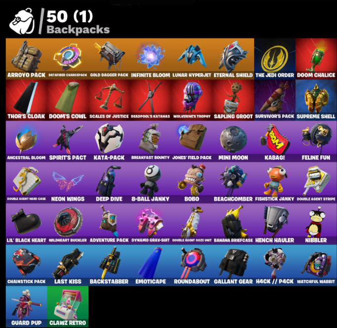 8-Ball Janky, Advanced Math, Adventure Pack, Agent Jones, Agent Peely, Air Shredder, Ancestral Bloom, Aquaman, Aquaman's Trident, Arcane Energy Glider, Arm The Pumpkin, Arroyo Pack, Backstabber, Banana Bomber, Banana Briefcase, Bananaxe, Beachcomber, Beastfang, Beep Beep, Behold!, Beskar Umbrella, Big Haul, Blade Raven, Blade of the Waning Moon, Bobo, Bombs Away!, Boogie Down, Boomin', Bounty 'Brella, Breakfast Bounty, Breathless Blades, Brella, Brutus, Call Me, Cap Kick, Centurion, Centurion Edge, Chainsaur, Chainstick Pack, Chaos Double Agent, Chigusa, Chromebrella, Classified, Clawz Retro, Clean Sweep, Coin Flip, Comet Crasher, Convergence, Crimson Wish, Cuddly Cloudcruiser, Cyclo Curl, Dark Side, Datafiber Chargepack, Deadpool, Deadpool's Katanas, Deep Dive, Dive Knives, Doctor Doom, Doom Chalice, Doom's Cowl, Double Agent Hard Case, Double Agent Hush, Double Agent Ooze Unit, Double Agent Stripe, Double Agent Wildcard, Double Up, Dream Feet, Drive Shaft, Dynamo Grav-Suit, Eagle's Form, Emot ica pe, Eon Blades, Epic Swords of Wonder, Eternal Knight, Eternal Shield, Evasive Maneuvers, Fade, Feelin' Jaunty, Feline Fun, Fishstick Janky, Fishy Flier, Flair Fare, Flapjack Flyer, Flippin' Away, Focused, Fortilla Flier, Foundational 'Brella, Frosty Globes, Gallant Gear, Gathering Storm, Gear Specialist Maya, Giant Nutcracker, Glitter, Gold Dagger Pack, Gold Midas, Golden King, Groot, Groot's Sap Axes, Guard Pup, H4ck // P4ck, Hack & Smash, Hammers of Justice, Hand of Lightning, Have A Seat, Hench Hauler, Hot Stuff, Hunter's Skyblade, IO Field Flyer, Ice Breaker, Infinite Bloom, Invasion, Iris, Jennifer Walters, Jones' Field Pack, Josie, Jules, Kabag!, Kata-Pack, Keyed Up, Kit, Kittanas, Kondor, Lara Croft, Last Forever, Last Kiss, Lil' Black Heart, Llamacorn Express, Lunar Hyperjet, Make It Plantain, Mancake, Mandalorian, Manic, Mave, Megumi, Meowscles, Mighty Marvel 'Brella, Mind Blown, Mini Moon, Mjolnir, Mjolnir's Path, Nailed It, Nejari Warhammer, Neon Wings, Nibbler, Nitelite, Oath & Sorrow, Ocean, Ohm, Ollie, Out With The Old, Pandemonium, Paws & Claws, Planetary Vibe, Pop Axe, Power Claws, Pry Axe, Psi-Rider, Razor Crest, Red Hot Revenge, Reese, Reliant Blades, Resistance Thumbs Up, Rev, Rey's Quarterstaff, Roman Candle, Root Wing, Roundabout, Salvaged Chute, Sapling Groot, Say So, Scales Of Justice, Scorecard, Scuba Jonesy, Seeker, Shadow Spar, Shadow Stalker, Shooting StarsStaff, Side Hustle, Sing Along, Siona, Siren, Skellefish, Skye, Slow Clap, Smash O'-Lantern, So Square, Solar Slicer, Solid Scratch, Specialist Pickaxe, Spirit's Pact, Springly, Staff of Doom, Star Strider, Steel Shadow, Storm, Stormy, Street Blade, Sunny's Lander, Supreme Shell, Survivor's Pack, Take The Cake, The Destroyer's Destroyer, The Imagined Blade, The Jedi Order, The Mcg, The Renegade, The Umbrella, Thor, Thor's Cloak, Throwback Axe, Tide Axes, Tippy Tap, Tnteeth, Tntina, Toe Pick, Toosie Slide, Top Sail, Turanga Leela, Venom Blade, Verve, Virtue, Vizion Strikers, Vulcan Salute, Waddle Away, Wakandan Salute, Watchful Wabbit, Water Wings, Waterworks, Wild Blast, Wildheart Buckler, Wolverine, Wolverine's Trophy, Wrenchers, Yellow Jacket, Yuki