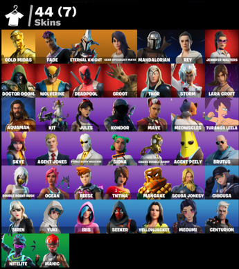 [PC/PSN/XBOX] 44 SKINS | Gold Midas | Fade | Eternal Knight | Gear Specialist Maya | Mandalorian | Rey | Jennifer Walters | Doctor Doom | Wolverine