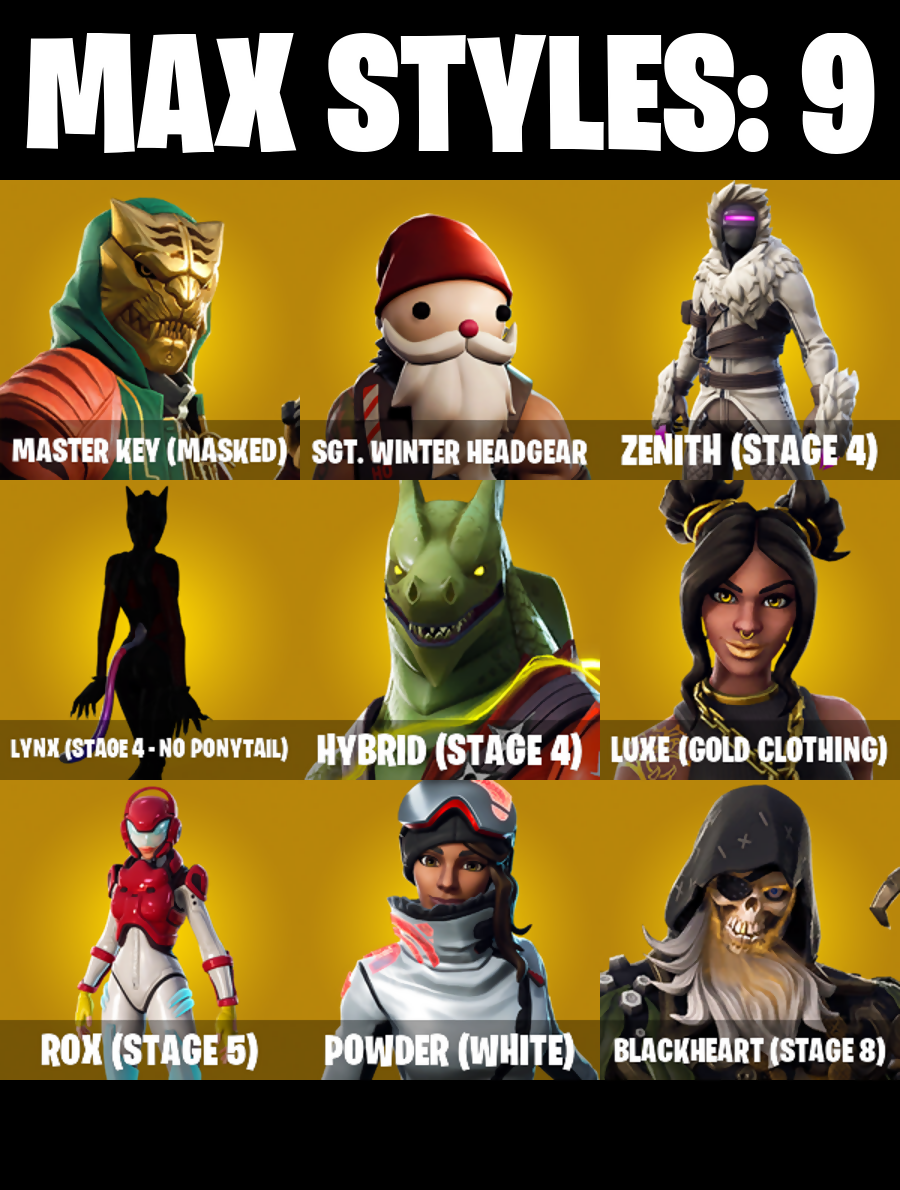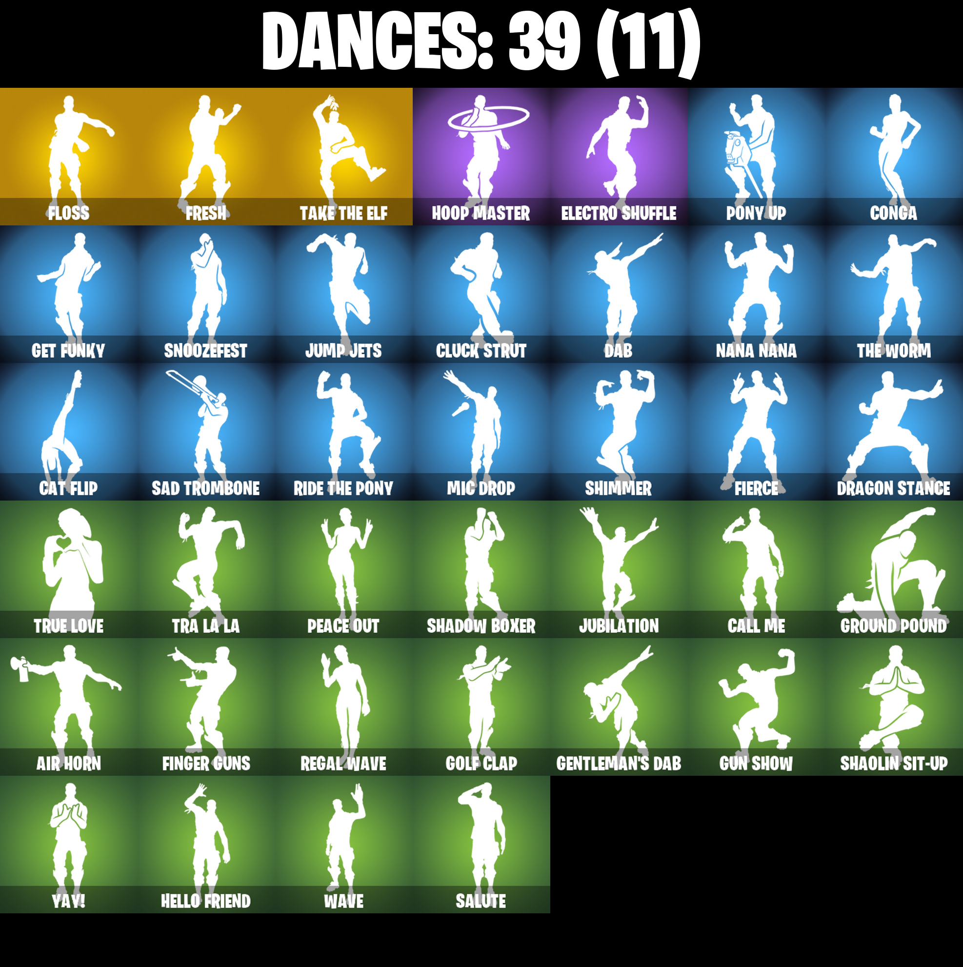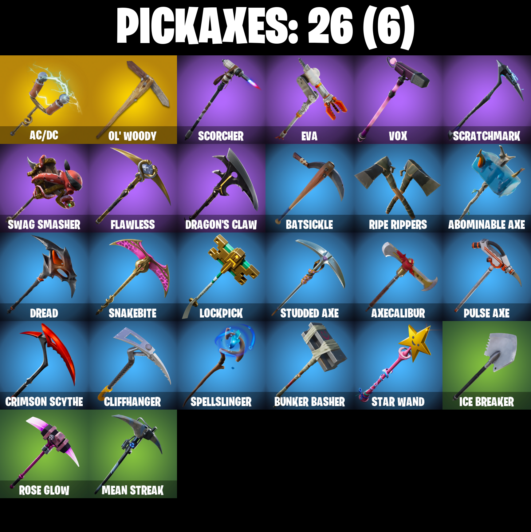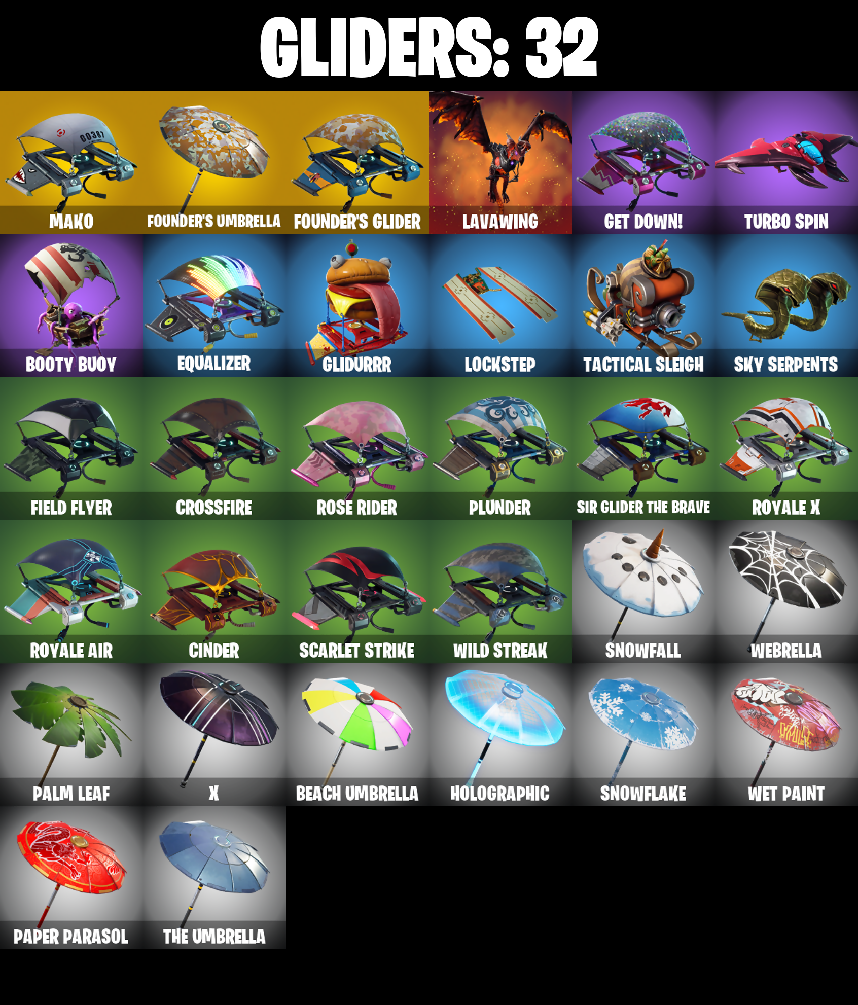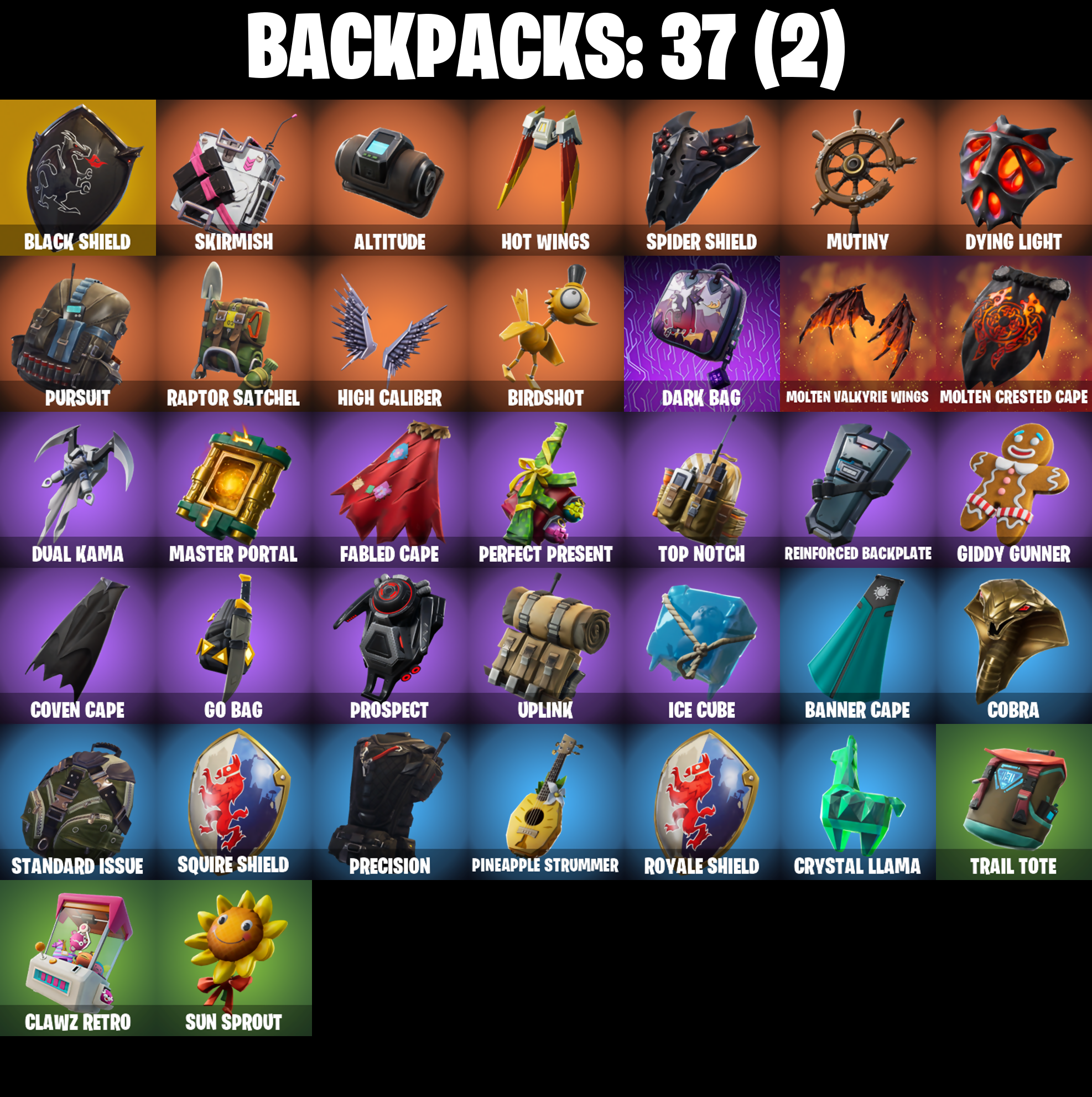 Abominable Axe, Ac/Dc, Air Horn, Altitude, Axecalibur, Banner Cape, Banner Trooper, Batsickle, Beach Umbrella, Birdshot, Black Knight, Black Shield, Blackheart, Blackheart (Stage 8), Blue Squire, Booty Buoy, Brite Bomber, Bunker Basher, Bunker Jonesy, Call Me, Cat Flip, Cinder, Clawz Retro, Cliffhanger, Cluck Strut, Cobalt, Cobra, Conga, Coven Cape, Crackshot, Crimson Scythe, Crossfire, Crystal Llama, Dab, Dark Bag, Dark Bomber, Dragon Stance, Dragon's Claw, Dread, Dual Kama, Dying Light, Electro Shuffle, Ember, Equalizer, Eva, Fabled Cape, Field Flyer, Fierce, Finger Guns, Flawless, Floss, Founder's Glider, Founder's Umbrella, Fresh, Gentleman's Dab, Get Down!, Get Funky, Giddy Gunner, Ginger Gunner, Glidurrr, Go Bag, Golf Clap, Ground Pound, Gun Show, Hello Friend, High Caliber, Holographic, Hoop Master, Hot Wings, Hybrid, Hybrid (Stage 4), Ice Breaker, Ice Cube, Inferno, Jubilation, Jump Jets, Kuno, Laguna, Lavawing, Lockpick, Lockstep, Luxe, Luxe (Gold Clothing), Lynx, Lynx (Stage 4 - No Ponytail), Mako, Master Key, Master Key (Masked), Master Portal, Mean Streak, Mic Drop, Molten Battle Hound, Molten Crested Cape, Molten Valkyrie, Molten Valkyrie Wings, Mutiny, Nana Nana, Ol' Woody, Palm Leaf, Paper Parasol, Pastel, Peace Out, Peely, Perfect Present, Pineapple Strummer, Plunder, Poised Playmaker, Pony Up, Powder, Powder (White), Precision, Prospect, Pulse Axe, Pursuit, Raptor, Raptor Satchel, Recon Specialist, Regal Wave, Reinforced Backplate, Renegade, Ride The Pony, Ripe Rippers, Rose Glow, Rose Rider, Rose Team Leader, Rox, Rox (Stage 5), Royale Air, Royale Knight, Royale Shield, Royale X, Ruin, Sad Trombone, Salute, Sanctum, Scarlet Strike, Scorcher, Scratchmark, Sentinel, Sgt. Winter, Sgt. Winter Headgear, Shadow Boxer, Shadow Ops, Shaolin Sit-Up, Shimmer, Sidewinder, Sir Glider The Brave, Skirmish, Sky Serpents, Snakebite, Snoozefest, Snowfall, Snowflake, Sparkle Specialist, Spellslinger, Spider Knight, Spider Shield, Squire Shield, Standard Issue, Star Wand, Studded Axe, Summit Striker, Sun Sprout, Swag Smasher, Tactical Sleigh, Take The Elf, The Umbrella, The Worm, Top Notch, Tra La La, Trail Tote, Trog, True Love, Turbo Spin, Uplink, Vega, Vox, Warpaint, Wave, Webrella, Wet Paint, Wild Streak, X, Yay!, Yuletide Ranger, Zenith, Zenith (Stage 4)