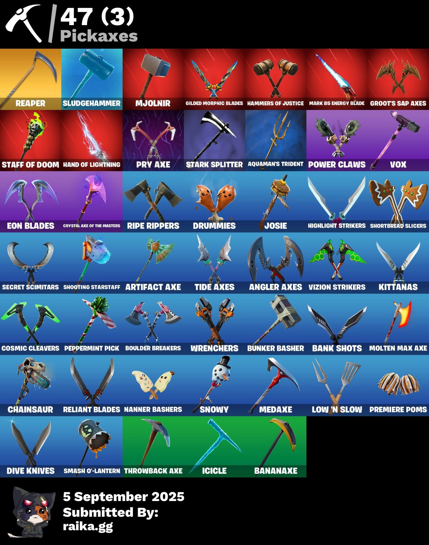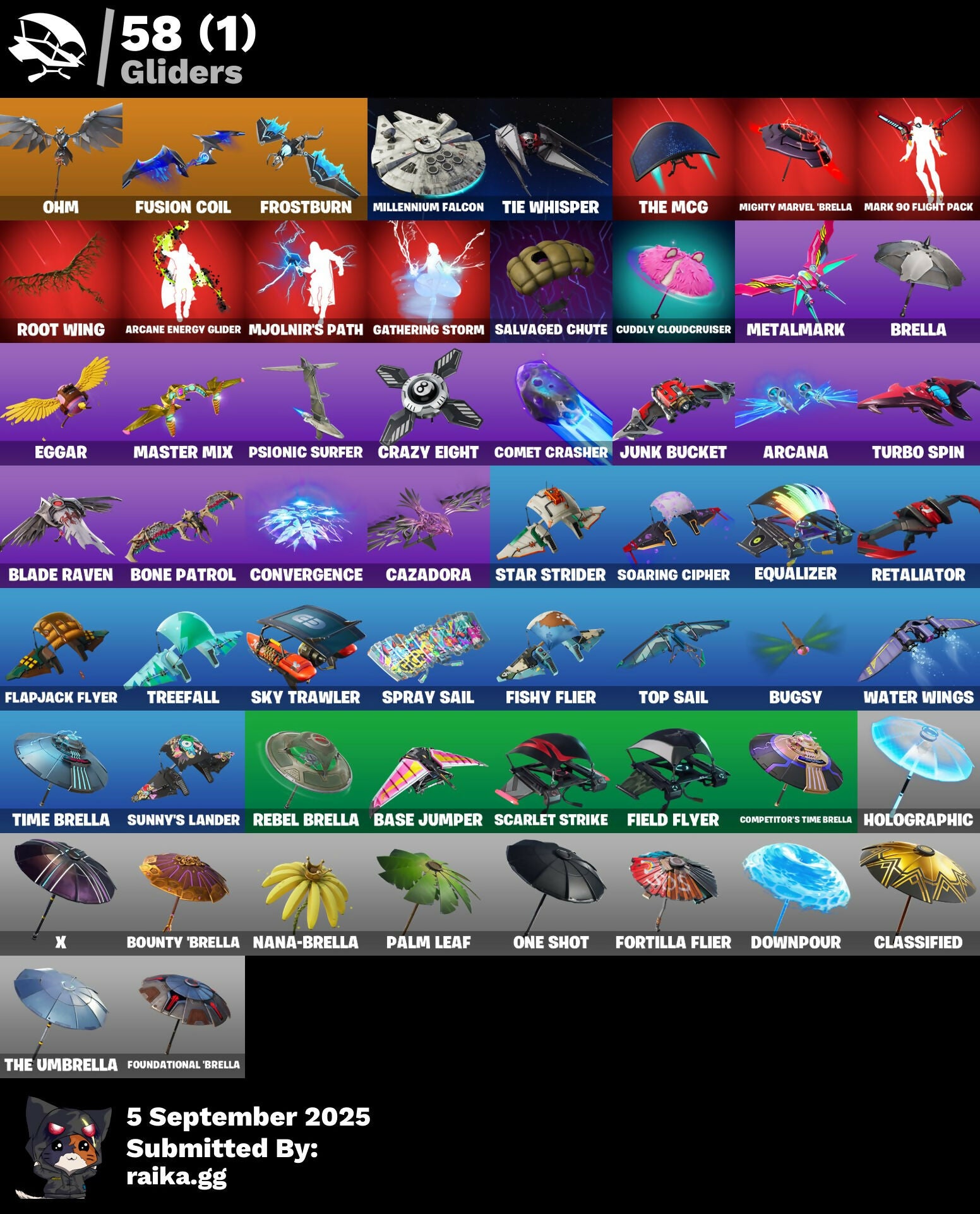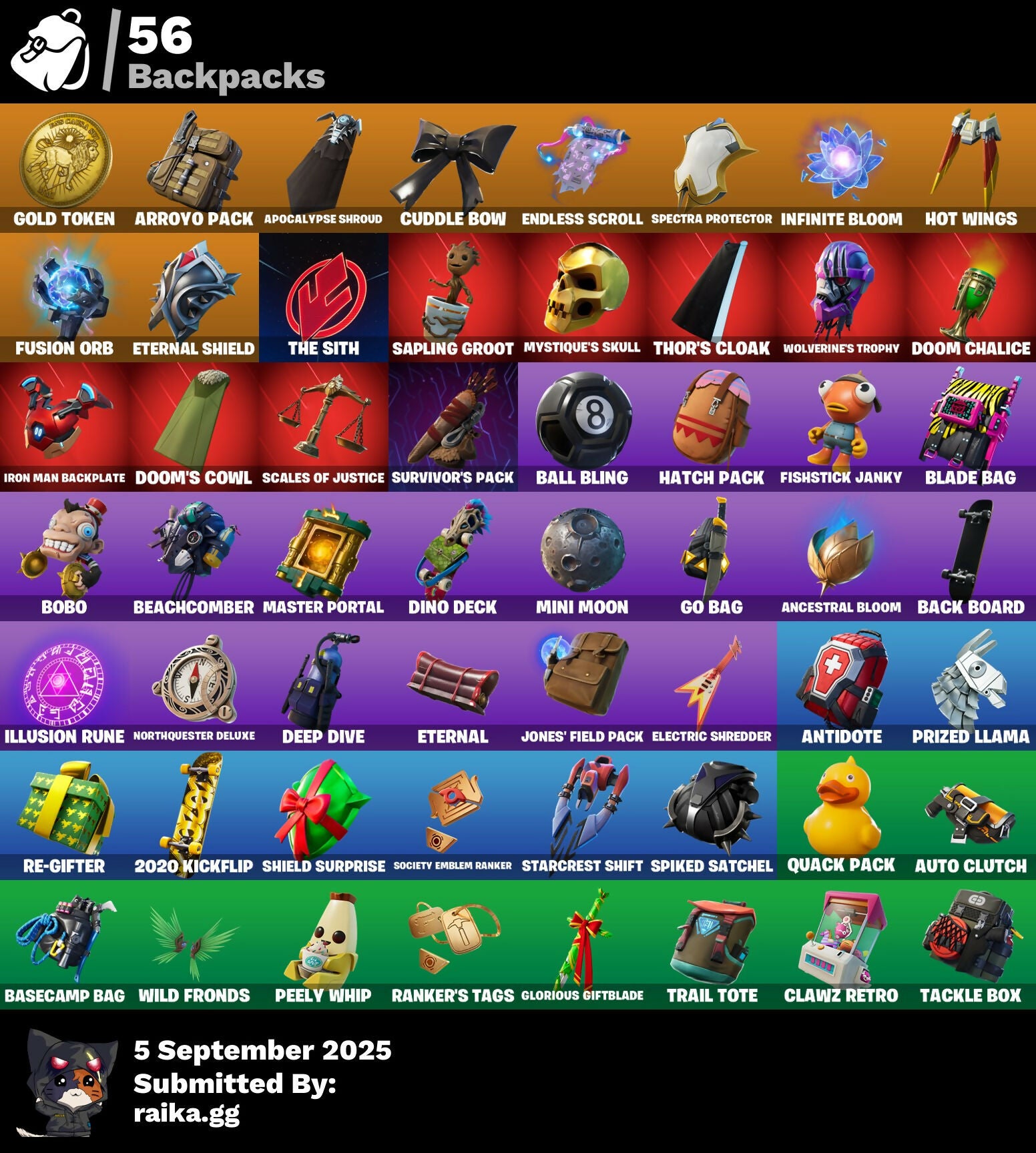 2020 Kickflip, 8-Ball Vs Scratch, Agent Jones, Air Shredder, Ancestral Bloom, Angler Axes, Antidote, Apocalypse Shroud, Aquaman's Trident, Arcana, Arcane Energy Glider, Arroyo Pack, Artifact Axe, Auto Clutch, Back Board, Backstroke, Ball Bling, Bananaxe, Bank Shots, Base Jumper, Basecamp Bag, Beachcomber, Bean Bag, Birdie, Blade Bag, Blade Raven, Blowing Bubbles, Bobo, Boing!, Bone Patrol, Boots 'N' Cats, Boulder Breakers, Bounty 'Brella, Brella, Brite Bomber, Buckle Up, Bugsy, Bunker Basher, Bunker Jonesy, Call Me, Cameo Vs Chic, Cap Kick, Cardistry, Catalyst, Cazadora, Chainsaur, Classified, Clawz Retro, Clean Sweep, Cluck, Cluck Strut, Comet Crasher, Competitor's Time Brella, Convergence, Cosmic Cleavers, Count It!, Crazy Eight, Crowning Achievement, Crystal, Crystal Axe Of The Masters, Cuddle Bow, Cuddle Team Leader, Cuddly Cloudcruiser, Dabstand, Deep Dive, Delirium, Dino Deck, Dive Knives, Doctor Doom, Doom Chalice, Doom's Cowl, Downpour, Doze Dab, Droop, Drummies, Eggar, Electric Shredder, Endless Scroll, Eon Blades, Equalizer, Eternal, Eternal Knight, Eternal Shield, Evasive Maneuvers, Fade, Field Flyer, Fishstick Janky, Fishy Flier, Flapjack Flyer, Flippin Away, Fortilla Flier, Foundational 'Brella, Frostburn, Fusion Coil, Fusion Orb, Gathering Storm, Gilded Morphic Blades, Glorious Giftblade, Go Bag, Gold Token, Golf Clap, Groot, Groot's Sap Axes, Hammers Of Justice, Hand Of Lightning, Harley Quinn, Hatch Pack, Hello Friend, High Five, Highlight Strikers, Holiday Boxy, Holographic, Hot Wings, Hula Hoopin', Icicle, Illusion Rune, Infinite Bloom, Iron Man Backplate, Jaywalking, Jennifer Walters, Jones' Field Pack, Josie, Journey Vs Hazard, Jules, Jump Jets, Junk Bucket, Keyed Up, Kit, Kittanas, Lara Croft, Lock It Up, Low 'n Slow, Lt. Evergreen, Mark 85 Energy Blade, Mark 90 Flight Pack, Marshmello, Master Mix, Master Portal, Medaxe, Metalmark, Mighty Marvel 'Brella, Millennium Falcon, Mini Moon, Mjolnir, Mjolnir's Path, Molten Max Axe, My World, Mystique, Mystique's Skull, Nana-Brella, Nanner Bashers, Northquester Deluxe, Ocean, Ohm, One Shot, Out West, Palm Leaf, Paradox, Peace Out, Peely Whip, Peppermint Pick, Planetary Vibe, Power Claws, Premiere Poms, Prized Llama, Pry Axe, Psionic Surfer, Pull Up, Quack Pack, Ranker's Tags, Raz, Re-Gifter, Reaper, Rebel Brella, Reliant Blades, Remedy Vs Toxin, Respect The Peace, Retaliator, Ripe Rippers, Rippley Vs Sludge, Root Wing, Rox, Sad Trombone, Salvaged Chute, Sapling Groot, Savage, Scales of Justice, Scarlet Strike, Scorecard, Scuba Jonesy, Secret Scimitars, Sentinel, Shadow Boxer, Shaolin Sip, Sharpshooter, Shield Surprise, Shooting Starstaff, Shortbread Slicers, Sign Spinner, Sing Along, Siona, Sky Trawler, Slow Clap, Sludgehammer, Smash O'-Lantern, Snowshaker, Snowy, So Square, Soaring Cipher, Society Emblem Ranker, Spectra Protector, Spiked Satchel, Spray Sail, Staff Of Doom, Star Strider, Starcrest Shift, Stark Splitter, Storm, Stormy, Stratus, Sunny's Lander, Survivor's Pack, T-Pose, Tackle Box, Take A 'Bow, Take The Cake, Tarana, The Mcg, The Renegade, The Sith, The Umbrella, Thor, Thor's Cloak, Throwback Axe, Tide Axes, Tie Whisper, Tilted Teknique, Time Brella, Tippy Tap, Tony Stark, Top Sail, Tra La La, Trail Tote, Treefall, Turbo Spin, Turk Vs Riptide, Vega, Verve, Vizion Strikers, Vox, Wakandan Salute, Water Wings, Wavy T, Wild Fronds, Wolverine, Wolverine's Trophy, Wooly Warrior, Wrenchers, X, X-Lord, Yay!, Yond3r