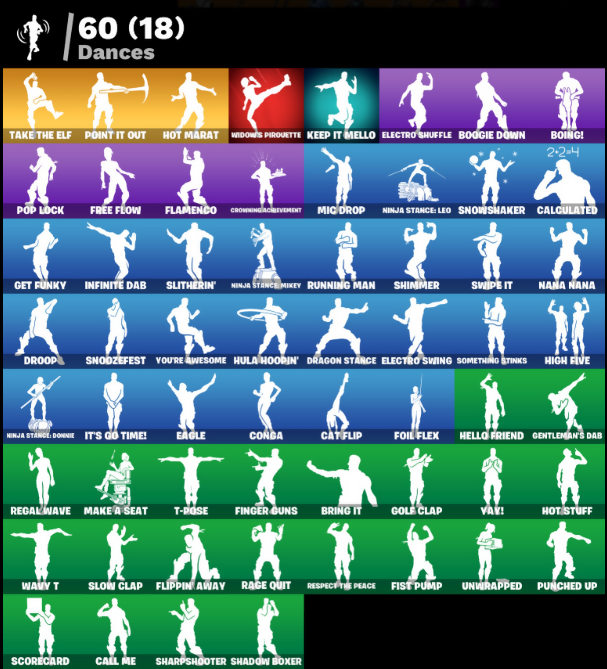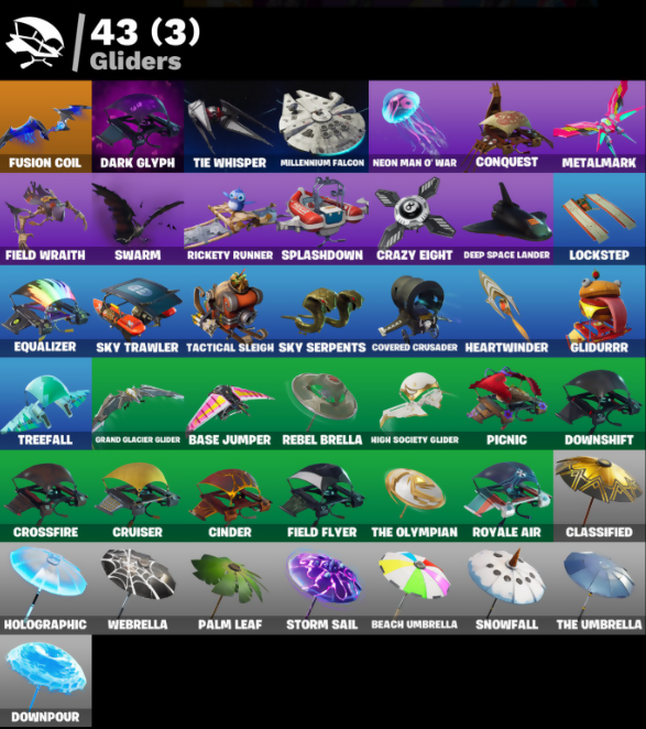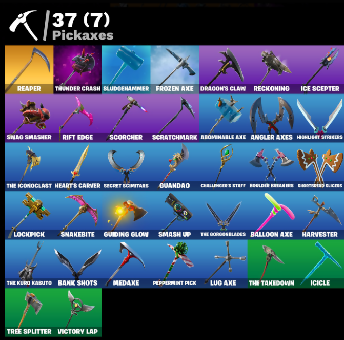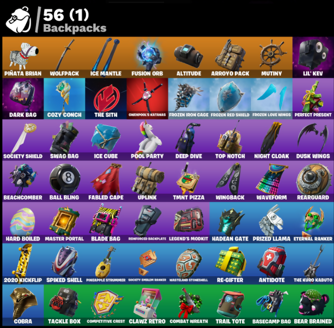 2020 Kickflip, 8-Ball Vs Scratch, Abominable Axe, Altitude, Angler Axes, Antidote, Arroyo Pack, Ball Bling, Balloon Axe, Bank Shots, Base Jumper, Basecamp Bag, Beach Umbrella, Beachcomber, Bear Brained, Blackheart, Blade Bag, Boing!, Boogie Down, Boulder Breakers, Bring It, Calamity, Calculated, Call Me, Cameo Vs Chic, Cat Flip, Challenger's Staff, Cinder, Classified, Clawz Retro, Cobalt, Cobra, Combat Wreath, Competitive Crest, Conga, Conquest, Covered Crusader, Cozy Conch, Crazy Eight, Crossfire, Cruiser, DJ Yonder, Dark Bag, Dark Bomber, Dark Glyph, Deep Dive, Deep Space Lander, Dire, Downpour, Downshift, Dragon Stance, Dragon's Claw, Drift, Droop, Dusk, Dusk Wings, Eagle, Electro Shuffle, Electro Swing, Ember, Equalizer, Eternal Ranker, Fable, Fabled Cape, Field Flyer, Field Wraith, Finger Guns, Fist Pump, Flamenco, Flippin' Away, Foil Flex, Free Flow, Frozen Axe, Frozen Iron Cage, Frozen Love Ranger, Frozen Love Wings, Frozen Raven, Frozen Red Knight, Frozen Red Shield, Fusion Coil, Fusion Orb, Gentleman's Dab, Get Funky, Ghoul Trooper, Giddy-Up, Glidurr, Golf Clap, Grand Glacier Glider, Guandao, Guiding Glow, Gwenpool's Katanas, Hadean Gate, Hard Boiled, Harvester, Heart's Carver, Heartwinder, Hello Friend, High Five, High Society Glider, Highlight Strikers, Holographic, Hot Marat, Hot Stuff, Hula Hoopin', Huntress, Hybrid, Ice Cube, Ice Mantle, Ice Scepter, Icicle, Infinite Dab, It's Go Time!, Journey Vs Hazard, Keep It Mello, Laguna, Legend's Modkit, Lil' Kev, Lockpick, Lockstep, Lt. Evergreen, Lug Axe, Lynx, Make A Seat, Master Portal, Medaxe, Metalmark, Mic Drop, Millennium Falcon, Moniker, Mothmando, Mutiny, Nana Nana, Neon Man O' War, Night Cloak, Nightshade, Ninja Stance: Leo, Onesie, Palm Leaf, Payback, Peely, Peppermint Pick, Perfect Present, Picnic, Pinata Brian, Pineapple Strummer, Point It Out, Pool Party, Pop Lock, Powder, Prized Llama, Punched Up, Rabbit Raider, Rage Quit, Re-Gifter, Reaper, Rearguard, Rebel Brella, Reckoning, Red-Nosed Raider, Redline, Regal Wave, Remedy Vs Toxin, Respect The Peace, Rickety Runner, Rift Edge, Rippley Vs Sludge, Royale Air, Running Man, Scorcher, Scorecard, Scorpion, Scratchmark, Secret Scimitars, Sgt. Winter, Shadow Boxer, Sharpshooter, Shimmer, Shortbread Slicers, Sidewinder, Sky Serpents, Sky Trawler, Sledgehammer, Slitherin', Slow Clap, Sludgehammer, Smash Up, Snakebite, Snoozefest, Snowfall, Snowshaker, Society Emblem Ranker, Society Shield, Something Stinks, Spiked Shell, Splashdown, Storm Sail, Summit Striker, Sun Strider, Swag Bag, Swag Smasher, Swarm, Swipe It, T-Pose, TMNT Pizza, Tackle Box, Tactical Sleigh, Take The Elf, The Ace, The Gorgonblades, The Ice King, The Iconoclast, The Kuro Kabuto, The Olympian, The Sith, The Takedown, The Umbrella, Thunder Crash, Tie Whisper, Tinseltoes, Top Notch, Trail Tote, Tree Splitter, Treefall, Trog, Turk Vs Riptide, Unwrapped, Uplink, Vax!, Victory Lap, Wasteland Stoneshell, Waveform, Wavy T, Webrella, Widows Pirouette, Wingback, Wolfpack, Wooly Warrior, You're Awesome, Zenith
