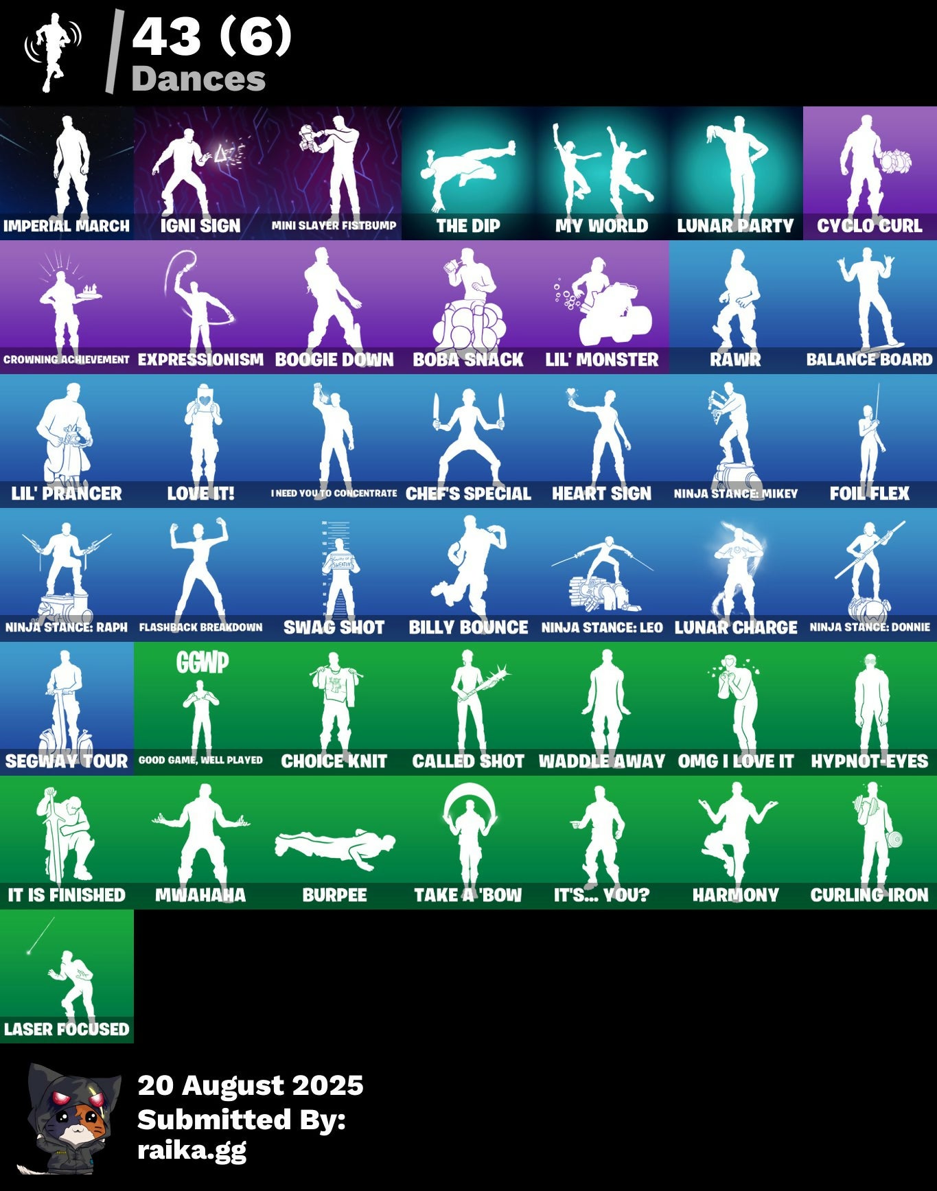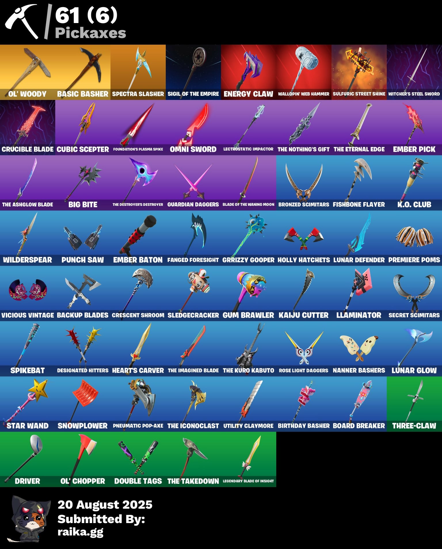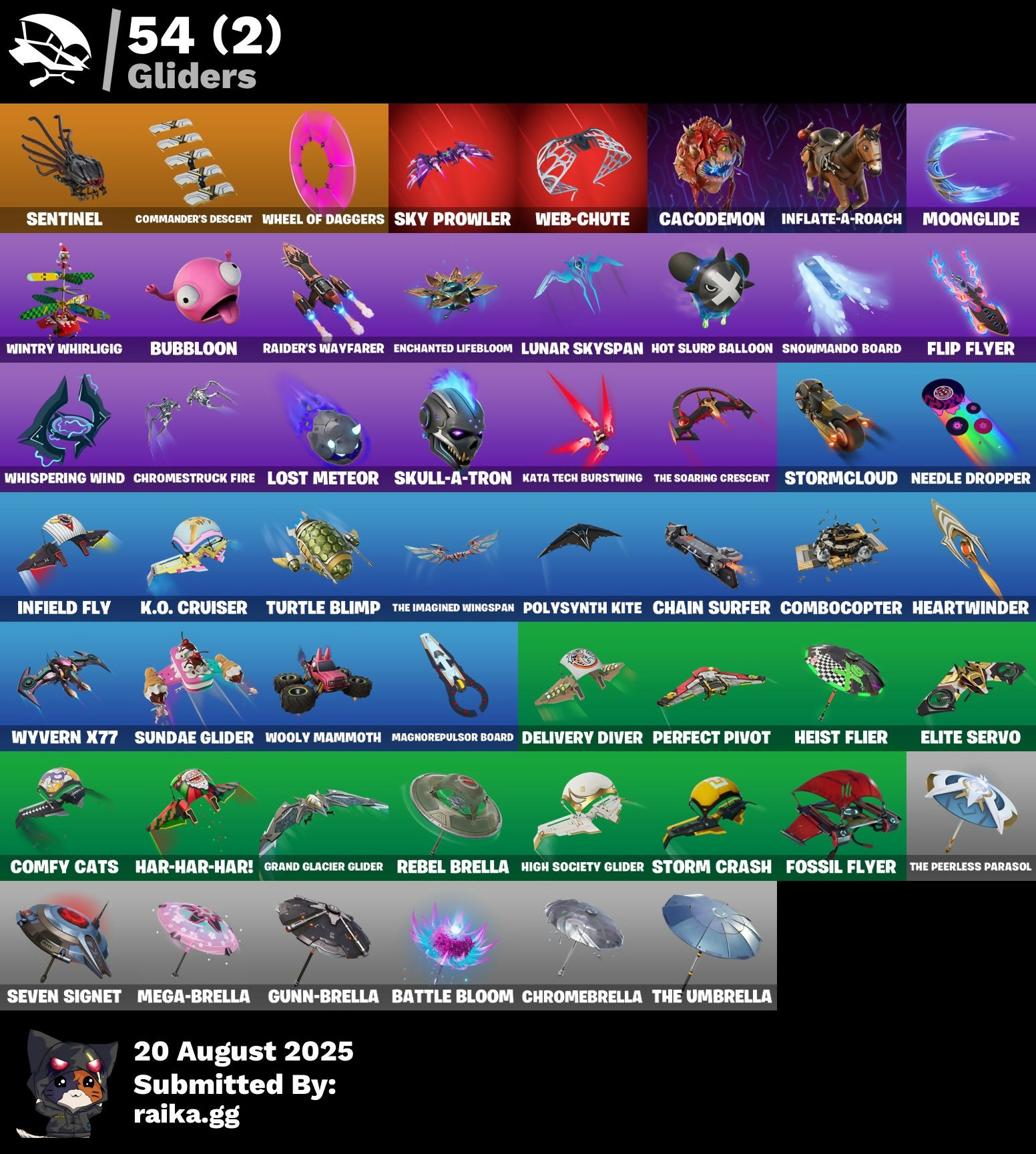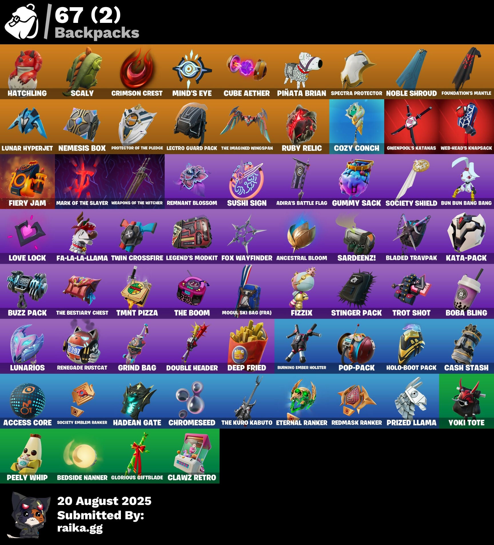 Access Core, Adira's Battle Flag, Ancestral Bloom, Arctic Adeline, Axion Sentinel, Backlash, Backup Blades, Balance Board, Basic Basher, Battle Bloom, Bedside Nanner, Beef Boss, Big Bite, Billy Bounce, Birthday Basher, Blade Of The Waning Moon, Bladed Travpak, Board Breaker, Boba Bling, Boba Snack, Boogie Down, Bronzed Scimitars, Bubbloon, Bun Bun Bang Bang, Burning Ember Holster, Burpee, Buzz Pack, Bytes, Cacodemon, Called Shot, Cash Stash, Chain Surfer, Chef's Special, Choice Knit, Chrome Punk, Chromebrella, Chromeseed, Chromestruck Fire, Clawz Retro, Combocopter, Comfy Cats, Commander's Descent, Cozy Conch, Crescent Shroom, Crimson Crest, Crowning Achievement, Crucible Blade, Cube Aether, Cubic Scepter, Curling Iron, Cyclo Curl, Deep Fried, Delivery Diver, Designated Hitters, Doom Slayer, Double Header, Double Tags, Driver, Dusty, Elite Servo, Ember Baton, Ember Pick, Enchanted Lifebloom, Energy Claw, Eternal Ranker, Expressionism, Fa-La-La-Llama, Fanged Foresight, Fiery Jam, Fishbone Flayer, Fizzix, Flashback Breakdown, Flip Flyer, Foil Flex, Fossil Flyer, Foundation's Mantle, Foundation's Plasma Spike, Fox Wayfinder, Geralt Of Rivia, Glorious Giftblade, Good Game, Well Played, Grand Glacier Glider, Grind Bag, Grriz, Grrizzy Gooper, Guardian Daggers, Guff Gringle, Gum Brawler, Gumbo, Gummy Sack, Gunn-Brella, Gunnar, Gwenpool's Katanas, Hadean Gate, Har-Har-Har!, Harlowe, Harmony, Hatchling, Haven, Heart Sign, Heart's Carver, Heartwinder, Heist Flier, Helsie, High Society Glider, Holiday Boxy, Holly Hatchets, Holo-Boot Pack, Hot Slurp Balloon, Hypnot-Eyes, I Need You To Concentrate, Igni Sign, Imani, Imperial March, Infield Fly, Inflate-A-Roach, It Is Finished, It's... You?, Jun-Hwan, K.O. Club, K.O. Cruiser, Kaiju Cutter, Kata Tech Burstwing, Kata-Pack, Kiara K.O., Krisabelle, Laser Focused, Lectro Guard Pack, Lectrostatic Impactor, Legend's Modkit, Legendary Blade Of Insight, Lennox Rose, Lil Split, Lil' Monster, Lil' Prancer, Llaminator, Lost Meteor, Love It!, Love Lock, Lt. John Llama, Lunar Charge, Lunar Defender, Lunar Glow, Lunar Hyperjet, Lunar Party, Lunar Skyspan, Lunarios, Magnorepulsor Board, Mark of the Slayer, Massai, Mecha-Pop, Mega-Brella, Meow Skulls, Mind's Eye, Mini Slayer Fistbump, Mogul Master (FRA), Mogul Ski Bag (Fra), Moonglide, Mwahaha, My World, Mystica, Nanner Bashers, Needle Dropper, Nemesis Box, Nezumi, Ninja Stance: Donnie, Ninja Stance: Leo, Ninja Stance: Mikey, Ninja Stance: Raph, Noble Shroud, Nog Ops, Ol' Chopper, Ol' Woody, Omg I Love It, Omni Sword, Paradigm (Reality-659), Peely Whip, Perfect Pivot, Piñata Brian, Pneumatic Pop-Axe, Polar Peely, Polysynth Kite, Pop-Pack, Premiere Poms, Prized Llama, Protector of the Pledge, Prowler, Punch Saw, Raider's Wayfarer, Rawr, Rebel Brella, Redmask Ranker, Remnant Blossom, Renegade Rustcat, Renzo The Destroyer, Rex, Ronin, Rose Light Daggers, Ruby Relic, Sardeenz!, Scaly, Secret Scimitars, Segway Tour, Selene, Sentinel, Seven Signet, Shanta, Sigil Of The Empire, Skull-A-Tron, Sky Prowler, Sled Ready Guff, Sledgecracker, Snowmando Board, Snowplower, Society Emblem Ranker, Society Shield, Spectra Knight, Spectra Protector, Spectra Slasher, Spider-Man, Spikebat, Star Wand, Stinger Pack, Storm Crash, Stormcloud, Sulfuric Street Shine, Sundae Glider, Sushi Sign, Swag Shot, TMNT Pizza, Take A 'Bow, Tectonic Komplex, The Ageless, The Ashglow Blade, The Bestiary Chest, The Boom, The Destroyer's Destroyer, The Dip, The Eternal Edge, The Foundation, The Iconoclast, The Imagined Blade, The Imagined Wingspan, The Kuro Kabuto, The Nothing's Gift, The Origin, The Peerless Parasol, The Soaring Crescent, The Takedown, The Umbrella, Three-Claw, Thunder, Tricera Ops, Trot Shot, Tsuki 2.0, Turtle Blimp, Twin Crossfire, Twyn, Utility Claymore, Vicious Vintage, Waddle Away, Wallopin' Web Hammer, Weapons of the Witcher, Web-Chute, Web-Head's Knapsack, Wheel of Daggers, Whispering Wind, Wilderspear, Winterfest Bushranger, Wintry Whirligig, Witcher's Steel Sword, Wooly Mammoth, Wyvern X77, Yoki Tote