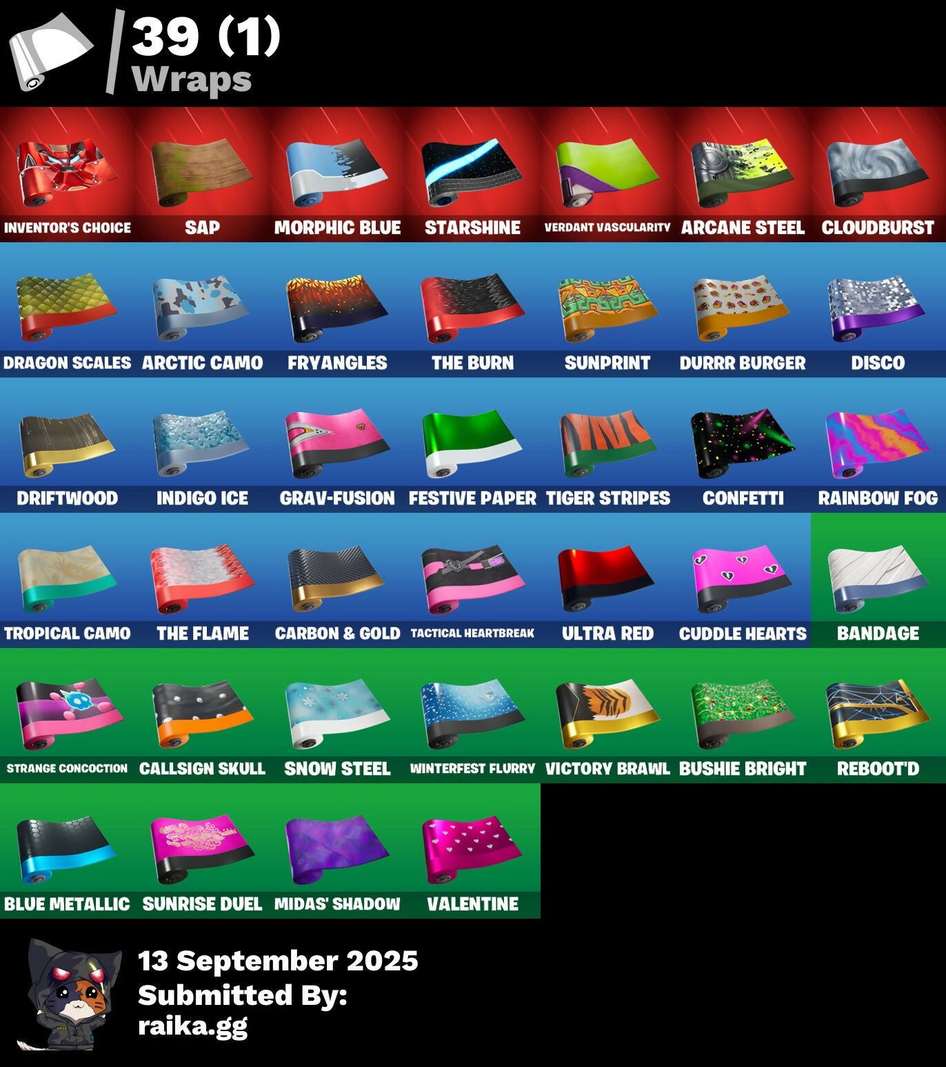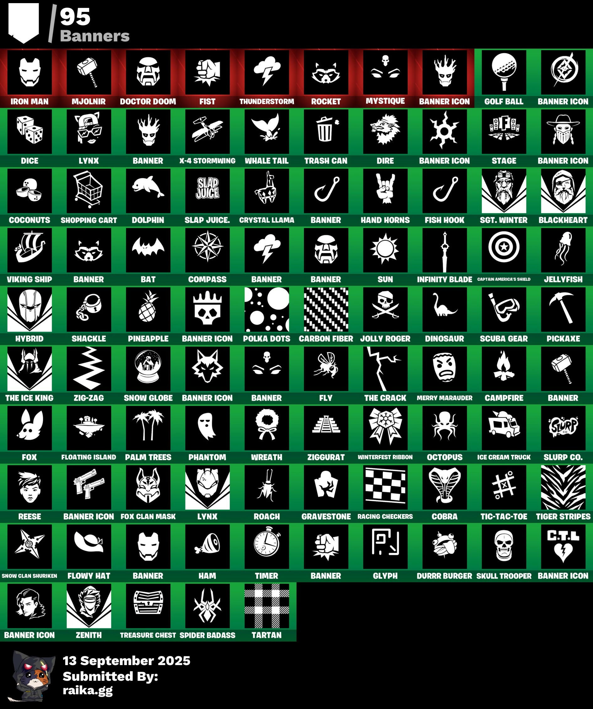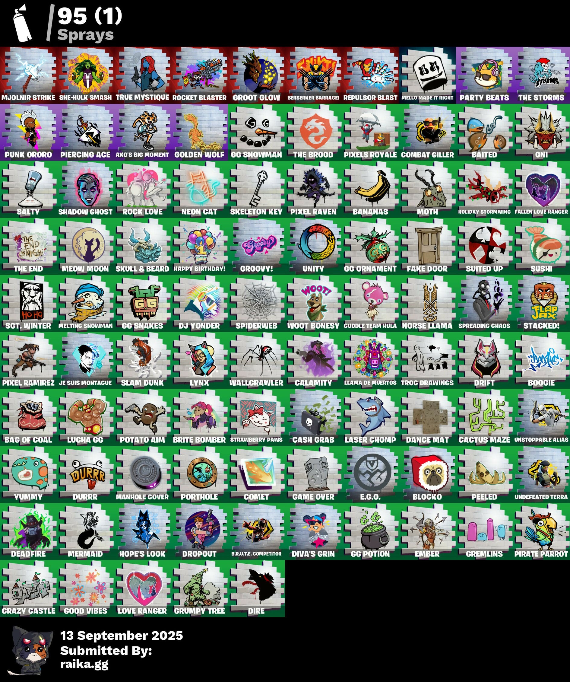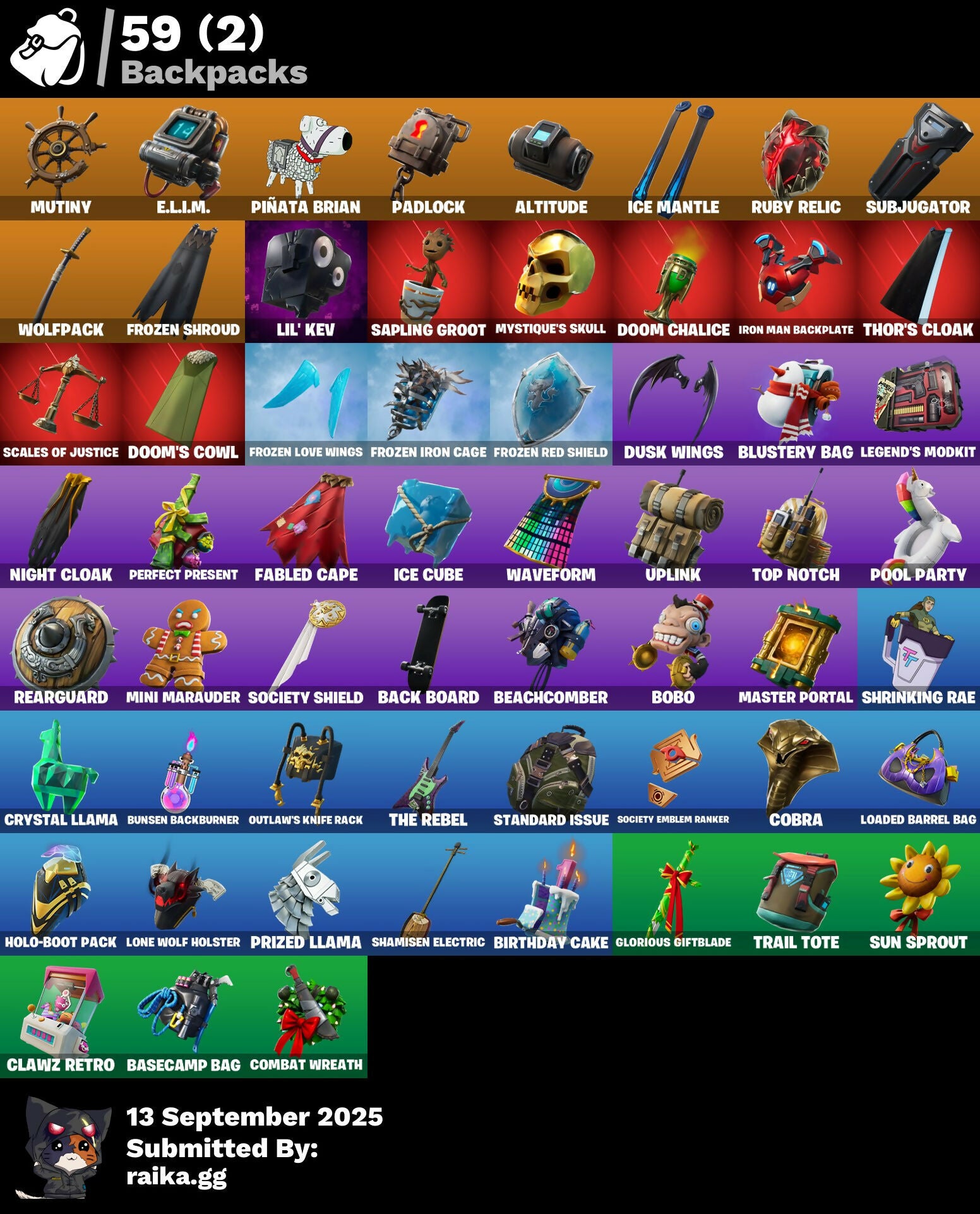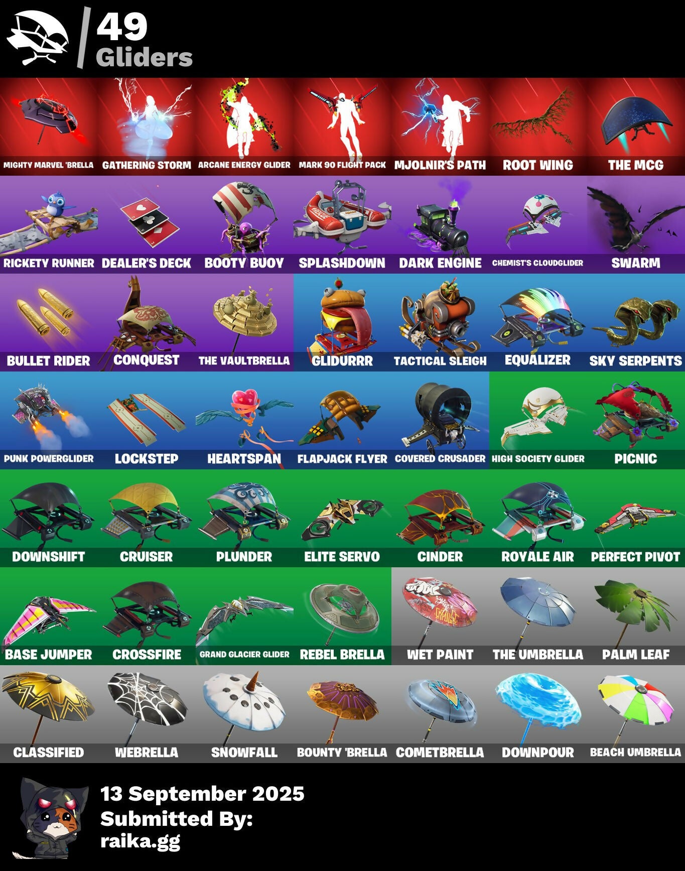 A.I.M., Abominable Axe, Altitude, Arcane Energy Glider, Arcane Steel, Arctic Camo, Axo's Big Moment, B.R.U.T.E. Competitor, Back Board, Bag Of Coal, Baited, Balloon Axe, Bananas, Bandage, Banner, Banner Icon, Baron's Hoard, Base Jumper, Basecamp Bag, Bat, Beach Umbrella, Beachcomber, Berserker Barrage!, Birthday Cake, Black Werewolf, Blackheart, Blackheart (Stage 8), Blocko, Blue Metallic, Blustery Bag, Bobo, Boogie, Boogie Down, Booty Buoy, Boulder Breakers, Bounty 'Brella, Breakdown, Brite Bomber, Bullet Rider, Bunsen Backburner, Bushie Bright, Cactus Maze, Calamity, Calamity Stage 5, Calculated, Call Me, Callsign Skull, Campfire, Captain America's Shield, Carbon & Gold, Carbon Fiber, Cash Grab, Cat Flip, Chemist's Cloudglider, Cinder, Classified, Clawz Retro, Cloudburst, Cobra, Coconuts, Combat Giller, Combat Wreath, Comet, Cometbrella, Compass, Confetti, Conga, Conquest, Covered Crusader, Crazy Castle, Crossfire, Crowbar, Crowning Achievement, Cruiser, Crystal Llama, Cuddle Carvers, Cuddle Hearts, Cuddle Team Hula, DJ Yonder, Dance Mat, Dark Engine, Dazzle, Deadfire, Dealer's Deck, Denied, Dice, Dinosaur, Dire, Disco, Diva's Grin, Doctor Doom, Dolphin, Doom Chalice, Doom's Cowl, Downpour, Downshift, Dragon Scales, Dragon Stance, Dragon's Claw, Drift, Drift Stage 5, Driftwood, Dropout, Durrr, Durrr Burger, Dusk, Dusk Wings, E.G.O., E.L.I.M., Electro Shuffle, Electro Swing, Elite Servo, Ember, Enforcer, Eon, Equalizer, Fable, Fabled Cape, Fake Door, Fallen Love Ranger, Festive Paper, Fish Hook, Fist, Flamenco, Flapjack Flyer, Flippin' Away, Floating Island, Flowy Hat, Fly, Foil Flex, Fox, Fox Clan Mask, Free Flow, Frosty Globes, Frozen Axe, Frozen Iron Cage, Frozen Love Ranger, Frozen Love Wings, Frozen Raven, Frozen Red Knight, Frozen Red Shield, Frozen Shroud, Fryangles, GG Ornament, GG Potion, GG Snakes, GG Snowman, Game Over, Gathering Storm, Gentleman's Dab, Get Funky, Giddy-Up, Gilded Morphic Blades, Glidurrr, Glorious Giftblade, Glyph, Golden Wolf, Golf Ball, Golf Clap, Good Vibes, Grand Glacier Glider, Grav-Fusion, Gravestone, Gremlins, Groot, Groot (Silver Foil), Groot Glow, Groot's Sap Axes, Groovy!, Grumpy Tree, Guiding Glow, Ham, Hammers Of Justice, Hand Horns, Hand Of Lightning, Happy Birthday!, Heartspan, Hello Friend, High Society Glider, Holiday Boxy, Holiday Stormwing, Holo-Boot Pack, Hope's Look, Hot Marat, Hot Pokers, Howl, Huntress, Hybrid, Hybrid (Stage 4), Ice Cream Truck, Ice Cube, Ice King (Gold), Ice Mantle, Ice Scepter, Icicle, Indigo Ice, Infinite Dab, Infinity Blade, Inventor's Choice, Iron Man, Iron Man Backplate, It's Go Time!, Je Suis Montague, Jellyfish, Jennifer Walters, Jolly Roger, Josie, Jubilation, Jungle Scout, Keep It Mello, Laser Chomp, Legend's Modkit, Lil' Kev, Llama De Muertos, Loaded Barrel Bag, Lobby Classic, Lockpick, Lockstep, Lone Wolf Holster, Love Ranger, Lucha GG, Lug Axe, Lynx, Lynx (Stage 4 - No Ponytail), Manhole Cover, Mark 85 Energy Blade, Mark 90 Flight Pack, Marshy Smasher, Master Key, Master Portal, Mello Made It Right, Melting Snowman, Meow Moon, Mermaid, Merry Marauder, Mic Drop, Midas' Shadow, Mighty Marvel 'Brella, Mini Marauder, Mjolnir, Mjolnir Strike, Mjolnir's Path, Morphic Blue, Moth, Mutiny, Mystique, Mystique's Skull, Nana Nana, Neon Cat, Night Cloak, Nightshade, Ninja Stance: Leo, Nog Ops, Norse Llama, Octopus, Ol' Woody, Onesie, Onesie (Winter), Oni, Outlaw's Knife Rack, Outlaw's Whipknives, Padlock, Palm Leaf, Palm Trees, Party Beats, Peeled, Peely, Perfect Pivot, Perfect Present, Permafrost, Phantom, Pickaxe, Picnic, Piercing Ace, Pigskin, Pineapple, Pirate Parrot, Pixel Ramirez, Pixel Raven, Pixels Royale, Piñata Brian, Plunder, Point It Out, Polka Dots, Pool Party, Popular Vibe, Porthole, Potato Aim, Powder, Powder (White), Prized Llama, Punk Ororo, Punk Powerglider, Racing Checkers, Ragnarok, Ragnarok (No Shoulder Pad), Rainbow Fog, Rearguard, Rebel Brella, Reboot'd, Reboot'd Breaker, Reckoning, Red-Nosed Raider, Redline, Reese, Regal Wave, Repulsor Blast, Respect The Peace, Rickety Runner, Rift Edge, Roach, Rock Love, Rock Paper Scissors, Rocket, Rocket Blaster, Rook, Root Wing, Royale Air, Ruby Relic, Running Man, Salty, Salute, Sap, Sapling Groot, Say So, Scales of Justice, Scorcher, Scratchmark, Scuba Gear, Secret Scimitars, Sgt. Winter, Sgt. Winter Headgear, Shackle, Shadow Ghost, Shamisen Electric, Shaolin Sit-Up, She-Hulk Smash, Shimmer, Shooting Starstaff, Shopping Cart, Shrinking Rae, Sidewinder, Sing Along, Skeleton Key, Skull & Beard, Skull Ranger, Skull Trooper, Sky Serpents, Slam Dunk, Slap Juice, Sledgehammer, Slitherin', Slow Clap, Slurp Co., Smash O'-Lantern, Smash Up, Snakebite, Snoozefest, Snow Clan Shuriken, Snow Globe, Snow Steel, Snowfall, Society Emblem Ranker, Society Shield, Sparkling Star, Spider Badass, Spiderweb, Splashdown, Spreading Chaos, Stacked!, Staff Of Doom, Stage, Stage 4, Standard Issue, Starshine, Storm, Strange Concoction, Strawberry Paws, Subjugator, Suited Up, Summit Striker, Sun, Sun Sprout, Sun Strider, Sunprint, Sunrise Duel, Sushi, Swag Smasher, Swarm, Sweet Clementine, Swipe It, Tactical Heartbreak, Tactical Sleigh, Take The Elf, Tartan, The Break, The Brood, The Burn, The Crack, The End, The Flame, The Ice King, The Iconoclast, The Mcg, The Prisoner, The Rebel, The Storms, The Takedown, The Umbrella, The Vaultbrella, Thor, Thor (Silver Foil), Thor's Cloak, Throwback Axe, Thunderstorm, Tic-Tac-Toe, Tiger Stripes, Timer, Toe Pick, Tony Stark, Top Notch, Trail Tote, Trash Can, Treasure Chest, Trog, Trog (Tribal), Trog Drawings, Tropical Camo, True Heart, True Mystique, Ultra Red, Undefeated Terra, Unity, Unstoppable Alias, Uplink, Valentine, Verdant Vascularity, Victory Brawl, Viking Ship, Wakandan Salute, Wallcrawler, Waterworks, Waveform, Webrella, Wet Paint, Whale Tail, Winterfest Bushranger, Winterfest Flurry, Winterfest Ribbon, Wolfpack, Wolverine, Woot Bonesy, Wreath, X-4 Stormwing, You're Awesome, Yummy, Zenith, Zenith (Stage 4), Zig-Zag, Ziggurat