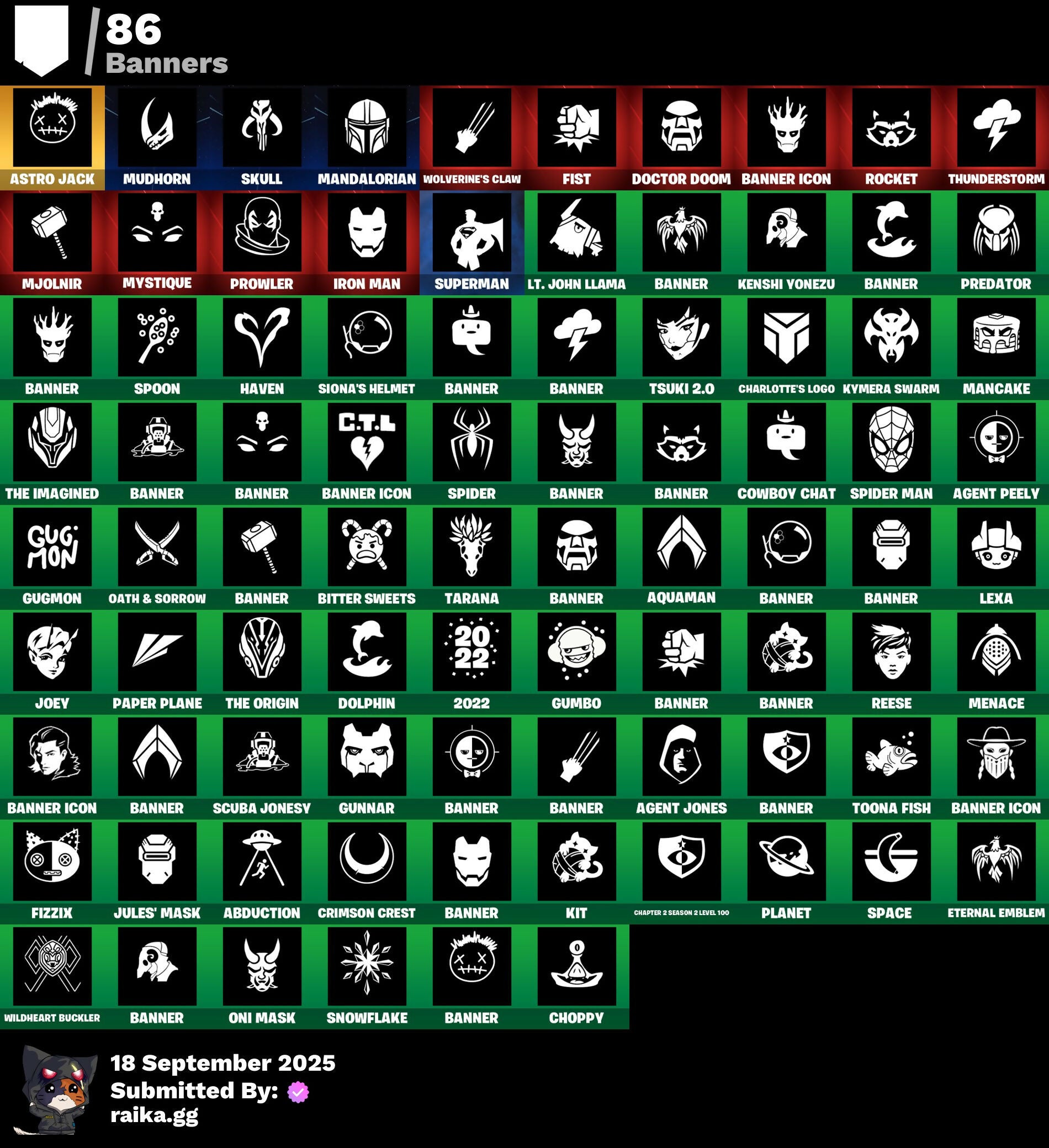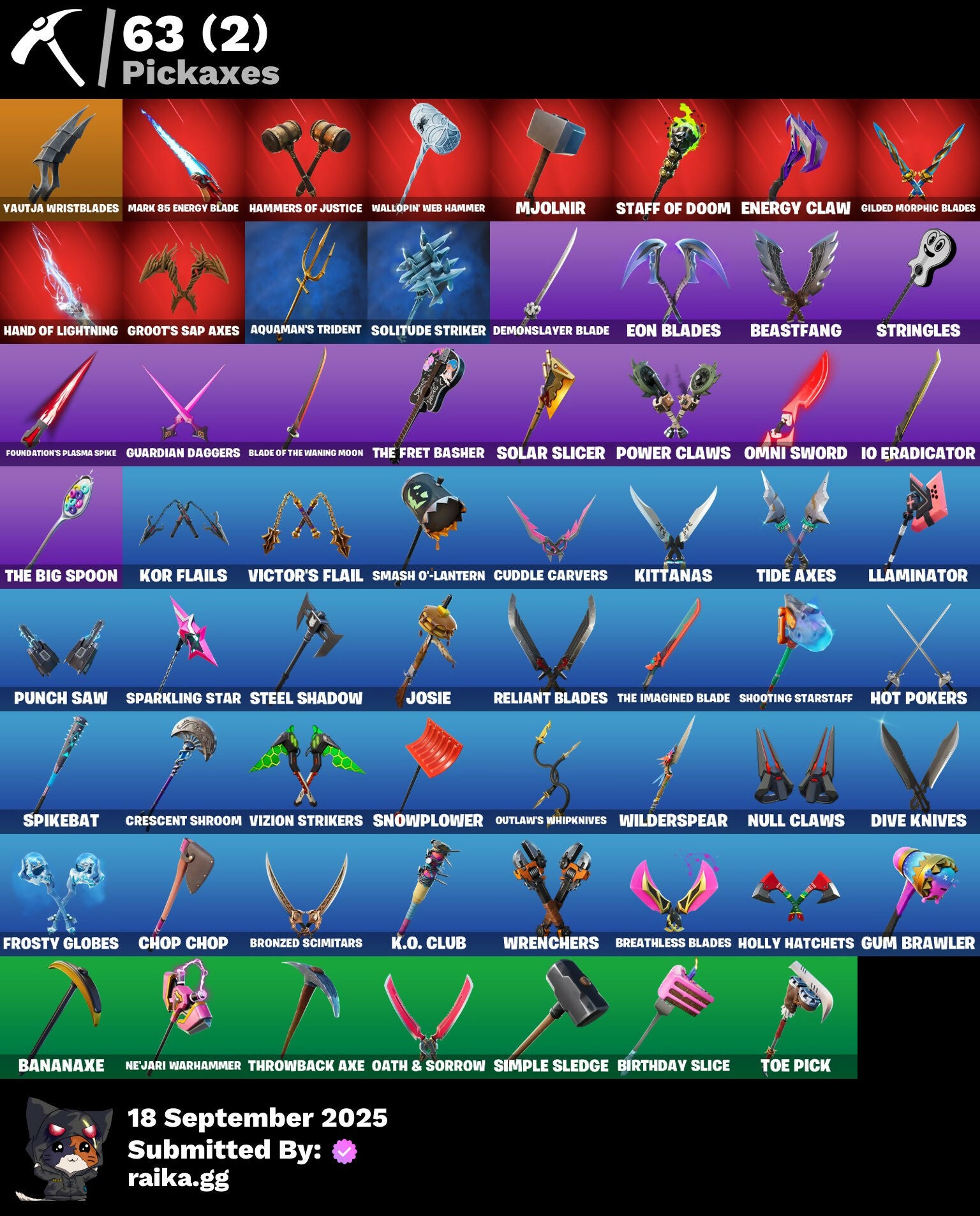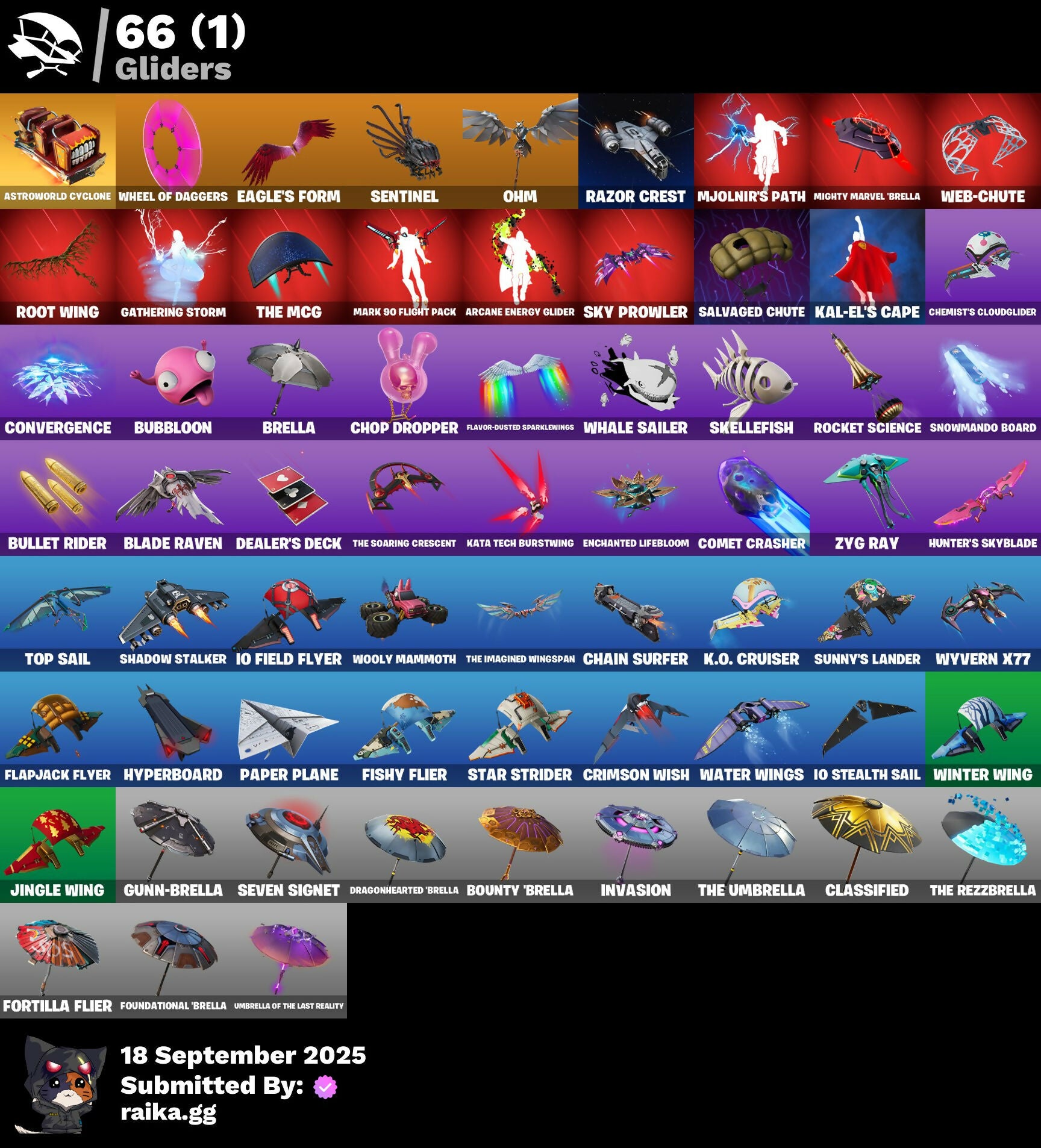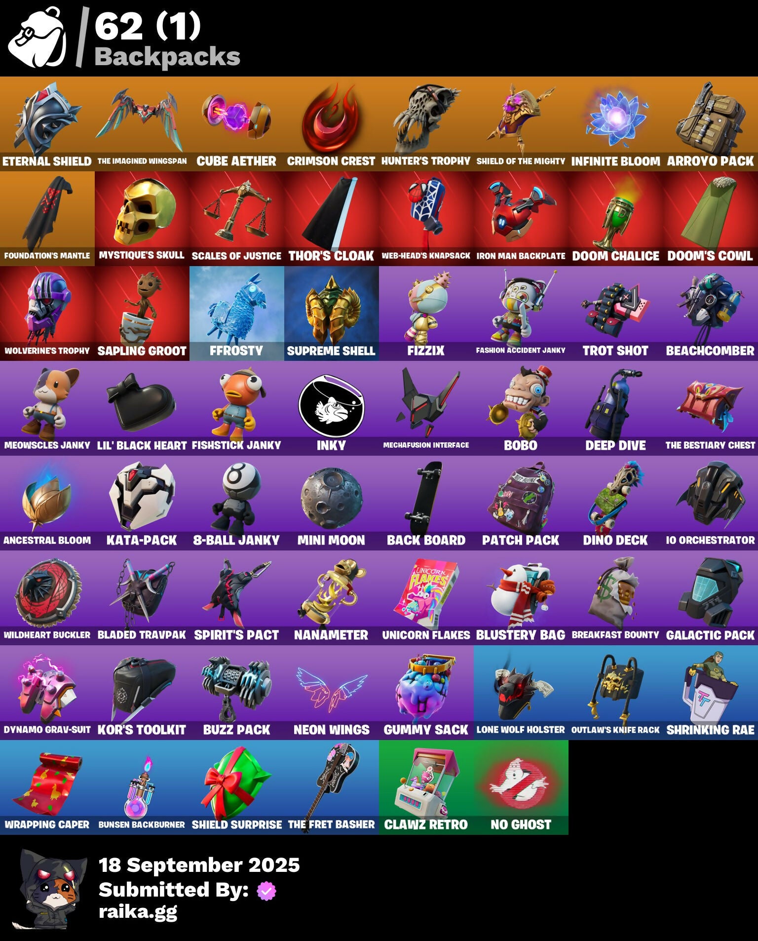 2.0's Revenge, 2022, 8-Ball Janky, A Warrior Prepares, Abduction, Afterparty, Agent Jones, Agent Peely, Air Shredder, Ancestral Bloom, Aquaman, Aquaman's Trident, Arcane Energy Glider, Arcane Steel, Arroyo Pack, Arthur Curry, Astro Jack, Astroworld Cyclone, Axo's Big Moment, Back Board, Bananaxe, Banner, Banner Icon, Beachcomber, Beamers, Beastfang, Beep Beep, Berserker Barrage!, Big Guns, Birthday Slice, Bitter Sweets, Black, Blade Raven, Blade of the Waning Moon, Bladed Travpak, Blasted, Blustery Bag, Bobo, Bombastic Winterfest, Boomin', Both Eyes Open, Bounty 'Brella, Breakfast Bounty, Breathless Blades, Brella, Bronzed Scimitars, Bubbloon, Bullet Rider, Bunsen Backburner, Buzz Pack, C3S2 Contender I, Call Me, Cap Kick, Cash Grab, Chain Surfer, Charlotte, Charlotte's Logo, Chemist's Cloudglider, Chibi, Chimpanski Wants You, Choice Knit, Chomp Cud!!, Chop Chop, Chop Dropper, Choppy, Classified, Clawz Retro, Clean Sweep, Cloudburst, Comet, Comet Crasher, Confetti, Convergence, Cowboy Chat, Crabby King, Crackdown, Crescent Shroom, Crimson Crest, Crimson Wish, Crowning Achievement, Cube Aether, Cuddle Carvers, Cyclo Curl, D.C. 63, Dealer's Deck, Deep Dive, Deep Future, Demons Beware, Demonslayer Blade, Denim Destiny, Dino Deck, Diva's Grin, Dive Knives, Doctor Doom, Doctor Doom (God Emperor), Doctor Slone, Dolphin, Doom Chalice, Doom's Cowl, Dragonhearted 'Brella, Dropout, Dynamo Grav-Suit, Eagle's Form, Enchanted Lifebloom, Energy Claw, Eon Blades, Eternal Emblem, Eternal Knight, Eternal Shield, Everything's Fine, Eye Of Agamotto, Fabio Sparklemane, Fade, Fade Out, Fashion Accident Janky, Ferocious, Ffrosty, Fishstick Janky, Fishy Flier, Fist, Fizzix, Flapjack Flyer, Flavor-Dusted Sparkwings, Flippin' Away, Fortilla Flier, Foundation's Mantle, Foundation's Plasma Spike, Foundational, Foundational 'Brella, Frost Squad, Frosted, Frosty Globes, Fryangles, Galactic Pack, Gathering Storm, Geared Up, Gilded Morphic Blades, Golden Wolf, Good Guy, Grav-Fusion, Green Toy, Grey Toy, Groot, Groot (Silver Foil), Groot Glow, Groot's Sap Axes, Groovy!, Guardian Daggers, Guggi Was Here, Guggimon, Gugmon, Gum Brawler, Gumbo, Gumbo (Sour), Gummy Sack, Gunn-'Brella, Gunnar, Gunnar's Special, Hammerhead, Hammers of Justice, Hand of Lightning, Hand-Forged, Happy, Harlowe, Have A Seat, Haven, Haven (Tropical Chirper), Head (Droopy), Heart Sign, Heart's Desire, Heat Vision Hunter, Here Comes Trubble, Hidden Haven, Holly Hatchets, Hop And A Wink, Hot Pokers, Hunter's Arsenal, Hunter's Skyblade, Hunter's Trophy, Hyperboard, I Am Fearless, IO Orchestrator, If Looks Could..., Imagined, In Her Sights, Industrious, Infinite Bloom, Ink Wolf, Inky, Inside Out, Invasion, Inventor's Choice, Io Eradicator, Iron Man, Iron Man Backplate, It's... You?, Jennifer Walters, Jingle Wing, Joey, Josie, Jubilation, Jules, Jules' Mask, Jurassically Charged, K.O. Club, K.O. Cruiser, Kal-El's Cape, Kata Tech Burstwing, Kata-Pack, Kenshi Yonezu, Keyed Up, Kiara K.O., Kiara K.O. (Captain's Bomber), Kit, Kittanas, Knight's Helm, Kondor, Kor, Kor (Trenchcoat), Kor Flails, Kor's Toolkit, Krisabelle, Kymera, Kymera Swarm, Laser Blaze, Lexa, Lexa (Warstrike), Lil' Black Heart, Lil' Monster, Lil' Rover, Lil' Saucer, Lion's Roar, Llaminator, Llamistletoe, Lloose Cannon, Lobby Classic, Lone Wolf Holster, Lotus Touch, Love It!, Lt. John Llama, Lunar Charge, Mancake, Mandalorian, Mandalorian (Clothing), Mane Event, Mark 85 Energy Blade, Mark 90 Flight Pack, Mark of the Prowler, Mashed Potato, Masked, Master Engineer, Mave, Mave (Reactive Hair Off), Mecha Fish, Mechafusion Interface, Menace, Menace (Challenger Menace - Flame), Menacing, Meowabunga!, Meowscles Janky, Meowstermind, Mercurial, Merry Fishmas, Midas' Shadow, Mighty Marvel 'Brella, Mini Moon, Mjolnir, Mjolnir Strike, Mjolnir's Path, Morphic Blue, Mudhorn, Mwahaha, Mystique, Mystique (Tactical), Mystique's Skull, Nailed It, Nanameter, Ne'Jari Warhammer, Neon Wings, No Ghost, No Witnesses, Nomad's Treasure, Null Claws, Oath & Sorrow, Ocean, Ocean Wave, Ohm, Omni Sword, Oni Mask, Oozey, Original Issue, Outlaw's Knife Rack, Outlaw's Whipknives, Pancake Posse, Paper Plane, Party Beats, Patch Pack, Per Aspera Ad Astra, Piercing Ace, Planet, Planetary Vibe, Plastic Patroller, Polar Peely, Power Claws, Predator, Primate Space Program, Protector, Prowler, Punch Saw, Punk Ororo, Racer's Instincts, Rainbow Fog, Raven's Curse, Razor Crest, Ready When You Are, Red Plastic, Reese, Reliant Blades, Repulsor Blast, Rift-Sterpiece, Riptide, Rock Love, Rocket, Rocket Blaster, Rocket Science, Ronin, Ronin (Cape), Ronin's Mission, Root Wing, Salvaged Chute, Sap, Sapling Groot, Scales of Justice, Scootin', Scuba Jonesy, Segway Tour, Sentinel, Seven Signet, Shadow Ghost, Shadow Seal, Shadow Stalker, Shanta, Shanta (Headpiece), Shanta's Lifebloom, She-Hulk Smash, Shield Surprise, Shield of the Mighty, Shooting Starstaff, Shrinking Rae, Sidewayfarer, Sigil Red, Simple Sledge, Sing Along, Siona, Siona's Helmet, Sionica, Ska-Stra-Terrestrial, Skellefish, Skull, Sky Prowler, Slone, Smash O'-Lantern, Snap, Snow Steel, Snow Strike, Snowflake, Snowmando, Snowmando Board, Snowplower, So Square, Solar Slicer, Solitude Striker, Space, Sparkling Star, Spectral Hunter, Spider, Spider Man, Spider-Man, Spikebat, Spirit's Pact, Splinter Faction, Spoon, Staff of Doom, Stand Together, Star Strider, Starshine, Steel Shadow, Storm, Storm (Punk), Stormy, Strange Concoction, Stringles, Sunny, Sunny's Lander, Superman, Supreme Shell, Tactical Heartbreak, Take A 'Bow, Take The Cake, Tarana, The Bestiary Chest, The Big Spoon, The Big Three, The Colors!, The Cube Queen, The Fret Basher, The Imagined, The Imagined (Combat Elite), The Imagined Aura, The Imagined Blade, The Imagined Wingspan, The Mcg, The Origin, The Rezzbrella, The Soaring Crescent, The Umbrella, This Many, Thor, Thor (Silver Foil), Thor's Cloak, Throwback Axe, Thunderstorm, Tide Axes, Tippy Tap, Toe Pick, Tony Stark, Toona Fish, Top Sail, Toy Trooper, Trident!, Trot S