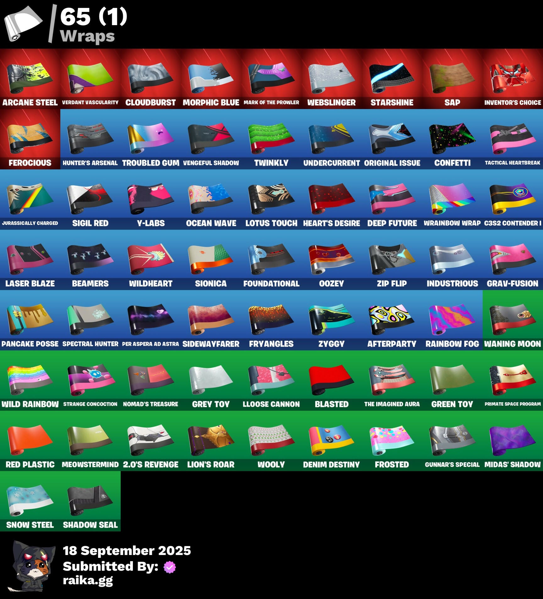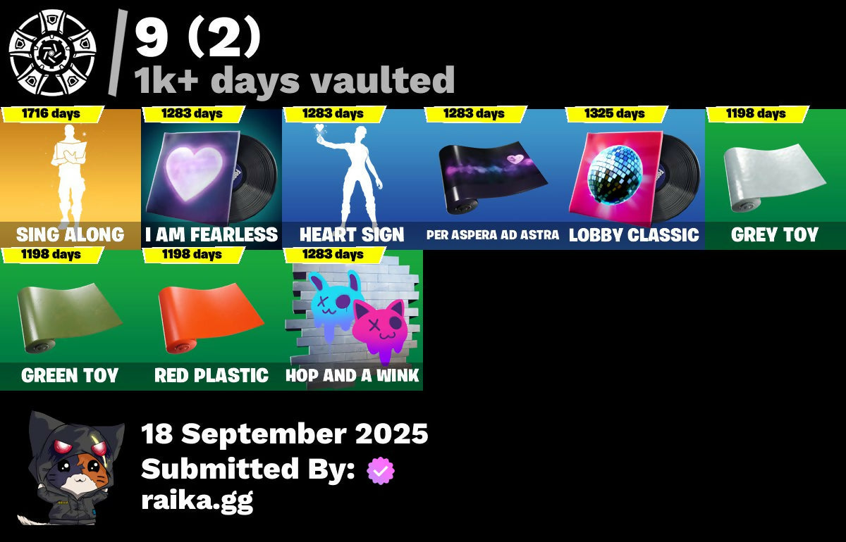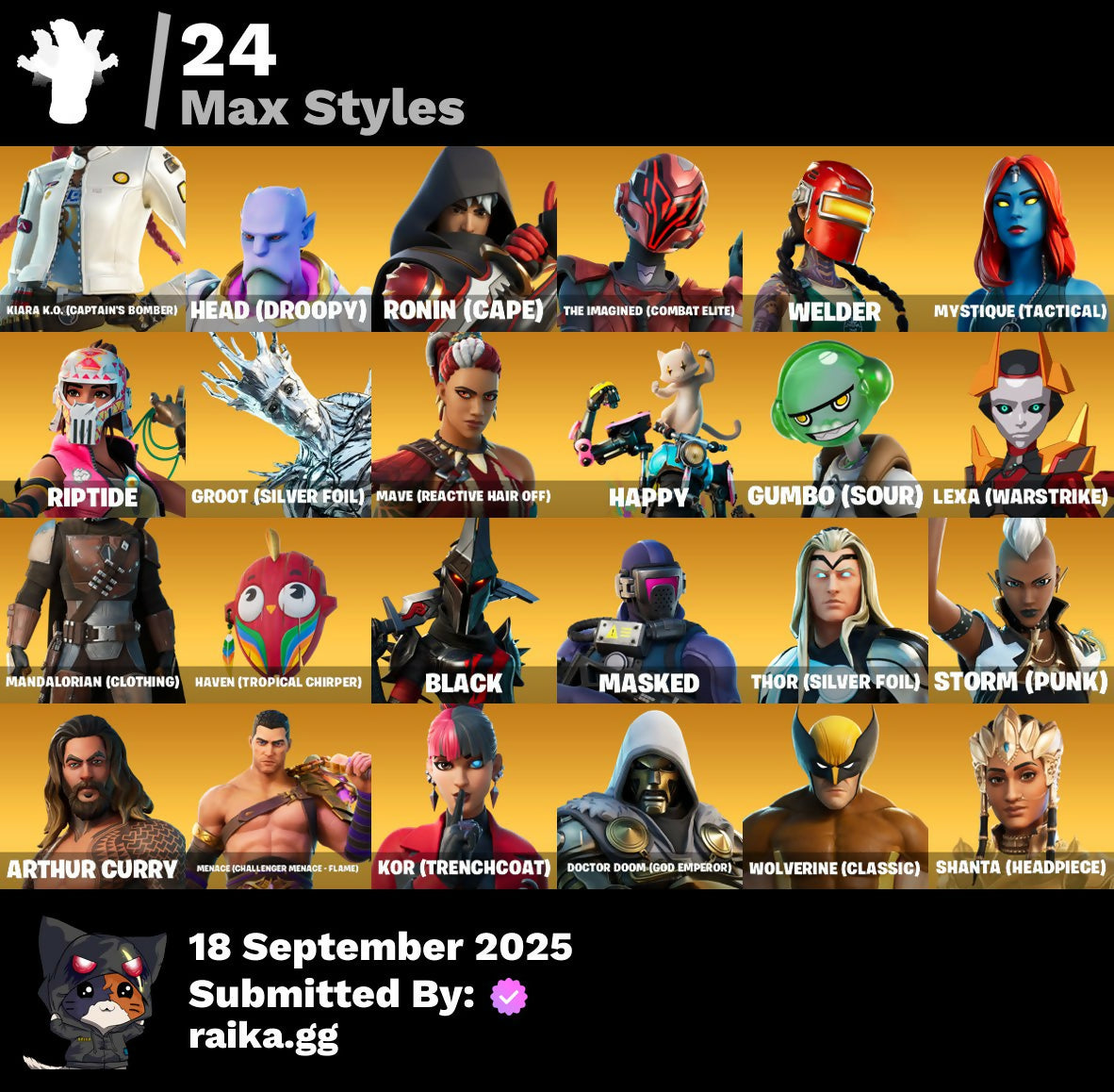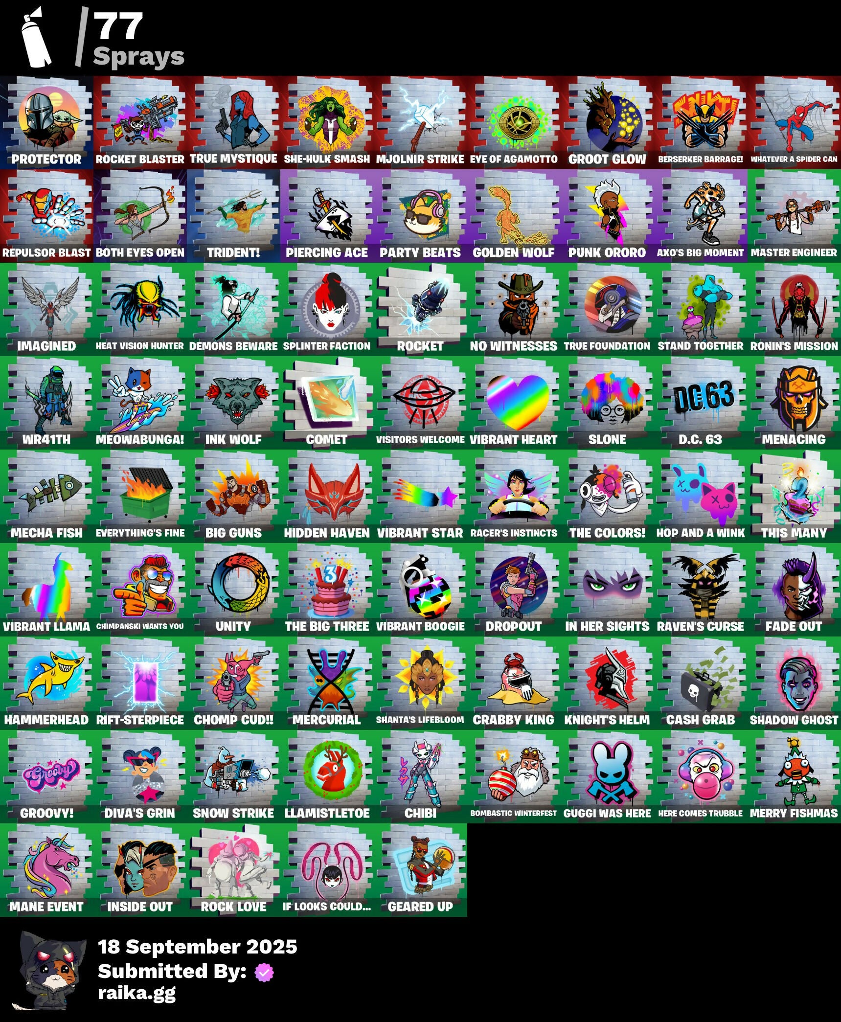 2.0's Revenge, 2022, 8-Ball Janky, A Warrior Prepares, Abduction, Afterparty, Agent Jones, Agent Peely, Air Shredder, Ancestral Bloom, Aquaman, Aquaman's Trident, Arcane Energy Glider, Arcane Steel, Arroyo Pack, Arthur Curry, Astro Jack, Astroworld Cyclone, Axo's Big Moment, Back Board, Bananaxe, Banner, Banner Icon, Beachcomber, Beamers, Beastfang, Beep Beep, Berserker Barrage!, Big Guns, Birthday Slice, Bitter Sweets, Black, Blade Raven, Blade of the Waning Moon, Bladed Travpak, Blasted, Blustery Bag, Bobo, Bombastic Winterfest, Boomin', Both Eyes Open, Bounty 'Brella, Breakfast Bounty, Breathless Blades, Brella, Bronzed Scimitars, Bubbloon, Bullet Rider, Bunsen Backburner, Buzz Pack, C3S2 Contender I, Call Me, Cap Kick, Cash Grab, Chain Surfer, Charlotte, Charlotte's Logo, Chemist's Cloudglider, Chibi, Chimpanski Wants You, Choice Knit, Chomp Cud!!, Chop Chop, Chop Dropper, Choppy, Classified, Clawz Retro, Clean Sweep, Cloudburst, Comet, Comet Crasher, Confetti, Convergence, Cowboy Chat, Crabby King, Crackdown, Crescent Shroom, Crimson Crest, Crimson Wish, Crowning Achievement, Cube Aether, Cuddle Carvers, Cyclo Curl, D.C. 63, Dealer's Deck, Deep Dive, Deep Future, Demons Beware, Demonslayer Blade, Denim Destiny, Dino Deck, Diva's Grin, Dive Knives, Doctor Doom, Doctor Doom (God Emperor), Doctor Slone, Dolphin, Doom Chalice, Doom's Cowl, Dragonhearted 'Brella, Dropout, Dynamo Grav-Suit, Eagle's Form, Enchanted Lifebloom, Energy Claw, Eon Blades, Eternal Emblem, Eternal Knight, Eternal Shield, Everything's Fine, Eye Of Agamotto, Fabio Sparklemane, Fade, Fade Out, Fashion Accident Janky, Ferocious, Ffrosty, Fishstick Janky, Fishy Flier, Fist, Fizzix, Flapjack Flyer, Flavor-Dusted Sparkwings, Flippin' Away, Fortilla Flier, Foundation's Mantle, Foundation's Plasma Spike, Foundational, Foundational 'Brella, Frost Squad, Frosted, Frosty Globes, Fryangles, Galactic Pack, Gathering Storm, Geared Up, Gilded Morphic Blades, Golden Wolf, Good Guy, Grav-Fusion, Green Toy, Grey Toy, Groot, Groot (Silver Foil), Groot Glow, Groot's Sap Axes, Groovy!, Guardian Daggers, Guggi Was Here, Guggimon, Gugmon, Gum Brawler, Gumbo, Gumbo (Sour), Gummy Sack, Gunn-'Brella, Gunnar, Gunnar's Special, Hammerhead, Hammers of Justice, Hand of Lightning, Hand-Forged, Happy, Harlowe, Have A Seat, Haven, Haven (Tropical Chirper), Head (Droopy), Heart Sign, Heart's Desire, Heat Vision Hunter, Here Comes Trubble, Hidden Haven, Holly Hatchets, Hop And A Wink, Hot Pokers, Hunter's Arsenal, Hunter's Skyblade, Hunter's Trophy, Hyperboard, I Am Fearless, IO Orchestrator, If Looks Could..., Imagined, In Her Sights, Industrious, Infinite Bloom, Ink Wolf, Inky, Inside Out, Invasion, Inventor's Choice, Io Eradicator, Iron Man, Iron Man Backplate, It's... You?, Jennifer Walters, Jingle Wing, Joey, Josie, Jubilation, Jules, Jules' Mask, Jurassically Charged, K.O. Club, K.O. Cruiser, Kal-El's Cape, Kata Tech Burstwing, Kata-Pack, Kenshi Yonezu, Keyed Up, Kiara K.O., Kiara K.O. (Captain's Bomber), Kit, Kittanas, Knight's Helm, Kondor, Kor, Kor (Trenchcoat), Kor Flails, Kor's Toolkit, Krisabelle, Kymera, Kymera Swarm, Laser Blaze, Lexa, Lexa (Warstrike), Lil' Black Heart, Lil' Monster, Lil' Rover, Lil' Saucer, Lion's Roar, Llaminator, Llamistletoe, Lloose Cannon, Lobby Classic, Lone Wolf Holster, Lotus Touch, Love It!, Lt. John Llama, Lunar Charge, Mancake, Mandalorian, Mandalorian (Clothing), Mane Event, Mark 85 Energy Blade, Mark 90 Flight Pack, Mark of the Prowler, Mashed Potato, Masked, Master Engineer, Mave, Mave (Reactive Hair Off), Mecha Fish, Mechafusion Interface, Menace, Menace (Challenger Menace - Flame), Menacing, Meowabunga!, Meowscles Janky, Meowstermind, Mercurial, Merry Fishmas, Midas' Shadow, Mighty Marvel 'Brella, Mini Moon, Mjolnir, Mjolnir Strike, Mjolnir's Path, Morphic Blue, Mudhorn, Mwahaha, Mystique, Mystique (Tactical), Mystique's Skull, Nailed It, Nanameter, Ne'Jari Warhammer, Neon Wings, No Ghost, No Witnesses, Nomad's Treasure, Null Claws, Oath & Sorrow, Ocean, Ocean Wave, Ohm, Omni Sword, Oni Mask, Oozey, Original Issue, Outlaw's Knife Rack, Outlaw's Whipknives, Pancake Posse, Paper Plane, Party Beats, Patch Pack, Per Aspera Ad Astra, Piercing Ace, Planet, Planetary Vibe, Plastic Patroller, Polar Peely, Power Claws, Predator, Primate Space Program, Protector, Prowler, Punch Saw, Punk Ororo, Racer's Instincts, Rainbow Fog, Raven's Curse, Razor Crest, Ready When You Are, Red Plastic, Reese, Reliant Blades, Repulsor Blast, Rift-Sterpiece, Riptide, Rock Love, Rocket, Rocket Blaster, Rocket Science, Ronin, Ronin (Cape), Ronin's Mission, Root Wing, Salvaged Chute, Sap, Sapling Groot, Scales of Justice, Scootin', Scuba Jonesy, Segway Tour, Sentinel, Seven Signet, Shadow Ghost, Shadow Seal, Shadow Stalker, Shanta, Shanta (Headpiece), Shanta's Lifebloom, She-Hulk Smash, Shield Surprise, Shield of the Mighty, Shooting Starstaff, Shrinking Rae, Sidewayfarer, Sigil Red, Simple Sledge, Sing Along, Siona, Siona's Helmet, Sionica, Ska-Stra-Terrestrial, Skellefish, Skull, Sky Prowler, Slone, Smash O'-Lantern, Snap, Snow Steel, Snow Strike, Snowflake, Snowmando, Snowmando Board, Snowplower, So Square, Solar Slicer, Solitude Striker, Space, Sparkling Star, Spectral Hunter, Spider, Spider Man, Spider-Man, Spikebat, Spirit's Pact, Splinter Faction, Spoon, Staff of Doom, Stand Together, Star Strider, Starshine, Steel Shadow, Storm, Storm (Punk), Stormy, Strange Concoction, Stringles, Sunny, Sunny's Lander, Superman, Supreme Shell, Tactical Heartbreak, Take A 'Bow, Take The Cake, Tarana, The Bestiary Chest, The Big Spoon, The Big Three, The Colors!, The Cube Queen, The Fret Basher, The Imagined, The Imagined (Combat Elite), The Imagined Aura, The Imagined Blade, The Imagined Wingspan, The Mcg, The Origin, The Rezzbrella, The Soaring Crescent, The Umbrella, This Many, Thor, Thor (Silver Foil), Thor's Cloak, Throwback Axe, Thunderstorm, Tide Axes, Tippy Tap, Toe Pick, Tony Stark, Toona Fish, Top Sail, Toy Trooper, Trident!, Trot S