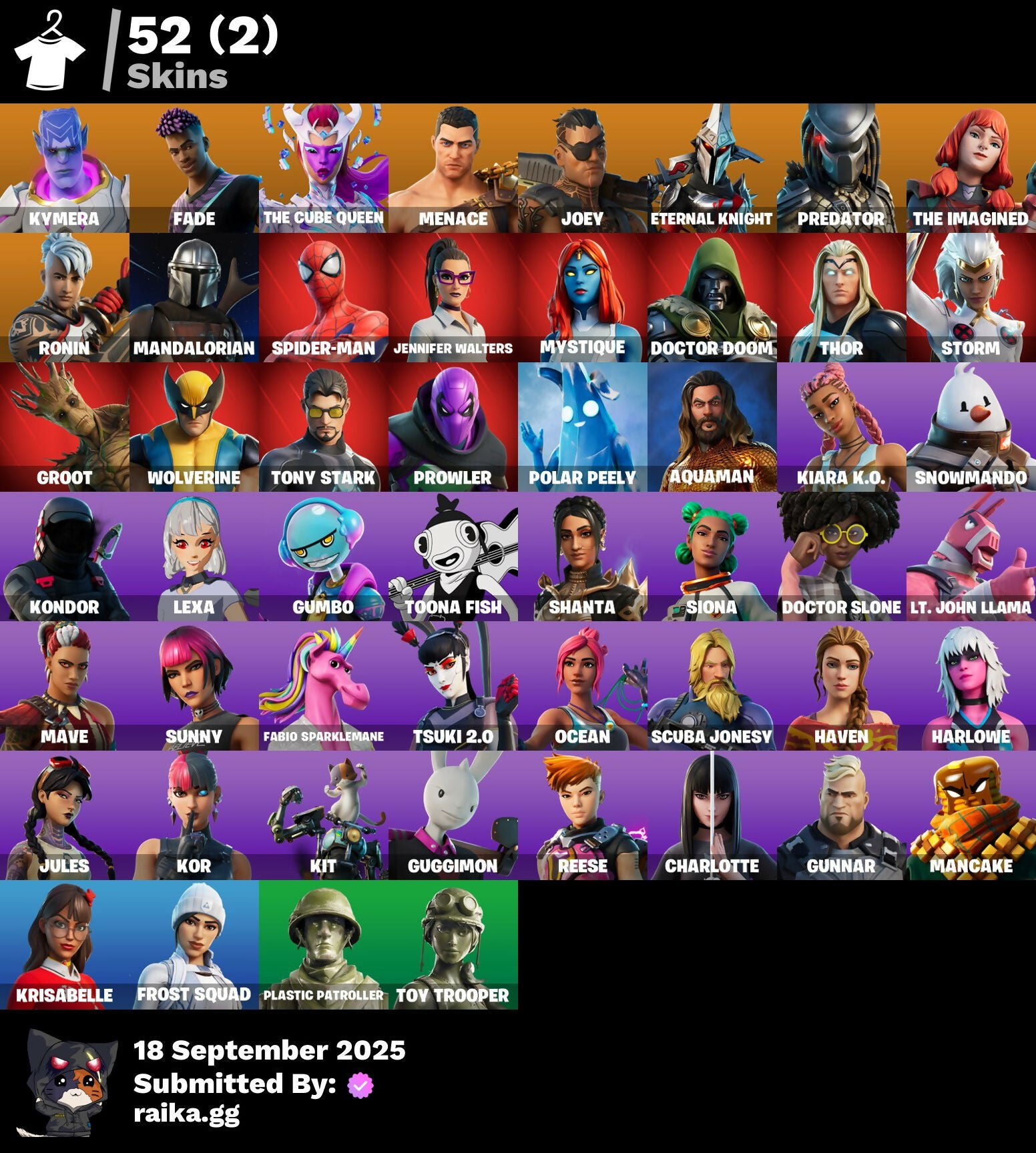 [PC/PSN/XBOX] 52 skins | Kymera | Fade | The Cube Queen | Menace | Joey | Eternal Knight | Predator | The Imagined | Ronin | Mandalorian | Spider-Man | 1500 VB / Fortnite