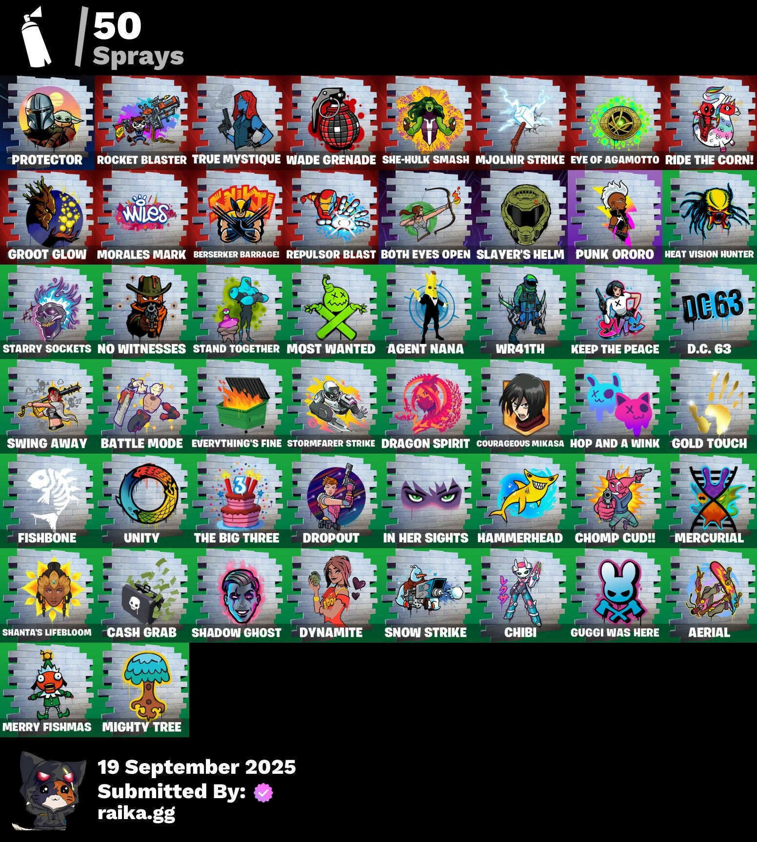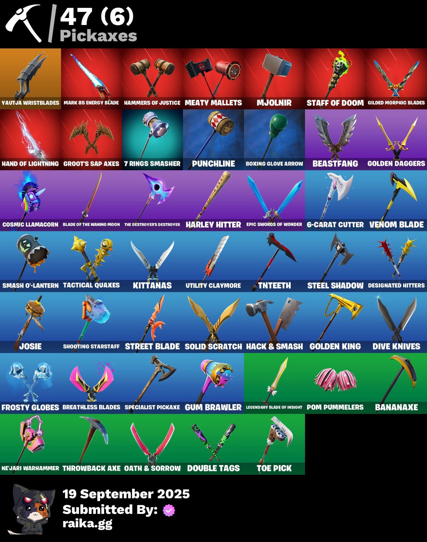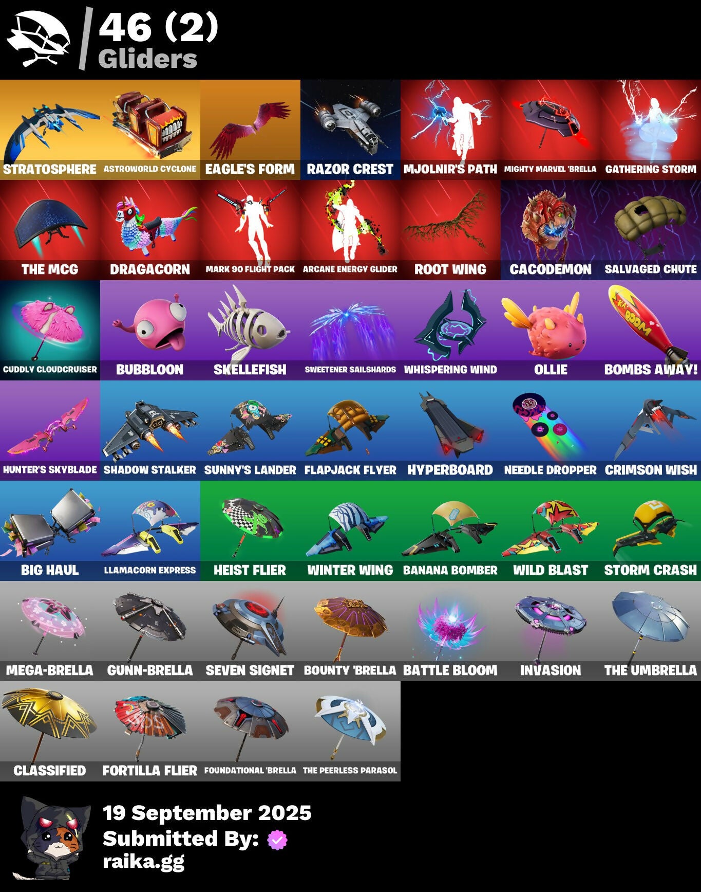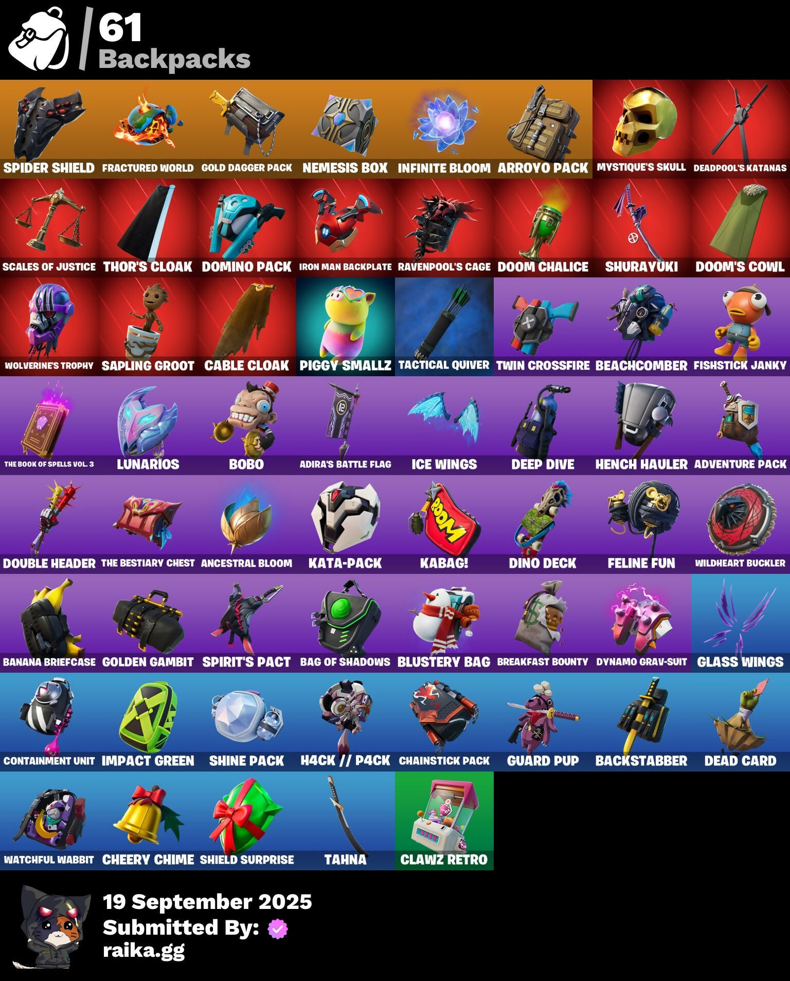6-Carat Cutter, 7 Rings Smasher, Adira's Armor, Adira's Battle Flag, Adventure Pack, Aerial, Afterparty, Agent Jones, Agent Nana, Agent Peely, Ancestral Bloom, Arcane Energy Glider, Arcane Steel, Ariana Grande, Arroyo Pack, Astro Jack, Astroworld Cyclone, Backstabber, Bag Of Shadows, Banana Bomber, Banana Briefcase, Bananaxe, Banner, Banner Icon, Battle Bloom, Battle Mode, Beachcomber, Beastfang, Beep Beep, Berserker Barrage!, Big Haul, Blade of the Waning Moon, Blasted, Blustery Bag, Bobo, Bombs Away!, Boogie Down, Boomin', Both Eyes Open, Bounty 'Brella, Boxing Glove Arrow, Breakfast Bounty, Breathless Blades, Brutus, Bubloon, Cable, Cable Cloak, Cacodemon, Calico, Call Me, Cash Grab, Chainstick Pack, Chapter 2 Season 2 Level 100, Cheery Chime, Chibi, Chigusa, Chimichanga!, Chomp Cod!!, Choppy, Classified, Clawz Retro, Clean Sweep, Cloudburst, Clutch, Coin Flip, Confetti, Containment Unit, Cosmic Llamacorn, Courageous Mikasa, Cowboy Chat, Crimson Wish, Crowning Achievement, Cuddly Cloudcruiser, Cyclo Curl, D.C. 63, Daisies, Dead Card, Deadpool, Deadpool Unmasked, Deadpool's Katanas, Decaying Dribbler, Deep Dive, Denim Destiny, Designated Hitters, Diamond Diva, Dino Deck, Dive Knives, Doctor Doom, Doctor Doom (God Emperor), Domino, Domino Pack, Don't Start Now, Doom Chalice, Doom's Cowl, Double Header, Double Tags, Dragacorn, Dragon Rune Lances, Dragon Spirit, Dropout, Drummies, Dynamite, Dynamo Grav-Suit, Eagle's Form, Epic Swords of Wonder, Escapees, Everything's Fine, Eye of Agamotto, Feline Fun, Ferocious, Fishbone, Fishstick Janky, Fist, Flapjack Flyer, Flippin' Away, Fortilla Flier, Foundational 'Brella, Fractured World, Frost Squad, Frosty Globes, Galaxia, Gathering Storm, Gear Specialist Maya, Gilded Morphic Blades, Glass Wings, Gold Dagger Pack, Gold Touch, Golden Daggers, Golden Gambit, Golden King, Golden Shine, Grav-Fusion, Green Arrow, Grind, Groot, Groot (Silver Foil), Groot Glow, Groot's Sap Axes, Guard Pup, Guggi Was Here, Gum Brawler, Gumbo, Gunn-Brella, Gunnar's Special, H4CK // P4CK, Hack & Smash, Hammerhead, Hammers of Justice, Hand of Lightning, Harley (Always Fantabulous), Harley Hitter, Harley Quinn, Haven, Heart Sign, Heart's Desire, Heat Vision Hunter, Heist Flier, Hemlock, Hench, Hench Hauler, Hop and a Wink, Hunter's Arsenal, Hunter's Skyblade, Hyperboard, Hypnot-Eyes, I Am Fearless, Ice Wings, Impact Green, In Her Sights, Infinite Bloom, Introducing..., Invasion, Inventor's Choice, Iron Man, Iron Man Backplate, Isabelle, It Is Finished, It's... You?, Jawbreaker, Jennifer Walters, Josie, Jurassically Charged, Kabag!, Kaboom!, Kata-Pack, Keep the Peace, Kenshi Yonezu, Kittanas, Kondor, Kymera Swarm, Kyra, Legendary Blade of Insight, Lexa, Lil' Floaticorn, Llamacorn Express, Lobby Classic, Love It!, Lunarian Luxury, Lunarios, Mancake, Mandalorian, Marigold, Mark 85 Energy Blade, Mark 90 Flight Pack, Mave, Mave (Reactive Hair Off), Meaty Mallets, Mega-Brella, Megumi, Members Only, Meowscles, Mercurial, Merry Fishmas, Midas, Midas Memory, Midas' Shadow, Mighty Marvel 'Brella, Mighty Tree, Mind's Eye, Mjolnir, Mjolnir Strike, Mjolnir's Path, Morales Mark, Morphic Blue, Most Wanted, Mudhorn, Mystique, Mystique (Tactical), Mystique's Skull, Ne'Jari Warhammer, Needle Dropper, Nemesis Box, No Witnesses, Oath & Sorrow, Ollie, Oozey, Pancake Posse, Pandemonium, Paws & Claws, Per Aspera Ad Astra, Piggy Smallz, Planet, Pom Pummellers, Protector, Psylocke, Punchline, Punk Ororo, Rainbow Fog, Raise The Roof, Ravenpool, Ravenpool's Cage, Ravina, Razor Crest, Reese, Repulsor Blast, Ride the Corn!, Rocket, Rocket Blaster, Root Wing, Roses, Salvaged Chute, Sap, Sapling Groot, Say So, Scales Of Justice, Scootin', Seeker, Seven Signet, Shadow Ghost, Shadow Seal, Shadow Stalker, Shanta's Lifebloom, She-Hulk Smash, Shield Surprise, Shine Pack, Shiver, Shooting Starstaff, Shurayuki, Side Hustle, Sing Along, Skellefish, Skye, Slayer's Helm, Smash O'-Lantern, Snow Steel, Snow Strike, Snowbell, Snowmando, So Square, Solid Scratch, Specialist Pickaxe, Spider, Spider Knight, Spider Shield, Spirit's Pact, Springy, Spy Vs Banana, Staff of Doom, Stand Together, Starry Sockets, Starshine, Steel Shadow, Storm, Storm (Punk), Storm Crash, Stormfarer Strike, Stratosphere, Street Blade, Sunny's Lander, Survivorsault, Sweetener Sailshards, Swing Away, TNTina, Tactical Quaxes, Tactical Quiver, Tahna, Take The Cake, Tarana, Tart Tycoon, The Bestiary Chest, The Big Three, The Book Of Spells Vol. 3, The Destroyer's Destroyer, The McG, The Peerless Parasol, The Renegade, The Umbrella, Thor, Thor (Silver Foil), Thor's Cloak, Throwback Axe, Thunderstorm, Tnteeth, Toe Pick, Tony Stark, True Mystique, Tsuki, Tsuki 2.0, Twin Crossfire, Undercurrent, Unity, Utility Claymore, Vautja Wristblades, Vengeful Shadow, Venom Blade, Verdant Vascularity, Verve, Vinyl, Vulcan Salute, WR4ITH, Wade Grenade, Wakandan Salute, Waning Moon, Watchful Wabbit, Webslinger, Whispering Wind, Wild Blast, Wildheart, Wildheart Buckler, Winter Wing, Witch Way, Wolverine, Wolverine (Classic), Wolverine's Trophy, Yellowjacket, Yuki