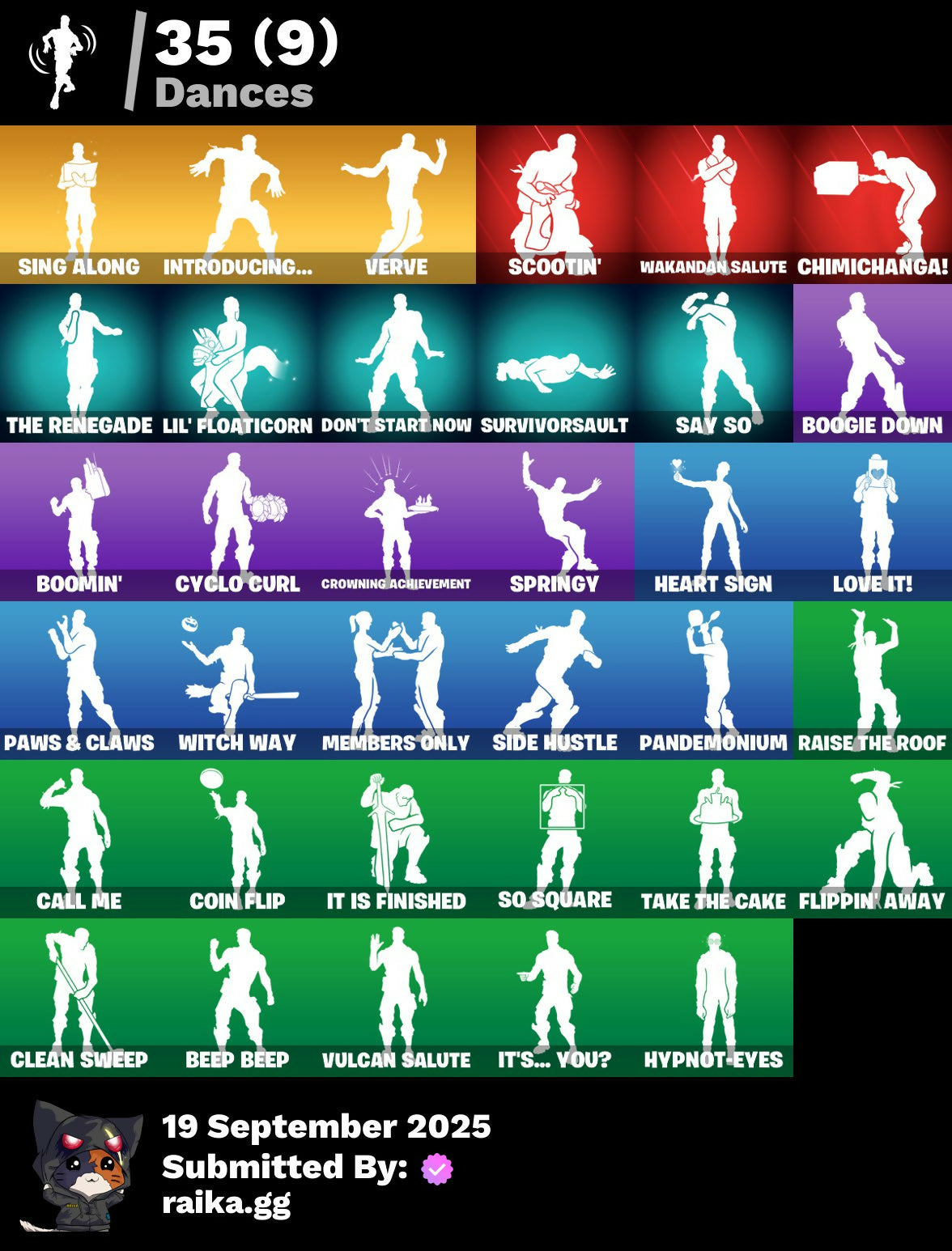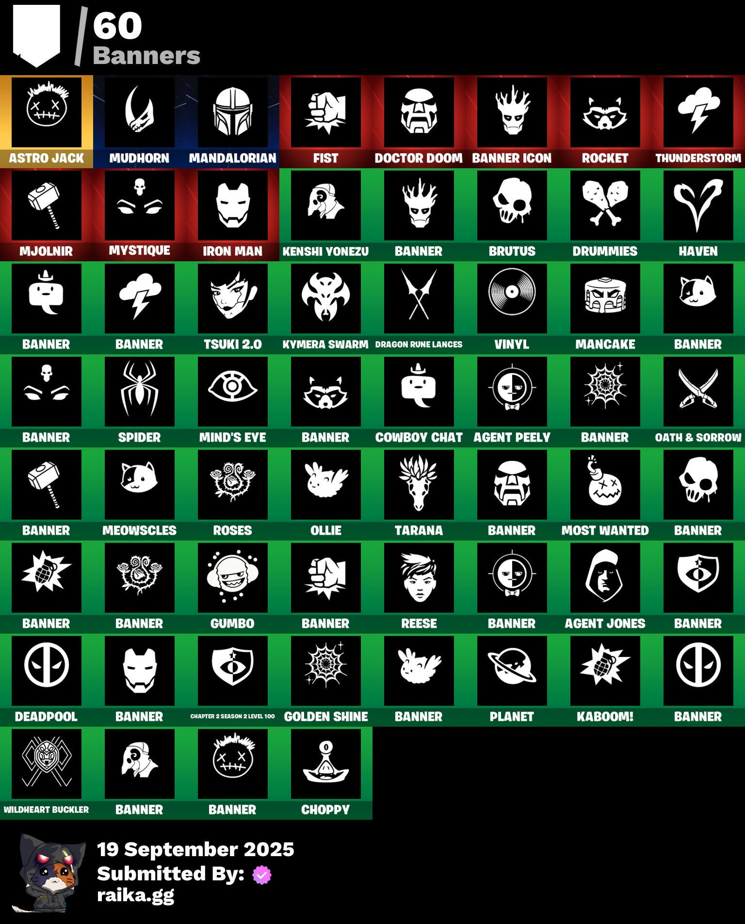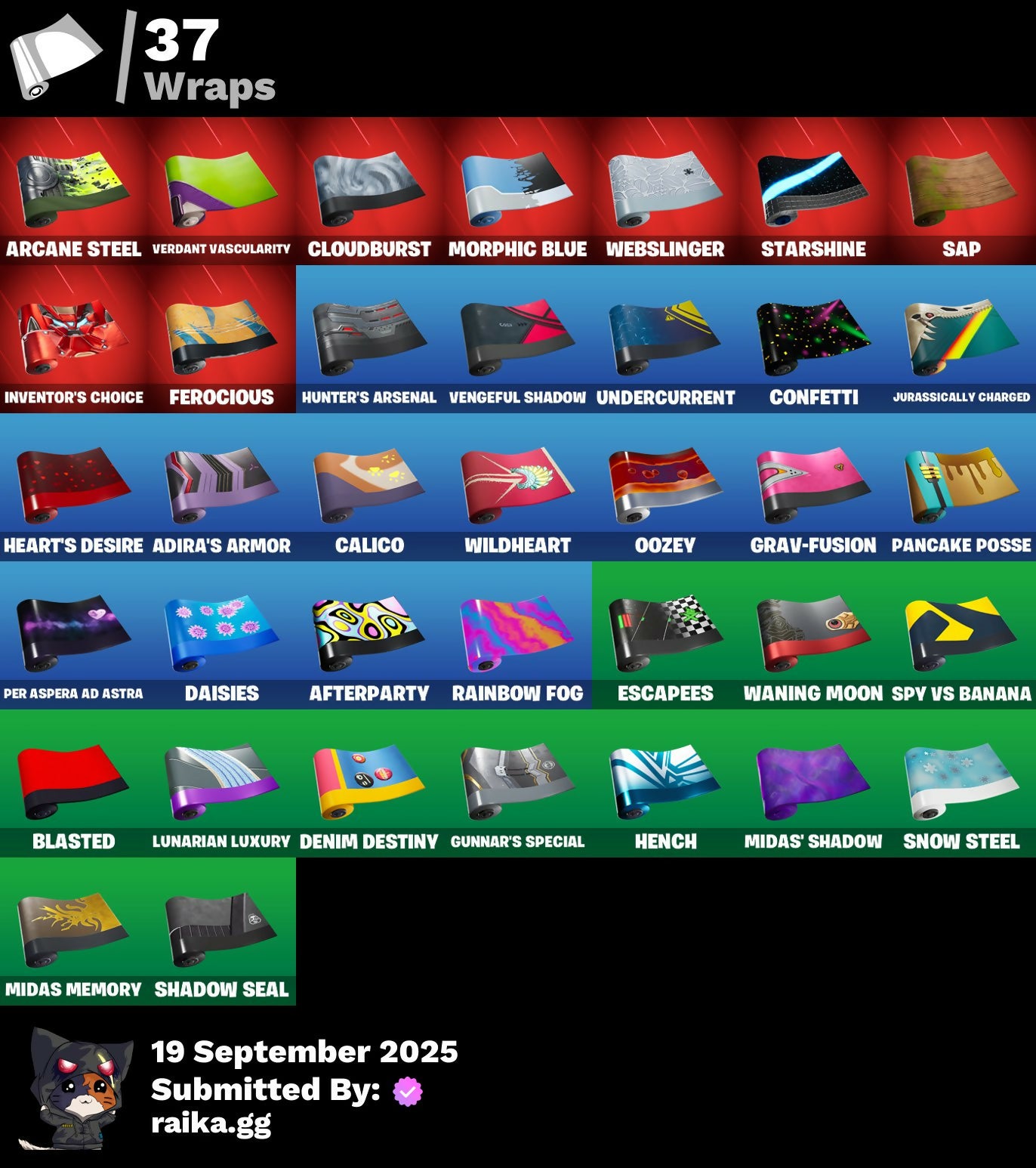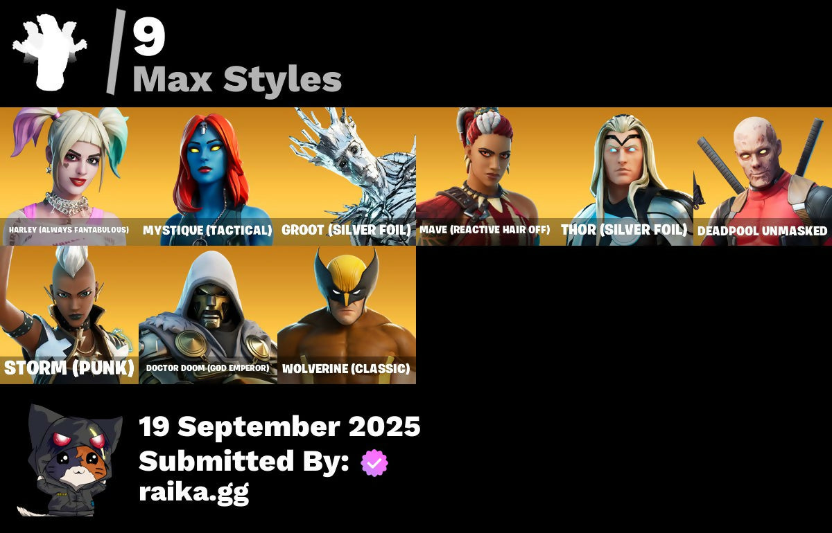 6-Carat Cutter, 7 Rings Smasher, Adira's Armor, Adira's Battle Flag, Adventure Pack, Aerial, Afterparty, Agent Jones, Agent Nana, Agent Peely, Ancestral Bloom, Arcane Energy Glider, Arcane Steel, Ariana Grande, Arroyo Pack, Astro Jack, Astroworld Cyclone, Backstabber, Bag Of Shadows, Banana Bomber, Banana Briefcase, Bananaxe, Banner, Banner Icon, Battle Bloom, Battle Mode, Beachcomber, Beastfang, Beep Beep, Berserker Barrage!, Big Haul, Blade of the Waning Moon, Blasted, Blustery Bag, Bobo, Bombs Away!, Boogie Down, Boomin', Both Eyes Open, Bounty 'Brella, Boxing Glove Arrow, Breakfast Bounty, Breathless Blades, Brutus, Bubloon, Cable, Cable Cloak, Cacodemon, Calico, Call Me, Cash Grab, Chainstick Pack, Chapter 2 Season 2 Level 100, Cheery Chime, Chibi, Chigusa, Chimichanga!, Chomp Cod!!, Choppy, Classified, Clawz Retro, Clean Sweep, Cloudburst, Clutch, Coin Flip, Confetti, Containment Unit, Cosmic Llamacorn, Courageous Mikasa, Cowboy Chat, Crimson Wish, Crowning Achievement, Cuddly Cloudcruiser, Cyclo Curl, D.C. 63, Daisies, Dead Card, Deadpool, Deadpool Unmasked, Deadpool's Katanas, Decaying Dribbler, Deep Dive, Denim Destiny, Designated Hitters, Diamond Diva, Dino Deck, Dive Knives, Doctor Doom, Doctor Doom (God Emperor), Domino, Domino Pack, Don't Start Now, Doom Chalice, Doom's Cowl, Double Header, Double Tags, Dragacorn, Dragon Rune Lances, Dragon Spirit, Dropout, Drummies, Dynamite, Dynamo Grav-Suit, Eagle's Form, Epic Swords of Wonder, Escapees, Everything's Fine, Eye of Agamotto, Feline Fun, Ferocious, Fishbone, Fishstick Janky, Fist, Flapjack Flyer, Flippin' Away, Fortilla Flier, Foundational 'Brella, Fractured World, Frost Squad, Frosty Globes, Galaxia, Gathering Storm, Gear Specialist Maya, Gilded Morphic Blades, Glass Wings, Gold Dagger Pack, Gold Touch, Golden Daggers, Golden Gambit, Golden King, Golden Shine, Grav-Fusion, Green Arrow, Grind, Groot, Groot (Silver Foil), Groot Glow, Groot's Sap Axes, Guard Pup, Guggi Was Here, Gum Brawler, Gumbo, Gunn-Brella, Gunnar's Special, H4CK // P4CK, Hack & Smash, Hammerhead, Hammers of Justice, Hand of Lightning, Harley (Always Fantabulous), Harley Hitter, Harley Quinn, Haven, Heart Sign, Heart's Desire, Heat Vision Hunter, Heist Flier, Hemlock, Hench, Hench Hauler, Hop and a Wink, Hunter's Arsenal, Hunter's Skyblade, Hyperboard, Hypnot-Eyes, I Am Fearless, Ice Wings, Impact Green, In Her Sights, Infinite Bloom, Introducing..., Invasion, Inventor's Choice, Iron Man, Iron Man Backplate, Isabelle, It Is Finished, It's... You?, Jawbreaker, Jennifer Walters, Josie, Jurassically Charged, Kabag!, Kaboom!, Kata-Pack, Keep the Peace, Kenshi Yonezu, Kittanas, Kondor, Kymera Swarm, Kyra, Legendary Blade of Insight, Lexa, Lil' Floaticorn, Llamacorn Express, Lobby Classic, Love It!, Lunarian Luxury, Lunarios, Mancake, Mandalorian, Marigold, Mark 85 Energy Blade, Mark 90 Flight Pack, Mave, Mave (Reactive Hair Off), Meaty Mallets, Mega-Brella, Megumi, Members Only, Meowscles, Mercurial, Merry Fishmas, Midas, Midas Memory, Midas' Shadow, Mighty Marvel 'Brella, Mighty Tree, Mind's Eye, Mjolnir, Mjolnir Strike, Mjolnir's Path, Morales Mark, Morphic Blue, Most Wanted, Mudhorn, Mystique, Mystique (Tactical), Mystique's Skull, Ne'Jari Warhammer, Needle Dropper, Nemesis Box, No Witnesses, Oath & Sorrow, Ollie, Oozey, Pancake Posse, Pandemonium, Paws & Claws, Per Aspera Ad Astra, Piggy Smallz, Planet, Pom Pummellers, Protector, Psylocke, Punchline, Punk Ororo, Rainbow Fog, Raise The Roof, Ravenpool, Ravenpool's Cage, Ravina, Razor Crest, Reese, Repulsor Blast, Ride the Corn!, Rocket, Rocket Blaster, Root Wing, Roses, Salvaged Chute, Sap, Sapling Groot, Say So, Scales Of Justice, Scootin', Seeker, Seven Signet, Shadow Ghost, Shadow Seal, Shadow Stalker, Shanta's Lifebloom, She-Hulk Smash, Shield Surprise, Shine Pack, Shiver, Shooting Starstaff, Shurayuki, Side Hustle, Sing Along, Skellefish, Skye, Slayer's Helm, Smash O'-Lantern, Snow Steel, Snow Strike, Snowbell, Snowmando, So Square, Solid Scratch, Specialist Pickaxe, Spider, Spider Knight, Spider Shield, Spirit's Pact, Springy, Spy Vs Banana, Staff of Doom, Stand Together, Starry Sockets, Starshine, Steel Shadow, Storm, Storm (Punk), Storm Crash, Stormfarer Strike, Stratosphere, Street Blade, Sunny's Lander, Survivorsault, Sweetener Sailshards, Swing Away, TNTina, Tactical Quaxes, Tactical Quiver, Tahna, Take The Cake, Tarana, Tart Tycoon, The Bestiary Chest, The Big Three, The Book Of Spells Vol. 3, The Destroyer's Destroyer, The McG, The Peerless Parasol, The Renegade, The Umbrella, Thor, Thor (Silver Foil), Thor's Cloak, Throwback Axe, Thunderstorm, Tnteeth, Toe Pick, Tony Stark, True Mystique, Tsuki, Tsuki 2.0, Twin Crossfire, Undercurrent, Unity, Utility Claymore, Vautja Wristblades, Vengeful Shadow, Venom Blade, Verdant Vascularity, Verve, Vinyl, Vulcan Salute, WR4ITH, Wade Grenade, Wakandan Salute, Waning Moon, Watchful Wabbit, Webslinger, Whispering Wind, Wild Blast, Wildheart, Wildheart Buckler, Winter Wing, Witch Way, Wolverine, Wolverine (Classic), Wolverine's Trophy, Yellowjacket, Yuki
