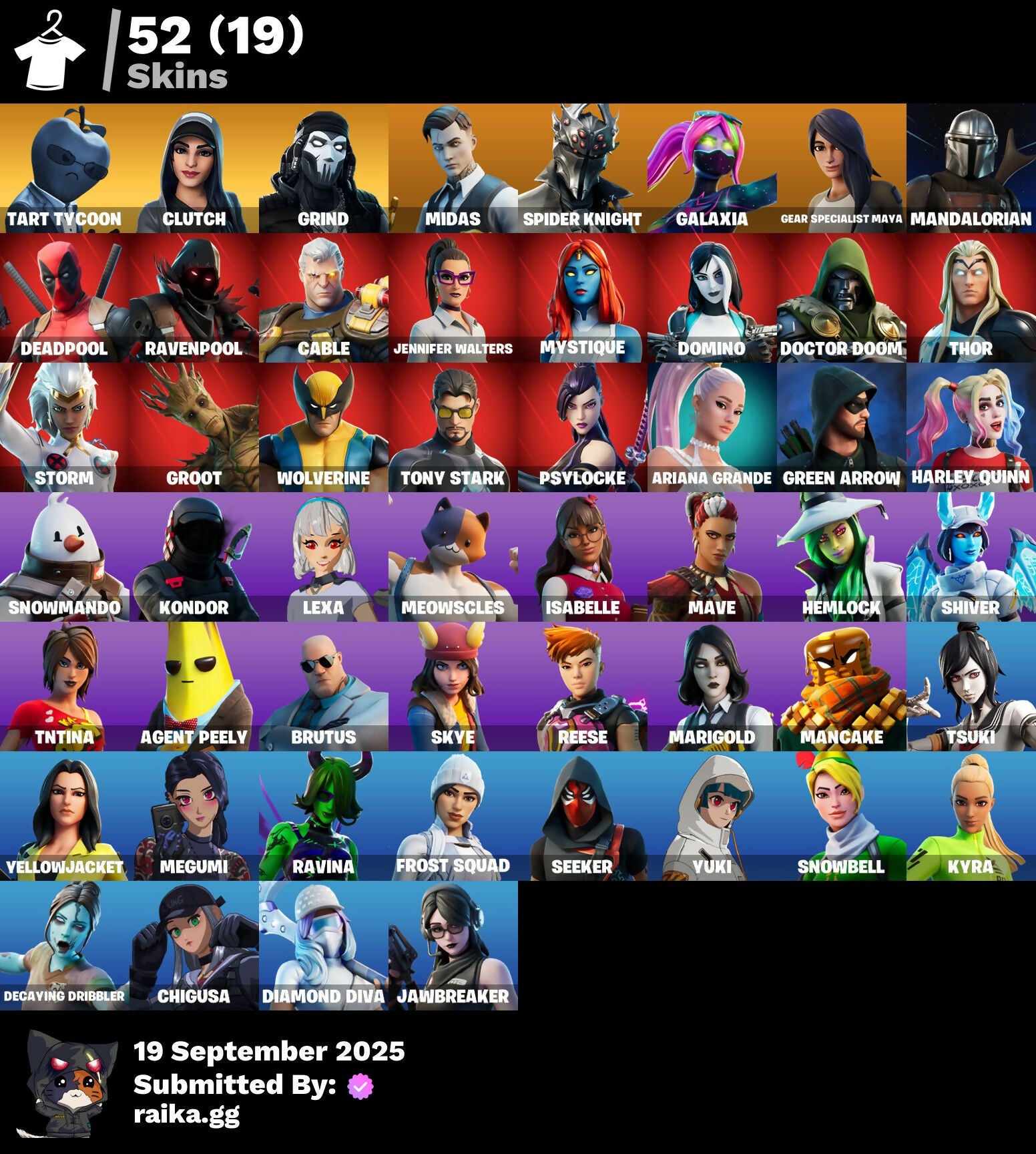 [PC/PSN/XBOX] 52 skins | Tart Tycoon | Clutch | Grind | Midas | Spider Knight | Galaxia | Gear Specialist Maya | Mandalorian | Deadpool | Ravenpool | Cable | 1150 VB / Fortnite