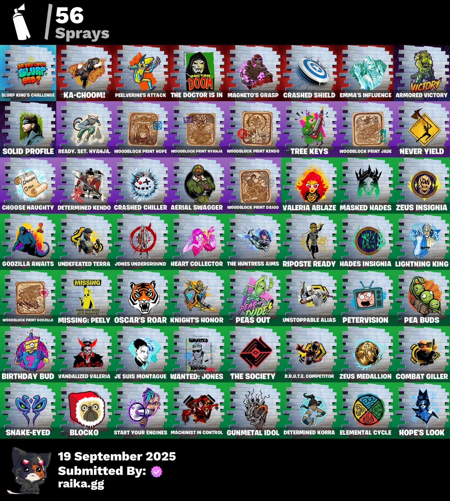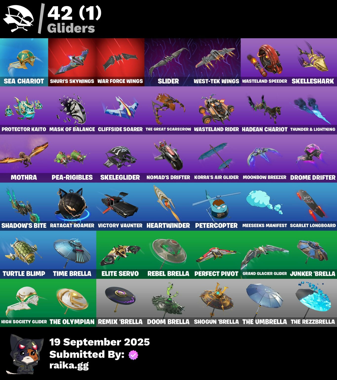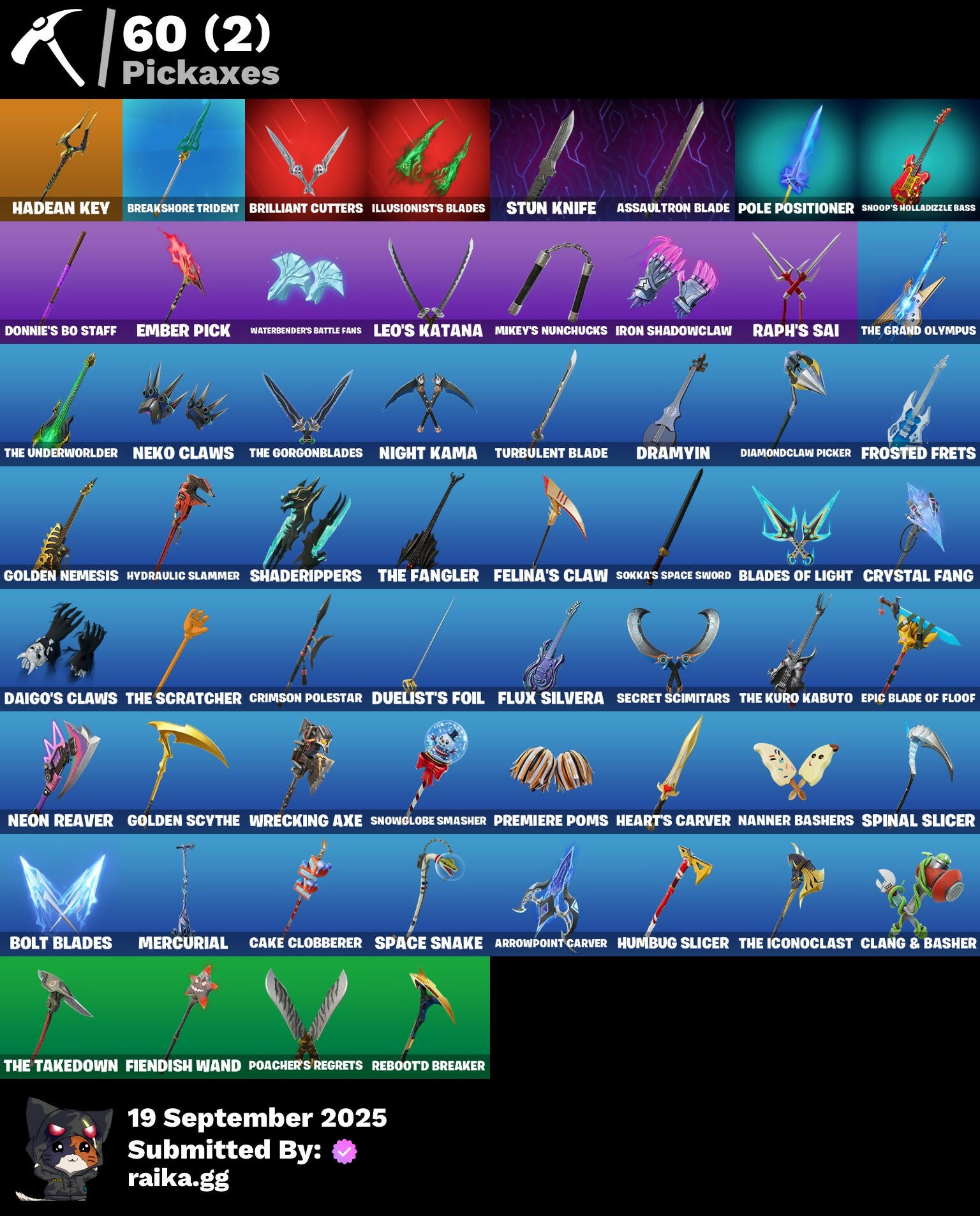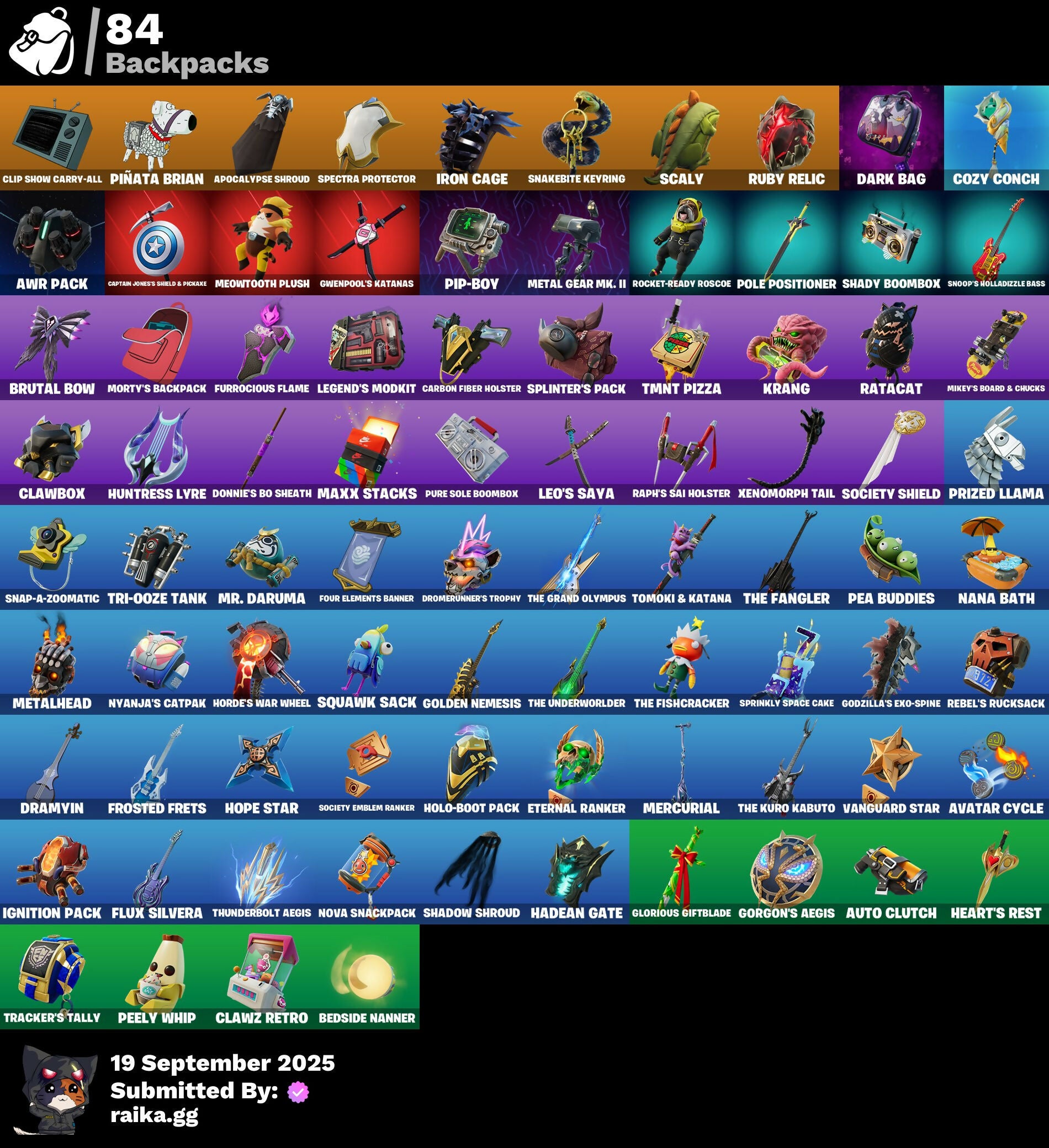 Aerial Classic, Aerial Swagger, Airie, Aphrodite, Apocalypse Shroud, Armored Victory, Arrowpoint Carver, Artemis, Assaultron Blade, Auto Clutch, Avatar Cycle, Avatar's Flourish, Awr Pack, B.R.U.T.E. Competitor, Balanced, Bedside Nanner, Birthday Bud, Blades of Light, Blocko, Bolt Blades, Boogie Down, Breakshore Trident, Brilliant Cutters, Brutal Bow, Budge, Burning Ambition Valeria, Burst Case Scenario, Bushie Bright, Cake Clobberer, Captain Jones's Shield & Pickaxe, Captain Llamerica, Carbon Fiber Holster, Carbon Scarlet, Card Drop, Cauldron Chill, Cerberus, Cerberus Bite, Chaos Directive, Choose Naughty, Clang & Basher, Clawbox, Clawz Retro, Cliffside Soarer, Clip Show Carry-All, Codsworth's Cleanup, Combat Giller, Conch Call, Corrosive Stripe, Cozy Conch, Crashed Chiller, Crashed Shield, Crimson Polestar, Crowning Achievement, Crystal Fang, Daigo, Daigo's Claws, Dark Bag, Dark Bomber, Dawn Duelist Nisha, Determined Kendo, Determined Korra, Diamond Throne, Diamondclaw Picker, Donatello, Donnie's Bo Sheath, Donnie's Bo Staff, Doom Brella, Doze Dab, Dramyin, Drome Drifter, Dromerunner's Trophy, Duelist's Foil, Elemental Cycle, Elite Servo, Elysium, Ember Pick, Emma's Influence, Energized Godzilla, Epic Blade of Floof, Eternal Ranker, Evil Plan, Evolved Heat Ray, Fa-La-La-Fishstick, Fancy Peter Griffin, Fast Flex, Felina, Felina's Claw, Feral Finisher, Fiendish Wand, Fire Show, Flash Of Lightning, Flux Silvera, Foil Flex, Forsaken Eye, Four Elements Banner, Frosted Frets, Furrocious Flame, Get Schwifty, Gilded Heart, Glorious Giftblade, Godzilla Awaits, Godzilla Evolved, Godzilla's Exo-Spine, Golden Nemesis, Golden Scythe, Gorgon's Aegis, Grand Glacier Glider, Guardian Jade, Gunmetal Idol, Gwenpool's Katanas, Gwitterman Jacket, Hadean Chariot, Hadean Gate, Hadean Key, Hades, Hades Insignia, Haute Hustle, Heart Collector, Heart's Carver, Heart's Rest, Heartwinder, High Society Glider, Holiday Boxy, Holo-Boot Pack, Hope, Hope Star, Hope's Look, Horde's War Wheel, Humbug Slicer, Huntress Lyre, Hydraulic Slammer, I'm A Mystery, Ignition Pack, Illusion Master, Illusionist's Blades, Immortal Form, Infinite Swirl, Invisible Cut, Iron Cage, Iron Shadowclaw, Jade, Je Suis Montague, Jet Signals, Jones Underground, Jumbo Popcorn, Junker 'Brella, Justice Reigns, Ka-Choom!, Kendo, Knife Sharpener, Knight's Honor, Korra, Korra's Air Glider, Krang, LBC Signature, Legend's Modkit, Legend's Retribution, Leo's Katana, Leo's Saya, Leonardo, Lethe, Lewis Hamilton, Lightning King, Lil' Godzilla Attack, Look At Me!, Machinist In Control, Maelstrom, Magmatic Poseidon, Magneto's Grasp, Make A Seat, Mask of Balance, Masked Hades, Maxx Stacks, Maxxed Out Max, Mecha Morty, Medusa, Meeseeks Manifest, Meowtooth Plush, Mercurial, Metal Gear Mk. II, Metalhead, Michelangelo, Mikev's Nunchucks, Mikey's Board & Chucks, Missing: Peely, Modern Ronin, Montague, Moonbow Breezer, Moonlit Mystery, Morty's Backpack, Mothra, Mr. Daruma, Murktide, My Cabbages!, Nana Bath, Nanner Bashers, Neko Claws, Nekomata Drip, Neon Reaver, Never Yield, Night Kama, Ninja Stance: Donnie, Ninja Stance: Leo, Ninja Stance: Mikey, Ninja Stance: Raph, Nisha, Nomad's Drifter, Nova Snackpack, Nyanja, Nyanja's Catpak, Old Snake, Ooze, Organic Diamond, Oscar, Oscar's Roar, Pea Buddies, Pea Buds, Pea Part Harmony, Pea-Rigibles, Peabody, Peas Out, Peelverine's Attack, Peely Whip, Perfect Pivot, Peter Griffin, Peter Griffin Speed Bag, Petercopter, Petervision, Phantom Meowscles, Pip Bling, Pip-Boy, Pizza Party, Piñata Brian, Plastic Patroller, Poacher's Regrets, Pole Positioner, Pool Cubes, Popular Vibe, Poseidon, Premiere Poms, Prized Llama, Protector Kaito, Pure Sole Boombox, Rabbit Ears, Radiant 1, Rage Quit, Raider's Return, Raph's Sai, Raph's Sai Holster, Raphael, Ratacat, Ratacat Roamer, Raven, Raven Team Leader, Ready. Set. Nyanja., Rebel Brella, Rebel's Rucksack, Reboot'd, Reboot'd Breaker, Remix 'Brella, Rex, Ringmaster Scarr, Riposte Ready, Rocket-Ready Roscoe, Rough Cut Montague, Ruby Relic, Runway Racer, Rust, Scaly, Scarlet Longboard, Sea Chariot, Secret Scimitars, Serpent's Eye, Serpentine Summoning, Shadebox, Shaderippers, Shadow Blade Hope, Shadow Of Hope, Shadow Shroud, Shadow's Bite, Shadowgold, Shady Boombox, Shamisen-Sational, Share The Wealth, Shock Brawler Oscar, Shogun 'Brella, Shuri's Skywings, Skeleglider, Skelleshark, Slap Juice., Slider, Slim Shady, Slurp Co., Slurp King's Challenge, Snake Skin, Snake-Eyed, Snakebite Keyring, Snap-A-Zoomatic, Snoop's Holladizzle Bass, Snowglobe Smasher, Society Emblem Ranker, Society Shield, Sokka's Space Sword, Solid Profile, Solid Snake, Sophisticat, Space Snake, Spectra Protector, Spectrakinetic, Spinal Slicer, Spirit Strider, Splinter, Splinter's Pack, Sprinkly Space Cake, Squawk Sack, Starlit, Start Your Engines, Stun Knife, Stygian Burn, Stygian Flame, Sunrise Duel, Sunspot, Surfin' Bird, Sweet Swing, T-60 Power Armor, TMNT Pizza, Tactical Guff, Take A 'Bow, Tempest Flight, The Break Shot, The Burn, The Doctor Is In, The Fangler, The Fishcracker, The Flame, The Gorgonblades, The Grand Olympus, The Great Scarecrow, The Huntress Aims, The Iconoclast, The Kuro Kabuto, The Machinist, The Olympian, The Rezzbrella, The Scratcher, The Society, The Takedown, The Umbrella, The Underworlder, Thunder & Lightning, Thunder Clap, Thunderbolt Aegis, Time Brella, Tomoki & Katana, Tracker's Tally, Tree Keys, Tri-Ooze Tank, Turbulent Blade, Turtle Blimp, Unbreakable, Undefeated Terra, Underground Jones, Unstoppable Alias, Valeria, Valeria Ablaze, Vandalized Valeria, Vanguard Star, Vengeance Jones, Victory Brawl, Victory Vaunter, Vulejackets Blaster, Wanted: Jones, War Force Wings, Wasteland Brite, Wasteland Rider, Wasteland Rock, Wasteland Speeder, Water Levels, Water Tribe Colors, Waterbender's Battle Fans, West-Tek Wings, Windmill Stomp, Winterfest Bushranger, Winterfest Flurry, Woodblock Print Daigo, Woodblock Print Godzilla, Woodblock Print Hope, Woodblock Print Jade, Woodblock Print Kendo, Woodblock Pri