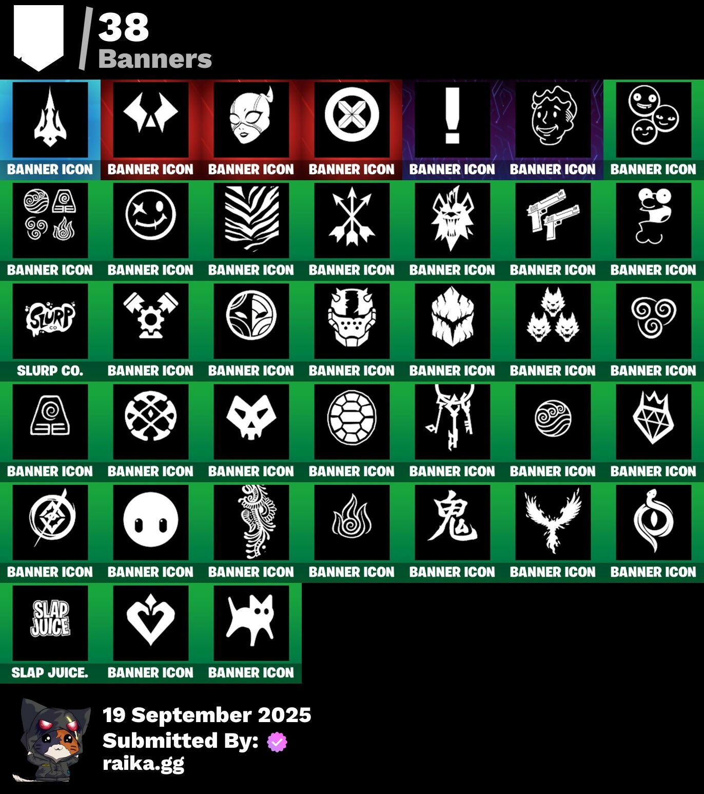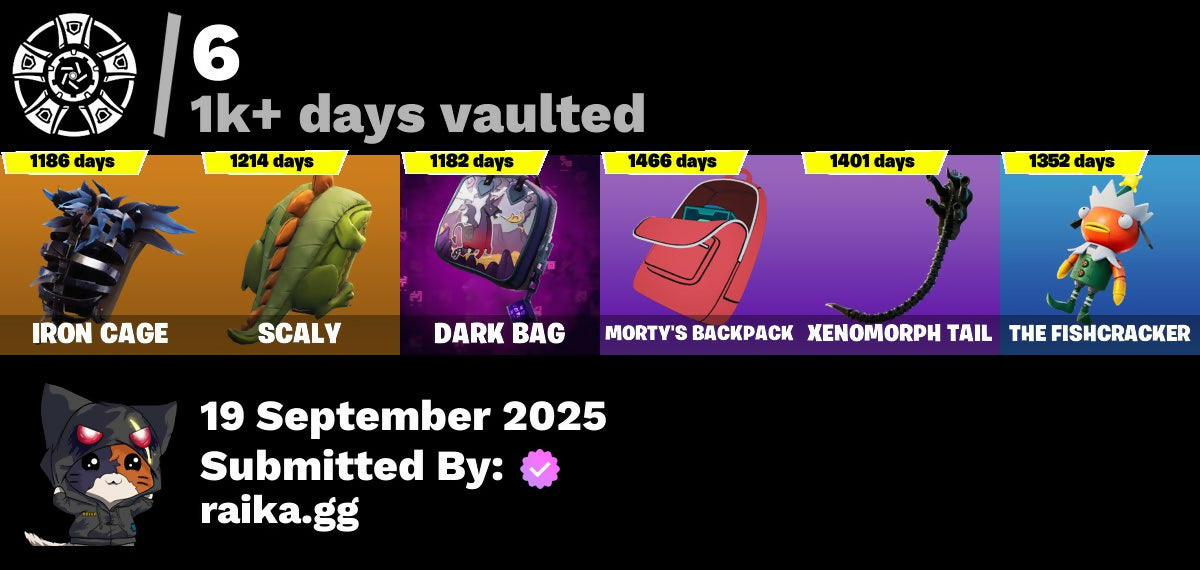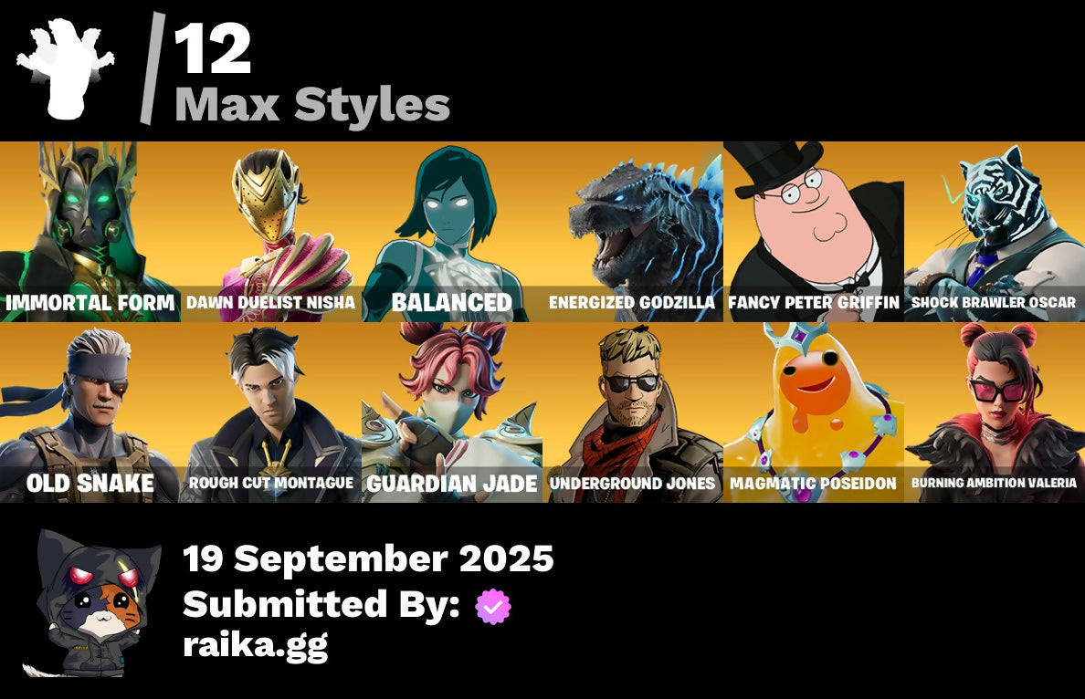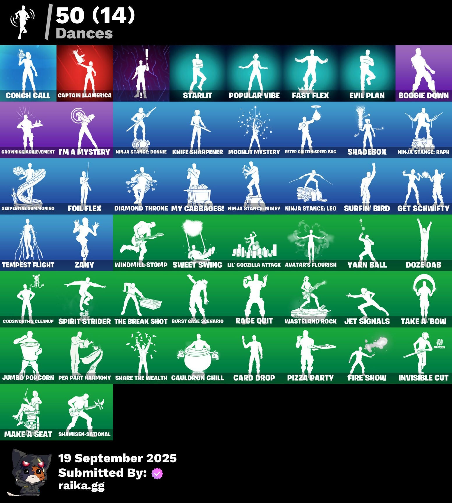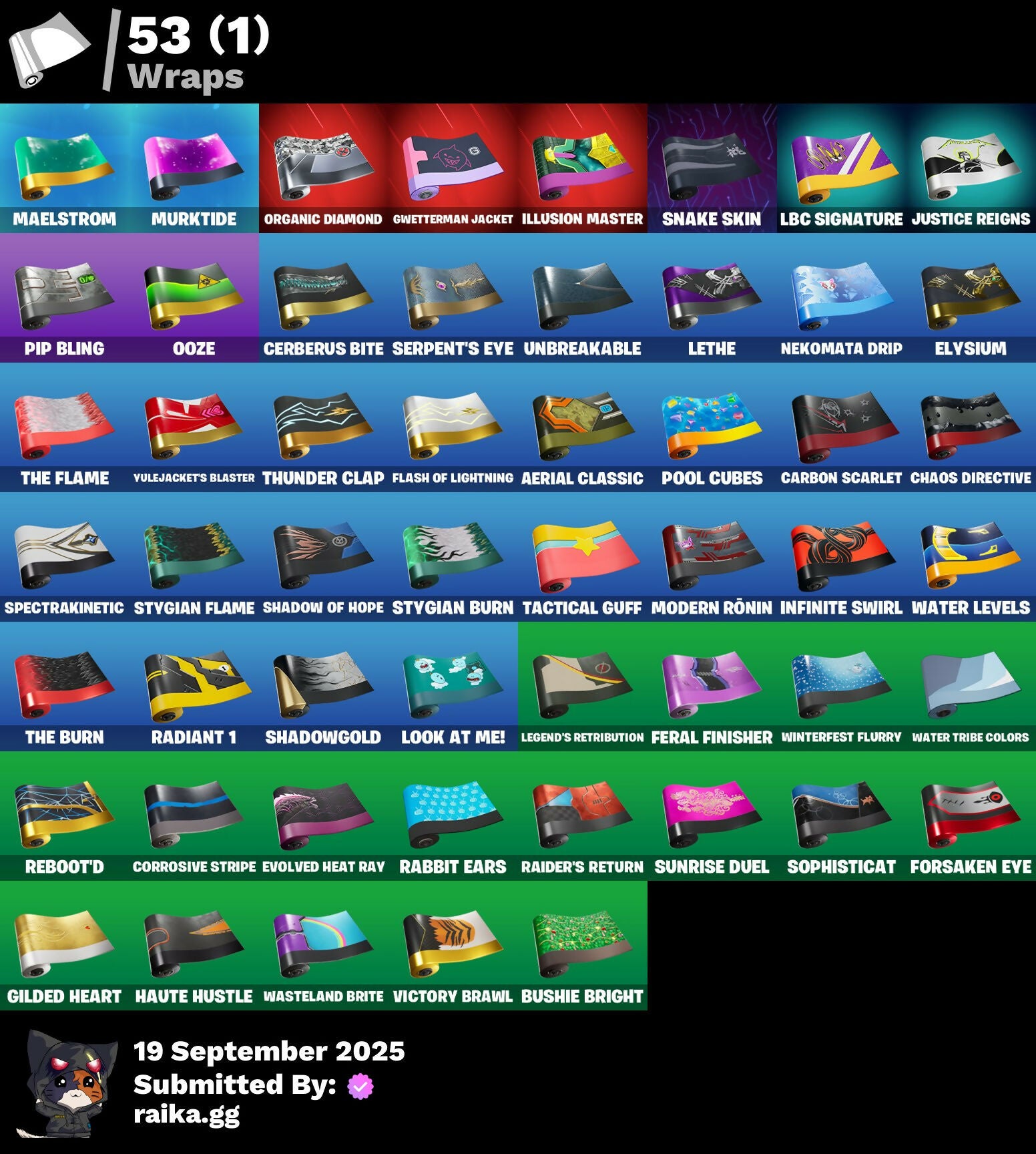 Aerial Classic, Aerial Swagger, Airie, Aphrodite, Apocalypse Shroud, Armored Victory, Arrowpoint Carver, Artemis, Assaultron Blade, Auto Clutch, Avatar Cycle, Avatar's Flourish, Awr Pack, B.R.U.T.E. Competitor, Balanced, Bedside Nanner, Birthday Bud, Blades of Light, Blocko, Bolt Blades, Boogie Down, Breakshore Trident, Brilliant Cutters, Brutal Bow, Budge, Burning Ambition Valeria, Burst Case Scenario, Bushie Bright, Cake Clobberer, Captain Jones's Shield & Pickaxe, Captain Llamerica, Carbon Fiber Holster, Carbon Scarlet, Card Drop, Cauldron Chill, Cerberus, Cerberus Bite, Chaos Directive, Choose Naughty, Clang & Basher, Clawbox, Clawz Retro, Cliffside Soarer, Clip Show Carry-All, Codsworth's Cleanup, Combat Giller, Conch Call, Corrosive Stripe, Cozy Conch, Crashed Chiller, Crashed Shield, Crimson Polestar, Crowning Achievement, Crystal Fang, Daigo, Daigo's Claws, Dark Bag, Dark Bomber, Dawn Duelist Nisha, Determined Kendo, Determined Korra, Diamond Throne, Diamondclaw Picker, Donatello, Donnie's Bo Sheath, Donnie's Bo Staff, Doom Brella, Doze Dab, Dramyin, Drome Drifter, Dromerunner's Trophy, Duelist's Foil, Elemental Cycle, Elite Servo, Elysium, Ember Pick, Emma's Influence, Energized Godzilla, Epic Blade of Floof, Eternal Ranker, Evil Plan, Evolved Heat Ray, Fa-La-La-Fishstick, Fancy Peter Griffin, Fast Flex, Felina, Felina's Claw, Feral Finisher, Fiendish Wand, Fire Show, Flash Of Lightning, Flux Silvera, Foil Flex, Forsaken Eye, Four Elements Banner, Frosted Frets, Furrocious Flame, Get Schwifty, Gilded Heart, Glorious Giftblade, Godzilla Awaits, Godzilla Evolved, Godzilla's Exo-Spine, Golden Nemesis, Golden Scythe, Gorgon's Aegis, Grand Glacier Glider, Guardian Jade, Gunmetal Idol, Gwenpool's Katanas, Gwitterman Jacket, Hadean Chariot, Hadean Gate, Hadean Key, Hades, Hades Insignia, Haute Hustle, Heart Collector, Heart's Carver, Heart's Rest, Heartwinder, High Society Glider, Holiday Boxy, Holo-Boot Pack, Hope, Hope Star, Hope's Look, Horde's War Wheel, Humbug Slicer, Huntress Lyre, Hydraulic Slammer, I'm A Mystery, Ignition Pack, Illusion Master, Illusionist's Blades, Immortal Form, Infinite Swirl, Invisible Cut, Iron Cage, Iron Shadowclaw, Jade, Je Suis Montague, Jet Signals, Jones Underground, Jumbo Popcorn, Junker 'Brella, Justice Reigns, Ka-Choom!, Kendo, Knife Sharpener, Knight's Honor, Korra, Korra's Air Glider, Krang, LBC Signature, Legend's Modkit, Legend's Retribution, Leo's Katana, Leo's Saya, Leonardo, Lethe, Lewis Hamilton, Lightning King, Lil' Godzilla Attack, Look At Me!, Machinist In Control, Maelstrom, Magmatic Poseidon, Magneto's Grasp, Make A Seat, Mask of Balance, Masked Hades, Maxx Stacks, Maxxed Out Max, Mecha Morty, Medusa, Meeseeks Manifest, Meowtooth Plush, Mercurial, Metal Gear Mk. II, Metalhead, Michelangelo, Mikev's Nunchucks, Mikey's Board & Chucks, Missing: Peely, Modern Ronin, Montague, Moonbow Breezer, Moonlit Mystery, Morty's Backpack, Mothra, Mr. Daruma, Murktide, My Cabbages!, Nana Bath, Nanner Bashers, Neko Claws, Nekomata Drip, Neon Reaver, Never Yield, Night Kama, Ninja Stance: Donnie, Ninja Stance: Leo, Ninja Stance: Mikey, Ninja Stance: Raph, Nisha, Nomad's Drifter, Nova Snackpack, Nyanja, Nyanja's Catpak, Old Snake, Ooze, Organic Diamond, Oscar, Oscar's Roar, Pea Buddies, Pea Buds, Pea Part Harmony, Pea-Rigibles, Peabody, Peas Out, Peelverine's Attack, Peely Whip, Perfect Pivot, Peter Griffin, Peter Griffin Speed Bag, Petercopter, Petervision, Phantom Meowscles, Pip Bling, Pip-Boy, Pizza Party, Piñata Brian, Plastic Patroller, Poacher's Regrets, Pole Positioner, Pool Cubes, Popular Vibe, Poseidon, Premiere Poms, Prized Llama, Protector Kaito, Pure Sole Boombox, Rabbit Ears, Radiant 1, Rage Quit, Raider's Return, Raph's Sai, Raph's Sai Holster, Raphael, Ratacat, Ratacat Roamer, Raven, Raven Team Leader, Ready. Set. Nyanja., Rebel Brella, Rebel's Rucksack, Reboot'd, Reboot'd Breaker, Remix 'Brella, Rex, Ringmaster Scarr, Riposte Ready, Rocket-Ready Roscoe, Rough Cut Montague, Ruby Relic, Runway Racer, Rust, Scaly, Scarlet Longboard, Sea Chariot, Secret Scimitars, Serpent's Eye, Serpentine Summoning, Shadebox, Shaderippers, Shadow Blade Hope, Shadow Of Hope, Shadow Shroud, Shadow's Bite, Shadowgold, Shady Boombox, Shamisen-Sational, Share The Wealth, Shock Brawler Oscar, Shogun 'Brella, Shuri's Skywings, Skeleglider, Skelleshark, Slap Juice., Slider, Slim Shady, Slurp Co., Slurp King's Challenge, Snake Skin, Snake-Eyed, Snakebite Keyring, Snap-A-Zoomatic, Snoop's Holladizzle Bass, Snowglobe Smasher, Society Emblem Ranker, Society Shield, Sokka's Space Sword, Solid Profile, Solid Snake, Sophisticat, Space Snake, Spectra Protector, Spectrakinetic, Spinal Slicer, Spirit Strider, Splinter, Splinter's Pack, Sprinkly Space Cake, Squawk Sack, Starlit, Start Your Engines, Stun Knife, Stygian Burn, Stygian Flame, Sunrise Duel, Sunspot, Surfin' Bird, Sweet Swing, T-60 Power Armor, TMNT Pizza, Tactical Guff, Take A 'Bow, Tempest Flight, The Break Shot, The Burn, The Doctor Is In, The Fangler, The Fishcracker, The Flame, The Gorgonblades, The Grand Olympus, The Great Scarecrow, The Huntress Aims, The Iconoclast, The Kuro Kabuto, The Machinist, The Olympian, The Rezzbrella, The Scratcher, The Society, The Takedown, The Umbrella, The Underworlder, Thunder & Lightning, Thunder Clap, Thunderbolt Aegis, Time Brella, Tomoki & Katana, Tracker's Tally, Tree Keys, Tri-Ooze Tank, Turbulent Blade, Turtle Blimp, Unbreakable, Undefeated Terra, Underground Jones, Unstoppable Alias, Valeria, Valeria Ablaze, Vandalized Valeria, Vanguard Star, Vengeance Jones, Victory Brawl, Victory Vaunter, Vulejackets Blaster, Wanted: Jones, War Force Wings, Wasteland Brite, Wasteland Rider, Wasteland Rock, Wasteland Speeder, Water Levels, Water Tribe Colors, Waterbender's Battle Fans, West-Tek Wings, Windmill Stomp, Winterfest Bushranger, Winterfest Flurry, Woodblock Print Daigo, Woodblock Print Godzilla, Woodblock Print Hope, Woodblock Print Jade, Woodblock Print Kendo, Woodblock Pri