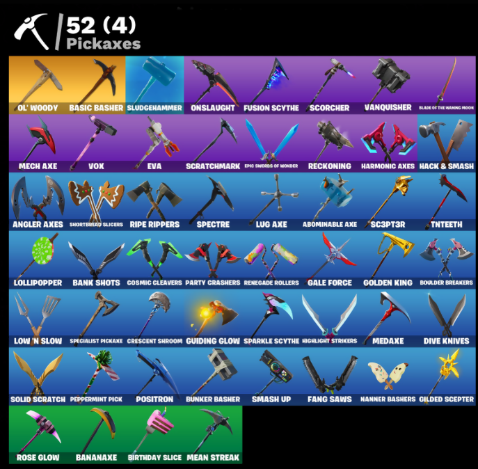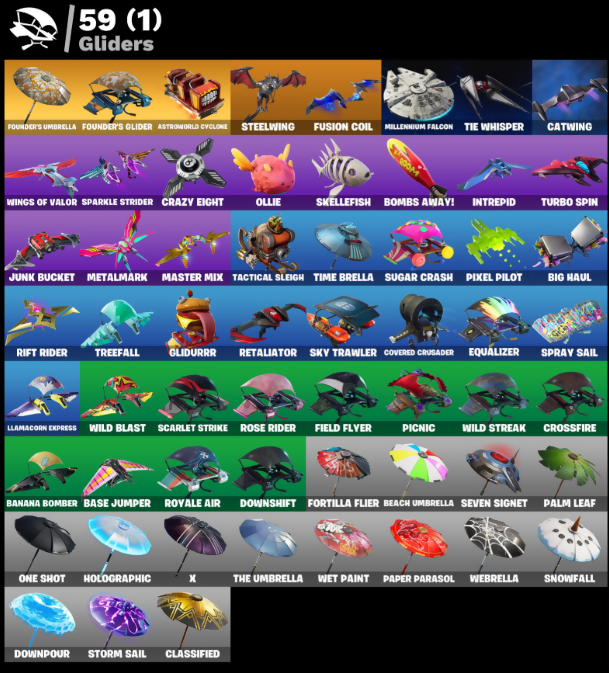 8-Ball Vs Scratch, Abominable Axe, Adventure Pack, Agent Peely, Altitude, Ancestral Bloom, Angler Axes, Antidote, Arroyo Pack, Astroworld Cyclone, Atmosphere, Back Board, Ball Bling, Banana Bomber, Banana Briefcase, Bananaxe, Bank Shots, Base Jumper, Basecamp Bag, Basic Basher, Battlehawk, Beach Umbrella, Beachcomber, Beep Beep, Big Fan, Big Haul, Birthday Slice, Blade Bag, Blade Of The Waning Moon, Blowing Bubbles, Bogey Bag, Boing!, Bombs Away!, Boneless, Boogie Down, Boulder Breakers, Breakneck, Brush Your Shoulders, Bunker Basher, Bunker Jonesy, Calamity, Call Me, Cameo Vs Chic, Carbide, Cat Flip, Catalyst, Catwing, Classified, Clawz Retro, Clean Sweep, Cluck Strut, Coin Flip, Cosmic Cleavers, Covered Crusader, Crazy Eight, Crescent Shroom, Crossfire, Dabstand, Deadpool, Deadpool's Katanas, Deep Dive, Deep End, Demi, Dip, Dive Knives, Dj Yonder, Downpour, Downshift, Dragoncrest, Droop, Epic Swords Of Wonder, Equalizer, Eternal Voyager, Eva, Fabled Cape, Fang Saws, Featherweight, Feline Fun, Field Flyer, Flippin' Away, Fortilla Flier, Founder's Glider, Founder's Umbrella, Fusion, Fusion Coil, Fusion Orb, Fusion Scythe, Gale Force, Gear Specialist Maya, Gentleman's Dab, Giddy-Up, Gilded Scepter, Glidurr, Go Bag, Gold Brutus, Gold Dagger Pack, Gold Meowscles, Gold Midas, Gold Token, Golden King, Golf Clap, Goodie Bag, Groove Jam, Guiding Glow, Hack & Smash, Hand Signals, Harmonic Axes, Have A Seat, Heart Sign, Heartburst, Hello Friend, Hench Hauler, High Five, Highlight Strikers, Holographic, Hot Marat, Hot Wings, Hula Hoopin', Hype, I Declare!, Infinite Dab, Intrepid, Jaywalking, Journey Vs Hazard, Jubilation, Jump Jets, Junk Bucket, Kabag!, Laid Back, Laugh It Up, Leapin', Llamacorn Express, Lollipopper, Love It!, Low 'N Slow, Lt. Evergreen, Lug Axe, Lynx, Make It Rain, Master Mix, Mean Streak, Mech Axe, Medaxe, Metalmark, Microdrop, Millennium Falcon, Nana Cape, Nanner Bashers, Neon Wings, Ol' Woody, Ollie, Omega, One Shot, Onslaught, Orange Justice, Paint Pack, Palm Leaf, Pandemonium, Paper Parasol, Party Crashers, Paws & Claws, Peace Out, Peely Whip, Peppermint Pick, Perfect Present, Picnic, Pixel Pilot, Popcorn, Positron, Powder, Precision, Pursuit, Quack Pack, Rage, Rage Quit, Rambunctious, Re-Gifter, Ready Ruck, Reckoning, Regal Wave, Remedy Vs Toxin, Renegade Rollers, Respect, Respect The Peace, Retaliator, Retribution, Ride The Pony, Rift Rider, Ripe Rippers, Rippley Vs Sludge, Rock Paper Scissors, Rogue Agent, Rose Glow, Rose Rider, Rose Team Leader, Rox, Royale Air, Running Man, Rust Bucket, Sad Trombone, Salute, Sc3pt3r, Scarlet Strike, Scorcher, Scratchmark, Sentinel, Seven Signet, Sgt. Winter, Sharpshooter, Shimmer, Shortbread Slicers, Side Hustle, Sign Spinner, Skellefish, Skirmish, Sky Trawler, Skye, Sludgehammer, Smash Up, Smoothie, Snow Shaker, Snowfall, So Square, Solid Scratch, Sorana, Sparkle Scythe, Sparkle Strider, Sparkle Supreme, Special Forces, Specialist Pickaxe, Spectra Protector, Spectre, Spiked Satchel, Spray Sail, Springy, Squad Leader, Standard Issue, Star Shot, Star Surge, Starcrest Shift, Steamed, Steelwing, Storm Sail, Stratus, Stride, Sugar Crash, Swag Bag, Tackle Box, Tactical Sleigh, Take A Bow, Take The Elf, Team Tomato, Teknique, The Ace, The Bestiary Chest, The Dip, The Scientist, The Sith, The Umbrella, Tie Whisper, Tilted Teknique, Time Brella, TnTeeth, Tntina, Tra La La, Trail Tote, Treefall, Trooper, Trophy Sack, Turbo Spin, Turk Vs Riptide, Ultima Knight, Uplink, Vah!, Valor, Vanquisher, Vega, Vendetta, Vond3r, Vox, Warpaint, Waveform, Wavy T, Webrella, Wet Paint, Wiggle, Wild Blast, Wild Streak, Wingman, Wings Of Valor, Wooly Warrior, X, X-Lord, Zenith, Zoey