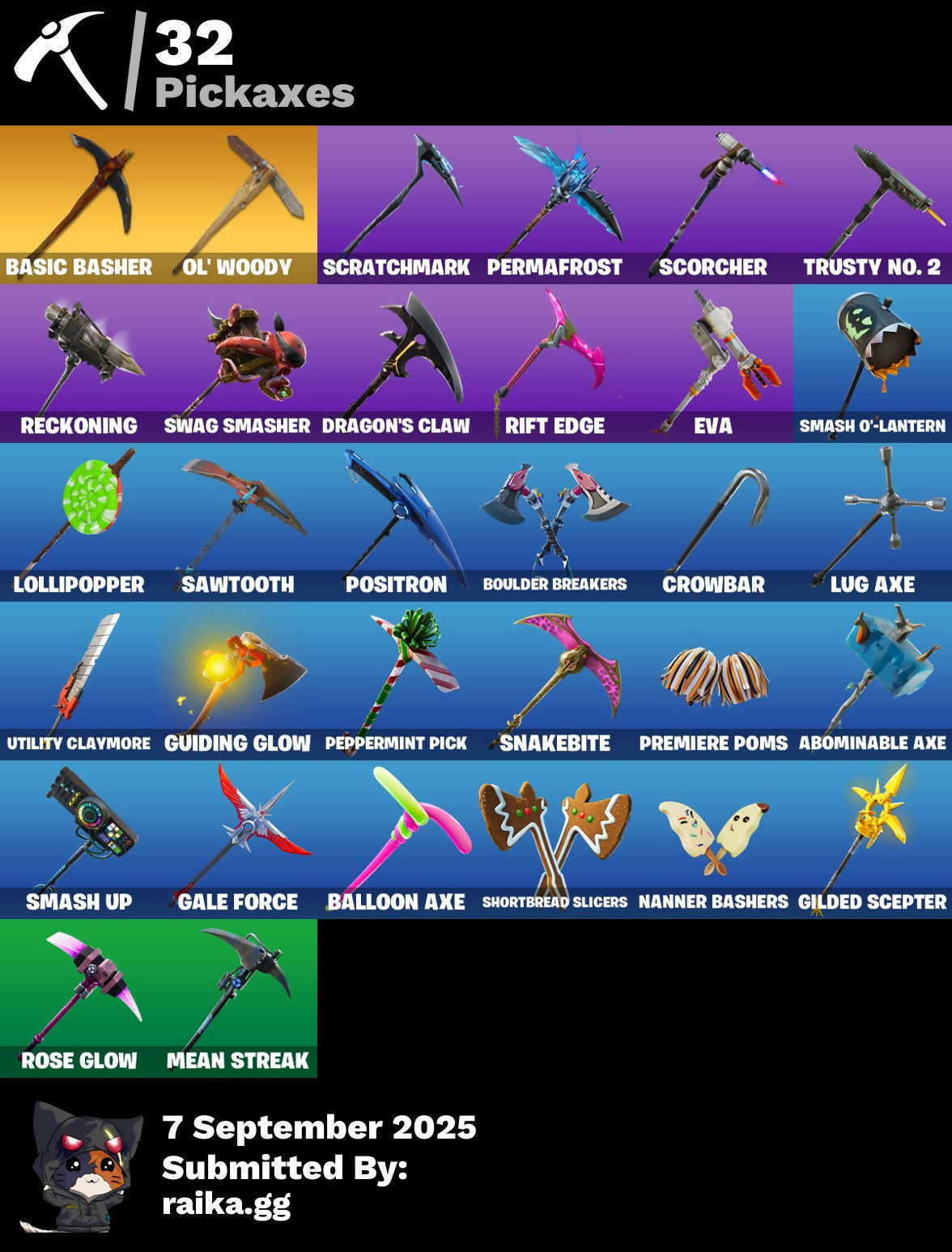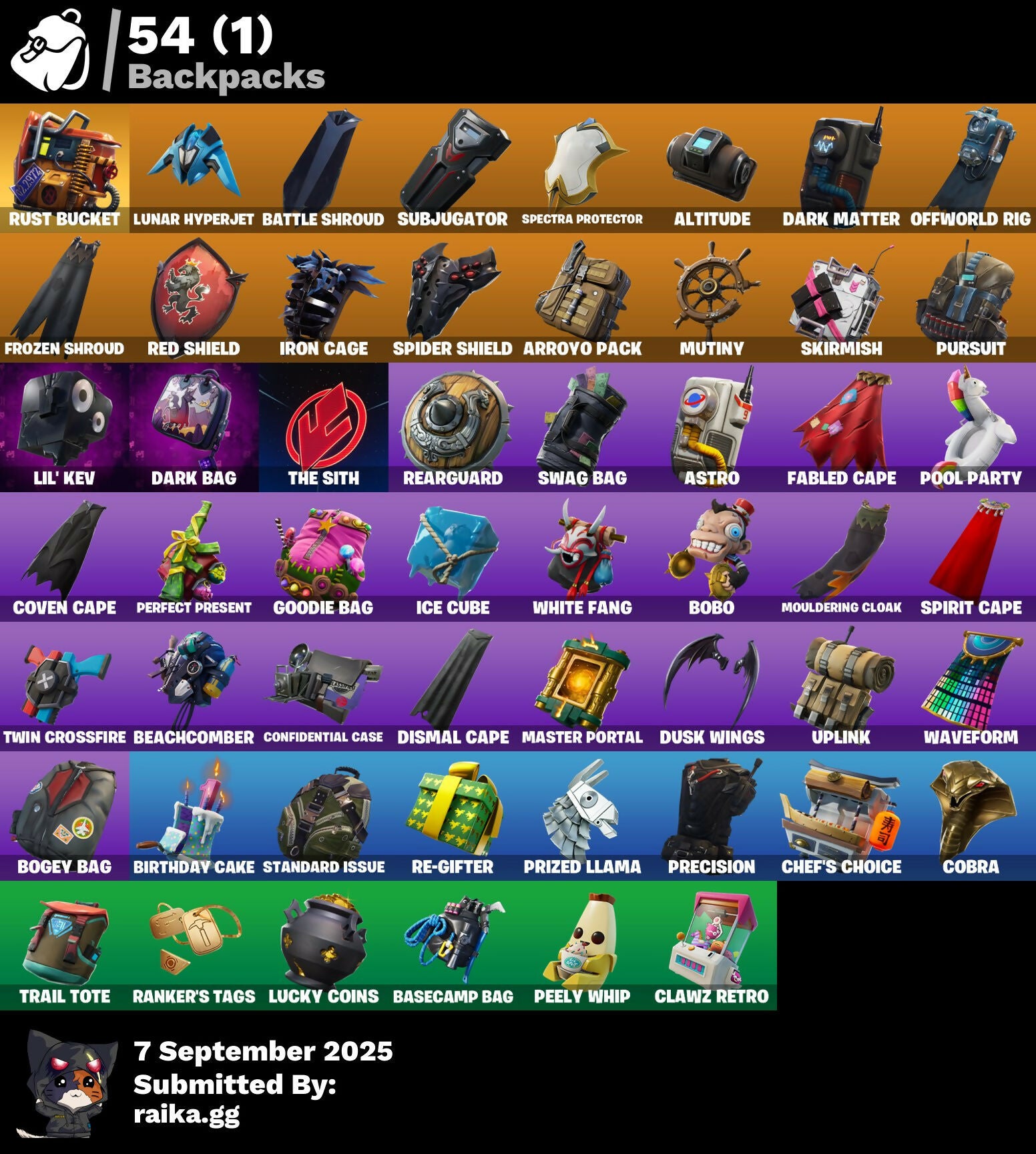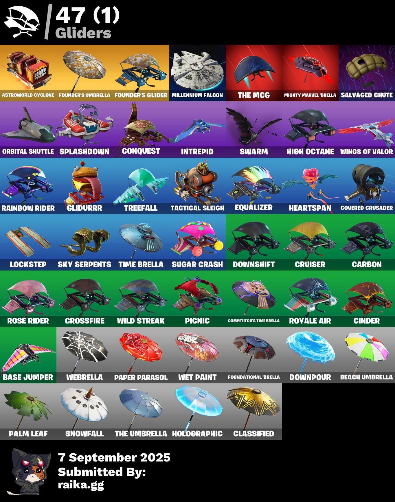 A.L.T.E.R., Abominable Axe, Abstract, Agent Jones, Altitude, Arctic Camo, Arrow, Arroyo Pack, Astro, Astroworld Cyclone, Bag Of Coal, Balloon Axe, Bananas, Banner, Banner Icon, Base Jumper, Basecamp Bag, Basic Basher, Bat, Battle Bus, Battle Call, Battle Shroud, Battlehawk, Beach Umbrella, Beachcomber, Bee, Best Mates, Birthday Cake, Blackheart, Blackheart (Stage 8), Blasted, Bobo, Bogey Bag, Boogie, Boogie Down, Both Eyes Open, Boulder Breakers, Bow, Breakdown, Burning Dragon, Cactus Maze, Calamity, Calamity Stage 5, Calculated, Call Me, Camera, Campfire, Candy Cane, Carbide, Carbon, Carbon & Gold, Carbon Fiber, Cash Grab, Cat Flip, Chains, Chalk Outline, Chef's Choice, Chick, Cinder, Circle, Classified, Clawz Retro, Clean Sweep, Cobra, Coconuts, Comet, Competitor's Time Brella, Confidential Case, Conga, Conquest, Constructor, Coven Cape, Covered Crusader, Cowboy Chat, Crab, Crazy Castle, Crossfire, Crowbar, Cruiser, Cuddle Hearts, Cuddle Team Hula, Cuddly Bear, DJ Yonder, Dance Mat, Dante, Dark Bag, Dark Bomber, Dark Matter, Dark Voyager, Dice, Dinosaur, Dinosaur Skull, Dire, Disco, Dismal Cape, Do It!, Dog Bowl, Dog Collar, Dolphin, Downpour, Downshift, Doze Dab, Dragon Stance, Dragon's Claw, Drift, Drift Stage 5, Driftwood, Duck, Durrr, Durrr Burger, Dusk, Dusk Wings, E.G.O., Eagle, Egg, Elite Agent, Enforcer, Equalizer, Eva, Fable, Fabled Cape, Fake Door, Falcon, Fence, Festive Paper, First Order Banner, Fish Hook, Flail, Flippin' Away, Floating Island, Flowy Hat, Fly, Foundational 'Brella, Founder's Glider, Founder's Umbrella, Fox Clan Mask, Frozen Shroud, Fryangles, Gale Force, Game Over, Gentleman's Dab, Get Funky, Gg Ornament, Gg Potion, Gg Smiley, Gg Snakes, Gg Snowman, Giddy-Up, Gilded Scepter, Glidurrr, Golf Ball, Golf Clap, Good Vibes, Goodie Bag, Greed, Gremlins, Groove Jam, Grumpy Tree, Guiding Glow, Gumshoe, Ham, Hand Horns, Happy Birthday!, Happy Cloud, Hearts, Heartspan, Hello Friend, Hero Emblem, High Octane, Hollowhead, Holographic, Hootenanny, Hot & Cold, Hot Marat, Howl, Huntress, Hybrid, Hybrid (Stage 4), Hype, Ice Cream Truck, Ice Cube, Indigo Ice, Infinity Blade, Intrepid, Iron Cage, It's Go Time!, Jedi Order, Jellyfish, Jolly Roger, Jurassically Charged, Keep It Mello, Kiss, Kitsune, Knight's Honor, Laser Chomp, Lightning, Lil' Kev, Llama De Muertos, Lobby Classic, Lockstep, Lollipopper, Looted, Lt. Evergreen, Lucha Gg, Lucky Coins, Lug Axe, Lunar Hyperjet, Lynx, Lynx (Stage 4 - No Ponytail), Manhole Cover, Mask, Master Portal, Mean Streak, Melting Snowman, Meow Moon, Mermaid, Merry Marauder, Mic Drop, Midas' Shadow, Mighty Marvel 'Brella, Millennium Falcon, Mission Specialist, Monks, Moonwalker, Moth, Mouldering Cloak, Mutiny, Nanner Bashers, Nara, Neon Cat, New Year 2020, Nitelite, Nog Ops, Norse Llama, Offworld Rig, Ol' Woody, Omen, Oni, Only 90's Kids, Orange Justice, Orbital Shuttle, Palm Leaf, Palm Trees, Paper Parasol, Paradigm (Reality-659), Paw, Peeled, Peely Whip, Pencil, Peppermint Pick, Perfect Present, Permafrost, Phantom, Pickaxe, Picnic, Pigskin, Pineapple, Pixels Royale, Plague, Polka Dots, Pool Party, Popcorn, Porthole, Positron, Potato Aim, Powder, Powder (White), Precision, Premiere Poms, Prized Llama, Pursuit, Racing Checkers, Ragnarok, Ragnarok (No Shoulder Pad), Raider's Return, Rainbow, Rainbow Rider, Ranker's Tags, Rattlesnake, Raven, Re-Gifter, Rearguard, Reckoning, Red Knight, Red Shield, Redline, Regal Wave, Resistance Banner, Respect, Respect The Peace, Ride The Pony, Rift Edge, Rock Love, Rock Paper Scissors, Rocket, Rook, Rose Glow, Rose Rider, Rose Team Leader, Royal Stroll, Royale Air, Running Man, Rust Bucket, Rust Lord, Salt, Salute, Salvaged Chute, Sanctum, Sawtooth, Scorcher, Scratchmark, Scuba Gear, Sea Serpent, Sgt. Winter, Sgt. Winter Headgear, Shadow Ghost, Shaolin Sit-Up, Shimmer, Shooting Star, Shopping Cart, Shortbread Slicers, Sidewinder, Sith, Skeleton Key, Skirmish, Skull & Beard, Skull Trooper, Sky Serpents, Sledgehammer, Slitherin', Smash O'-Lantern, Smash Up, Snakebite, Snow Clan Shuriken, Snowfall, Snowshaker, Soldier, Spectra Protector, Spectrakinetic, Spider Badass, Spider Knight, Spider Shield, Spiderweb, Spirit Cape, Splashdown, Spray Can, Sprinkles, Squad Leader, Standard Issue, Strawberry Paws, Subjugator, Sugar Crash, Suited Up, Sun, Sun Strider, Sunprint, Sushi, Sushi Master, Swag Bag, Swag Smasher, Swarm, Swipe It, Tactical Sleigh, Take The Elf, Take The L, Tarana, Tartan, Teeth, Teknique, The Ace, The Brood, The Crack, The Mcg, The Reaper, The Robot, The Sith, The Umbrella, The Visitor, Three Llamas, Tic-Tac-Toe, Time Brella, Timer, Top Hat, Trail Tote, Trap Warning, Trash Can, Treasure Chest, Treefall, Trog, Trog (Tribal), Trog Drawings, Trophy, Tropical Camo, Trusty No. 2, Tunnel, Twin Crossfire, Ultra Red, Undercurrent, Uplink, Utility Claymore, Valentine, Valor, Viking Ship, Villain Emblem, Wallcrawler, Warpaint, Wave, Waveform, Wavy (Blitz), Webrella, Well Wrapped, Wet Paint, Whale, White Fang, Wild Streak, Window, Wing, Wingman, Wings Of Valor, Wolf, Wooly Warrior, Worm, Wreath, X Mark, X-4 Stormwing, You're Awesome, Yummy, Zenith, Zenith (Stage 4), Zig-Zag, Ziggurat, Zoey