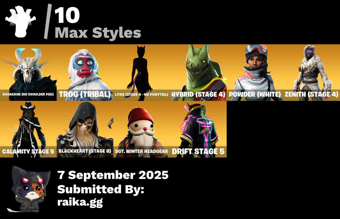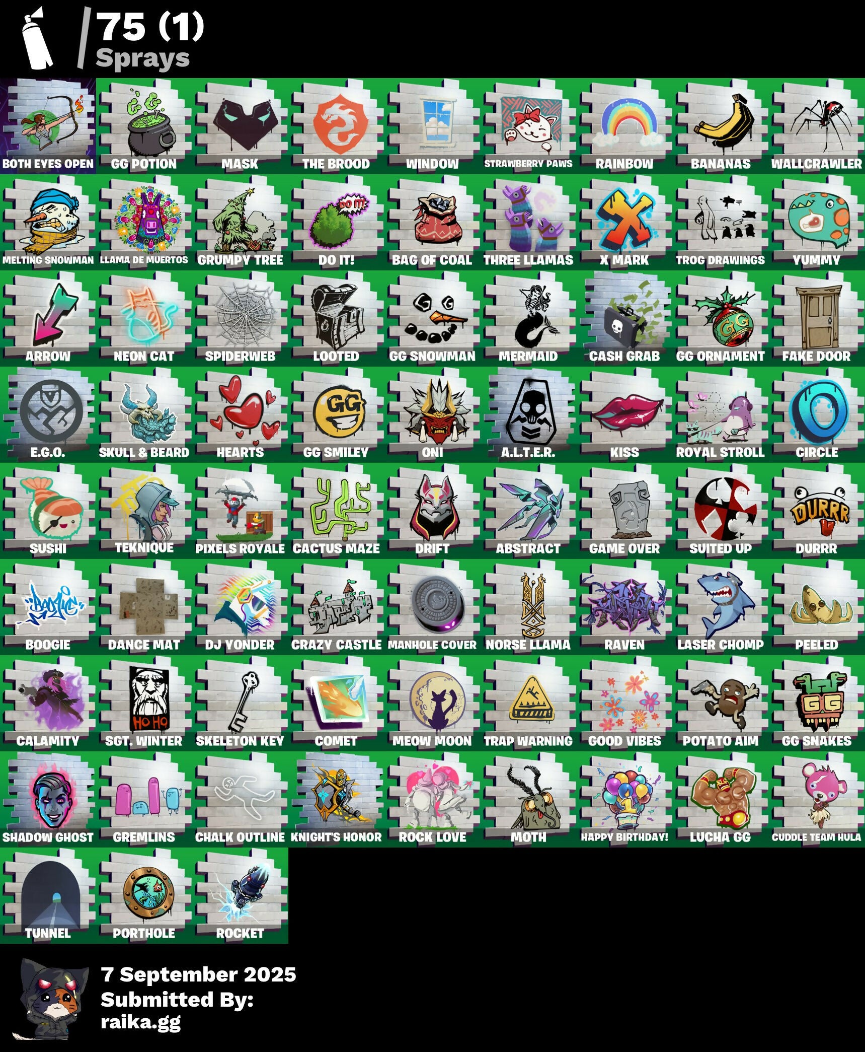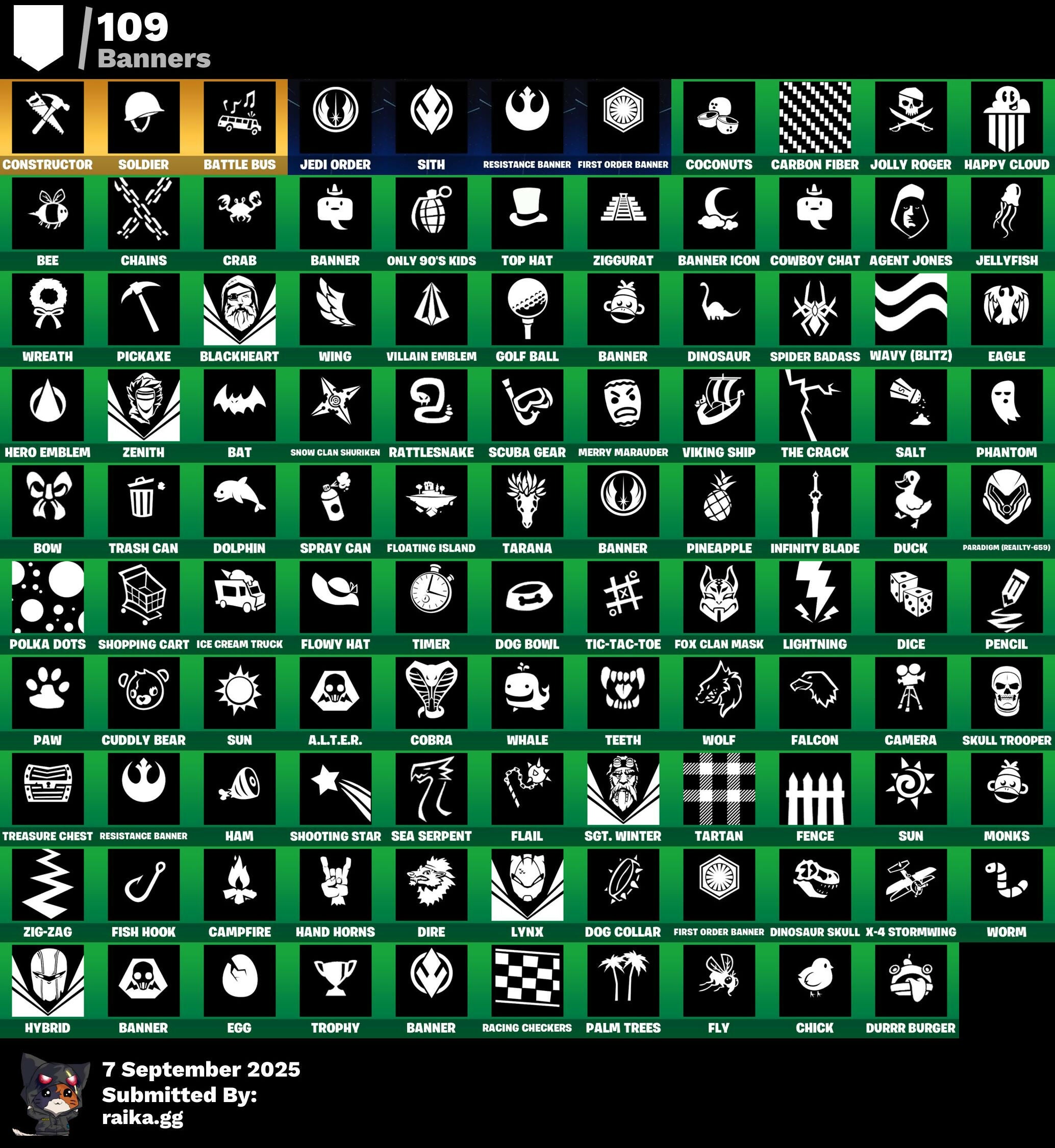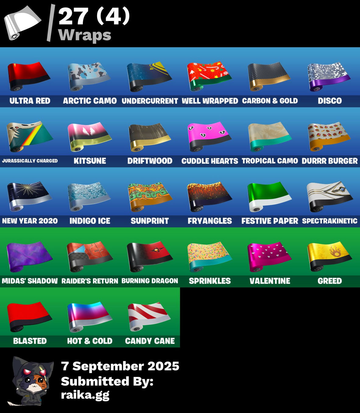 A.L.T.E.R., Abominable Axe, Abstract, Agent Jones, Altitude, Arctic Camo, Arrow, Arroyo Pack, Astro, Astroworld Cyclone, Bag Of Coal, Balloon Axe, Bananas, Banner, Banner Icon, Base Jumper, Basecamp Bag, Basic Basher, Bat, Battle Bus, Battle Call, Battle Shroud, Battlehawk, Beach Umbrella, Beachcomber, Bee, Best Mates, Birthday Cake, Blackheart, Blackheart (Stage 8), Blasted, Bobo, Bogey Bag, Boogie, Boogie Down, Both Eyes Open, Boulder Breakers, Bow, Breakdown, Burning Dragon, Cactus Maze, Calamity, Calamity Stage 5, Calculated, Call Me, Camera, Campfire, Candy Cane, Carbide, Carbon, Carbon & Gold, Carbon Fiber, Cash Grab, Cat Flip, Chains, Chalk Outline, Chef's Choice, Chick, Cinder, Circle, Classified, Clawz Retro, Clean Sweep, Cobra, Coconuts, Comet, Competitor's Time Brella, Confidential Case, Conga, Conquest, Constructor, Coven Cape, Covered Crusader, Cowboy Chat, Crab, Crazy Castle, Crossfire, Crowbar, Cruiser, Cuddle Hearts, Cuddle Team Hula, Cuddly Bear, DJ Yonder, Dance Mat, Dante, Dark Bag, Dark Bomber, Dark Matter, Dark Voyager, Dice, Dinosaur, Dinosaur Skull, Dire, Disco, Dismal Cape, Do It!, Dog Bowl, Dog Collar, Dolphin, Downpour, Downshift, Doze Dab, Dragon Stance, Dragon's Claw, Drift, Drift Stage 5, Driftwood, Duck, Durrr, Durrr Burger, Dusk, Dusk Wings, E.G.O., Eagle, Egg, Elite Agent, Enforcer, Equalizer, Eva, Fable, Fabled Cape, Fake Door, Falcon, Fence, Festive Paper, First Order Banner, Fish Hook, Flail, Flippin' Away, Floating Island, Flowy Hat, Fly, Foundational 'Brella, Founder's Glider, Founder's Umbrella, Fox Clan Mask, Frozen Shroud, Fryangles, Gale Force, Game Over, Gentleman's Dab, Get Funky, Gg Ornament, Gg Potion, Gg Smiley, Gg Snakes, Gg Snowman, Giddy-Up, Gilded Scepter, Glidurrr, Golf Ball, Golf Clap, Good Vibes, Goodie Bag, Greed, Gremlins, Groove Jam, Grumpy Tree, Guiding Glow, Gumshoe, Ham, Hand Horns, Happy Birthday!, Happy Cloud, Hearts, Heartspan, Hello Friend, Hero Emblem, High Octane, Hollowhead, Holographic, Hootenanny, Hot & Cold, Hot Marat, Howl, Huntress, Hybrid, Hybrid (Stage 4), Hype, Ice Cream Truck, Ice Cube, Indigo Ice, Infinity Blade, Intrepid, Iron Cage, It's Go Time!, Jedi Order, Jellyfish, Jolly Roger, Jurassically Charged, Keep It Mello, Kiss, Kitsune, Knight's Honor, Laser Chomp, Lightning, Lil' Kev, Llama De Muertos, Lobby Classic, Lockstep, Lollipopper, Looted, Lt. Evergreen, Lucha Gg, Lucky Coins, Lug Axe, Lunar Hyperjet, Lynx, Lynx (Stage 4 - No Ponytail), Manhole Cover, Mask, Master Portal, Mean Streak, Melting Snowman, Meow Moon, Mermaid, Merry Marauder, Mic Drop, Midas' Shadow, Mighty Marvel 'Brella, Millennium Falcon, Mission Specialist, Monks, Moonwalker, Moth, Mouldering Cloak, Mutiny, Nanner Bashers, Nara, Neon Cat, New Year 2020, Nitelite, Nog Ops, Norse Llama, Offworld Rig, Ol' Woody, Omen, Oni, Only 90's Kids, Orange Justice, Orbital Shuttle, Palm Leaf, Palm Trees, Paper Parasol, Paradigm (Reality-659), Paw, Peeled, Peely Whip, Pencil, Peppermint Pick, Perfect Present, Permafrost, Phantom, Pickaxe, Picnic, Pigskin, Pineapple, Pixels Royale, Plague, Polka Dots, Pool Party, Popcorn, Porthole, Positron, Potato Aim, Powder, Powder (White), Precision, Premiere Poms, Prized Llama, Pursuit, Racing Checkers, Ragnarok, Ragnarok (No Shoulder Pad), Raider's Return, Rainbow, Rainbow Rider, Ranker's Tags, Rattlesnake, Raven, Re-Gifter, Rearguard, Reckoning, Red Knight, Red Shield, Redline, Regal Wave, Resistance Banner, Respect, Respect The Peace, Ride The Pony, Rift Edge, Rock Love, Rock Paper Scissors, Rocket, Rook, Rose Glow, Rose Rider, Rose Team Leader, Royal Stroll, Royale Air, Running Man, Rust Bucket, Rust Lord, Salt, Salute, Salvaged Chute, Sanctum, Sawtooth, Scorcher, Scratchmark, Scuba Gear, Sea Serpent, Sgt. Winter, Sgt. Winter Headgear, Shadow Ghost, Shaolin Sit-Up, Shimmer, Shooting Star, Shopping Cart, Shortbread Slicers, Sidewinder, Sith, Skeleton Key, Skirmish, Skull & Beard, Skull Trooper, Sky Serpents, Sledgehammer, Slitherin', Smash O'-Lantern, Smash Up, Snakebite, Snow Clan Shuriken, Snowfall, Snowshaker, Soldier, Spectra Protector, Spectrakinetic, Spider Badass, Spider Knight, Spider Shield, Spiderweb, Spirit Cape, Splashdown, Spray Can, Sprinkles, Squad Leader, Standard Issue, Strawberry Paws, Subjugator, Sugar Crash, Suited Up, Sun, Sun Strider, Sunprint, Sushi, Sushi Master, Swag Bag, Swag Smasher, Swarm, Swipe It, Tactical Sleigh, Take The Elf, Take The L, Tarana, Tartan, Teeth, Teknique, The Ace, The Brood, The Crack, The Mcg, The Reaper, The Robot, The Sith, The Umbrella, The Visitor, Three Llamas, Tic-Tac-Toe, Time Brella, Timer, Top Hat, Trail Tote, Trap Warning, Trash Can, Treasure Chest, Treefall, Trog, Trog (Tribal), Trog Drawings, Trophy, Tropical Camo, Trusty No. 2, Tunnel, Twin Crossfire, Ultra Red, Undercurrent, Uplink, Utility Claymore, Valentine, Valor, Viking Ship, Villain Emblem, Wallcrawler, Warpaint, Wave, Waveform, Wavy (Blitz), Webrella, Well Wrapped, Wet Paint, Whale, White Fang, Wild Streak, Window, Wing, Wingman, Wings Of Valor, Wolf, Wooly Warrior, Worm, Wreath, X Mark, X-4 Stormwing, You're Awesome, Yummy, Zenith, Zenith (Stage 4), Zig-Zag, Ziggurat, Zoey