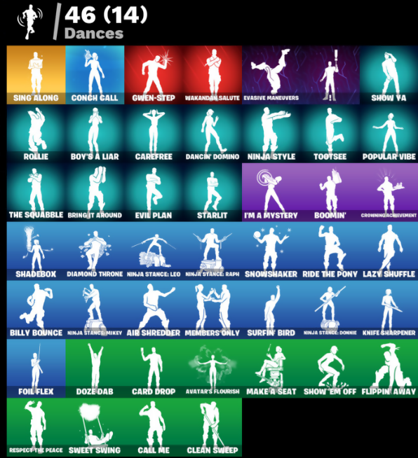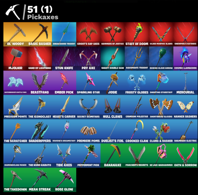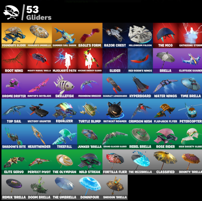 Agent Jones, Air Shredder, Aphrodite, Apocalypse Shroud, Aquaman's Trident, Arcane Energy Glider, Arctic Assassin, Arroyo Pack, Auto Clutch, Avatar's Flourish, Bananaxe, Basic Basher, Beachcomber, Beastfang, Bedside Nanner, Billy Bounce, Boomin', Bounty 'Brella, Boxing Glove Arrow, Boy's A Liar, Breakfast Bounty, Breakshore Trident, Brella, Bring It Around, Call Me, Carbon Fiber Holster, Card Drop, Carefree, Cerberus, Clang & Basher, Clara, Classified, Clawbox, Clawz Retro, Clean Sweep, Cliffsde Soarer, Clip Show Carry-All, Conch Call, Cosmic Llamacorn, Coupé Sash, Cozy Conch, Crimson Polestar, Crimson Wish, Crooked Claw, Dancin' Domino, Deep Dive, Demonruner’s Trophy, Diamond Throne, Diamondclaw Picker, Dieselback Pack, Doctor Doom, Doom Brella, Doom Chalice, Doom's Cowl, Downpour, Doze Dab, Dreamzy Handbag, Drome Drifter, Duelist's Foil, Dynamo Grav-Suit, Eagle's Form, Elite Servo, Ember Pick, Equalizer, Eternal Ranker, Evasive Maneuvers, Evil Plan, Facet, Fade, Flapjack Flyer, Flippin' Away, Foil Flex, Fortilla Flier, Founder's Glider, Founder's Umbrella, Foxbow Quiver, Fractured World, Frosty Globes, Galaxia, Gathering Storm, Geode, Gilded Morphic Blades, Glorious Giftblade, Godzilla’s Exo-Spine, Grand Glacier Glider, Green Arrow, Groot, Groot's Sap Axes, Gwen-Step, Gwenpool, Gwenpool's Katanas, Hadean Gate, Hammers of Justice, Hand of Lightning, Hayseed, Heart's Carver, Heartwinder, Heart’s Rest, High Society Glider, Holiday Foxy, Holo-Boot Pack, Hope, Hunter's Skyblade, Hyperboard, I'm A Mystery, Interstellar Butterfly, Iron Man Backplate, Jennifer Walters, Jones’ Field Pack, Josie, Junker 'Brella, Knife Sharpener, Kondor, Korra, Krang, Lara Croft, Lazy Shuffle, Legend's Modkit, Lexa, Lt. Evergreen, Make A Seat, Mancake, Mandalorian, Mave, Maven, Mean Streak, Mechanuson Interface, Members Only, Mercurial, Metal Gear Mr. II, Metalhead, Mighty Marvel 'Brella, Millennium Falcon, Mjolnir, Mjolnir's Path, Montague, Moonbow Breezer, Mrbeast, Mystique, Mystique’s Skull, Nanner Bashers, Ne'jari Warhammer, Ninja Stance: Donnie, Ninja Stance: Leo, Ninja Stance: Mikey, Ninja Stance: Raph, Ninja Style, Nisha, Nitro’d Ranker, Null Claws, Nyanja’s Catpak, Oath & Sorrow, Ocean, Ol' Woody, Omni-Man, Omni-Man Emblem Cape, Omni-Man's Cape, Oscar, Owenpool's Katanas, Peely Whip, Peppermint Pick, Perfect Pivot, Peter Griffin, Petercopter, Pip-Boy, Piñata Brian, Poacher's Regrets, Popular Vibe, Poseidon, Precision Pointe, Premiere Poms, Prized Llama, Pry Axe, Pursuit, Rap Boy, Ratacat, Ratacat Roamer, Razor Crest, Re-Gifter, Rebel Brella, Rebel's Rucksack, Red Robin's Wings, Reese, Remix 'Brella, Respect The Peace, Reverie, Reverie's Dreamstaff, Ride The Pony, Rollie, Root Wing, Rose Glow, Rose Rider, Rose Team Leader, Ruby Relic, Runway Racer, Sapling Groot, Scales Of Justice, Scarlet Longboard, Scuba Jonesy, Secret Scimitars, Shadebox, Shaderippers, Shadow's Bite, Shady Boombox, Shady Double Saw, Shamisen Electric, Shark, Shield Of The Mighty, Shogun 'Brella, Shooting Starstaff, Shortbread Slicers, Show 'Em Off, Show Ya, Sing Along, Skellefish, Skirmish, Slider, Slim Shady, Snowshaker, Society Emblem Ranker, Society Shield, Solid Snake, Sparkling Star, Spectra Protector, Spirit’s Pact, Staff of Doom, Starlit, Stoneheart, Storm, Stun Knife, Summer Sail Shark, Surfin' Bird, Survivor's Pack, Sweet Swing, TMNT Pizza, Tactical Quiver, Techie, The Iconoclast, The Immortal's Head, The Kuro Kabuto, The Mcg, The Olympian, The Rezzbrella, The Scratcher, The Sith, The Squabble, The Takedown, The Umbrella, The Weeknd Combat, Thor, Thor's Cloak, Tide Axes, Time Brella, Tony Stark, Tootsee, Top Sail, Treefall, Tri-Ooze Tank, Turtle Blimp, Valeria, Vengeance Jones, Vi, Victory Vaunter, Wakandan Salute, Warpaint, Water Wings, Waterbendex's Battle Fans, Wild Streak, Wildheart Buckler, Wings Of Love, Winterfest Bushranger, Wolverine, Wooly Warrior, XO