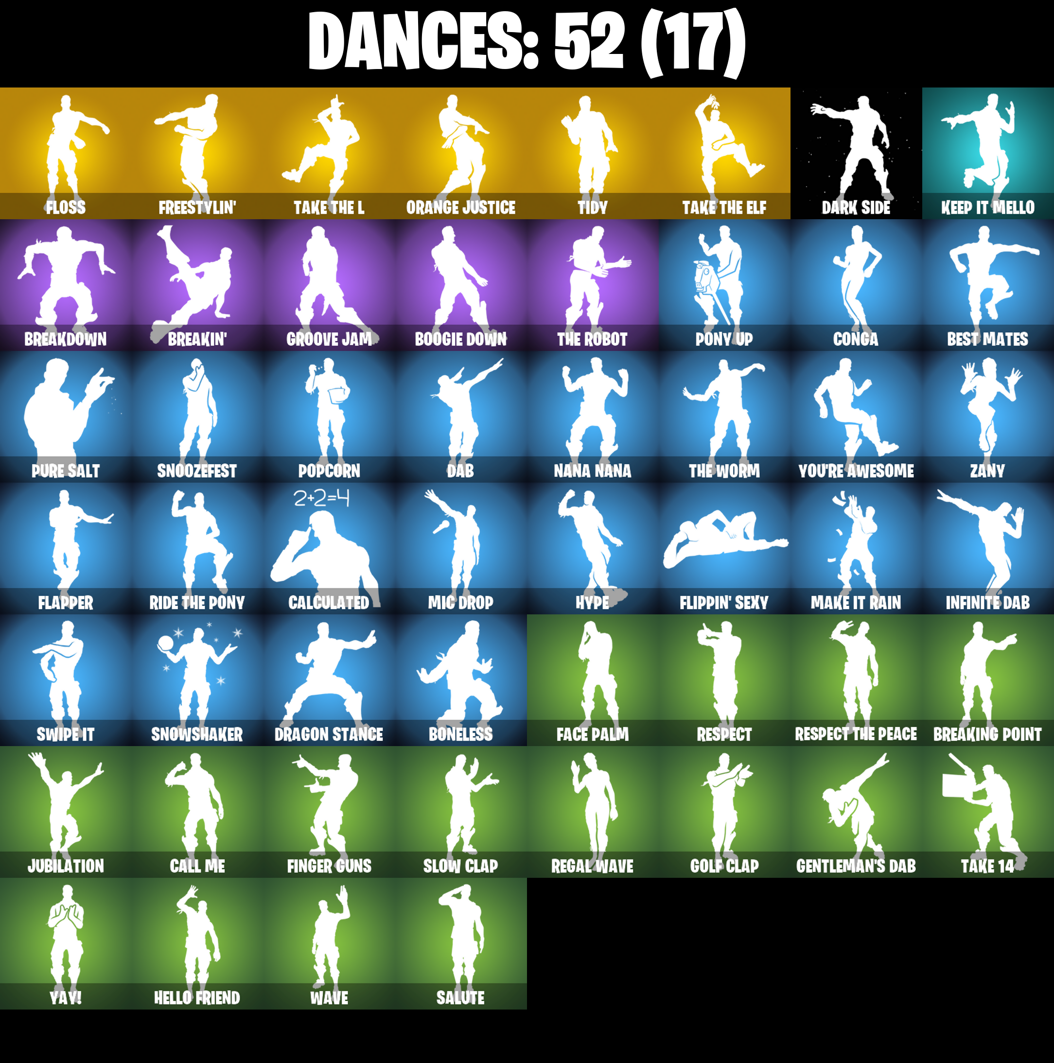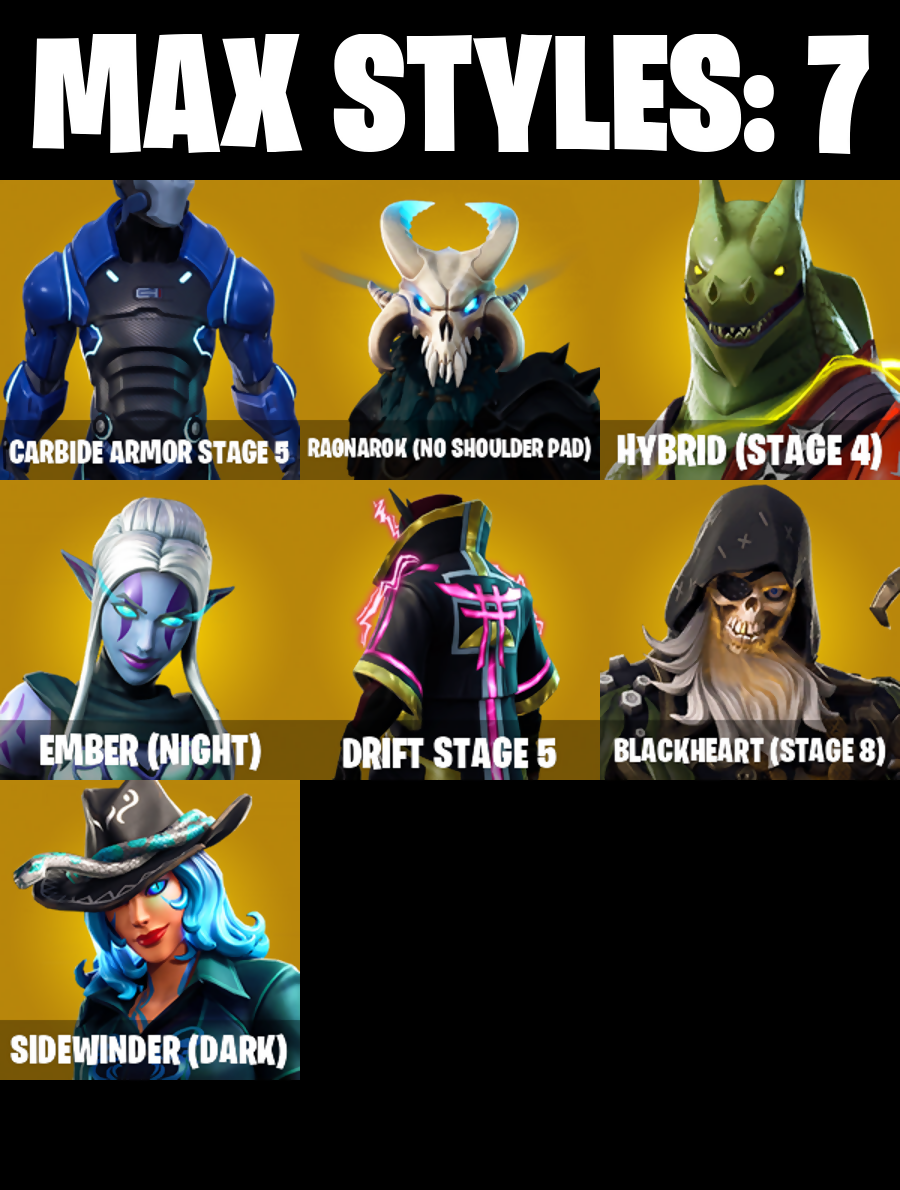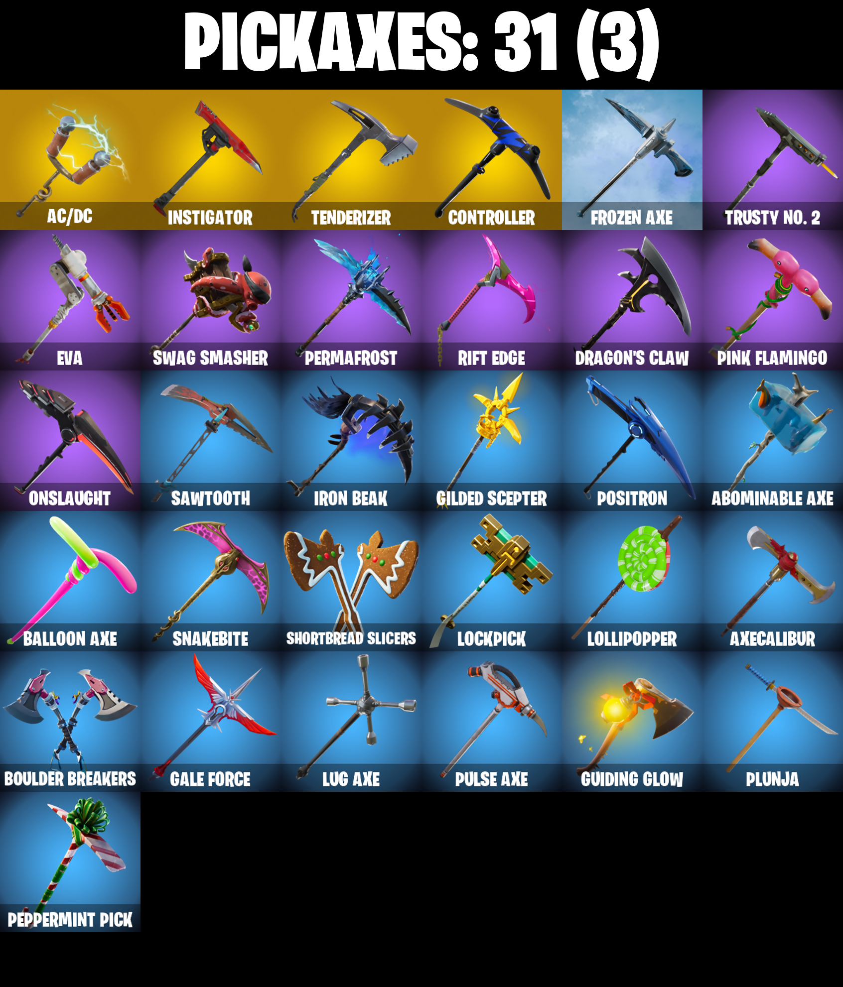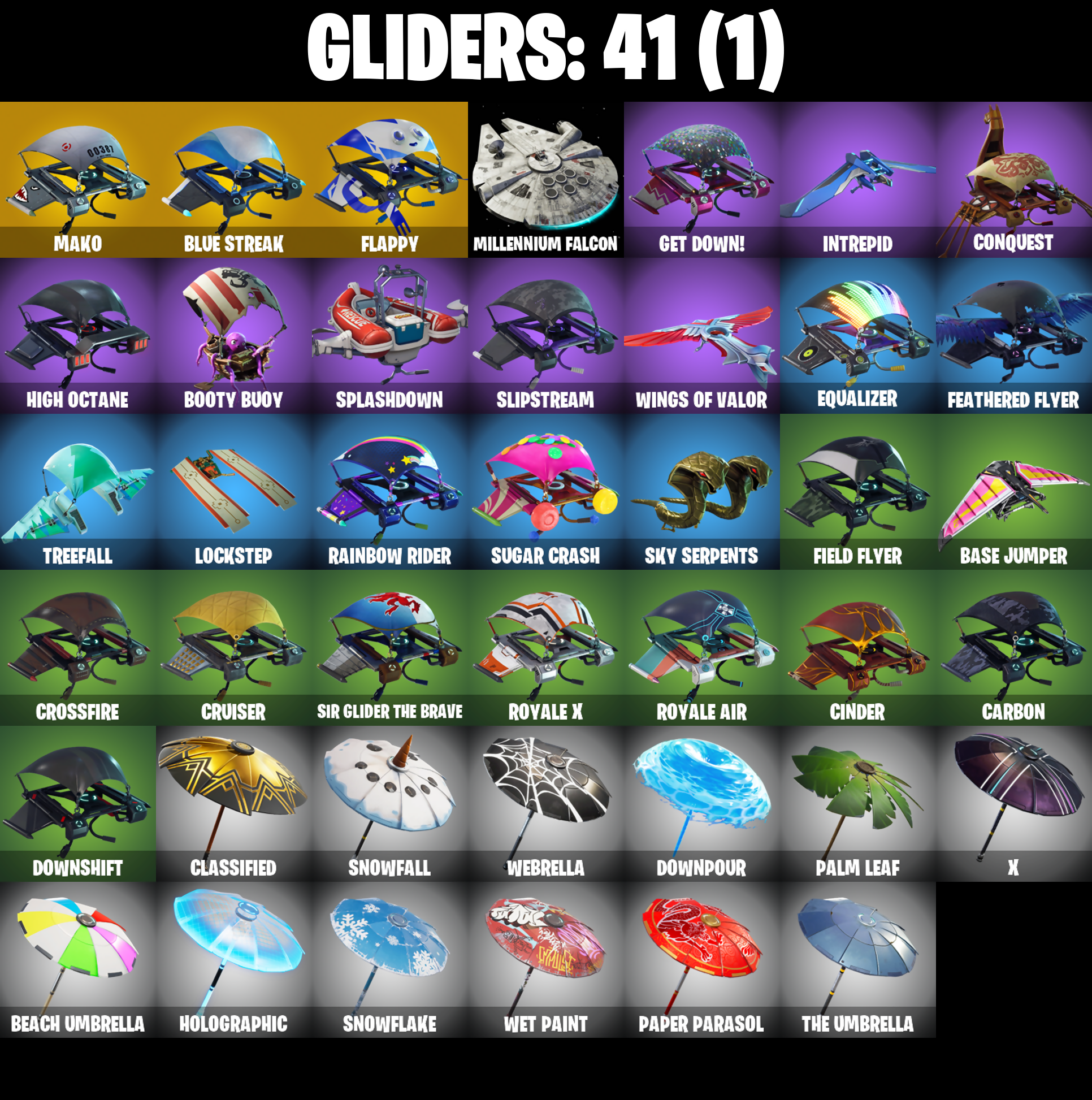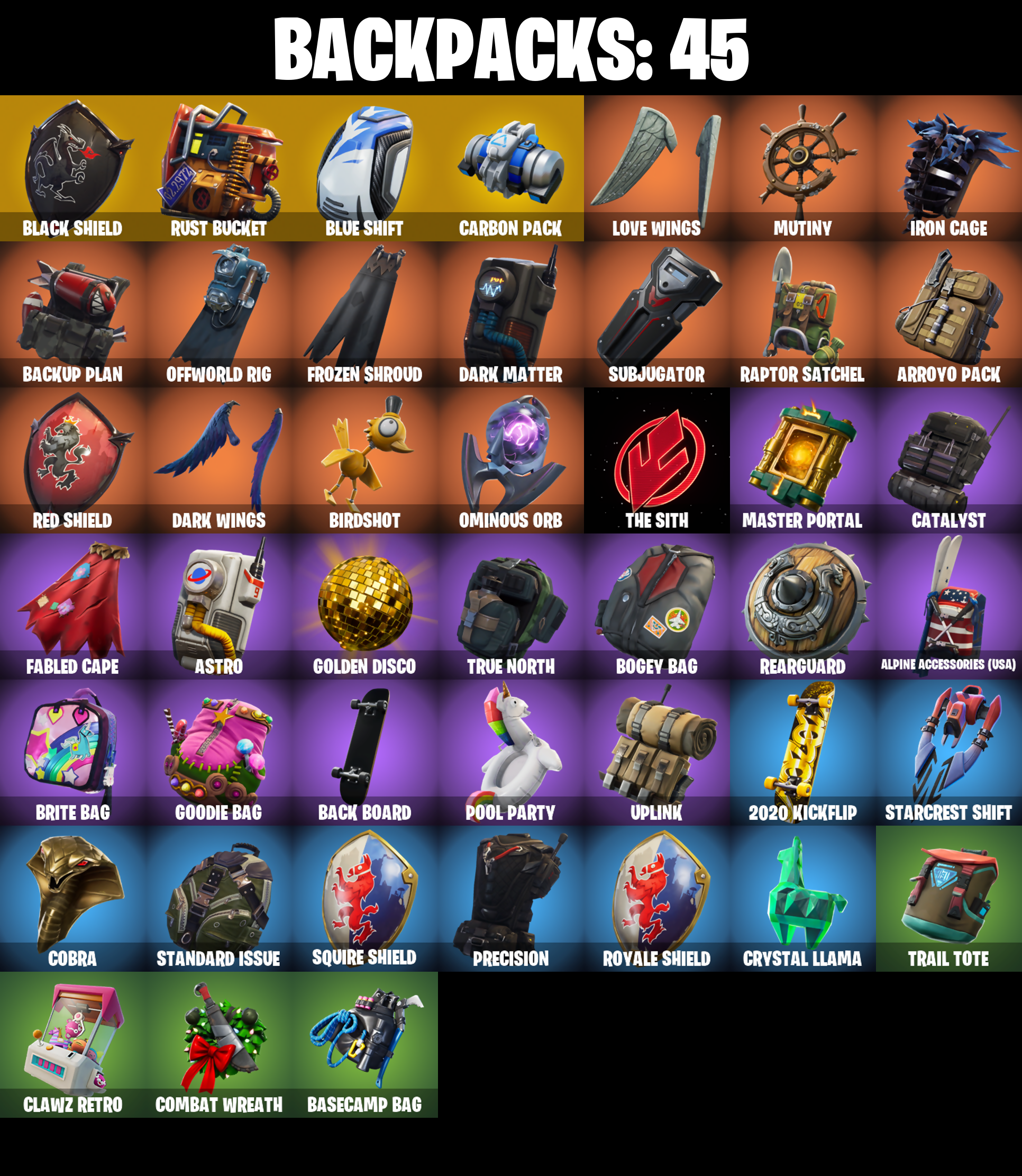 2020 Kickflip, Abominable Axe, Ac/Dc, Alpine Accessories (USA), Alpine Ace (USA), Arroyo Pack, Astro, Axecalibur, B.R.U.T.E. Gunner, Back Board, Backup Plan, Balloon Axe, Base Jumper, Basecamp Bag, Battlehawk, Beach Umbrella, Best Mates, Birdshot, Black Knight, Black Shield, Blackheart, Blackheart (Stage 8), Blue Shift, Blue Squire, Blue Streak, Blue Striker, Blue Team Leader, Bogey Bag, Boneless, Boogie Down, Booty Buoy, Boulder Breakers, Breakdown, Breakin', Breaking Point, Brite Bag, Brite Bomber, Brite Gunner, Calculated, Call Me, Carbide, Carbide Armor Stage 5, Carbon, Carbon Commando, Carbon Pack, Catalyst, Cinder, Classified, Clawz Retro, Cobra, Combat Wreath, Conga, Conquest, Controller, Crackshot, Crossfire, Cruiser, Crystal Llama, Dab, Dark Matter, Dark Side, Dark Voyager, Dark Wings, Downpour, Downshift, Dragon Stance, Dragon's Claw, Drift, Drift Stage 5, Elite Agent, Ember, Ember (Night), Enforcer, Equalizer, Eva, Fabled Cape, Face Palm, Fate, Feathered Flyer, Field Flyer, Finger Guns, Flapper, Flappy, Flippin' Sexy, Floss, Freestylin', Frozen Axe, Frozen Shroud, Funk Ops, Gale Force, Gentleman's Dab, Get Down!, Gilded Scepter, Golden Disco, Golf Clap, Goodie Bag, Groove Jam, Guiding Glow, Havoc, Hello Friend, High Octane, Holographic, Huntress, Hybrid, Hybrid (Stage 4), Hype, Infinite Dab, Instigator, Intrepid, Iron Beak, Iron Cage, Jubilation, Jumpshot, Keep It Mello, Lockpick, Lockstep, Lollipopper, Love Ranger, Love Wings, Lug Axe, Make It Rain, Mako, Master Portal, Mic Drop, Millennium Falcon, Mission Specialist, Moonwalker, Mutiny, Nana Nana, Offworld Rig, Omega, Ominous Orb, Onslaught, Orange Justice, Palm Leaf, Paper Parasol, Peely, Peppermint Pick, Permafrost, Pink Flamingo, Plunja, Poised Playmaker, Pony Up, Pool Party, Popcorn, Positron, Precision, Pulse Axe, Pure Salt, Ragnarok, Rainbow Rider, Raonarok (No Shoulder Pad), Raptor, Raptor Satchel, Ravage, Raven, Rearguard, Red Knight, Red Shield, Redline, Regal Wave, Respect, Respect The Peace, Ride The Pony, Rift Edge, Rogue Agent, Rook, Royale Air, Royale Knight, Royale Shield, Royale X, Rust Bucket, Rust Lord, Salute, Sawtooth, Shortbread Slicers, Sidewinder, Sidewinder (Dark), Sir Glider The Brave, Sky Serpents, Sledgehammer, Slipstream, Slow Clap, Snakebite, Snoozefest, Snowfall, Snowflake, Snowshaker, Sparkle Specialist, Splashdown, Squad Leader, Squire Shield, Standard Issue, Starcrest Shift, Sub Commander, Subjugator, Sugar Crash, Sun Strider, Swag Smasher, Swipe It, Take 14, Take The Elf, Take The L, Teknique, Tenderizer, The Reaper, The Robot, The Sith, The Umbrella, The Visitor, The Worm, Tidy, Trail Tote, Trailblazer, Treefall, True North, Trusty No. 2, Uplink, Valor, Wave, Webrella, Wet Paint, Whiplash, Wingman, Wings of Valor, Wooly Warrior, X, Yay!, You're Awesome, Zany, Zoey