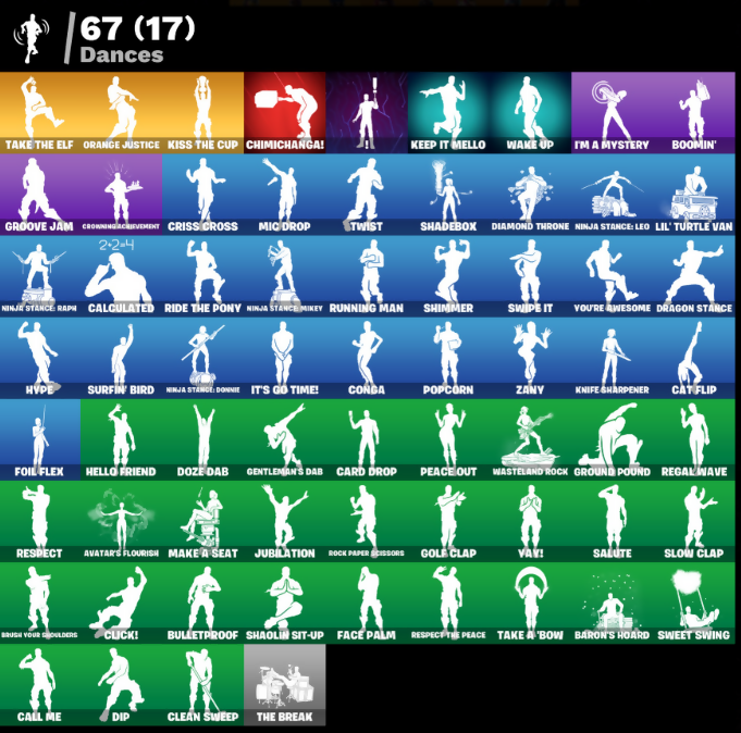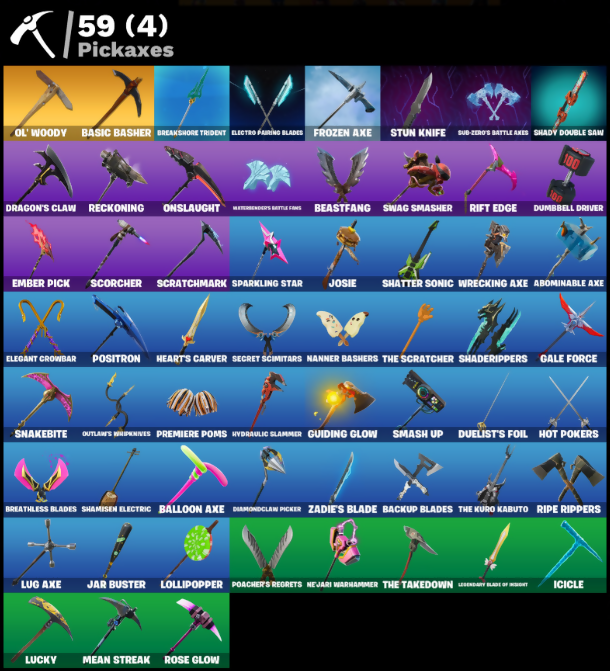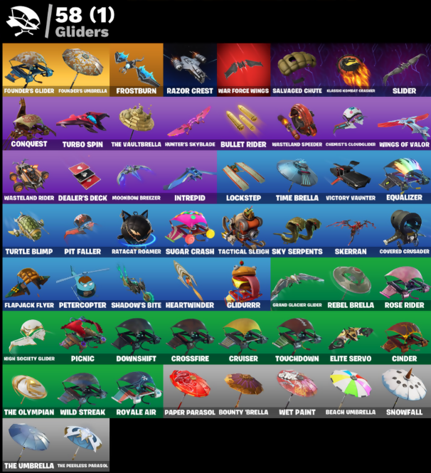 Abominable Axe, Altitude, Aphrodite, Apocalypse Shroud, Auto Clutch, Avatar's Flourish, Back Board, Backup Blades, Balloon Axe, Baron's Hoard, Basic Basher, Battlehawk, Beach Umbrella, Beastfang, Blackheart, Bogey Bag, Boomin', Bounty 'Brella, Breakfast Bounty, Breakshore Trident, Breathless Blades, Brush Your Shoulders, Bullet Rider, Bulletproof, Calamity, Calculated, Call Me, Carbide, Carbon Fiber Holster, Card Drop, Cat Flip, Catalyst, Cerberus, Chemist's Cloudglider, Chimichanga!, Cinder, Clawbox, Clawz Retro, Clean Sweep, Click!, Clip Show Carry-All, Cobalt, Cobra, Combat Wreath, Conga, Conquest, Covered Crusader, Cozy Conch, Criss Cross, Crossfire, Cruiser, DJ Yonder, Dealer's Deck, Diamond Throne, Diamondclaw Picker, Dip, Downshift, Doze Dab, Dragon Stance, Dragon's Claw, Drift, Duelist's Foil, Dumbbell Driver, Dunsem Backburner, Dynamo Grav-Suit, Electro Pairing Blades, Elegant Crowbar, Elite Servo, Ember Pick, Equalizer, Fable, Fabled Cape, Face Palm, Flapjack Flyer, Foil Flex, Founder's Glider, Founder's Umbrella, Four Elements Banner, Frostburn, Frozen Axe, Gale Force, Gentleman's Dab, Giddy-Up, Glidurrr, Glorious Giftblade, Golf Clap, Goodie Bag, Grand Glacier Glider, Groove Jam, Ground Pound, Guiding Glow, Gwenpool's Katanas, Hadean Gate, Heart's Carver, Heart's Rest, Heartwinder, Hello Friend, High Society Glider, Holiday Boxy, Hope, Hot Pokers, Hunter's Skyblade, Huntress, Hybrid, Hydraulic Slammer, Hype, I'm A Mystery, Ice Cube, Icicle, Intrepid, It's Go Time!, Jar Buster, Josie, Jubilation, Keep It Mello, Kiss The Cup, Knife Sharpener, Korra, Krang, Krissys Knight Crasher, Laguna, Legend's Modkit, Legendary Blade of Insight, Lil' Dilly, Lil' Turtle Van, Loaded Barrel Bag, Lockstep, Lollipopper, Lone Wolf Holster, Lucky, Lug Axe, Lunarios, Lynx, Make A Seat, Mancake, Mandalorian, Master Portal, Mean Streak, Metal Gear Mk. II, Metalhead, Mic Drop, Montague, Moonbow Breezer, Mutiny, Nanner Bashers, Nejari Warhammer, Ninja Stance: Donnie, Ninja Stance: Leo, Ninja Stance: Mikey, Ninja Stance: Raph, Nisha, Nyanja's Catpak, Offworld Rig, Ol' Woody, Omega, Onslaught, Orange Justice, Oscar, Outlaw's Knife Rack, Outlaw's Whipknives, Paper Parasol, Peace Out, Peely Whip, Perfect Present, Peter Griffin, Petercopter, Picnic, Pineapple Strummer, Pit Faller, Piñata Brian, Poacher's Regrets, Pool Party, Popcorn, Poseidon, Positron, Powder, Precision, Premiere Poms, Prized Llama, Pursuit, Rap Boy, Ratacat, Ratacat Roamer, Razor Crest, Rearguard, Rebel Brella, Reckoning, Redline, Redmask Ranker, Reese, Regal Wave, Reinforced Backplate, Respect, Respect The Peace, Ride The Pony, Rift Edge, Ripe Rippers, Rock Paper Scissors, Rogue Agent, Rose Glow, Rose Rider, Rose Team Leader, Rox, Royale Air, Ruby Relic, Running Man, Runway Racer, Rust, Rust Bucket, Salute, Salvaged Chute, Scorcher, Scratchmark, Secret Scimitars, Sentinel, Sgt. Winter, Shadebox, Shaderippers, Shadow's Bite, Shady Boombox, Shady Double Saw, Shamisen Electric, Shaolin Sit-Up, Shatter, Shatter Sonic, Shimmer, Sidewinder, Skerran, Skirmish, Sky Serpents, Slider, Slim Shady, Slow Clap, Smash Up, Snakebite, Snowfall, Society Shield, Solid Snake, Sonic Ignition Pack, Sparkling Star, Spectra Protector, Squad Leader, Standard Issue, Stealing Wheel, Stun Knife, Sub-zero's Battle Axes, Sugar Crash, Summit Striker, Sun Strider, Surfin' Bird, Swag Smasher, Sweet Swing, Swipe It, TMNT Pizza, Tactical Sleigh, Take A 'Bow, Take The Elf, Teknique, The Break, The Kuro Kabuto, The Machinist, The Olympian, The Peerless Parasol, The Scratcher, The Takedown, The Umbrella, The Vaultbrella, The Visitor, Time Brella, Top Notch, Touchdown, Trail Tote, Turbo Spin, Turtle Blimp, Twin Blasters, Twist, Uplink, Valeria, Valor, Vay!, Vengeance Jones, Verge, Victory Vaunter, Wake Up, War Force Wings, Warpaint, Wasteland Rider, Wasteland Rock, Wasteland Speeder, Waterbender's Battle Fans, Waveform, Wet Paint, Wild Streak, Wingman, Wings Of Valor, Wrecking Axe, X-Lord, You're Awesome, Zadie's Blade, Zany, Zenith, Zoey