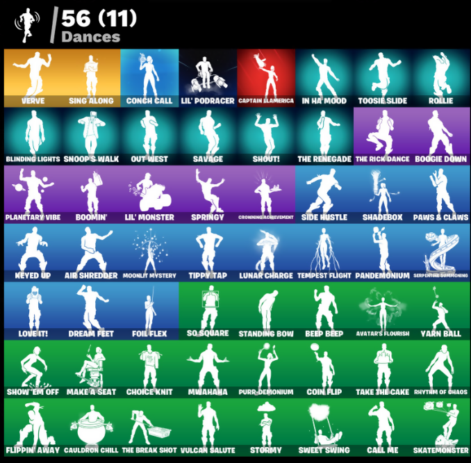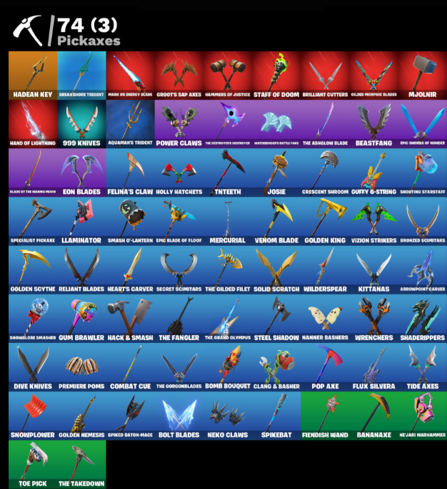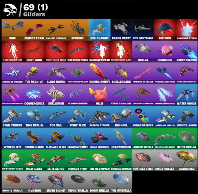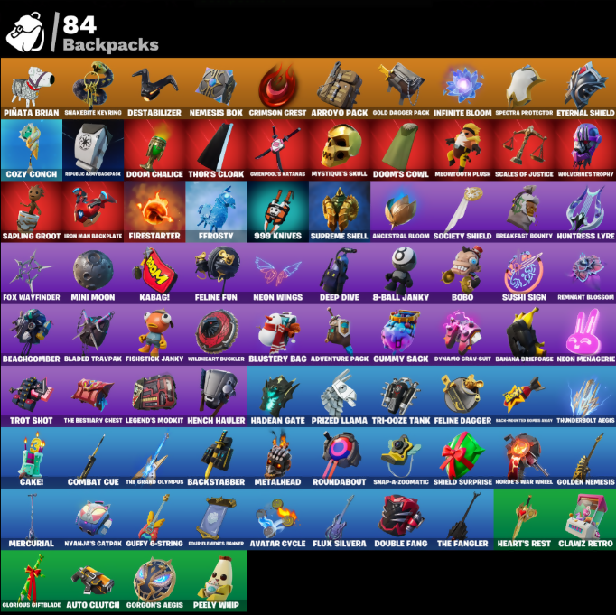 1-Ball, 8-Ball Janky, 999 Knives, Adventure Pack, Agent Peely, Air Shredder, Ancestral Bloom, Aphrodite, Aquaman, Aquaman’s Trident, Arcane Energy Glider, Arrowpoint Carver, Arroyo Pack, Artemis, Auto Clutch, Avatar Cycle, Avatar's Flourish, Back-Weighted Bones Away, Backstabber, Banana Bomber, Banana Briefcase, Bananaxe, Beachcomber, Beastfang, Beep Beep, Big Haul, Blade Raven, Blade of the Wailing Moon, Bladed Travpak, Blaze, Blinding Lights, Blustery Bag, Bobo, Bolt Blades, Bomb Bouquet, Bombs Away!, Boogie Down, Boomin', Bounty 'Brella, Breakfast Bounty, Breakshore Trident, Brella, Brilliant Cutters, Bronzed Scimitars, Brutus, Bubbloon, Cake!, Call Me, Captain Lamerica, Cauldron Chill, Cerberus, Chaos Director, Chaotic Crawler, Choice Knit, Clang & Basher, Classified, Clawz Retro, Cliffside Soarer, Coin Flip, Combat Cue, Comet Crasher, Conch Call, Convergence, Cozy Conch, Crescent Shroom, Crimson Crest, Crowning Achievement, Deadpool, Deep Dive, Destabilizer, Dive Knives, Doctor Doom, Doom Brella, Doom Chalice, Doom's Cowl, Double Fang, Double-Barreled Boom Ballista, Dream Feet, Dynamo Grav-Suit, Dynamo TNTina, Eagle's Form, Elite Servo, Enchanted Lifebloom, Eon Blades, Epic Blade of Floof, Epic Swords of Wonder, Eternal Knight, Eternal Shield, Fade, Felina, Felina’s Claw, Feline Dagger, Feline Fun, Ffrosty, Fiendish Wand, Firestarter, Fishstick Janky, Fishy Flier, Flapjack Flyer, Flippin' Away, Flux Silvera, Foil Flex, Fortilla Flier, Four Elements Banner, Fox Wayfinder, Gathering Storm, Gear Specialist Maya, Gilded Morphic Blades, Glorious Giftblade, Gold Dagger Pack, Golden King, Golden Nemesis, Golden Scythe, Gorgon's Aegis, Grand Glacier Glider, Groot, Groot’s Sap Axes, Guffy G-String, Gum Brawler, Gummy Sack, Gwenpool's Katanas, Hack & Smash, Hadean Gate, Hadean Key, Hammers of Justice, Hand of Lightning, Heart's Rest, Heartwinder, Heart’s Carver, Hench Hauler, High Society Glider, Holiday Boxy, Holly Hatchets, Horde's War Wheel, Hunter's Skyblade, Huntress Lyre, In Ha Mood, Infinite Bloom, Invasion, Iris, Iron Man Backplate, Jennifer Walters, Josie, Jules, Junker 'Brella, Kabag!, Keyed Up, Kit, Kittanas, Korra, Korra's Air Glider, Krisabelle, Legend's Modkit, Lil' Monster, Lil' Podracer, Llamacorn Express, Llaminator, Love It!, Lt. John Llama, Lunar Charge, Make A Seat, Mancake, Mandalorian, Mark 85 Energy Blade, Mark 90 Flight Pack, Mave, Medusa, Mega-Brella, Meowdas, Meowscles, Meowtooth Plush, Mercurial, Metalhead, Midas, Mighty Marvel 'Brella, Mini Moon, Mjolnir, Mjolnir's Path, Moonbow Breezer, Moonlit Mystery, Mwahaha, Mystique, Mystique's Skull, Nanner Bashers, Needle Dropper, Neko Claws, Nemesis Box, Neon Menagerie, Neon Wings, Ne’Jari Warhammer, Nyanja, Nyanja's Catpak, Oblivion, Ocean, Ohm, Ollie, Out West, Pandemonium, Paws & Claws, Peely Whip, Perfect Pivot, Pinata Brian, Planetary Vibe, Polar Peely, Pop Axe, Poseidon, Power Claws, Premiere Poms, Prized Llama, Purr-Demonium, Razor Crest, Rebel Brella, Reese, Reliant Blades, Remix 'Brella, Remnant Blossom, Republic Army Bagpapa, Rhythm Of Chaos, Rollie, Ronin, Root Wing, Roundabout, Sapling Groot, Savage, Scales Of Justice, Scarlet Serpent, Scuba Jonesy, Sea Chariot, Secret Scimitars, Sentinel, Serpentine Surrounding, Seven Signet, Shadebox, Shaderippers, Shadow Stalker, Shadow's Bite, Shanta, Shield Surprise, Shooting Starstaff, Shout!, Show 'Em Off, Side Hustle, Sing Along, Siona, Sith Infiltrator, Skatemonster, Skellefish, Skelleshark, Skye, Slayer Juice WRLD, Smash O‘Lantern, Snakebite Kevring, Snap-A-Zoomatic, Snoop's Walk, Snowglobe Smasher, Snowmando, Snowmando Board, Snowplower, So Square, Society Shield, Solid Scratch, Specialist Pickaxe, Spectra Protector, Spikebat, Spiked Baton-Mace, Springy, Staff of Doom, Standing Bow, Star Strider, Steel Shadow, Storm, Stormcloud, Stormy, Sunny's Lander, Supreme Shell, Sushi Sign, Sweet Swing, TNTina, Take The Cake, Tempest Flight, The Ashglow Blade, The Bestiary Chest, The Break Shot, The Destroyer’s Destroyer, The Fangler, The Gilded Filet, The Gorgonblades, The Grand Olympus, The Great Scarecrow, The Mcg, The Olympian, The Rack-Up, The Renegade, The Rick Dance, The Soaring Crescent, The Takedown, The Umbrella, Thor, Thor's Cloak, Thunder & Lightning, Thunderbolt Aegis, Tide Axes, Time Brella, Tippy Tap, Tnteeth, Toe Pick, Tony Stark, Toosie Slide, Top Sail, Tri-Ooze Tank, Trot Shot, Undercover Skye, Venom Blade, Verve, Vizion Strikers, Vulcan Salute, War Force Wings, Water Wings, Waterwielder’s Battle Fins, Wild Blast, Wilderspear, Wildheart Buckler, Winterfest Bushranger, Wolverine, Wolverine's Trophy, Wooly Mammoth, Wrenchers, Wyvern X77, Yarn Ball, Yellow Jacket, Zeus