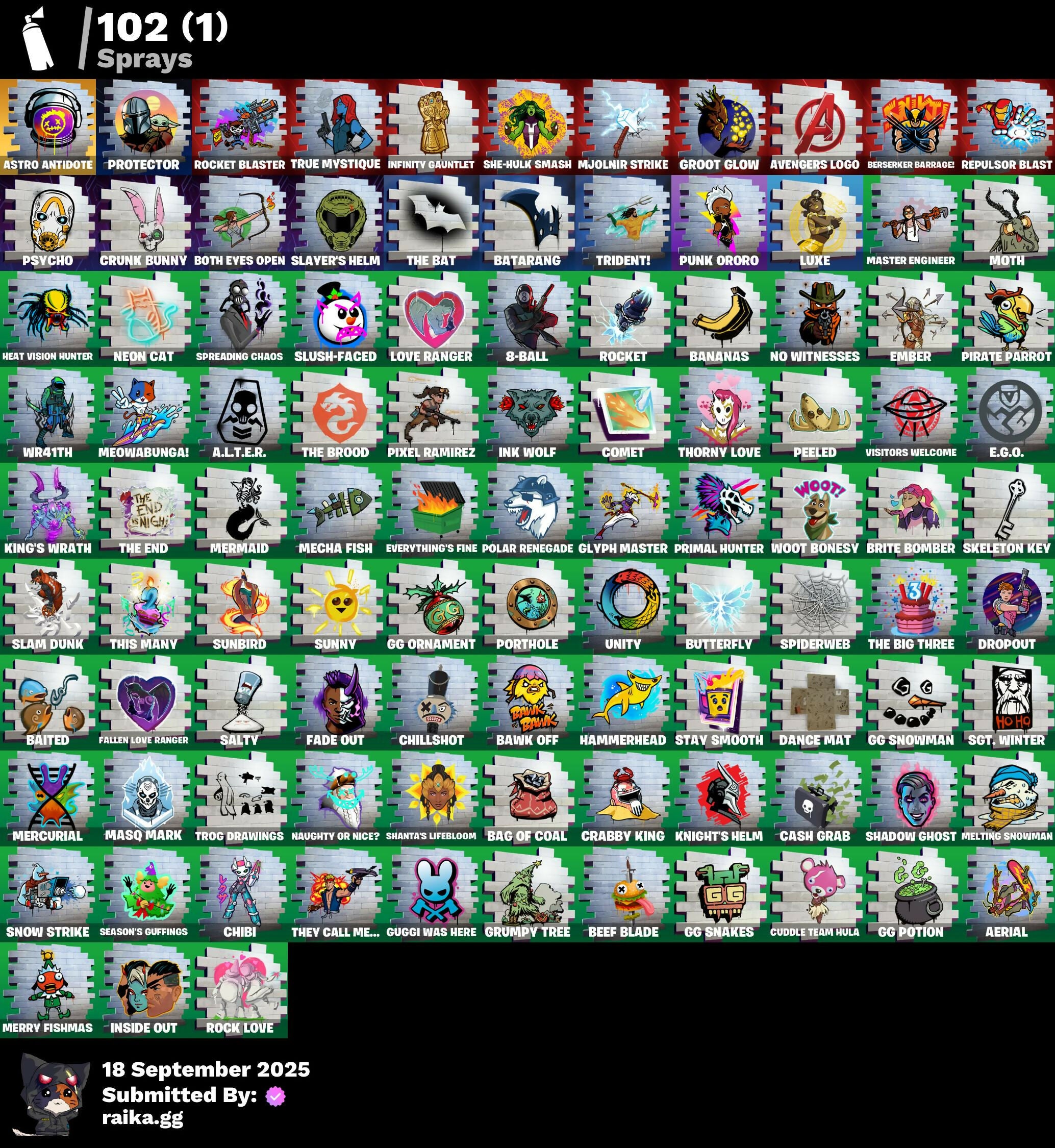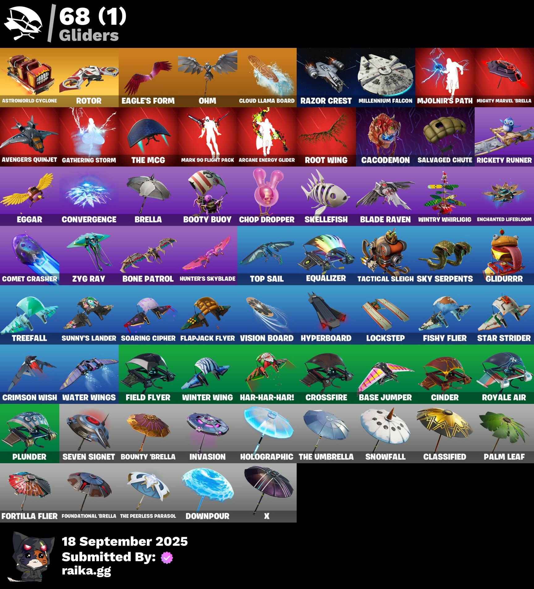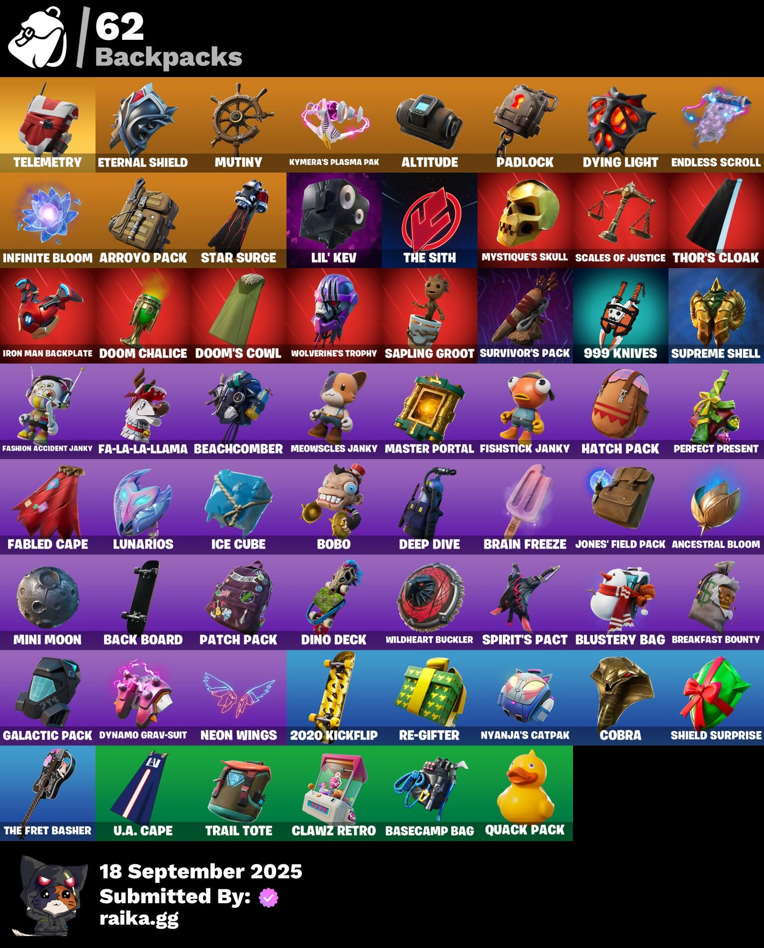 2020 Kickflip, 8-Ball, 999 Knives, A.L.T.E.R., Abduction, Abominable Axe, Acolyte's Curse, Aerial, Afterparty, Agent Jones, Agent Jones (Jump 31), Agent Peely, Air Shredder, Altitude, Ancestral Bloom, Aquaman, Aquaman's Trident, Arcane Energy Glider, Arcane Steel, Arctic Camo, Arroyo Pack, Arthur Curry, Astro Antidote, Astro Jack, Astroworld Cyclone, Aura, Avengers, Avengers Logo, Avengers Quinjet, Back Board, Bag Of Coal, Baited, Bananas, Bananaxe, Banner, Banner Icon, Base Jumper, Basecamp Bag, Bat, Batarang, Bawk Off, Beachcomber, Beacon Trance, Beamers, Bean Bag, Beastfang, Beef Blade, Beep Beep, Berserker Barrage, Birthday Slice, Blackheart, Blackheart (Stage 8), Blade Of The Waning Moon, Blade Raven, Blasted, Blustery Bag, Bobo, Bolt, Bone Patrol, Boomin', Boots 'N' Cats, Booty Buoy, Both Eyes Open, Boulder Breakers, Bounty 'Brella, Brain Freeze, Breakfast Bounty, Breathless Blades, Brella, Brite Bomber, Bronzed Scimitars, Brood, Bunker Basher, Butterfly, Cacodemon, Call Me, Candy Cane, Captain America's Shield, Carbon & Gold, Cardistry, Cash Grab, Cat Flip, Chainsaur, Chibi, Chic, Chillshot, Choice Knit, Chop Chop, Chop Dropper, Cinder, Classified, Clawz Retro, Clean Sweep, Cloud Llama Board, Cloudburst, Cluck, Clucking Mad, Cobra, Coconuts, Comet, Comet Crasher, Conga, Controlled Focus, Convergence, Cowboy Chat, Crabby King, Crescent Shroom, Crimson Crest, Crimson Wish, Crossfire, Crowning Achievement, Crunk Bunny, Crystal Axe Of The Masters, Crystal Llama, Cube Marking, Cuddle Hearts, Cuddle Team Hula, Cursed, Dance Mat, Deep Dive, Deep End, Denim Destiny, Dino Deck, Dive Knives, Doctor Doom, Doctor Doom (God Emperor), Dolphin, Doom Chalice, Doom's Cowl, Double Helix, Downpour, Dragon Scales, Dragon Stance, Dragon's Claw, Dread, Driftwood, Dropout, Drummies, Durrr Burger, Dying Light, Dynamo Grav-Suit, E.G.O., Eagle's Form, Eggar, Ember, Enchanted Lifebloom, Endless Scroll, Eon Blades, Equalizer, Eternal Emblem, Eternal Knight, Eternal Shield, Evasive Maneuvers, Everything's Fine, Fa-La-La-Llama, Fabled Cape, Fade, Fade Out, Fallen Love Ranger, Falling Leaf, Falling Snow, Fashion Accident Janky, Ferocious, Festive Paper, Field Flyer, Fish Hook, Fishstick Janky, Fishy Flier, Fist, Flapjack Flyer, Flippin' Away, Floating Island, Fortilla Flier, Foundational 'Brella, Fox, Free Flow, Frost Squad, Frosted, Frosty Globes, Fryangles, GG Ornament, GG Potion, GG Snakes, GG Snowman, Galactic Pack, Gathering Storm, Get Funky, Gilded Morphic Blades, Gilded Scepter, Glidurrr, Glyph Master, Golf Clap, Grav-Fusion, Greed, Gringle Gift, Groot, Groot (Silver Foil), Groot Glow, Groot's Sap Axes, Grumpy Tree, Guggi Was Here, Guggimon, Gugmon, Ham, Hammerhead, Hammers Of Justice, Hand Of Lightning, Happy, Har-Har-Har!, Hatch Pack, Heat Vision Hunter, Hello Friend, Holly Hatchets, Holographic, Hot Marat, Hunter's Skyblade, Hybrid, Hybrid (Stage 4), Hyperboard, I Declare!, Ice Cube, Indigo Ice, Industrious, Infinite Bloom, Infinity Blade, Infinity Gauntlet, Ink Wolf, Inside Out, Invasion, Inventor's Choice, Iron Man, Iron Man Backplate, Jellyfish, Jennifer Walters, Joey, Jolly Roger, Jones' Field Pack, Josie, Jules, Jules' Mask, Jurassically Charged, Kenshi Yonezu, Keyed Up, Kick Ups, King's Wrath, Kit, Kittanas, Knight's Helm, Knighted, Kondor, Kymera, Kymera Swarm, Kymera's Plasma Pak, Lara Croft, Laser Blaze, Legendary Blade Of Insight, Lexa, Lil' Kev, Lil' Prancer, Lil' Saucer, Lobby Classic, Lockpick, Lockstep, Love, Love Ranger, Low 'N Slow, Lt. Evergreen, Lunarian Luxury, Lunarios, Luxe, Lynx, Lynx (Stage 4 - No Ponytail), Mancake, Mandalorian, Mark 85 Energy Blade, Mark 90 Flight Pack, Masked, Masq Mark, Master Engineer, Master Key, Master Portal, Mave, Mave (Reactive Hair Off), Mecha Fish, Melting Snowman, Meowabunga!, Meowscles Janky, Meowstermind, Mercurial, Mermaid, Merry Fishmas, Merry Marauder, Mic Drop, Midas' Shadow, Mighty Marvel 'Brella, Millennium Falcon, Mini Moon, Mjolnir, Mjolnir Strike, Mjolnir's Path, Monks, Morphic Blue, Moth, Mudhorn, Mutiny, Mystique, Mystique's Skull, Nana Nana, Naughty Or Nice?, Ne'Jari Warhammer, Neon Cat, Neon Tropics, Neon Wings, New Year 2020, No Witnesses, Nyanja's Catpak, Oath & Sorrow, Ocean, Ocean Wave, Octopus, Ohm, Onesie, Onesie (Winter), Oni Mask, Oozey, Padlock, Paint Brush, Palm Leaf, Pancake Posse, Paper Plane, Patch Pack, Peeled, Peely, Peppermint Pick, Perfect Present, Pigskin, Pineapple, Pinpoint, Pirate Parrot, Pixel Ramirez, Planet, Planetary Vibe, Plunder, Polar Renegade, Porthole, Powder, Powder (White), Power Claws, Predator, Primal Hunter, Protector, Pry Axe, Psycho, Pulse Phase, Punk Ororo, Quack Pack, Rage, Rainbow Fog, Raise The Roof, Raz, Razor Crest, Re-Gifter, Reese, Regal Wave, Reliant Blades, Repulsor Blast, Respect The Peace, Rickety Runner, Riptide, Roach, Rock Love, Rock Paper Scissors, Rocket, Rocket Blaster, Ronin, Root Wing, Rotor, Royale Air, Ruin, Salty, Salvaged Chute, Sap, Sapling Groot, Scales Of Justice, Scorcher, Scratchmark, Scuba Jonesy, Season's Guffings, Seven Signet, Sgt. Green Clover, Sgt. Winter, Sgt. Winter Headgear, Shackle, Shadow Ghost, Shadow Seal, Shanta, Shanta's Lifebloom, Shaolin Sip, Sharpshooter, She-Hulk Smash, Shield Surprise, Shimmer, Shooting Starstaff, Shortbread Slicers, Sidewinder, Sigil Red, Sing Along, Siona, Siona's Helmet, Sionica, Sith, Ska-Stra-Terrestrial, Skeleton Key, Skellefish, Sky Serpents, Slam Dunk, Slayer Juice Wrld, Slayer's Helm, Sledgecracker, Slush-Faced, Smash O'-Lantern, Snakebite, Snikt! Snikt!, Snoozefest, Snow Clan Shuriken, Snow Steel, Snow Strike, Snowfall, Snowflake, Snowmando, Snowshaker, Snowy, So Square, Soaring Cipher, Spiderweb, Spirit's Pact, Spreading Chaos, Staff Of Doom, Star Strider, Star Surge, Starshine, Stay Smooth, Storm, Storm (Punk), Storm King, Stormy, Sun, Sunbird, Sunny, Sunny's Lander, Sunprint, Supreme Shell, Survivor's Pack, Swag Smasher, Tactical Sleigh, Take The Cake, Take The Elf, Tarana, Tarana (X-Tinction Armor), Tartan, Telemetry, T