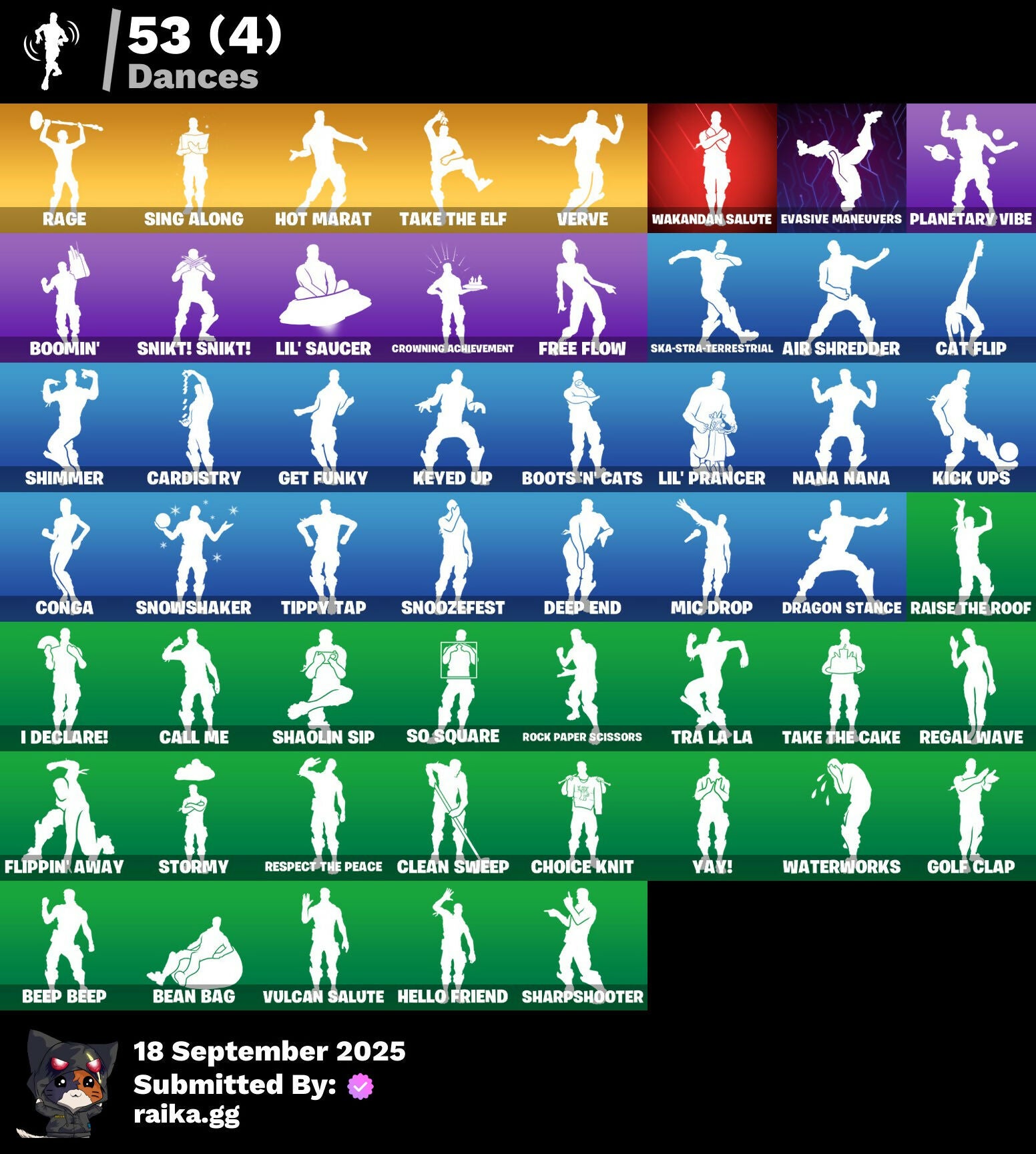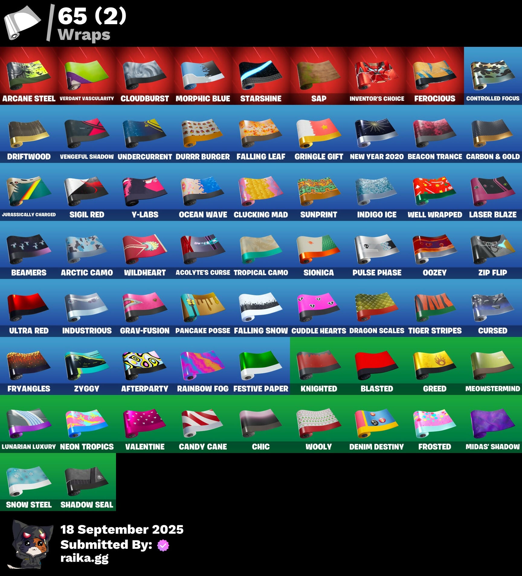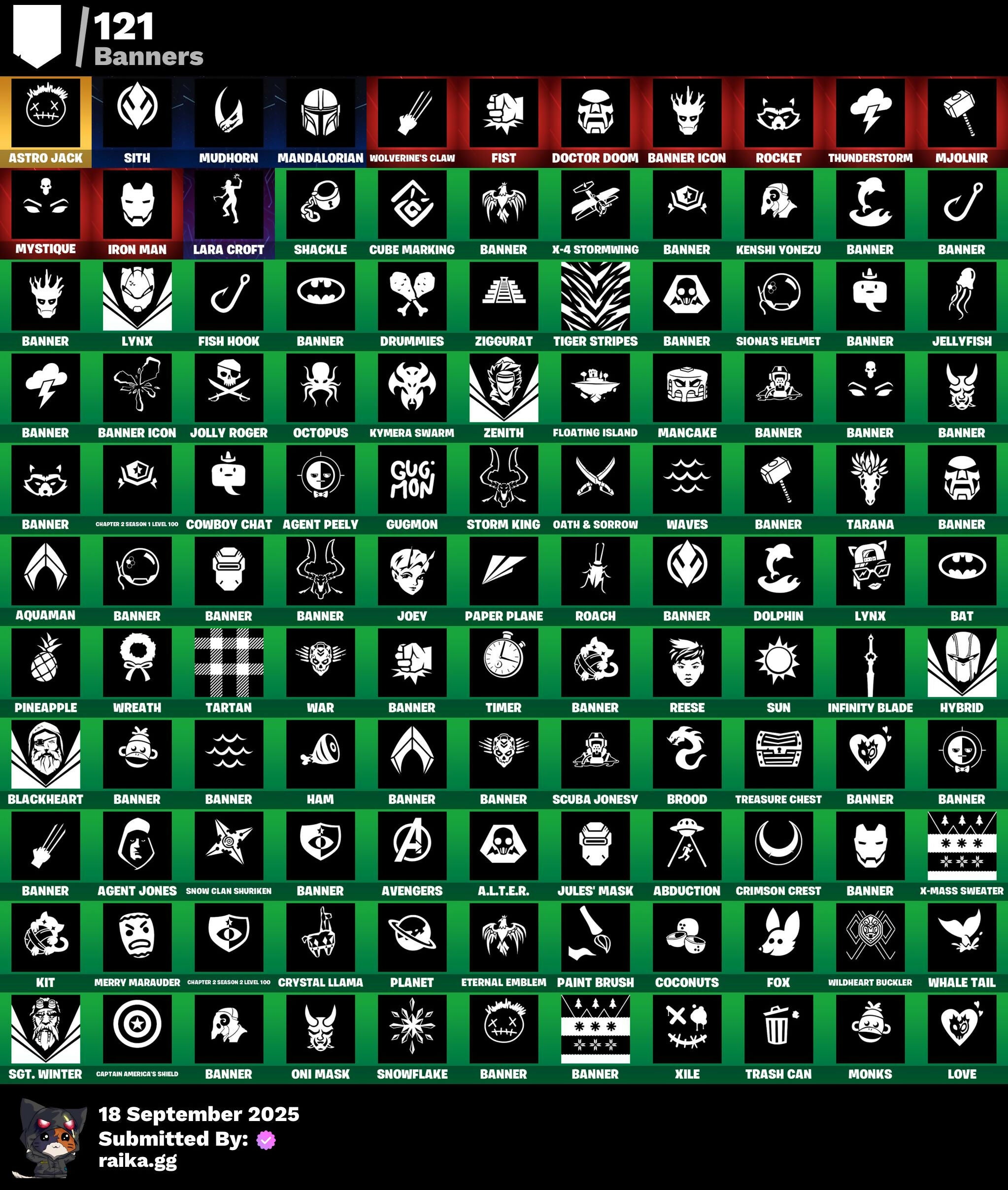 2020 Kickflip, 8-Ball, 999 Knives, A.L.T.E.R., Abduction, Abominable Axe, Acolyte's Curse, Aerial, Afterparty, Agent Jones, Agent Jones (Jump 31), Agent Peely, Air Shredder, Altitude, Ancestral Bloom, Aquaman, Aquaman's Trident, Arcane Energy Glider, Arcane Steel, Arctic Camo, Arroyo Pack, Arthur Curry, Astro Antidote, Astro Jack, Astroworld Cyclone, Aura, Avengers, Avengers Logo, Avengers Quinjet, Back Board, Bag Of Coal, Baited, Bananas, Bananaxe, Banner, Banner Icon, Base Jumper, Basecamp Bag, Bat, Batarang, Bawk Off, Beachcomber, Beacon Trance, Beamers, Bean Bag, Beastfang, Beef Blade, Beep Beep, Berserker Barrage, Birthday Slice, Blackheart, Blackheart (Stage 8), Blade Of The Waning Moon, Blade Raven, Blasted, Blustery Bag, Bobo, Bolt, Bone Patrol, Boomin', Boots 'N' Cats, Booty Buoy, Both Eyes Open, Boulder Breakers, Bounty 'Brella, Brain Freeze, Breakfast Bounty, Breathless Blades, Brella, Brite Bomber, Bronzed Scimitars, Brood, Bunker Basher, Butterfly, Cacodemon, Call Me, Candy Cane, Captain America's Shield, Carbon & Gold, Cardistry, Cash Grab, Cat Flip, Chainsaur, Chibi, Chic, Chillshot, Choice Knit, Chop Chop, Chop Dropper, Cinder, Classified, Clawz Retro, Clean Sweep, Cloud Llama Board, Cloudburst, Cluck, Clucking Mad, Cobra, Coconuts, Comet, Comet Crasher, Conga, Controlled Focus, Convergence, Cowboy Chat, Crabby King, Crescent Shroom, Crimson Crest, Crimson Wish, Crossfire, Crowning Achievement, Crunk Bunny, Crystal Axe Of The Masters, Crystal Llama, Cube Marking, Cuddle Hearts, Cuddle Team Hula, Cursed, Dance Mat, Deep Dive, Deep End, Denim Destiny, Dino Deck, Dive Knives, Doctor Doom, Doctor Doom (God Emperor), Dolphin, Doom Chalice, Doom's Cowl, Double Helix, Downpour, Dragon Scales, Dragon Stance, Dragon's Claw, Dread, Driftwood, Dropout, Drummies, Durrr Burger, Dying Light, Dynamo Grav-Suit, E.G.O., Eagle's Form, Eggar, Ember, Enchanted Lifebloom, Endless Scroll, Eon Blades, Equalizer, Eternal Emblem, Eternal Knight, Eternal Shield, Evasive Maneuvers, Everything's Fine, Fa-La-La-Llama, Fabled Cape, Fade, Fade Out, Fallen Love Ranger, Falling Leaf, Falling Snow, Fashion Accident Janky, Ferocious, Festive Paper, Field Flyer, Fish Hook, Fishstick Janky, Fishy Flier, Fist, Flapjack Flyer, Flippin' Away, Floating Island, Fortilla Flier, Foundational 'Brella, Fox, Free Flow, Frost Squad, Frosted, Frosty Globes, Fryangles, GG Ornament, GG Potion, GG Snakes, GG Snowman, Galactic Pack, Gathering Storm, Get Funky, Gilded Morphic Blades, Gilded Scepter, Glidurrr, Glyph Master, Golf Clap, Grav-Fusion, Greed, Gringle Gift, Groot, Groot (Silver Foil), Groot Glow, Groot's Sap Axes, Grumpy Tree, Guggi Was Here, Guggimon, Gugmon, Ham, Hammerhead, Hammers Of Justice, Hand Of Lightning, Happy, Har-Har-Har!, Hatch Pack, Heat Vision Hunter, Hello Friend, Holly Hatchets, Holographic, Hot Marat, Hunter's Skyblade, Hybrid, Hybrid (Stage 4), Hyperboard, I Declare!, Ice Cube, Indigo Ice, Industrious, Infinite Bloom, Infinity Blade, Infinity Gauntlet, Ink Wolf, Inside Out, Invasion, Inventor's Choice, Iron Man, Iron Man Backplate, Jellyfish, Jennifer Walters, Joey, Jolly Roger, Jones' Field Pack, Josie, Jules, Jules' Mask, Jurassically Charged, Kenshi Yonezu, Keyed Up, Kick Ups, King's Wrath, Kit, Kittanas, Knight's Helm, Knighted, Kondor, Kymera, Kymera Swarm, Kymera's Plasma Pak, Lara Croft, Laser Blaze, Legendary Blade Of Insight, Lexa, Lil' Kev, Lil' Prancer, Lil' Saucer, Lobby Classic, Lockpick, Lockstep, Love, Love Ranger, Low 'N Slow, Lt. Evergreen, Lunarian Luxury, Lunarios, Luxe, Lynx, Lynx (Stage 4 - No Ponytail), Mancake, Mandalorian, Mark 85 Energy Blade, Mark 90 Flight Pack, Masked, Masq Mark, Master Engineer, Master Key, Master Portal, Mave, Mave (Reactive Hair Off), Mecha Fish, Melting Snowman, Meowabunga!, Meowscles Janky, Meowstermind, Mercurial, Mermaid, Merry Fishmas, Merry Marauder, Mic Drop, Midas' Shadow, Mighty Marvel 'Brella, Millennium Falcon, Mini Moon, Mjolnir, Mjolnir Strike, Mjolnir's Path, Monks, Morphic Blue, Moth, Mudhorn, Mutiny, Mystique, Mystique's Skull, Nana Nana, Naughty Or Nice?, Ne'Jari Warhammer, Neon Cat, Neon Tropics, Neon Wings, New Year 2020, No Witnesses, Nyanja's Catpak, Oath & Sorrow, Ocean, Ocean Wave, Octopus, Ohm, Onesie, Onesie (Winter), Oni Mask, Oozey, Padlock, Paint Brush, Palm Leaf, Pancake Posse, Paper Plane, Patch Pack, Peeled, Peely, Peppermint Pick, Perfect Present, Pigskin, Pineapple, Pinpoint, Pirate Parrot, Pixel Ramirez, Planet, Planetary Vibe, Plunder, Polar Renegade, Porthole, Powder, Powder (White), Power Claws, Predator, Primal Hunter, Protector, Pry Axe, Psycho, Pulse Phase, Punk Ororo, Quack Pack, Rage, Rainbow Fog, Raise The Roof, Raz, Razor Crest, Re-Gifter, Reese, Regal Wave, Reliant Blades, Repulsor Blast, Respect The Peace, Rickety Runner, Riptide, Roach, Rock Love, Rock Paper Scissors, Rocket, Rocket Blaster, Ronin, Root Wing, Rotor, Royale Air, Ruin, Salty, Salvaged Chute, Sap, Sapling Groot, Scales Of Justice, Scorcher, Scratchmark, Scuba Jonesy, Season's Guffings, Seven Signet, Sgt. Green Clover, Sgt. Winter, Sgt. Winter Headgear, Shackle, Shadow Ghost, Shadow Seal, Shanta, Shanta's Lifebloom, Shaolin Sip, Sharpshooter, She-Hulk Smash, Shield Surprise, Shimmer, Shooting Starstaff, Shortbread Slicers, Sidewinder, Sigil Red, Sing Along, Siona, Siona's Helmet, Sionica, Sith, Ska-Stra-Terrestrial, Skeleton Key, Skellefish, Sky Serpents, Slam Dunk, Slayer Juice Wrld, Slayer's Helm, Sledgecracker, Slush-Faced, Smash O'-Lantern, Snakebite, Snikt! Snikt!, Snoozefest, Snow Clan Shuriken, Snow Steel, Snow Strike, Snowfall, Snowflake, Snowmando, Snowshaker, Snowy, So Square, Soaring Cipher, Spiderweb, Spirit's Pact, Spreading Chaos, Staff Of Doom, Star Strider, Star Surge, Starshine, Stay Smooth, Storm, Storm (Punk), Storm King, Stormy, Sun, Sunbird, Sunny, Sunny's Lander, Sunprint, Supreme Shell, Survivor's Pack, Swag Smasher, Tactical Sleigh, Take The Cake, Take The Elf, Tarana, Tarana (X-Tinction Armor), Tartan, Telemetry, T