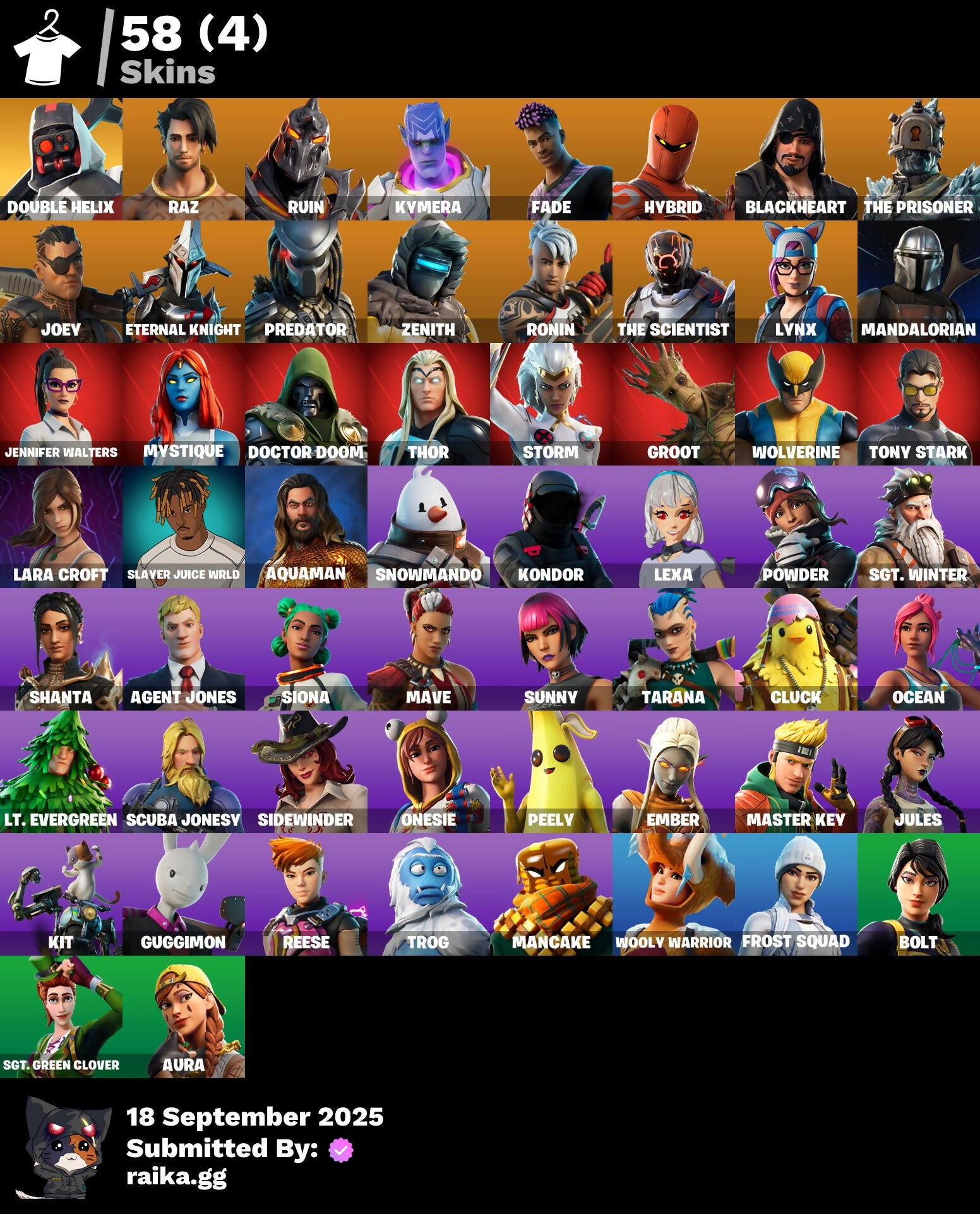 [PC/PSN/XBOX] 58 skins | Double Helix | Raz | Ruin | Kymera | Fade | Hybrid | Blackheart | The Prisoner | Joey | Eternal Knight | Predator | Zenith | Ronin | 250 VB / Fortnite