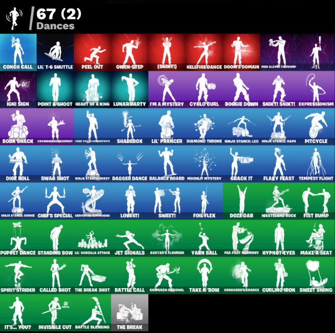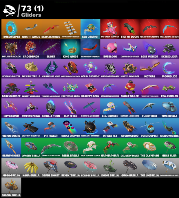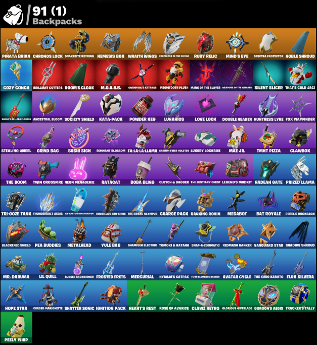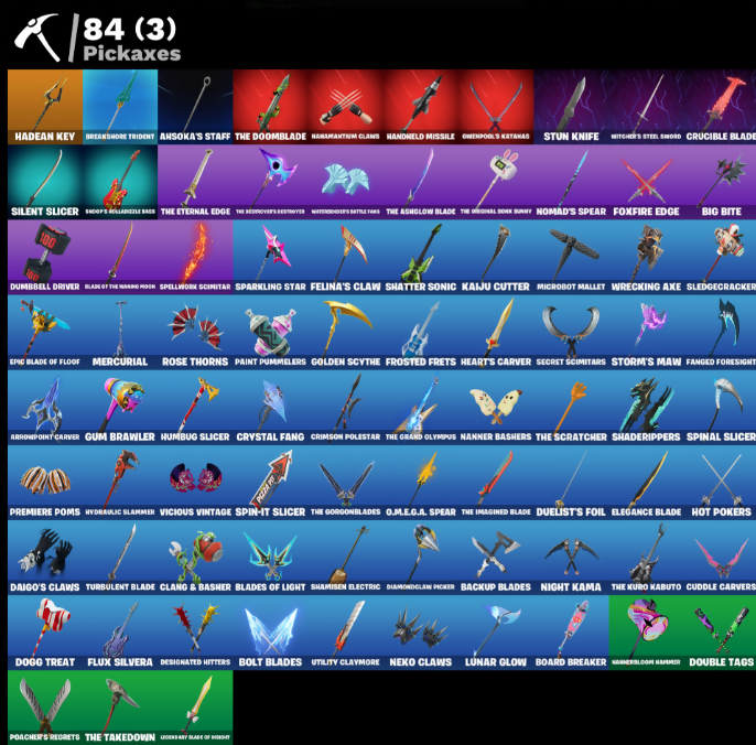 (Snikt!), Ahsoka's Staff, Ancestral Bloom, Antonia, Aphrodite, Arctic Adeline, Arrowpoint Carver, Artemis, Avatar Cycle, Avatar's Flourish, Backup Blades, Balance Board, Bat Royale, Battle Blessing, Battle Call, Baymax Wings, Big Bite, Blackened Shield, Blade of the Waning Moon, Blades of Light, Board Breaker, Boba Bling, Boba Snack, Bolt Blades, Boogie Down, Breakshore Trident, Brilliant Cutters, Bubloon, Bunsen Backburner, Cacodemon, Called Shot, Carbon Fiber Holster, Cerberus, Charge Pack, Chef's Special, Chronos Lock, Clang & Basher, Clawbox, Clawz Retro, Cliffside Soarer, Clutch & Dagger, Commanders Descent, Conch Call, Cozy Conch, Crack It, Crimson Polestar, Crowning Achievement, Crucible Blade, Crystal Fang, Cuddle Carvers, Curling Iron, Cursed Marionette, Cyclo Curl, Dagger Dance, Daigo, Daigo's Claws, Dark Charger, Dealer's Deck, Delivery Diver, Designated Hitters, Diamond Throne, Diamondclaw Picker, Dice Roll, Dogg Treat, Doom, Doom Brella, Doom Slayer, Doom's Cloak, Doom's Domain, Double Header, Double Tags, Doze Dab, Duelist's Foil, Dumbbell Driver, Dusk Knight, Dusty, Eclipse Brella, Elegance Blade, Emma Frost, Epic Blade of Floof, Era, Expressionism, Fa-La-La-Llama, Fanged Foresight, Felina's Claw, Fish Thicc, Fist Bump, Fist Of Doom, Flaky Feast, Flight Risk, Flip Flyer, Flux Silvera, Foil Flex, Four Elements Banner, Fox Wayfinder, Foxfire Edge, Frosted Frets, Geralt Of Rivia, Glorious Giftblade, Godzilla Evolved, Godzilla's Exo-Spine, Golden Scythe, Gorgon's Aegis, Grand Glacier Glider, Grind Bag, Gum Brawler, Gunn-Brella, Gwen-Step, Gwenpool, Gwenpools Katanas, Hadean Gate, Hadean Key, Handheld Missile, Har-Har-Har!, Heart Of A King, Heart's Carver, Heart's Rest, Heartwinder, Heist Flier, Hellfire Dance, Helsie, Hero Baymax, High Society Glider, Holiday Boxy, Hope, Hope Star, Hot Pokers, Humbug Slicer, Huntress Lyre, Hydraulic Slammer, Hypnot-Eyes, I Need You To Concentrate, I'm A Mystery, Ice Blasted Snow Grouch, Igni Sign, Ignition Pack, Imani, Infield Fly, Inflate-A-Roach, Invisible Cut, It's... You?, Jade, Jet Signals, Junker 'Brella, K.O. Cruiser, Kado Thorne, Kaiju Cutter, Kata-Pack, Kendo, Keri Commander, Khaby Lame, King Wings, Korra, Korra's Air Glider, Legend's Modkit, Legendary Blade of Insight, Lil Quill, Lil T-6 Shuttle, Lil' Godzilla Attack, Lil' Prancer, Lost Meteor, Love It!, Love Lock, Lunar Glow, Lunar Party, Lunarios, Luxury Lockbox, M.O.A.B.B., Mae, Mae Jr., Make A Seat, Mark of the Slayer, Mask Of Balance, Massai, Medusa, Mega-Brella, Megabot, Meowtooth Plush, Mercurial, Metalhead, Microbot Mallet, Mind's Eye, Mini Slayer Fistbump, Mistermondo's Battle Fans, Montague, Moonbow Breezer, Moonglide, Moonlit Mystery, Mothra, Mr. Daruma, Mystica, Nana-Brella, Nanner Bashers, Nannerbloom Hammer, Nanomantium Claws, Needle Dropper, Neko Claws, Nemesis Box, Neon Menagerie, Nezumi, Night Kama, Ninja Stance: Donnie, Ninja Stance: Leo, Ninja Stance: Mikey, Ninja Stance: Raph, Nisha, Noble Shroud, Nolan Chance, Nomad's Drifter, Nomad's Spear, Nyanja, Nyanja's Catpak, O.M.E.G.A. Spear, Oopsy Drones-Y, Oscar, Owenpool's Katanas, Paint Pummellers, Pea Buddies, Pea Part Harmony, Pea-Rigibles, Peabody, Peel Out, Peelverine, Peely Whip, Pellevrine Wings, Peppermint Paraglider, Peter Griffin, Petercopter, Pinata Brian, Piper Pace, Piq-Gwen Scooter, Pit Faller, Pitcycle, Poacher's Regrets, Point & Shoot, Poseidon, Powder Keg, Premiere Poms, Prized Llama, Protector Kaito, Protector of the Pledge, Puppet Dance, Puppet's Prowl, Ranking Ronin, Ratacat, Ratacat Roamer, Rebel Brella, Rebel's Rucksack, Red Robin's Wings, Redmask Ranker, Remix 'Brella, Remnant Blossom, Renzo The Destroyer, Rose Thorns, Rose of Avarice, Ruby Relic, Rust, Santa Dogg, Scarlet Longboard, Sea Chariot, Secret Scimitars, Selene, Serpentine Summoning, Seven Signet, Shadebox, Shaderippers, Shadow Blade Hope, Shadow Shroud, Shadow's Bite, Shamisen Electric, Shamisen-Sational, Shatter Sonic, Shogun 'Brella, Shoog's Bellazzle Bass, Silent Slicer, Skeleglider, Skull-A-Tron, Skycarver, Sledgecracker, Slider, Snakebite Keyring, Snap-a-Zoomatic, Snikt! Snikt!, Society Shield, Solid Snake, Sparkling Star, Spectra Protector, Spellwork Scimitar, Spin-It Slicer, Spinal Slicer, Spirit Strider, Standing Bow, Stealing Wheel, Storm's Maw, Stormcloud, Stray, Stun Knife, Sushi Sign, Swag Shot, Sweet Swing, Sweet!, Swole Sailer, TMNT Pizza, Take A 'Bow, Tempest Flight, That's Cold Jack!, The Ageless, The Ashglow Blade, The Bestiary Chest, The Boom, The Break, The Break Shot, The Doomblade, The Eternal Edge, The Gorgonblades, The Grand Olympus, The Imagined Blade, The Kuro Kabuto, The Machinist, The Night Rose, The Olympian, The Original Dork Bunny, The Peerless Parasol, The Runover's Detonator, The Scratcher, The Takedown, The Umbrella, The Vaultbrella, Thunder, Thunder & Lightning, Thunderbolt Aegis, Time Brella, Timesweeper, Tomoki & Katana, Tracker's Tally, Tri-oose Tank, Turbulent Blade, Twin Crossfire, Utility Claymore, Valeria, Vanguard Star, Vanguard's Charge, Vengeance Jones, Vicious Vintage, Victory Vaunter, Vision Board, War Force Wings, War Machine, Wasteland Rider, Wasteland Rock, Wasteland Speeder, Weapons of the Witcher, Whispering Wind, Wintry Whirligig, Witcher's Steel Sword, Woody's Rollerblade Road, Wraith Wings, Wrecking Axe, Yarn Ball, Yule Bag, Yulejacket, Zeus