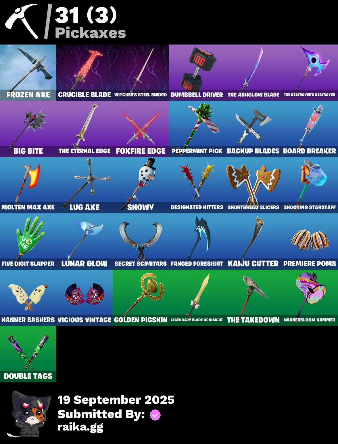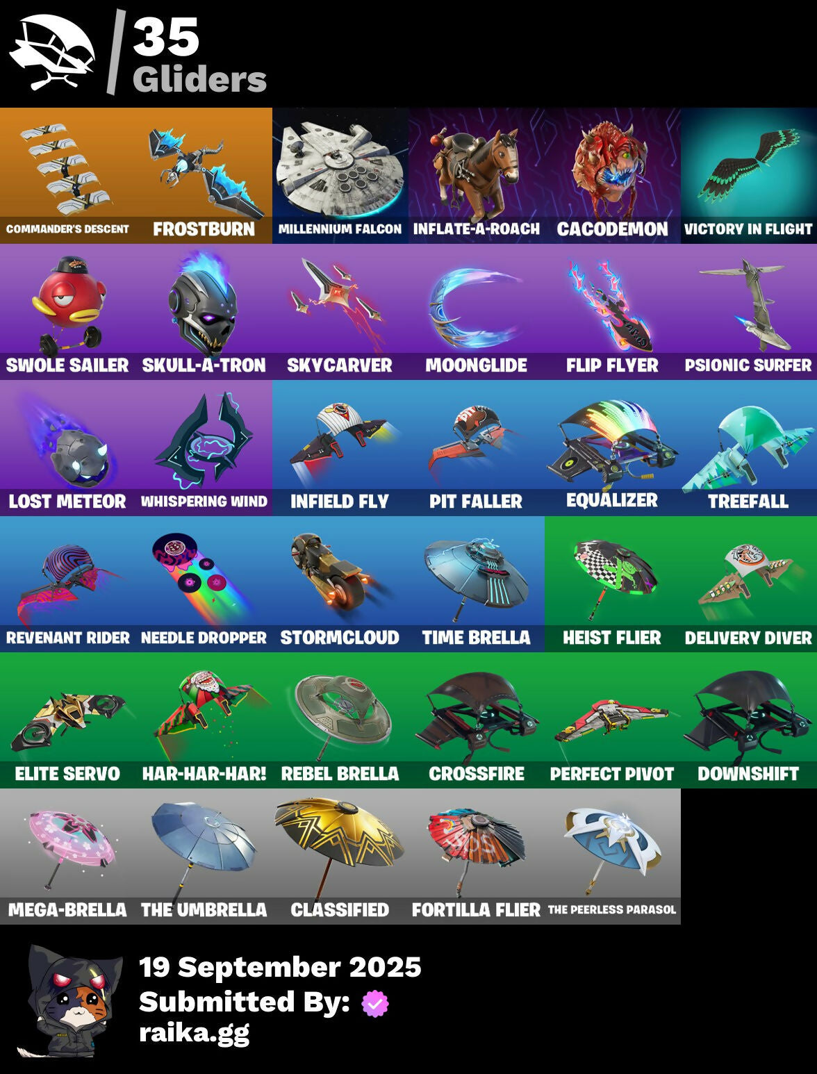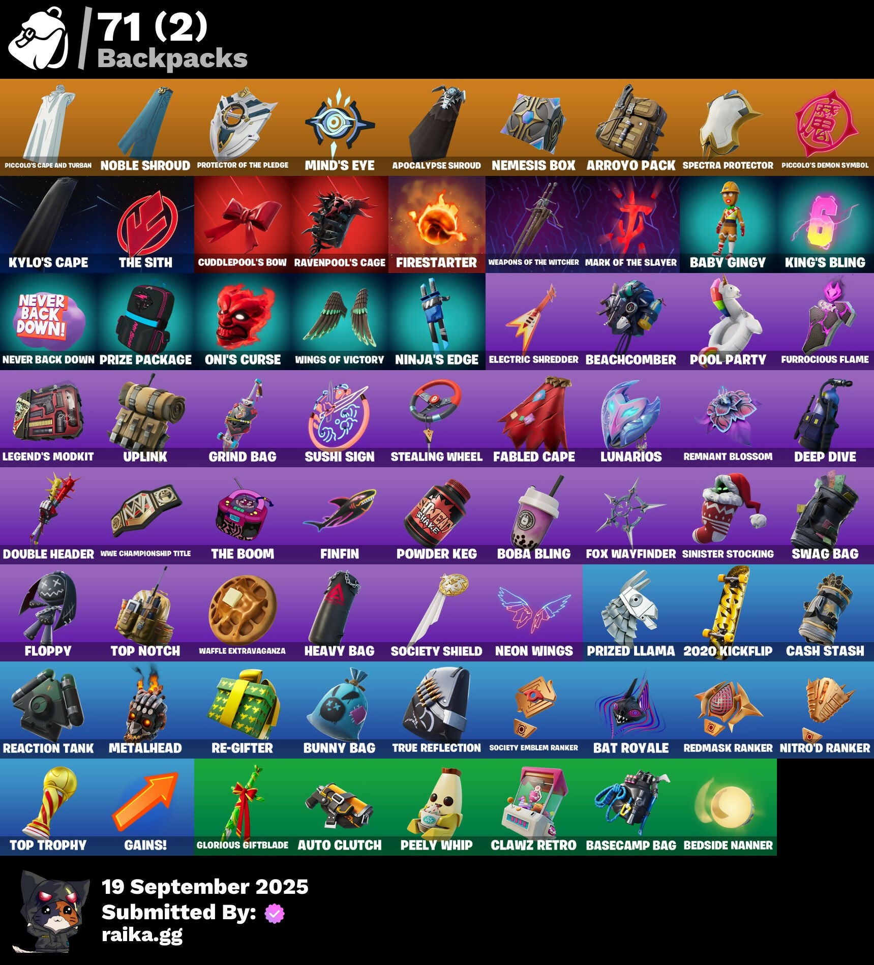 2020 Kickflip, Adonis Creed, Aerial, Afterparty, All-Nighter, Apocalypse Shroud, Arcade Cat, Arroyo Pack, Ascension Nezumi, Astro Armor, Aura, Auto Clutch, Axion Sentinel, Baby Gingy, Backup Blades, Balance Board, Banner, Banner Icon, Baseball, Basecamp Bag, Bat Royale, Beachcomber, Beast Blastin', Bedside Nanner, Big Bite, Black Hole, Blasted, Blaze, Blocko, Board Breaker, Boba Bling, Boba Snack, Boneyard Brand, Boogie Down, Boot It, Bounce Wit' It, Brite Bomber, Bruteball, Bullpen Brawler Dusty, Bunny Bag, Bushie Bright, Cacodemon, Call Me, Called Shot, Cash Grab, Cash Stash, Championship Jonesy, Chef's Special, Classified, Clawz Retro, Club President Helsie, Cobb, Comet, Commander's Descent, Contour Camo, Corrosive Stripe, Courageous Mikasa, Cowboy Chat, Crazy Castle, Creed's Gloves, Crossfire, Crucible Blade, Cuddlepool, Cuddlepool's Bow, Dark Side, Daywalker's Kata, Deep Dive, Delivery Diver, Demogorgon, Denied, Designated Hitters, Diamond Hanz, Don Of The Wastes, Doom Slayer, Double Header, Double Tags, Downshift, Doze Dab, Dumbbell Driver, Dusty, E.G.O., Easter Egg, Echo, Electric Shredder, Eleven, Elite Servo, Equalizer, Eren Jaeger, Escapees, Ex, Exile's Emblem, Expressionism, Fabled Cape, Fanged Foresight, Finfin, Firestarter, Fish Hook, Five Digit Slapper, Flip Flyer, Flippin' Away, Floating Island, Floppy, Foil Flex, Fortilla Flier, Fox Wayfinder, Foxfire Edge, Frostburn, Frozen Axe, Fryangles, Furrocious Flame, GG Ornament, GG Snakes, GG Snowman, Gains!, Gentleman's Dab, Geralt, Geralt Of Rivia, Get Griddy, Ghost Enforcer, Giannis Antetokounmpo, Gila Classic, Glorious Giftblade, Golden Pigskin, Grand Salute, Grind Bag, Ground Pound, Guild, Hammerhead, Hand of Trace, Har-Har-Har!, Haute Hustle, Have A Seat, Heavy Bag, Heist Flier, Helsie, High Stakes Club, Highwire Hop, Holiday Boxy, Hope's Look, Hopper, Horizon’s Call, Hot Marat, Hummingboard, Hunter Purple, Hypno-Bat, Hypnot-Eyes, I Need You To Concentrate, Igni Sign, Imani, In Da Party, Infield Fly, Inflate-A-Roach, Instinct, John Cena, Jujutsu Kaisen Emblem, Kaiju Cutter, King's Bling, Knight's Honor, Kon's Bark, Kylo Ren, Kylo's Cape, Laroi Free Style, Laroi's Tag, Lazarbeam, Leave A Scarr, Lebron James, Legend's Modkit, Legendary Blade of Insight, Lil' Prancer, Lobby Classic, Lost Meteor, Lt. Evergreen, Lug Axe, Lunar Glow, Lunar Party, Lunarian Luxury, Lunarios, Machinist In Control, Make A Seat, Mark Of The Champion, Mark of the Slayer, Massai, Massai Fire, Master Of Puppets, Master Plan, Mega-Brella, Menacing Trace, Metalhead, Millennium Falcon, Mind's Eye, Mini Slayer Fistbump, Molten Max Axe, Monks, Monstrous Hunger, Moonglide, Moonglow, Alight, Most Wanted, Mrbeast6000, Muscle Memory, Mystica, Nanner Bashers, Nannerbloom Hammer, Naughty Or Nice?, Needle Dropper, Nemesis Box, Neon Tendrils, Neon Wings, Never Back Down, New Year 2020, Nezumi, Nick Eh 30, Ninja, Ninja Style, Ninja's Edge, Nitehare, Nitro'd Ranker, Noble Shroud, Nolan Takes Aim, Oni's Curse, Ooh Yum!, Party Favor, Peely Whip, Peppermint Pick, Perfect Pivot, Phantom Meowscles, Piccolo, Piccolo's Cape and Turban, Piccolo's Demon Symbol, Pit Faller, Pixels Royale, Pizza Pit, Pizza Run, Pool Party, Powder Keg, Praetor Shroud, Premiere Poms, Prize Package, Prized Llama, Protector of the Pledge, Psionic Surfer, Rage Quit, Raider's Return, Rain Check, Ravenpool, Ravenpool's Cage, Re-Gifter, Reaction Tank, Rebel Brella, Red Jade, Redmask Ranker, Regal Wave, Remnant Blossom, Renzo The Destroyer, Respect The Peace, Revenant Rider, Rock Paper Scissors, Runway Racer, Scarlet Commander, Scimitar, Scrimmage Scrapper, Scuba Crystal, Season's Guffings, Secret Scimitars, Selene, Shadow Enforcer, Shaolin Sip, Shooting Starstaff, Shortbread Slicers, Sinister Stocking, Sith, Skipper, Skull Trooper, Skull-A-Tron, Skycarver, Slap Juice, Slayer's Helm, Slayer's Mark, Slurp Co., Slush-Faced, Slushy Sneak, Snowshaker, Snowy, So Square, Society Emblem Ranker, Society Shield, Spectra Protector, Spectrakinetic, Spiderweb, Spidey Landing, Standing Bow, Starry Sockets, Stay Afloat, Stay Smooth, Stealing Wheel, Stormcloud, Stray, Stray Fox, Stray's Side Eye, Summit Striker, Sunlit Selene, Superstar Celebration, Sushi Sign, Swag Bag, Sweet!, Swing Away, Swole Sailer, Sypherpk, Take The Elf, The Ace, The Ageless, The Ageless Champion, The Ashglow Blade, The Awakening, The Boom, The Destroyer's Destroyer, The Eternal Edge, The Oathbound Crest, The Oathbound Empire, The Peerless Parasol, The Sith, The Takedown, The Umbrella, Thrasher Massai, Thunder, Time Brella, Titan Run: Freestyle, Titan Run: Rampage, Titan Run: Rush, Toosie Slide, Top Notch, Top Trophy, Treefall, True Reflection, U Can't C Me, Undercurrent, Uplink, Verve, Vicious Vintage, Victory Brawl, Victory In Flight, Viking Ship, Vinyl, Viper School, WWE Championship Title, Waffle Extravaganza, Weapons of the Witcher, Well Wrapped, Whispering Wind, Wilder, Wings of Victory, Winterfest Bushranger, Winterfest Flurry, Witcher's Dawn, Witcher's Steel Sword, Wooly Warrior, X-4 Stormwing, Yule Trooper, Zany