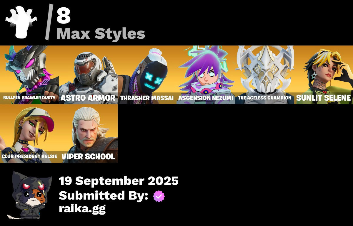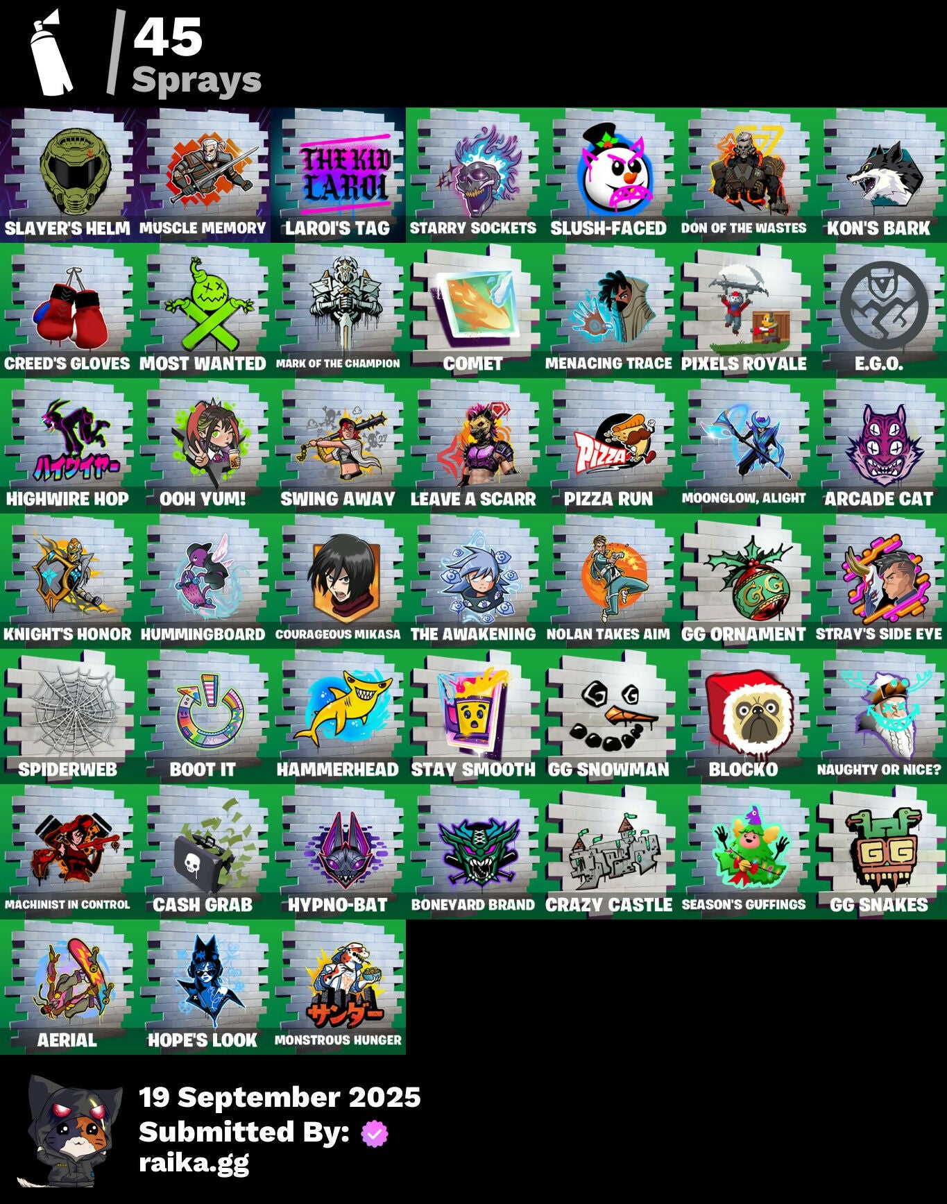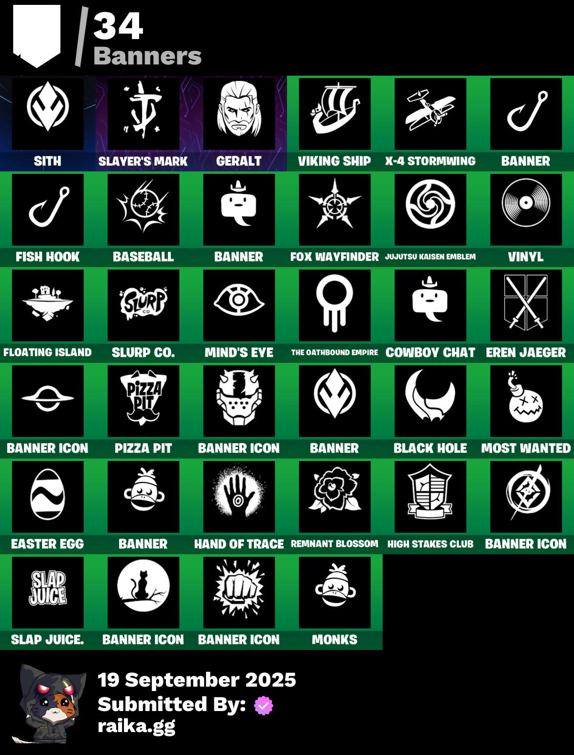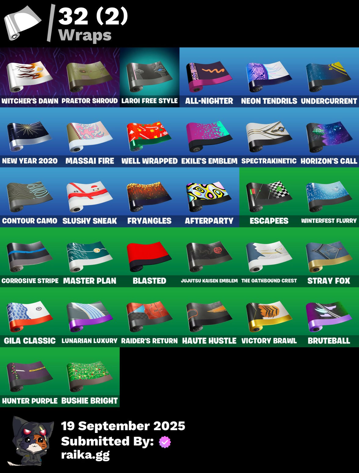 2020 Kickflip, Adonis Creed, Aerial, Afterparty, All-Nighter, Apocalypse Shroud, Arcade Cat, Arroyo Pack, Ascension Nezumi, Astro Armor, Aura, Auto Clutch, Axion Sentinel, Baby Gingy, Backup Blades, Balance Board, Banner, Banner Icon, Baseball, Basecamp Bag, Bat Royale, Beachcomber, Beast Blastin', Bedside Nanner, Big Bite, Black Hole, Blasted, Blaze, Blocko, Board Breaker, Boba Bling, Boba Snack, Boneyard Brand, Boogie Down, Boot It, Bounce Wit' It, Brite Bomber, Bruteball, Bullpen Brawler Dusty, Bunny Bag, Bushie Bright, Cacodemon, Call Me, Called Shot, Cash Grab, Cash Stash, Championship Jonesy, Chef's Special, Classified, Clawz Retro, Club President Helsie, Cobb, Comet, Commander's Descent, Contour Camo, Corrosive Stripe, Courageous Mikasa, Cowboy Chat, Crazy Castle, Creed's Gloves, Crossfire, Crucible Blade, Cuddlepool, Cuddlepool's Bow, Dark Side, Daywalker's Kata, Deep Dive, Delivery Diver, Demogorgon, Denied, Designated Hitters, Diamond Hanz, Don Of The Wastes, Doom Slayer, Double Header, Double Tags, Downshift, Doze Dab, Dumbbell Driver, Dusty, E.G.O., Easter Egg, Echo, Electric Shredder, Eleven, Elite Servo, Equalizer, Eren Jaeger, Escapees, Ex, Exile's Emblem, Expressionism, Fabled Cape, Fanged Foresight, Finfin, Firestarter, Fish Hook, Five Digit Slapper, Flip Flyer, Flippin' Away, Floating Island, Floppy, Foil Flex, Fortilla Flier, Fox Wayfinder, Foxfire Edge, Frostburn, Frozen Axe, Fryangles, Furrocious Flame, GG Ornament, GG Snakes, GG Snowman, Gains!, Gentleman's Dab, Geralt, Geralt Of Rivia, Get Griddy, Ghost Enforcer, Giannis Antetokounmpo, Gila Classic, Glorious Giftblade, Golden Pigskin, Grand Salute, Grind Bag, Ground Pound, Guild, Hammerhead, Hand of Trace, Har-Har-Har!, Haute Hustle, Have A Seat, Heavy Bag, Heist Flier, Helsie, High Stakes Club, Highwire Hop, Holiday Boxy, Hope's Look, Hopper, Horizon’s Call, Hot Marat, Hummingboard, Hunter Purple, Hypno-Bat, Hypnot-Eyes, I Need You To Concentrate, Igni Sign, Imani, In Da Party, Infield Fly, Inflate-A-Roach, Instinct, John Cena, Jujutsu Kaisen Emblem, Kaiju Cutter, King's Bling, Knight's Honor, Kon's Bark, Kylo Ren, Kylo's Cape, Laroi Free Style, Laroi's Tag, Lazarbeam, Leave A Scarr, Lebron James, Legend's Modkit, Legendary Blade of Insight, Lil' Prancer, Lobby Classic, Lost Meteor, Lt. Evergreen, Lug Axe, Lunar Glow, Lunar Party, Lunarian Luxury, Lunarios, Machinist In Control, Make A Seat, Mark Of The Champion, Mark of the Slayer, Massai, Massai Fire, Master Of Puppets, Master Plan, Mega-Brella, Menacing Trace, Metalhead, Millennium Falcon, Mind's Eye, Mini Slayer Fistbump, Molten Max Axe, Monks, Monstrous Hunger, Moonglide, Moonglow, Alight, Most Wanted, Mrbeast6000, Muscle Memory, Mystica, Nanner Bashers, Nannerbloom Hammer, Naughty Or Nice?, Needle Dropper, Nemesis Box, Neon Tendrils, Neon Wings, Never Back Down, New Year 2020, Nezumi, Nick Eh 30, Ninja, Ninja Style, Ninja's Edge, Nitehare, Nitro'd Ranker, Noble Shroud, Nolan Takes Aim, Oni's Curse, Ooh Yum!, Party Favor, Peely Whip, Peppermint Pick, Perfect Pivot, Phantom Meowscles, Piccolo, Piccolo's Cape and Turban, Piccolo's Demon Symbol, Pit Faller, Pixels Royale, Pizza Pit, Pizza Run, Pool Party, Powder Keg, Praetor Shroud, Premiere Poms, Prize Package, Prized Llama, Protector of the Pledge, Psionic Surfer, Rage Quit, Raider's Return, Rain Check, Ravenpool, Ravenpool's Cage, Re-Gifter, Reaction Tank, Rebel Brella, Red Jade, Redmask Ranker, Regal Wave, Remnant Blossom, Renzo The Destroyer, Respect The Peace, Revenant Rider, Rock Paper Scissors, Runway Racer, Scarlet Commander, Scimitar, Scrimmage Scrapper, Scuba Crystal, Season's Guffings, Secret Scimitars, Selene, Shadow Enforcer, Shaolin Sip, Shooting Starstaff, Shortbread Slicers, Sinister Stocking, Sith, Skipper, Skull Trooper, Skull-A-Tron, Skycarver, Slap Juice, Slayer's Helm, Slayer's Mark, Slurp Co., Slush-Faced, Slushy Sneak, Snowshaker, Snowy, So Square, Society Emblem Ranker, Society Shield, Spectra Protector, Spectrakinetic, Spiderweb, Spidey Landing, Standing Bow, Starry Sockets, Stay Afloat, Stay Smooth, Stealing Wheel, Stormcloud, Stray, Stray Fox, Stray's Side Eye, Summit Striker, Sunlit Selene, Superstar Celebration, Sushi Sign, Swag Bag, Sweet!, Swing Away, Swole Sailer, Sypherpk, Take The Elf, The Ace, The Ageless, The Ageless Champion, The Ashglow Blade, The Awakening, The Boom, The Destroyer's Destroyer, The Eternal Edge, The Oathbound Crest, The Oathbound Empire, The Peerless Parasol, The Sith, The Takedown, The Umbrella, Thrasher Massai, Thunder, Time Brella, Titan Run: Freestyle, Titan Run: Rampage, Titan Run: Rush, Toosie Slide, Top Notch, Top Trophy, Treefall, True Reflection, U Can't C Me, Undercurrent, Uplink, Verve, Vicious Vintage, Victory Brawl, Victory In Flight, Viking Ship, Vinyl, Viper School, WWE Championship Title, Waffle Extravaganza, Weapons of the Witcher, Well Wrapped, Whispering Wind, Wilder, Wings of Victory, Winterfest Bushranger, Winterfest Flurry, Witcher's Dawn, Witcher's Steel Sword, Wooly Warrior, X-4 Stormwing, Yule Trooper, Zany