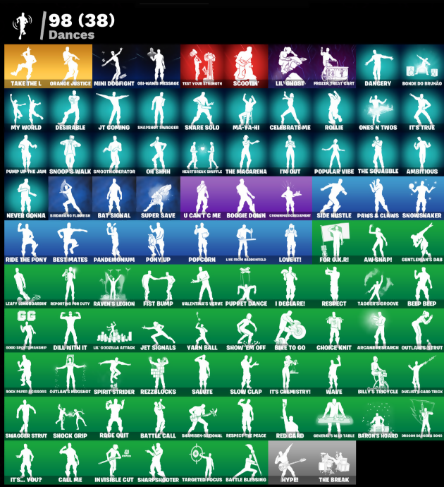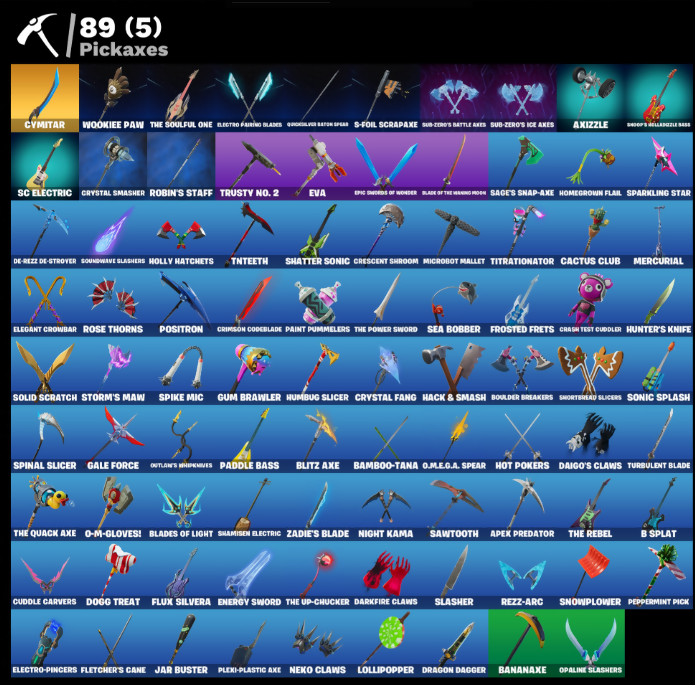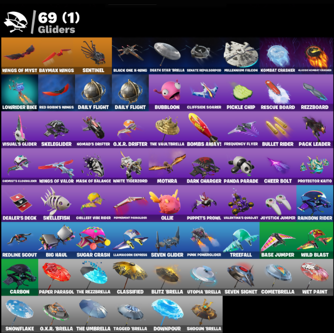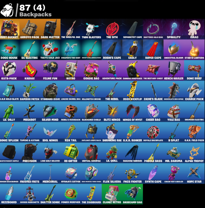 2020 Kickflip, Adventure Pack, Agent Patch, Agent Peely, Alpha Trophy, Ambitious, Ancestral Bloom, Apex Predator, Arcane Research, Arrovo Pack, Astro, Aw-Snap!, Axizzle, B Splat, Back-Mounted Turbo Tower, Bamboo Patch, Bamboo-Tana, Banana Briefcase, Bananaxe, Baron's Hoard, Base Jumper, Basecamp Bag, Bat Signal, Battle Blessing, Battle Call, Battle Gamer Mae, Battlehawk, Beep Beep, Best Mates, Big Dill, Big Haul, Bike To Go, Billy's Tricycle, Birdbang Flourish, Black One X-Wing, Blackened Shield, Blade of the Weeping Moon, Blades of Light, Blitz 'brella, Blitz Axe, Blitz Wings, Bombs Away!, Bonde Do Brunão, Bone Brief, Boogie Down, Boulder Breakers, Brutus, Bubbloon, Bullet Rider, Cactus Club, Call Me, Carbide, Carbon, Cassidy Quinn, Celebrate Me, Charge Pack, Cheer Bag, Cheer Bolt, Chemist's Cloudglider, Chillest Vibe Rider, Choice Knit, Classified, Clawz Retro, Cliffside Soarer, Cometbrella, Crash Test Cuddler, Crescent Shroom, Crimson Codeblade, Crowns And Floorwipes, Crystal Fang, Crystal Smasher, Cuddle Carvers, Cursed Marionette, Cymitar, Daigo, Daigo’s Claws, Daily Flight, Dancery, Dark Charger, Dark Doggo, Dark Matter, Dark Voyager, Darkfire Claws, De-Rezz De-Stroyer, Deadpool, Dealer's Deck, Death Star 'Brella, Desirable, Dilu With It, Dogg House, Dogg Treat, Downpour, Dragon Bones Solo, Dragon Dagger, Dreamer's Two-Shot, Duelist's Card Trick, Dusk Knight, Eagly, Electro Pairing Blades, Electro-Pincers, Elegant Crowbar, Energy Sword, Epic Swords of Wonder, Eva, FNCS Fighter, Feline Fun, Fist Bump, Fletcher Kane, Fletcher’s Cane, Flux Silvera, For O.K.R.!, Frequency Flyer, Frosted Frets, Frozen Treat Cart, Gale Force, Game Knight, Gear Specialist Maya, General's War Table, Gentleman's Dab, Godzilla Evolved, Godzilla's Exo-Spine, Good Sportsmanship, Goodie Bag, Green Ranger, Gum Brawler, Hack & Smash, Haylee Skye, Heartbreak Shuffle, Hench Hauler, Hero Baymax, Holly Hatchets, Homegrown Flail, Hope Star, Hot Pokers, Humbug Slicer, Hunter’s Knife, Hype!, I Declare!, I'm Out, Idol Wings, Invisible Cut, Isaac, It's Chemistry!, It's True, It's... You?, JT Coming, Jade, Jar Buster, Jet Signals, Joss, Joystick Jumper, Kabag!, Kata-Pack, Keisha Cross, Kendo, Killswitch, Killswitch Drone, Klassic Kombat Crasher, Kombat Crasher, Krisabelle, Leafy Longboardin', Lightrider, Lil Quill, Lil' Dilly, Lil' Ghost, Lil' Godzilla Attack, Live From Headontfeld, Llamacorn Express, Loaded Barrel Bag, Lollipopper, Lone Wolf Holster, Love It!, Lowrider Bike, Lt. Evergreen, Lt. Ripp Slade, Ma-Va-Hi, Mask Of Balance, Megabot, Meowscles, Mercurial, Michael Myers, Microbot Mallet, Millennium Falcon, Mini Dogfight, Mission Specialist, Moonwalker, Morgan Myst, Mothra, Mr. Daruma, My World, Neko Claws, Never Gonna, Night Kama, Nomad's Drifter, Nyanja, Nyanja's Catpak, O-M-Gloves!, O.M.E.G.A. Spear, O.X.R Holo-Slate, O.X.R. 'brella, O.X.R. Drifter, O.X.R. Field Pack, O.X.R. Ranker, Obi-Wan's Message, Oh Shhh, Ollie, One's N Twos, Onyx Winter, Opaline Slashers, Orange Justice, Outlaw Midas, Outlaw's Knife Rack, Outlaw's Mojshot, Outlaw's Strut, Outlaw’s Whipknives, Pack Leader, Paddle Bass, Paint PummelerS, Panda Parade, Pandemonium, Paper Parasol, Paws & Claws, Peppermint Paraglider, Peppermint Pick, Pickle Chip, Plexi-Plastic Axe, Polar Peely, Pony Up, Popcorn, Popular Vibe, Positron, Power Morpher, Precision, Protector Kaito, Pump Up The Jam, Punk Powerglider, Puppet Dance, Puppet's Prowl, Quicksilver Baton Spear, R3X Tail, Rage Quit, Rainbow Rider, Raven's Legion, Re-Gifter, Rebel's Rucksack, Red Card, Red Robin's Wings, Redline Scout, Reporting For Duty, Rescue Board, Respect, Respect The Peace, Rezz Blocks, Rezz-Arc, Rezzboard, Ride The Pony, Robin, Robin's Cape, Robin’s Staff, Rock Paper Scissors, Rollie, Rose Thorns, Royale Backplate, Rust Bucket, Rust Lord, S-Foil Scrapaxe, SC Electric, Sage, Sage’s Snap-Axe, Salute, Santa Dogg, Sawtooth, Scootin', Sea Bobber, Senate Repulsorpod, Sentinel, Separatist Cape, Seven Glider, Seven Signet, Shadow Blade Hope, Shadow Shroud, Shamisen Electric, Sharpshooter, Shatter Sonic, Shattered Halo Ring, Shawisen-Sational, Shinji, Shock Grip, Shogun 'brella, Shoop's Holiday Blaster Bass, Shortbread Slicers, Show 'Em Off, Shrinking Rae, Side Hustle, Silver Mind, Skate Pocket Duffle, Skeleglider, Skellefish, Slasher, Slow Clap, Smooth Operator, Snapshot Swagger, Snare Solo, Snoop Dogg, Snoop's Walk, Snoop’s Holliglide Bass, Snowflake, Snowplower, Snowshaker, Solid Scratch, Sonic Splash, Soundwave Slashers, Sparkling Star, Spike Mic, Spinal Slicer, Spinality, Spirit Strider, Stab-O-Lantern, Standard Issue, Storm’s Maw, Sub-Zero (MK3), Sub-Zero’s Battle Axes, Sub-Zero’s Ice Axes, Sugar Crash, Sultura, Super Cape, Super Save, Superman, Swagger Strut, Synth Cape, Synthwave, Tagged 'brella, Tagger's Groove, Take The L, Targeted Focus, Teknique, Test Your Strength, That's Cold Jack!, The Bestiary Chest, The Break, The Macarena, The Night Rose, The Power Sword, The Quack Axe, The Rebel, The Rezzbrella, The Sith, The Soulful One, The Squabble, The Umbrella, The Up-Chucker, The Vaultbrella, The Ziggboard, Titrationator, Tnteeth, Tntina, Tomoki & Katana, Treefall, Trusty No. 2, Turbulent Blade, Twin Blasters, U Can't C Me, UNSC Spartan, Unseen Backburner, Utopia 'brella, Valentina, Valentina's Quadjet, Valentina's Verve, Vanguard Zadie, Virtual Servpak, Visual's Glider, Voo-Mi, Wave, Wet Paint, White Tigerzord, Wild Blast, Wings Of Myst Baymax Wings, Wings Of Valor, Wings of Myst, Wookiee Paw, Wooly Warrior, Yarn Ball, Yule Bag, Yulejacket, Zadie's Blade, Zadie’s Blade, Ziggy, Zoey