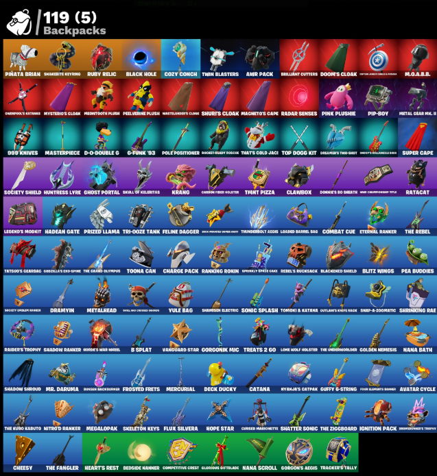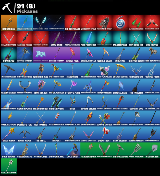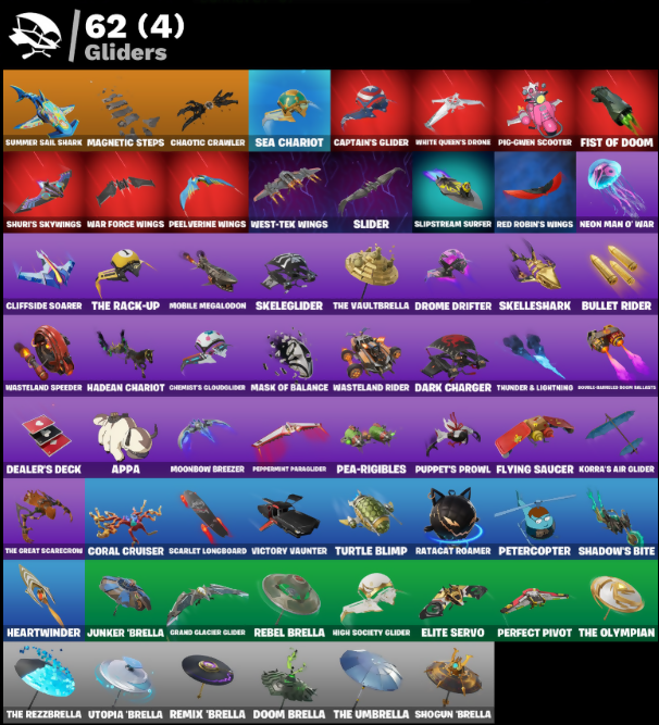 (Snikt!), 1-Ball, 999 Knives, Aphrodite, Appa, Arrowpoint Carver, Artemis, Assaulttron Blade, Avatar Cycle, Avatar's Flourish, Awr Pack, Azuki, B Splat, Baron's Hoard, Bedside Nanner, Bitev, Black Hole, Blackened Shield, Blitz Wings, Board Crasher, Bolt Blades, Bomb Bouquet, Boogie Down, Breakshore Trident, Brilliant Cutters, Bring It Around, Brite Moves, Brite Raider, Bullet Rider, Cake Clobberer, Capitan America Shield & Helmet, Captain Almerica, Captain Jones, Captain's Glider, Carbon Fiber Holster, Catana, Cauldron Chill, Cerberus, Champion Siren, Chaos Director, Chaotic Crawler, Charge Pack, Cheesy, Chemist's Cloudglider, Clang & Basher, Clawbox, Cliffside Soarer, Codewright Cleanup, Cold Snap, Combat Cue, Competitive Crest, Conch Call, Coral Cruiser, Cozy Conch, Crimson Polestar, Crimson Sai, Crowning Achievement, Crystal Fang, Crystal Smasher, Cuddle Carvers, Cursed Marionette, D-O-Double G, Daredevil, Dark Charger, Deadpool's Katana, Deadpool's Third Shot, Dealer's Deck, Deck Ducky, Diamond Throne, Diamondclaw Picker, Disassemble, Dobermans Trophy, Dogg Treat, Don's Dominator, Donatello, Donnie's Bo Sheath, Donnie's Bo Staff, Doom, Doom Brella, Doom's Cloak, Doom's Domain, Dramyin, Drome Drifter, Duelist's Foil, Dynamotntina, Electro Parking Blades, Elite Servo, Ember Pick, Emma Frost, Epic Blade of Floof, Eternal Ranker, Fancy Footwork, Felina, Felina's Claw, Feline Dagger, Fiendish Wand, Fire Show, Fireworks Salvo, Fist Bump, Fist Of Doom, Flux Silvera, Flying Saucer, Foil Flex, Four Elements Banner, Frosted Frets, Full Googly, G-Funk '93, Ghost Portal, Glorious Giftblade, Goated, Godzilla's End-Spine, Golden Nemesis, Golden Scythe, Gorgon's Aegis, Gorgonik Mic, Grand Glacier Glider, Greenpools Katanas, Guffy G-String, Gwen-Step, Gwenpool, Gwenpool's Katanas, Hadean Chariot, Hadean Gate, Hadean Key, Hades, Hana, Handheld Missile, Hastelander's Cloak, Heart's Carver, Heart's Rest, Heartwinder, Helichopper, Hellfire Dance, High Society Glider, Holiday Boxy, Hope, Hope Star, Hot Pokers, Humbug Slicer, Huntress Lyre, Hyanja's Catpak, Hydraulic Slammer, I'm A Mystery, Ice Breaker, Ignition Pack, Illusionist's Blades, Jet Signals, John Cena, Joltara, Junker 'Brella, Knife Sharpener, Korra, Korra's Air Glider, Krang, LBC '93 Dogg, Legend's Modkit, Lewis Hamilton, Lo-Fi Headbang, Loaded Barrel Bag, Lone Wolf Holster, M.O.A.B.B., Magnetic Steps, Magnetized Scrap, Magneto's Cape, Make A Seat, Mask Of Balance, Masterpiece, Medusa, Megalo Don, Megalopak, Meowdas, Mercurial, Metal Gear Mk. II, Metalhead, Microbot Mallet, Mobile Megalodon, Montague, Moonbow Breezer, Moonlit Mystery, Mr. Daruma, My Cabbages!, Mysterio, Mysterio's Cloak, Mysterio's Magic Trick, Namamantium Claws, Nana Bath, Nana Scroll, Neon Man O' War, Neon Reaver, Night Kama, Ninja Stance: Donnie, Ninja Stance: Leo, Ninja Stance: Mikey, Ninja Stance: Raph, Nisha, Nitro'd Ranker, Nyan Claws, O.M.E.G.A. Spear, Oscar, Outlaw's Knife Rack, Outlaw's Whipknives, Paint Pummellers, Parade Riffs, Party Hips, Patty Whacker, Pea Buddies, Pea Part Harmony, Pea-Rigibles, Peabody, Peel Out, Peel Verine Plush, Peelverine, Peelverine Wings, Peppermint Paraglider, Perfect Pivot, Peter Griffin, Petercopter, Pig-Gwen Scooter, Pinata Brian, Pink Plushie, Pip-Boy, Pj Pepperoni, Poacher's Regrets, Pole Podertion, Pole Positioner, Popular Vibe, Poseidon, Prized Llama, Puppet's Prowl, Purr-Demonium, Quicksaver Baton Spear, Radar Senses, Rage Quit, Raider's Trophy, Ranking Ronin, Ratacat Roamer, Ratcat, Rebel Brella, Rebel's Rucksack, Red Robin's Wings, Redwot Tooth Plush, Remix 'Brella, Resistance Thumbs Up, Rhodes War Wheel, Rhythm Of Chaos, Ringmaster Scarr, Rocket-Ready Rocks, Ruby Relic, Rust, Santa Dogg, Scarlet Commander, Scarlet Longboard, Scootin' Circles, Sea Chariot, Secret Scimitars, Serpentine Pummeling, Shadebox, Shaderippers, Shadow Ranker, Shadow Shroud, Shadow's Bite, Shamisdi Electric, Shamisen Electric, Shatter Sonic, Shock-Module Rush Jet, Shogun 'Brella, Show 'Em Off, Shrinking Rae, Shuri, Shuri's Cloak, Shuri's Skywings, Skatemonster, Skeleglider, Skeleton Keys, Skelleshark, Skull Trooper, Skull and Crossed Shadows, Skull of Keleritas, Skully Sceptre, Slayer Juice Wrld, Slider, Slipstream Surfer, Snakebite Keyring, Snap-A-Zoomatic, Snoop's Walk, Social Climber, Society Emblem Rumblers, Society Shield, Solid Snake, Sonic Splash, Sonka's Space Sword, Sparkling Star, Spiked Baton-Mace, Spinal Slicer, Sprinkly Space Cake, Star Wand, Storm's Maw, Stun Knife, Summer Sail Shark, Sunzen Backpacker, Super Cape, Sweet Swing, T-60 Power Armor, TMNT Pizza, Tagger's Groove, Take A Bow, Tatsuo, Tatsuo's Gearbag, Tempest Flight, That's Cold Jack!, The Break, The Break Shot, The Doomblade, The Fangler, The Gilded Filet, The Gorgonblades, The Grand Olympus, The Great Scarecrow, The Kuro Kabuto, The Machinist, The Olympian, The Rack-Up, The Rebel, The Rezzbrella, The Scratcher, The Squabble, The Takedown, The Umbrella, The Underworlder, The Underworldlord, The Vaultbrella, The Ziggboard, Thunder & Lightning, Thunderbolt Aegis, Tomoki & Katana, Toon Meowscles, Toona Can, Top Dogg Kit, Tracker's Tally, Treats 2 Go, Tri-Ooze Tank, Tricksy, Turbulent Blade, Turtle Blimp, Twin Blasters, Undercover Skye, Utopia 'Brella, Valeria, Vanguard Star, Vanguard's Charge, Vengeance Jones, Vibranium Spear, Vicblends, Victory Vaunter, War Force Wings, War Machine, Wasteland Rider, Wasteland Rock, Wasteland Speeder, Wastelander Magneto, West-Tek Wings, White Queen's Drone, Wick Commentstifle, Winterfest Bushranger, Wrecking Axe, You're A Winner, Yule Bag, Yulejacket, Zero, Zeus