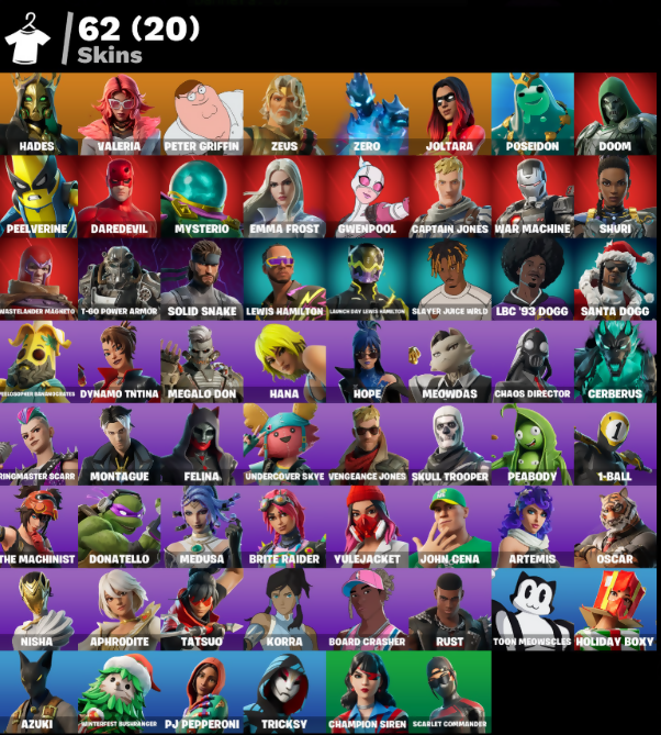 [PC/PSN/XBOX] 62 SKINS | Hades | Valeria | Peter Griffin | Zeus | Zero | Joltara | Poseidon | Doom | Peelverine | Daredevil | Mysterio | Emma Frost