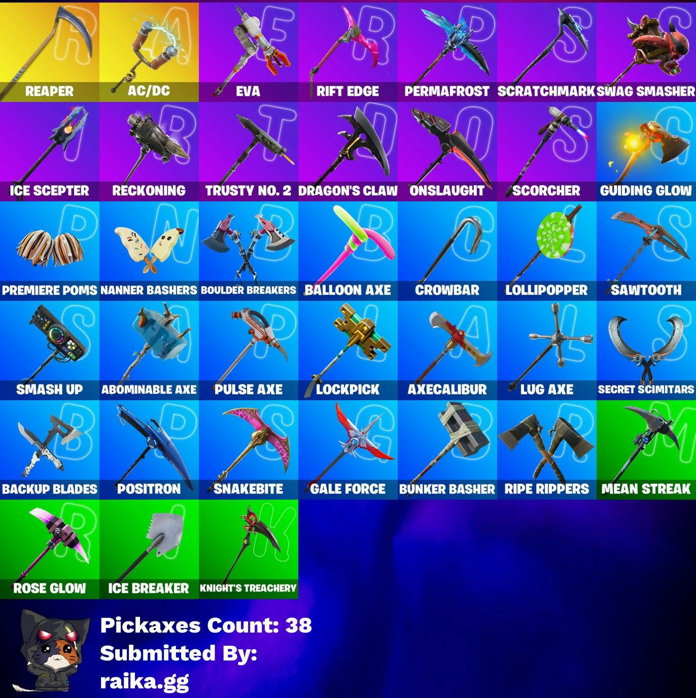 Abominable Axe, Ac/Dc, Arctic Assassin, Axecalibur, Backup Blades, Balloon Axe, Battlehawk, Black Knight, Blackheart, Blue Squire, Boulder Breakers, Bunker Basher, Bunker Jonesy, Calamity, Carbide, Circuit Breaker, Crowbar, Cuddle Team Leader, DJ Yonder, Dark Voyager, Dire, Dragon's Claw, Drift, Dusk, Elite Agent, Enforcer, Eva, Fable, Gale Force, Giddy-Up, Guiding Glow, Huntress, Hybrid, Ice Breaker, Ice Scepter, Jonesy The First, Knight's Treachery, Lockpick, Lollipopper, Lug Axe, Lynx, Mean Streak, Merry Marauder, Mission Specialist, Moonwalker, Nanner Bashers, Nightshade, Omega, Onesie, Onslaught, Peely, Permafrost, Positron, Powder, Premiere Poms, Pulse Axe, Ragnarok, Raptor, Reaper, Reckoning, Redline, Rift Edge, Ripe Rippers, Rogue Agent, Rook, Rose Glow, Rose Team Leader, Rox, Royale Knight, Runway Racer, Rust Lord, Sawtooth, Scorcher, Scratchmark, Secret Scimitars, Sentinel, Sgt. Winter, Sidewinder, Sledgehammer, Smash Up, Snakebite, Snorkel Ops, Snowfoot, Sparkle Specialist, Squad Leader, Sun Strider, Swag Smasher, Teknique, The Ice King, The Prisoner, The Reaper, The Visitor, Trog, Trusty No. 2, Valor, Vega, Venturion, Warpaint, Wukong, Zenith, Zoey