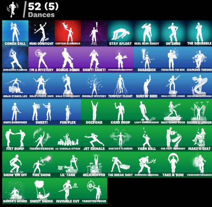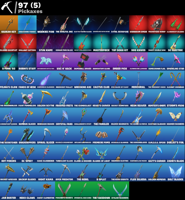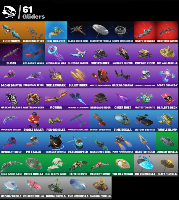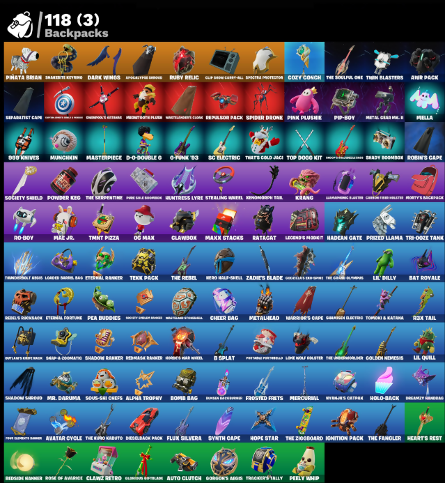 999 Knives, AWR Pack, Adamantium Claws, Airie, Airphorian, Alpha Trophy, Andy Fangersom, Apex Predator, Aphrodite, Apocalypse Shroud, Ares, Arrowpoint Carver, Artemis, Assaultron Blade, Auto Clutch, Avatar Cycle, Avatar's Flourish, B Splat, B-Splat, Backlash, Backup Blades, Baron's Hoard, Bat Royale, Bedside Nanner, Birdarang Flourish, Black One X-Wing, Bladed Gauntlet, Blades of Light, Blitz 'Brella, Bolt Blades, Bomb Bag, Boogie Down, Breakshore Trident, Brilliant Cutters, Bullet Rider, Bunsen Backburner, Cactus Club, Cake Clobberer, Captain Carter's Shield & Wakanda Brace, Captain Llamerica, Carbon Fiber Holster, Card Drop, Cerberus, Challenger's Staff, Cheer Bag, Cheer Bolt, Chemist's Cloudglider, Clang & Basher, Clawbox, Clawz Retro, Cliffside Soarer, Clip Show Carry-All, Conch Call, Cozy Conch, Crowning Achievement, Crystal Fang, D-O-Double G, Dark Wings, Dealer's Deck, Death Star 'Brella, Diamond Throne, Diamondclaw Packer, Dieselback Pack, Doom Brella, Doze Dab, Dreamzy Handbag, Drome Drifter, Duelist's Foil, Dumbbell Driver, Durrr Taisho, Dusk Knight, Eclipse, Eclipse Brella, Electro Fangs Blades, Elegant Crowbar, Elite Servo, Ember Pick, Epic Blade of Floof, Eternal Fortune, Eternal Ranker, Fangs of Hesk, Felina, Felina's Claw, Fire Show, Fist Bump, Flux Silvera, Foil Flex, Four Elements Saber, Frequency Flyer, Fresh Out The Box, Frostburn, Frosted Frets, G-Funk '93, Gilded Naginata, Gloopglom Llamaxes, Glorious Giftblade, Godzilla Evolved, Godzilla's Exo-Spine, Golden Nemesis, Golden Scythe, Gorgon's Aegis, Grand Glacier Glider, Gwenpool's Katanas, Hadean Chariot, Hadean Gate, Hadean Key, Hades, Haylee Skye, Heart's Carver, Heart's Rest, Heartwinder, Helichopper, Hero Half-Shell, High Society Glider, Holiday Boxy, Holo-Back, Homegrown Flail, Hope, Hope Star, Horde's War Wheel, Hot Pokers, Humbug Slicer, Hunter's Knife, Huntress Lyre, Hydraulic Slammer, I'm A Mystery, Ice Spice, Ignition Pack, Illusionist's Blades, Immortal War Drum, Invisible Cut, Iron Man Zero, Jackie, Jade, Jar Buster, Jet Signals, Junker 'Brella, KRANG, Katt, Knife Sharpener, Korra, Korra's Air Glider, LBC '93 Dogg, Lady of Cranes, Lana Llane, Leafy Longboardin', Legend's Modkit, Lil Quill, Lil' Dilly, Lil' Godzilla Attack, Lil' Tank, Llamaphonic Blaster, Loaded Barrel Bag, Lone Wolf Holster, Mae Jr., Magnetic Steps, Magnetized Scrap, Make A Seat, Marsha, Mask of Balance, Mastel Land Stonewall, Mastelander's Cloak, Masterpiece, Matt's Carver, Maxx Stacks, Maxxed Out Max, Mecha Morty, Medusa, Megg Tooth Plush, Mella, Mercurial, Metal Gear Mk. II, Metalhead, Microbot Mallet, Mini Dogfight, Montague, Moonbow Breezer, Moonlit Mystery, Morty's Backpack, Mothra, Mr. Daruma, Munchkin, Nanner Bashers, Neko Claws, Neon Man O' War, Neon Reaver, Night Kama, Ninja Stance: Donnie, Ninja Stance: Leo, Ninja Stance: Mikey, Ninja Stance: Raph, Nisha, Nomad's Drifter, Nyanja, Nyanja's Catpak, O.M.E.G.A Spear, OG Max, Oh Shhh, Ol' Spiky, Oopsy Drones-Y, Opaline Slashers, Oscar, Outlaw's Knife Rack, Outlaw's Whipwhips, Paint Pumplers, Paintball Pistol, Pea Buddies, Pea Part Harmony, Pea-Rigibles, Peabody, Peely Whip, Perfect Pivot, Peter Griffin, Petercopter, Pinata Brian, Pink Plushie, Pip-Boy, Pit Faller, Poacher's Regrets, Poseidon, Powder Keg, Premiere Poms, Prized Llama, Protector Kaito, Punk Powerglider, Purse Sole Boombox, Quagsaw Vrd Baton Spear, R3X Tail, Rap Boy, Ratacat, Ratacat Roamer, Ravage, Raven Team Syd, Raven's Legion, Real Slim Shady, Rebel Brella, Rebel's Rucksack, Red Robin's Wings, Redcap, Redmask Ranker, Renegade Reaver, Renegade Rebel, Renegade Rider, Repulsor Pack, Revenant Rider, Revere's Dreamstaff, Reverie, Ringmaster Scarr, Ro-Bov, Robin, Robin's Cape, Robin's Staff, Rocket Wrecker, Rose of Avarice, Royale Rider, Ruby Relic, Runway Racer, Rust, S-Foil Scrapaxe, SC Electric, SG Electric, Santa Dogg, Scarlet Longboard, Scoot's Pawblazers Guns, Sea Chariot, Secret Scimitars, Senate Repulsorpod, Separatist Cape, Serpentine Surrounding, Shadebox, Shaderippers, Shadow Blade Hope, Shadow Ranker, Shadow Shroud, Shadow's Bite, Shady Boombox, Shady Double Saw, Shamisen Electric, Shamisen-Sational, Shiitake Slasher, Shogun 'Brella, Shoop's Hollabalooza Blas, Show 'Em Off, Shuri's Skywings, Silas Hesk, Skeleglider, Skellshark, Slayer Juice Wrld, Slider, Slim Shady, Snakebite Kyyring, Snap-A-Zoomatic, Snikt! Snikt!, Society Emblem Ranker, Society Shield, Solid Snake, Soundwave Slashers, Sous-Shi Chefs, Sparkling Star, Spectra Protector, Spider Drone, Spider-Man Zero, Spinal Slicer, Stay Afloat, Stealing Wheel, Storm's Maw, Stun Knife, Surfin' Bird, Sweet Clementine, Sweet Swing, Sweet!, Swole Sailer, Synth Cape, Synthwave, T-60 Power Armor, TMNT Pizza, Tagger's Groove, Take A Bow, Targeted Focus, Tekk Pack, Tempest Flight, That's Cold Jack, The Break Shot, The Fangler, The Gorgonblades, The Grand Olympus, The Greenest Onion, The Iconoclast, The Kuro Kabuto, The Machinist, The Olympian, The Rebel, The Rezzbrella, The Scratcher, The Serpentine, The Soulful One, The Squabble, The Takedown, The Umbrella, The Underworlder, The Vaultbrella, The Ziggbord, Thunder & Lightning, Thunderbolt Aegis, Time Brella, Tomoni & Katana, Top Dogg Kit, Tracker's Tally, Tri-Ooze Tank, Turbulent Blade, Turtle Blimp, Twin Blasters, Utopia 'Brella, Vac N' Hack, Valeria, Vanguard Zadie, Vanguard's Charge, Vengeance Jones, Vibranium Spear, Victory Vaunter, War Force Wings, Warrior's Cape, Wasteland Rider, Wasteland Rock, Wasteland Speeder, Wastelander Magneto, Winterfest Bushranger, Wookiee Paw, Wrecking Axe, Xenomorph, Xenomorph Tail, Yarn Ball, Zadie's Blade, Zeus, Ziggy