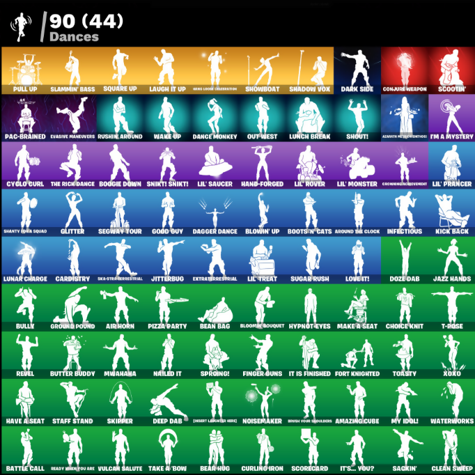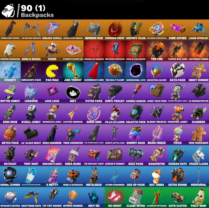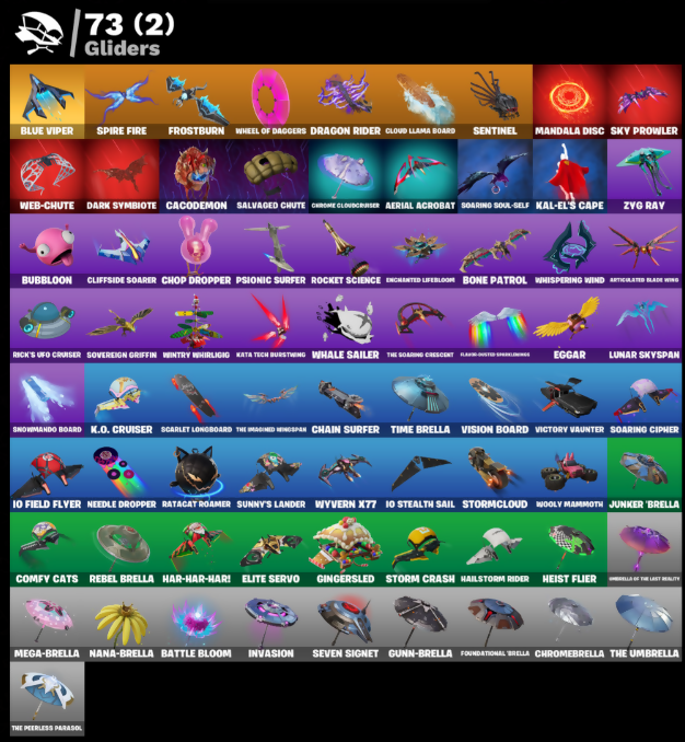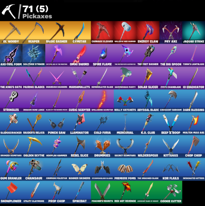 10 Field Flyer, 10 Stealth Sail, 4 Me???, 8-Ball Janky, Absenz, Abyssal Blade, Adira, Adira's Battle Flag, Aerial Acrobat, Agent Jones, Air Horn, Amazing Cube, Ancestral Bloom, Apocalypse Shroud, Arctic Adeline, Around The Clock, Articulated Bards Wind, Auto Clutch, Axe-tral Form, Azarath Metrion Zinthos, Basic Basher, Battle Bloom, Battle Call, Bean Bag, Bear Hug, Beep & Boop, Blade of the Waning Moon, Bladed Travpak, Blooming Bouquet, Blowin' Up, Blue Viper, Boba Bling, Bone Patrol, Boogie Down, Book of Caulostrog, Boots N' Cats, Brain Freeze, Breakpoint, Bronzed Scimitars, Brush Your Shoulders, Bubloon, Bully, Butter Buddy, Butter Robot, Buzz Pack, Cacodemon, Cardistry, Carnage, Carnage Cleaver, Chain Surfer, Chainsaur, Chaos Agent, Charlotte, Choice Knit, Chop Chop, Chop Dropper, Chromebrella, Clark Kent, Clawbox, Clawz Retro, Clean Sweep, Cliffside Soarer, Cloud Llama Board, Cluck, Cold Furia, Comfy Cats, Conjure Weapon, Cookie Cutter, Crescent Shroom, Crimson Crest, Crimson Polestar, Crowning Achievement, Crystal Axe of the Masters, Cube Aether, Cubic Scepter, Curling Iron, Cyclo Curl, Cymitar, Dagger Dance, Dance Monkey, Dark Blessing, Dark Side, Dark Symbiote, Datafiber Chargepack, Deep Dab, Demonslayer Blade, Designated Hitters, Dimensional Gate, Dino Deck, Dizzie, Doctor Slone, Doctor Strange, Double Header, Doze Dab, Dragon Rider, Dragon Rune Lance, Drummies, D’ark, Eggar, Electric Shredder, Elite Servo, Enchanted Lifebloom, Endless Scroll, Energy Claw, Erisa, Evasive Maneuvers, Evie, Extra Round, Extraterrestrial, Fa-La-La-Llama, Fabio Sparklemane, Fashion Accident Jeney, Feathered Flames, Ffrosty, Finger Guns, Fishstick Janky, Fizzix, Flaming Dual Kama, Flavor-Dusted Sparklewing, Fort Knighted, Foundation's Mantle, Foundational 'Brella, Frostburn, Galactic Pack, Gas Up Pack, Giddy Gunner, Ginger Gunner, Gingersled, Girome Cloudcruiser, Glitter, Glorious Giftblade, Golden Scythe, Good Guy, Griffin's Talon, Ground Pound, Guardian Daggers, Guggimon, Gum Brawler, Gumbo, Gummy Sack, Gunn-Brella, Gunnar, Hadean Gate, Hailstorm Rider, Hammerhead Morty, Hand-Forged, Har-Har-Har!, Harlowe, Hatch Pack, Have a Seat, Haven, Heist Flier, Holiday Boxy, Holly Hatchets, Hooplah Hammer, Hope, Hypnot-Eyes, I'm A Mystery, IQ Eradicator, Ice-Blaster Snow Cruncher, Incinerator Kuno, Infectious, Inky, Inky Ire, Invasion, Io Orchestrator, It Is Finished, It's... You?, J.B. Chimpanski, Jaguar Strike, Jazz Hands, Jitterbug, Joey, Joia Trophy, Jones' Field Pack, Junker ‘Brella, K.O. Club, K.O. Cruiser, Kal-El’s Cape, Kata Tech Burstwing, Kata-Pack, Kiara K.O., Kick Back, Kittanas, Kor, Kor Flails, Kor's Toolkit, Krisabelle, Kymera, Kymera's Dashpaw, Laminator, Lara Croft, Lars, Laugh It Up, Legend's Modkit, Legendary Blade of Insight, Lil' Black Heart, Lil' Monster, Lil' Prancer, Lil' Rover, Lil' Saucer, Lil' Treat, Lina Scorch, Love It!, Love Lock, Lt. John Llama, Lunar Charge, Lunar Hyperjet, Lunar Skyspan, Lunarios, Lunch Break, Make A Seat, Malik, Mandala Disc, Marshmallets, Mega-Brella, Meowscles Janky, Mercurial, Merry Marauder, Metalhead, Mini Marauder, Molten Max Axe, Molten Ragnarok, Mwahaha, My Idol!, Nailed It, Nana-Brella, Nanameter, Nanner Bashers, Needle Dropper, Nemesis Box, Nemo Lodge Celebration, Neymar Jr, Nitro'd Ranker, No Ghost, Noisemaker, Nyanja's Catpak, Ol' Woody, Omni Sword, Ooze Chamber, Oscar, Out West, Pac-Brained, Pac-Man, Pairing Blades, Patch Pack, Peely Whip, Pizza Party, Poacher's Regrets, Polar Peely, Premiere Poms, Prized Llama, Prop Chop, Prowler, Pry Axe, Psionic Surfer, Pull Up, Punch Saw, Raider's Relics, Ratacat, Ratacat Roamer, Raz, Ready When You Are, Reaper, Rebel Brella, Rebel Slice, Rebel's Rucksack, Rebirth Raven, Red Hot Revenge, Revel, Rick Sanchez, Rick’s UFO Cruiser, Roast Lord, Rocket Science, Ronin, Rushin' Around, Sackin', Salvaged Chute, Scarlet Longboard, Scootin', Scorecard, Secret Scimitars, Segway Tour, Sentinel, Seven Signet, Sgt. Shiba, Shadow Vox, Shanta, Shanty Beta Squad, Shattered Hope, Shout!, Showboat, Signal Jammer, Ska-Starterrestrial, Skipper, Sky Prowler, Slammin' Bass, Sled Ready Guff, Sledgecracker, Snap, Snikt! Snikt!, Snowmando Board, Snowplower, Soaring Cipher, Soaring Soul-Self, Solar Slicer, Solitude Striker, Soul's Reach, Sovereign Griffin, Spectra Protector, Spellwork Scimitar, Spider-Man, Spikebat, Spire Assassin, Spire Fire, Spire Flame, Sprong!, Square Up, Staff Stand, Storm Crash, Storm Strummer, Stormcloud, Stormfarer, Stormshielder Blades, Stringles, Sugar Rush, Sultura, Sunny, Sunny’s Lander, Superman's Cape, Survivor's Pack, Sushi Sign, T-Pose, Take A Bow, Tarana, Tendrils of Carnage, The Bestiary Chest, The Big Spoon, The Cube Queen, The Daily Planet, The Destroyer's Destroyer, The Foundation, The Fret Basher, The Imagined, The Imagined Blade, The Imagined Wingspan, The King's Oath, The Origin, The Peerless Parasol, The Rick Dance, The Soaring Crescent, The Stormfarer's Cloak, The Umbrella, Time Brella, Tire Fire, Toasty, Toona Fish, Torin, Torin's Lightblade, Tover, Trot Shot, Tsuki 2.0, Twin Crossfire, Umbrellas Of The Last Reality, Unicorn Flakes, Utility Claymore, Victory Vaunter, Vision Board, Vulcan Salute, Wake Up, Wallopin' Web Hammer, Waterworks, Web-Chute, Web-Hero's Knapsack, Whale Sailer, Wheel Of Daggers, Whispering Wind, Wilderspear, Wintry Whirligig, Wooly Mammoth, Wyvern X77, Xoxo, Zoe Clash, Zyg, Zyg Ray, Zyg's Chainblade, [Insert Legendary Rap]