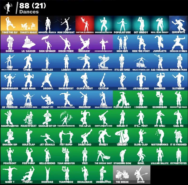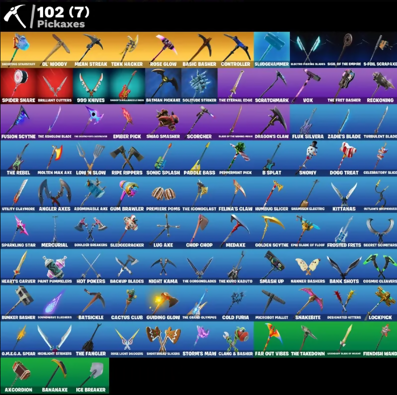 3-Foil Scrapaxe, 999 Knives, Abominable Axe, Angler Axes, Arctic Adeline, Astroworld Cyclone, Axcordion, B Splat, Backup Blades, Bananaxe, Bank Shots, Base Jumper, Basic Basher, Batman Comic Book Outfit, Batman Pickaxe, Batsickle, Battle Bloom, Batwing, Beach Umbrella, Black One X-Wing, Blackheart (Stage 8), Blade Of The Waning Moon, Blue Streak, Blue Team Leader, Boing!, Boulder Breakers, Breakin', Breezy, Brilliant Cutters, Bubbloon, Bullet Rider, Bunker Basher, Bunker Jonesy, Cacodemon, Cactus Club, Calamity Stage 5, Call Me, Cameo Vs Chic, Captain L. America, Carbon Commando, Cat Flip, Catalyst, Cazadora, Celebratory Slice, Chemist's Cloudglider, Chop Chop, Chop Dropper, Chrome Punk, Chromebrella, Chrysalis of the Last Reality, Cinder, Clang & Basher, Classified, Click!, Cliffside Soarer, Cloud Llama Board, Cluck Strut, Coaxial Blue, Cobalt, Cold Furia, Comfy Cats, Competitor's Time Brella, Conga, Controller, Cosmic Cleavers, Count It!, Covered Crusader, Crazy Eight, Crossfire, Crowning Achievement, DJ Yonder, Dabstand, Dark Bomber, Dealer's Deck, Designated Hitters, Disco Fever, Dogg Treat, Downpour, Downshift, Doze Dab, Dragon Stance, Dragon's Claw, Drome Drifter, Droop, Dusk, Dusk Knight, Eclipse Brella, Electro Parking Blades, Elite Servo, Ember, Ember Pick, Epic Blade Of Floof, Equalizer, Everything's End, Fable, Far Out Vibes, Felina, Felina's Claw, Field Flyer, Fiendish Wand, Fist Bump, Fist Pump, Fixer, Flappy, Flippin Away, Flux Silvera, Foil Flex, Founder's Glider, Founder's Umbrella, Frequency Flyer, Frosted Frets, Fusion Coil, Fusion Scythe, Gentleman's Dab, Get Griddy, Giddy-Up, Glidurr, Golden Scythe, Golf Clap, Grand Glacier Glider, Groove Destroyer, Guggimon, Guiding Glow, Gum Brawler, Har-Har-Har!, Hazard, Head (Droopy), Heart's Carver, Heartwinder, Heist Flier, Hello Friend, High Five, High Society Glider, Highlight Strikers, Holiday Boxy, Holographic, Hot Pokers, Howl, Hula Hoopin', Humbug Slicer, Hybrid (Stage 4), Hype!, Hypnot-Eyes, I Declare!, Ice Breaker, Imperial March, Invasion, Io Field Flyer, It Is Finished, It's Go Time!, It's... You?, Jackie, Jaywalking, Jet Signals, Joey, Jump Jets, Junk Bucket, Kal-El's Cape, Kittanas, Legendary Blade Of Insight, Lil' Prancer, Lil' Saucer, Lina Scorch, Lockpick, Lockstep, Love It!, Low 'N Slow, Lt. Evergreen, Lug Axe, Lunar Skyspan, Lynx (Stage 4 - No Ponytail), Make A Seat, Mask of Balance, Master Mix, Mean Streak, Medaxe, Mega-Brella, Mello Rider, Mercurial, Metalmark, Mic Drop, Microbot Mallet, Mighty Marvel Brella, Millennium Falcon, Mini Dogfight, Molten Max Axe, My Idol!, Nailed It, Nana Nana, Nanner Bashers, Needle Dropper, Night Kama, Ninja Stance: Donnie, Ninja Stance: Leo, Ninja Stance: Mikey, Ninja Stance: Raph, O.M.E.G.A. Spear, Ol' Woody, Outlaw's Warphkives, Paddle Bass, Paint Pummellers, Palm Leaf, Peace Out, Peely, Peppermint Paraglider, Peppermint Pick, Perfect Pivot, Perfect Shadow, Picnic, Plunder, Popular Vibe, Powder (White), Premiere Poms, Prodigy, Psionic Surfer, Punk Powerglider, Puppet's Prowl, Quick Bite, Radiant Striker, Real Slim Shady, Rebel Brella, Reckoning, Red Robin's Wings, Red Strike, Regal Wave, Remedy Vs Toxin, Respect The Peace, Retaliator, Ride The Pony, Rift Rider, Ripe Rippers, Rippley Vs Sludge, Rose Glow, Rose Light Daggers, Rose Rider, Rose Team Leader, Rox (Stage 5), Royale Air, Running Man, Runway Racer, Sad Trombone, Santa Dogg, Scarlet Strike, Scorcher, Scorecard, Scratch (Virus), Scratchmark, Secret Scimitars, Sentinel, Serpentine Summoning, Seven Glider, Seven Signet, Sgt. Winter Headgear, Shadow Skully, Shadowbird, Shamisen Electric, Shaolin Sip, Shaolin Sit-Up, Sharpshooter, Shimmer, Shooting Starstaff, Shortbread Slicers, Sidewinder (Dark), Sigil Of The Empire, Sign Spinner, Ska-Stra-Terrestrial, Skeleglider, Skellefish, Sky Serpents, Sky Trawler, Slayer Juice Wrld, Sled Ready Guff, Sledgecracker, Slitherin', Slow Clap, Sludgehammer, Smash Up, Snakebite, Snoop's Holiday Dazzle Saws, Snoozefest, Snowfall, Snowshaker, Snowy, Solitude Striker, Sonic Splash, Soundwave Slashers, Sparkling Star, Spider Snare, Spray Sail, Standing Bow, Storm Crash, Storm Sail, Storm's Maw, Stormcloud, Stratus, Summit Striker, Sunny, Sunny's Lander, Swag Smasher, Tactical Sleigh, Tagger's Groove, Take The Elf, Team Mech, Team Monster, Tekh Hacker, The Ace, The Ashglow Blade, The Break, The Break Shot, The Dark Knight Movie Outfit, The Destroyer's Destroyer, The Eternal Edge, The Fangler, The Fret Basher, The Gordonblades, The Grand Olympus, The Iconoclast, The Kuro Kabuto, The Mcg, The Peerless Parasol, The Rebel, The Rezzbrella, The Takedown, The Umbrella, Tie Whisper, Tilted Teknique (Hoodie), Time Brella, Time Out, Toasty Roast, Tra La La, Treefall, Trilogy, Turbo Spin, Turbulent Blade, Turk Vs Riptide, Turtle Blimp, Twist, Underworld Desdemona, Unwrapped, Utility Claymore, Vav!, Vega, Vox, Vulcan Salute, War Force Wings, Warpaint, Warthog, Waterworks, Wavy T, Whispering Wind, Wild Streak, Winterfest Bushranger, Wintry Whirligig, Wooly Warrior, X, X-Lord, Xev, Yulejacket, Zadie's Blade, Zenith (Stage 4), Zyg Ray